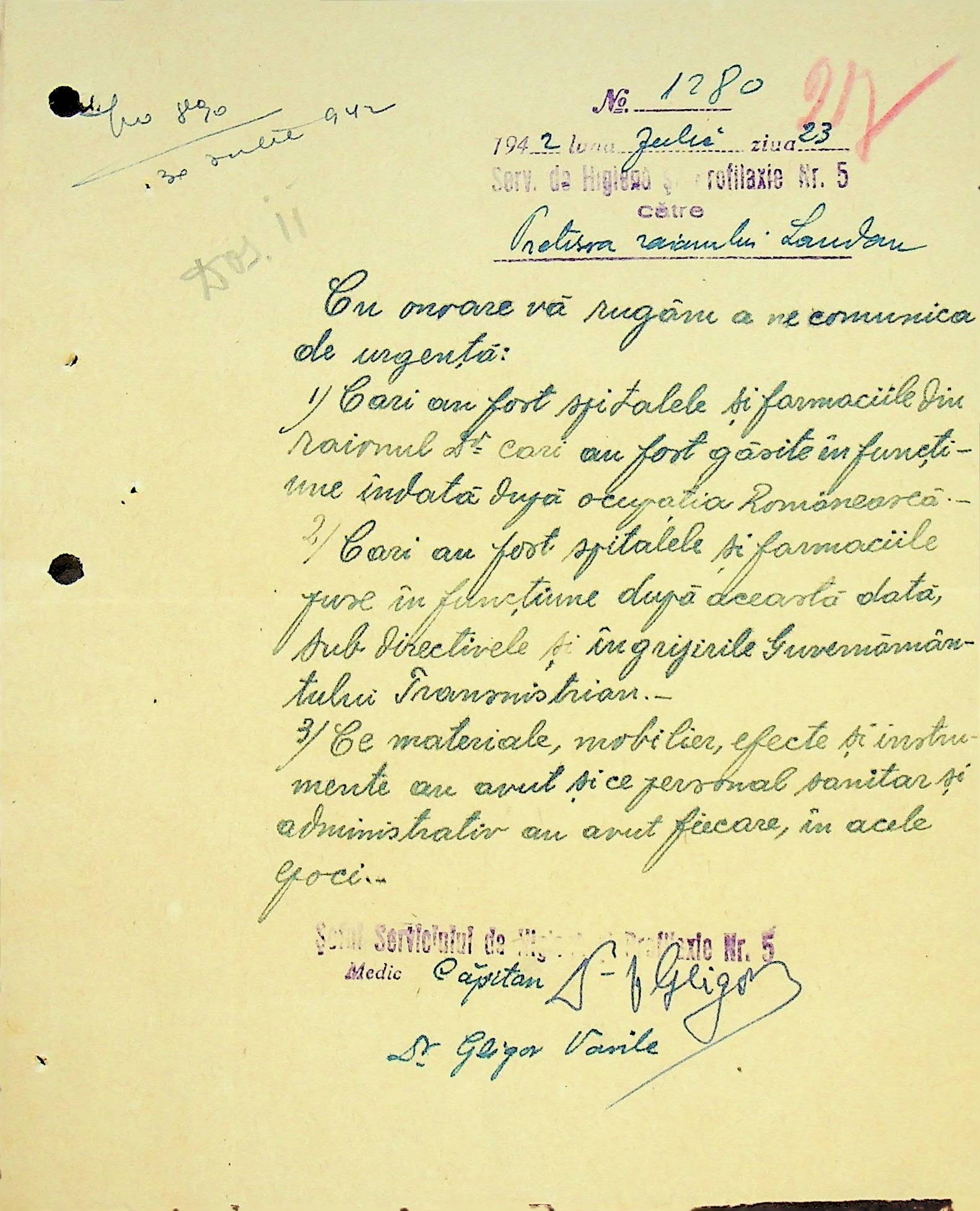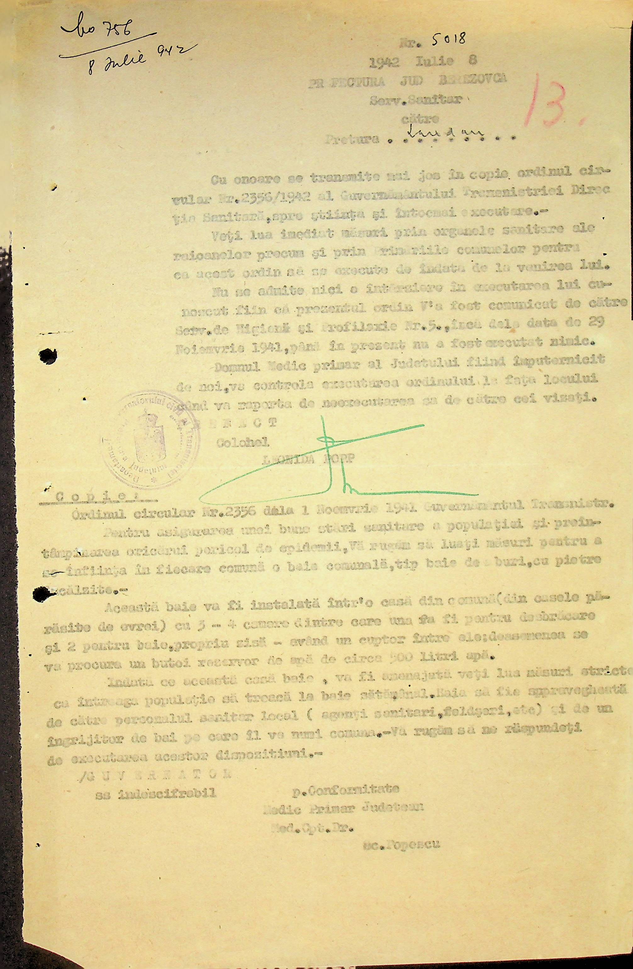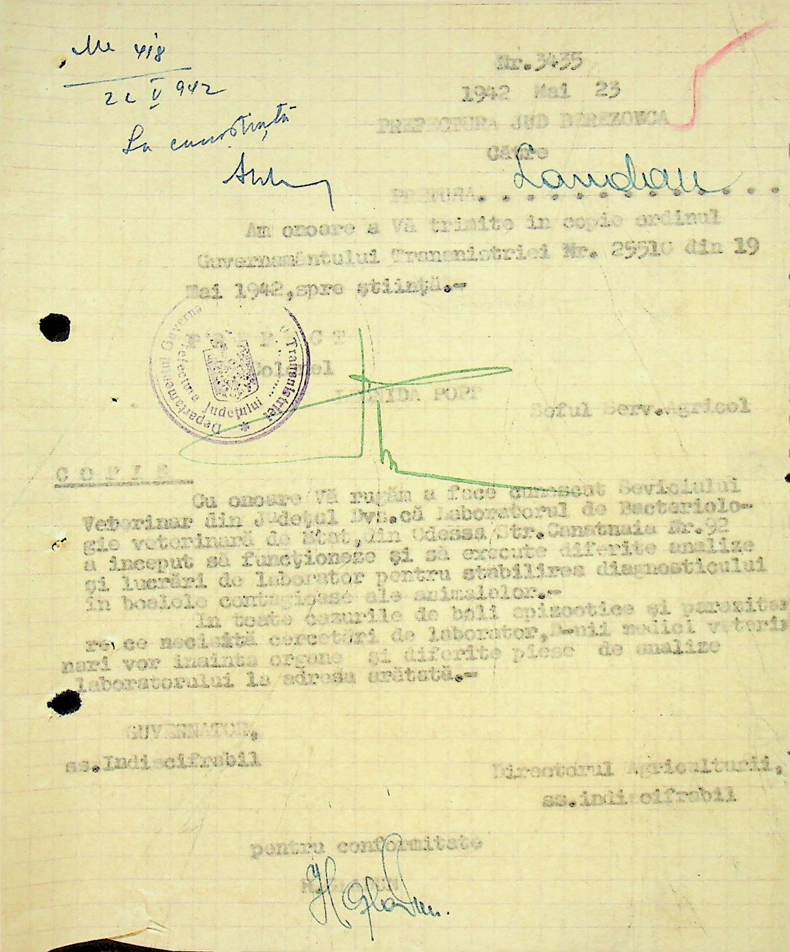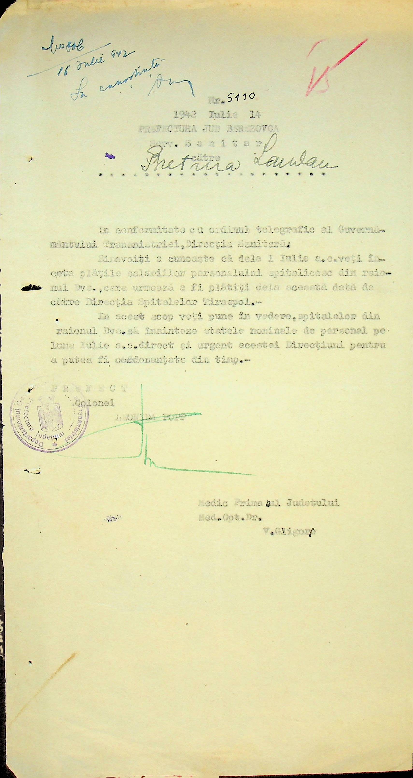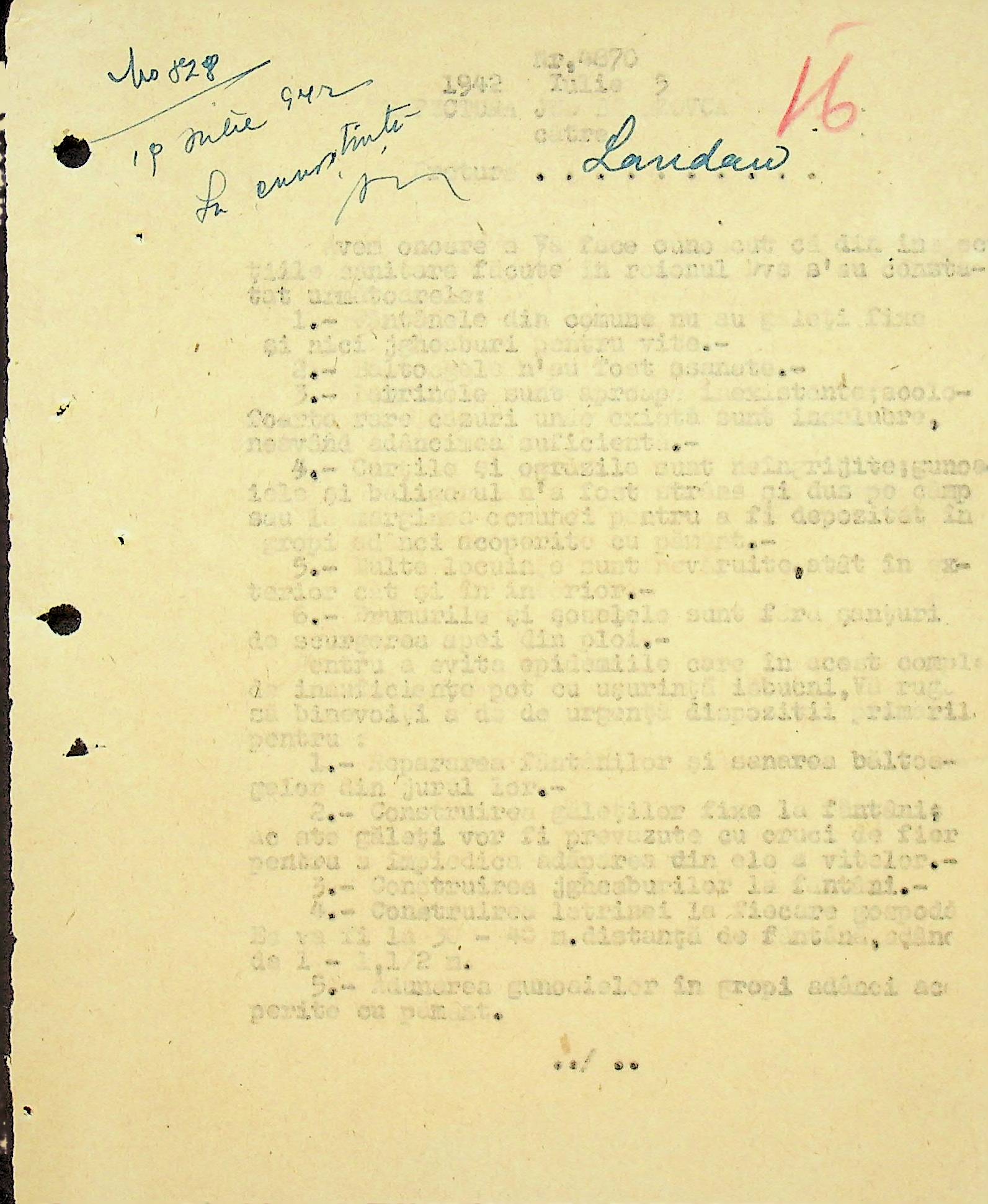 • • • • Справа № 117 Копія інструкції дирекції з охорони здоров’я цивільного губернатора Трансністрії про профілактику та боротьбу з інфекційними захворюваннями, організацію роботи та функціонування лікарень в умовах епідемії, висновки санітарної служби щодо роботи ресторанів, буфетів та винних льохів, ізолювання колодязів; листування з префектурою Березівського повіту про роботу ветеринарно-санітарних служб району, надання відомостей щодо захворюваності тварин та їх щеплення; про контроль та координацію діяльності ветеринарних лікарів округу, порядок виплати заробітної плати медичному персоналу; про спалах висипного тифу