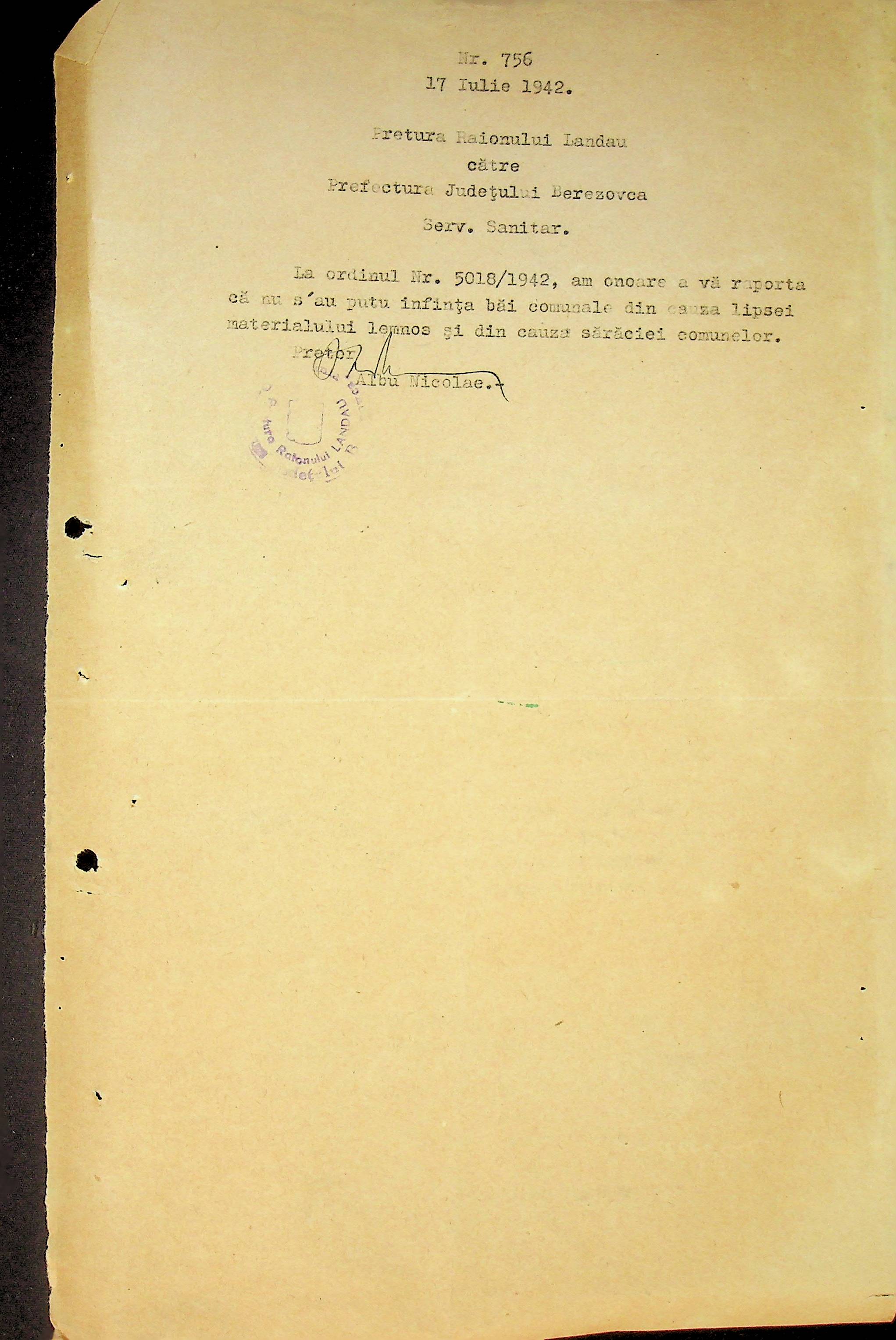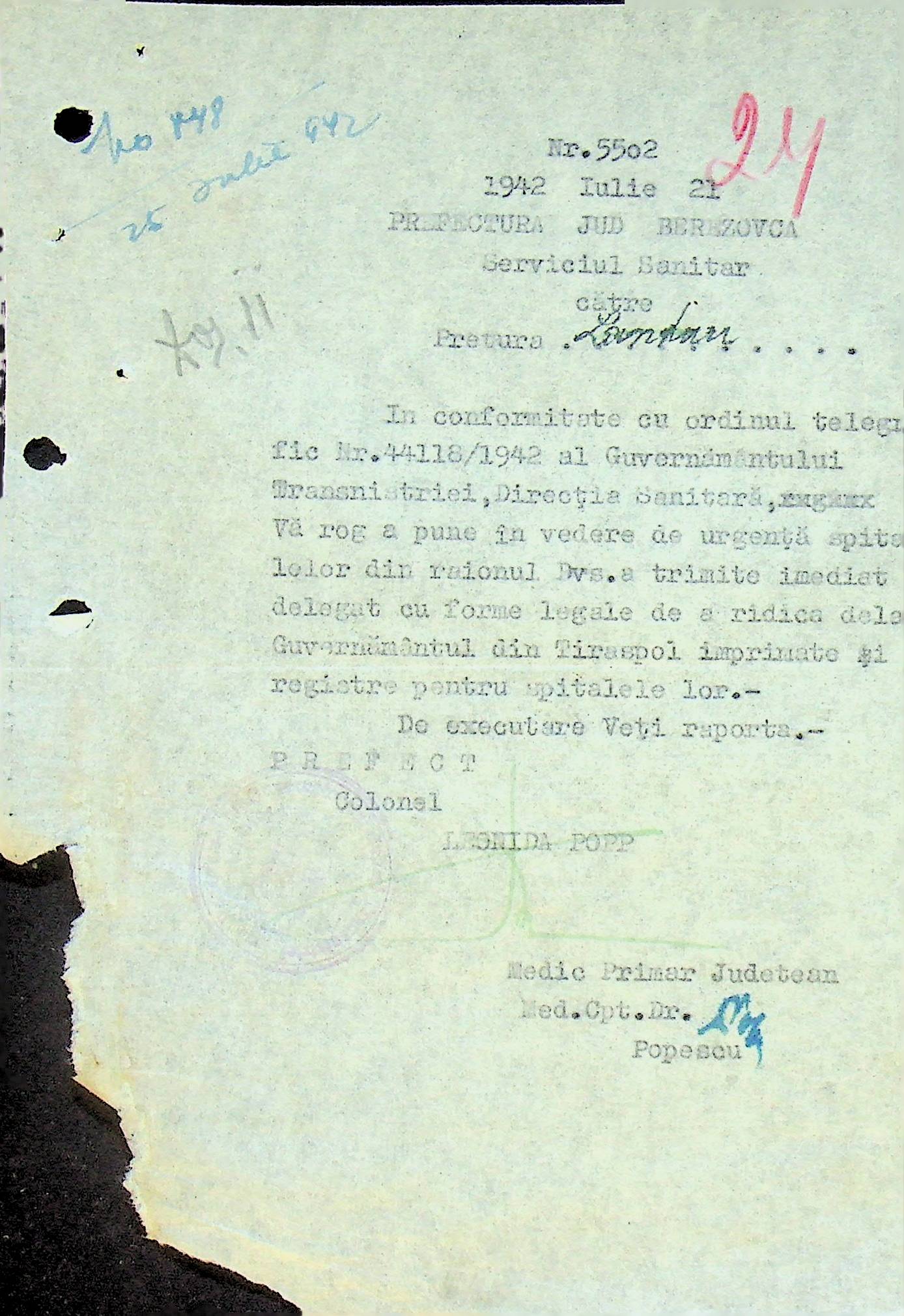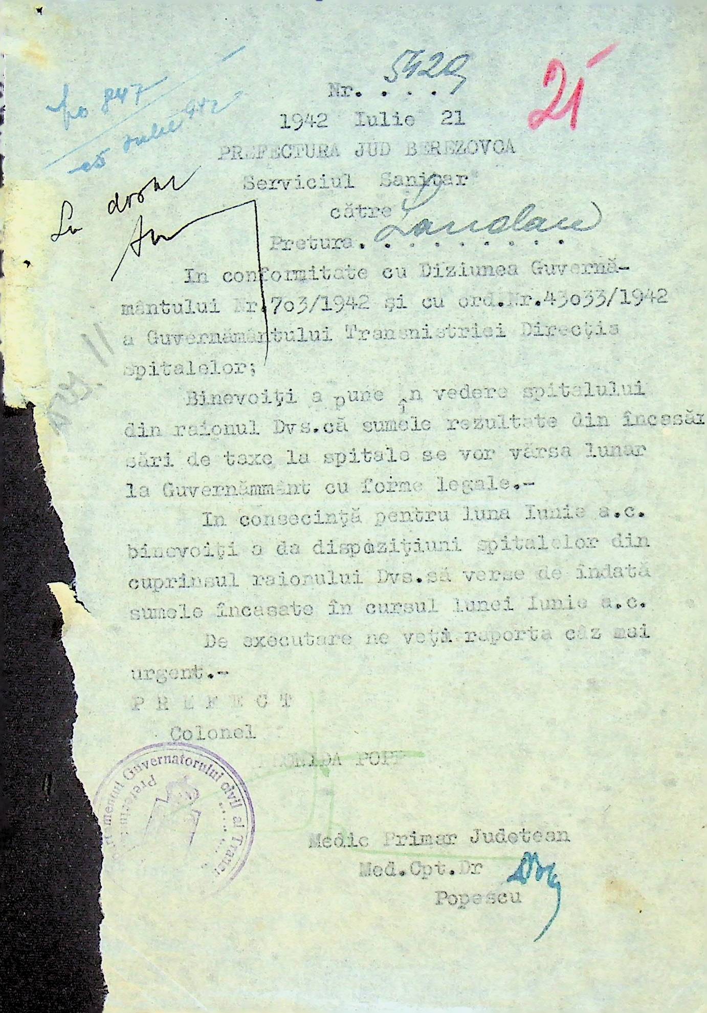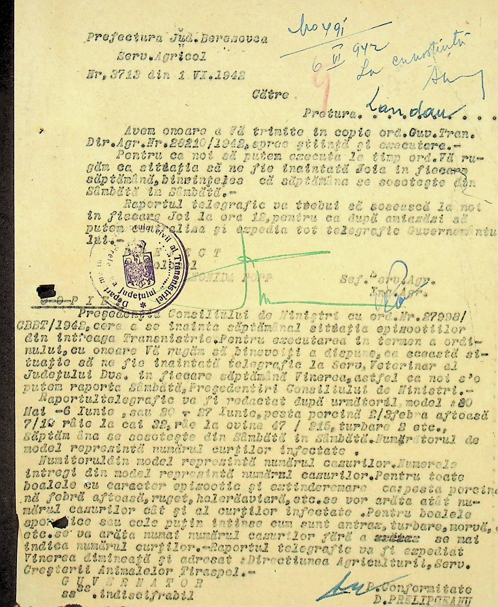 • • • • Справа № 117 Копія інструкції дирекції з охорони здоров’я цивільного губернатора Трансністрії про профілактику та боротьбу з інфекційними захворюваннями, організацію роботи та функціонування лікарень в умовах епідемії, висновки санітарної служби щодо роботи ресторанів, буфетів та винних льохів, ізолювання колодязів; листування з префектурою Березівського повіту про роботу ветеринарно-санітарних служб району, надання відомостей щодо захворюваності тварин та їх щеплення; про контроль та координацію діяльності ветеринарних лікарів округу, порядок виплати заробітної плати медичному персоналу; про спалах висипного тифу