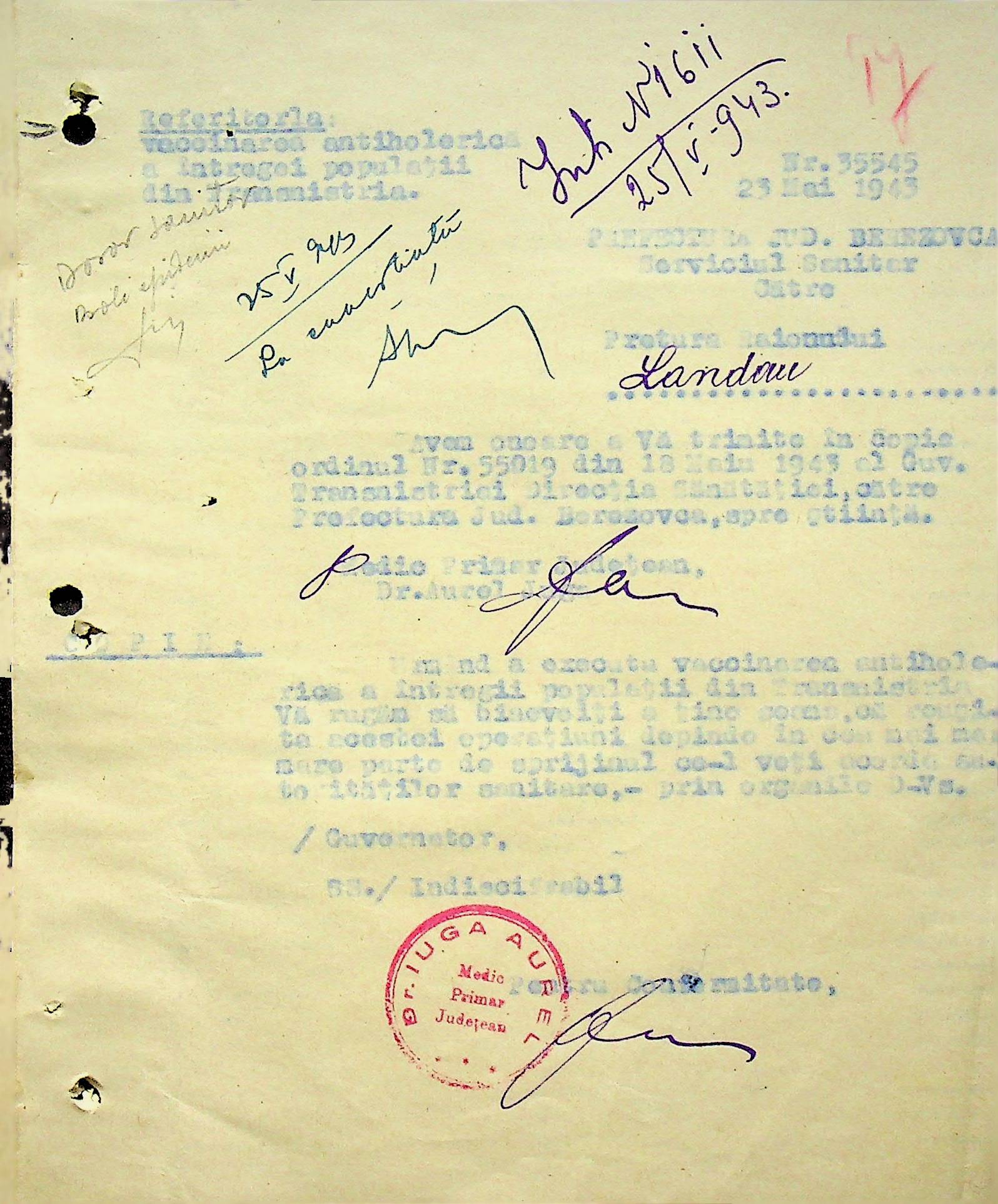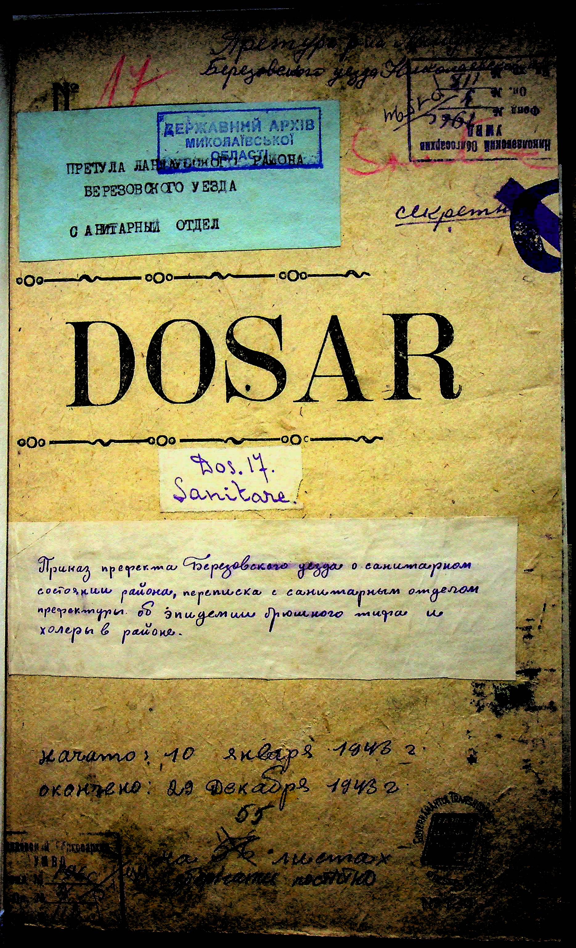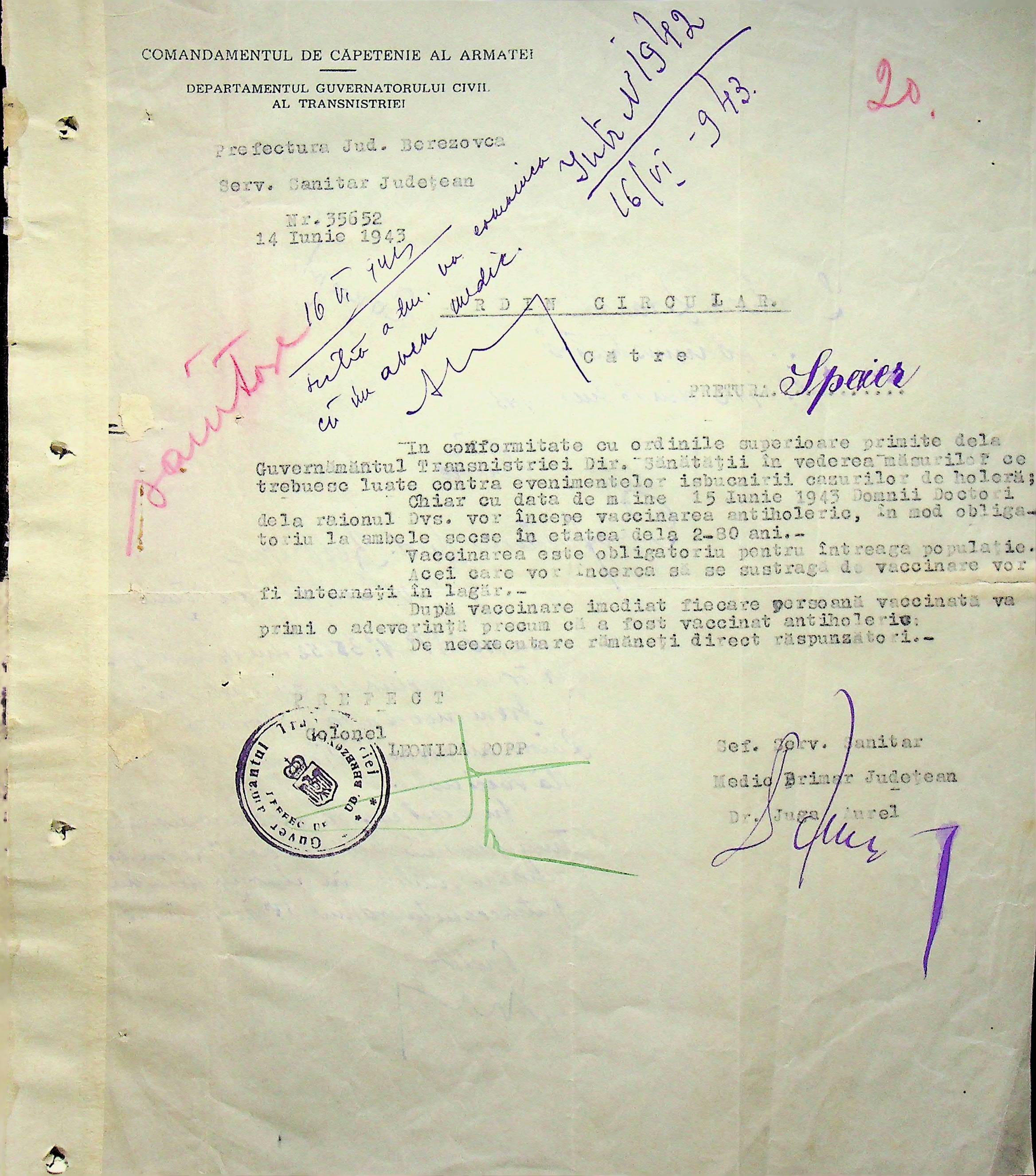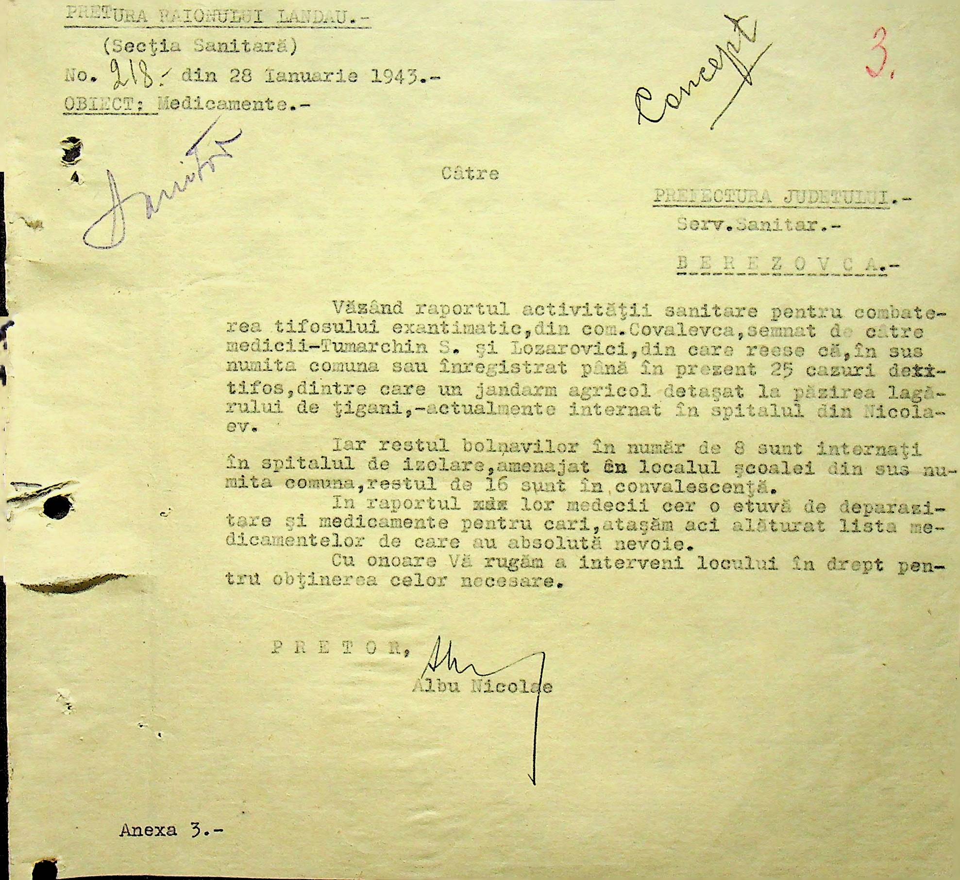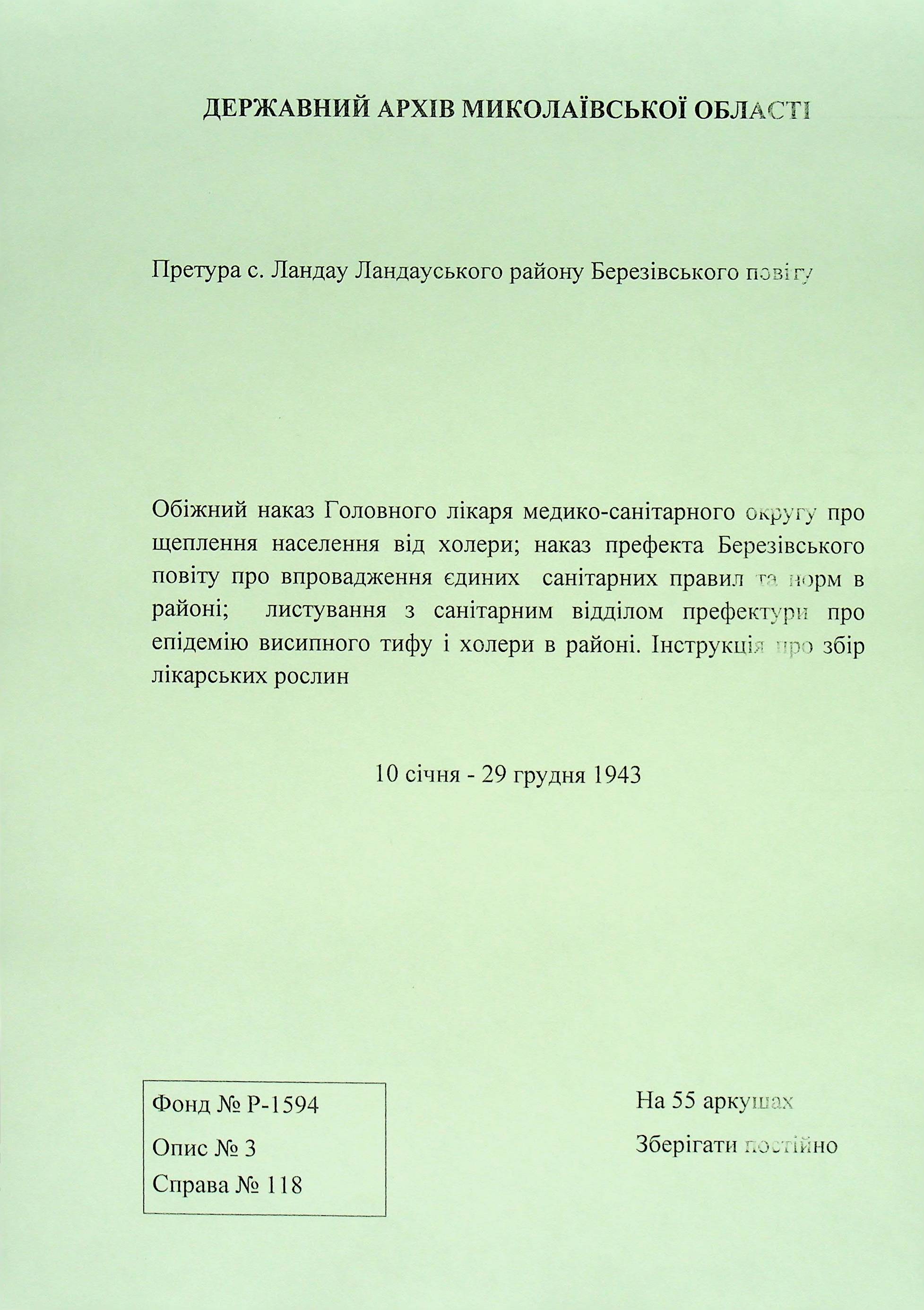 • • • • Справа № 118 Обіжний наказ Головного лікаря медико-санітарного округу про щеплення населення від холери; наказ префекта Березівського повіту про впровадження єдиних санітарних правил та норм в районі; листування з санітарним відділом префектури про епідемію висипного тифу і холери в районі.