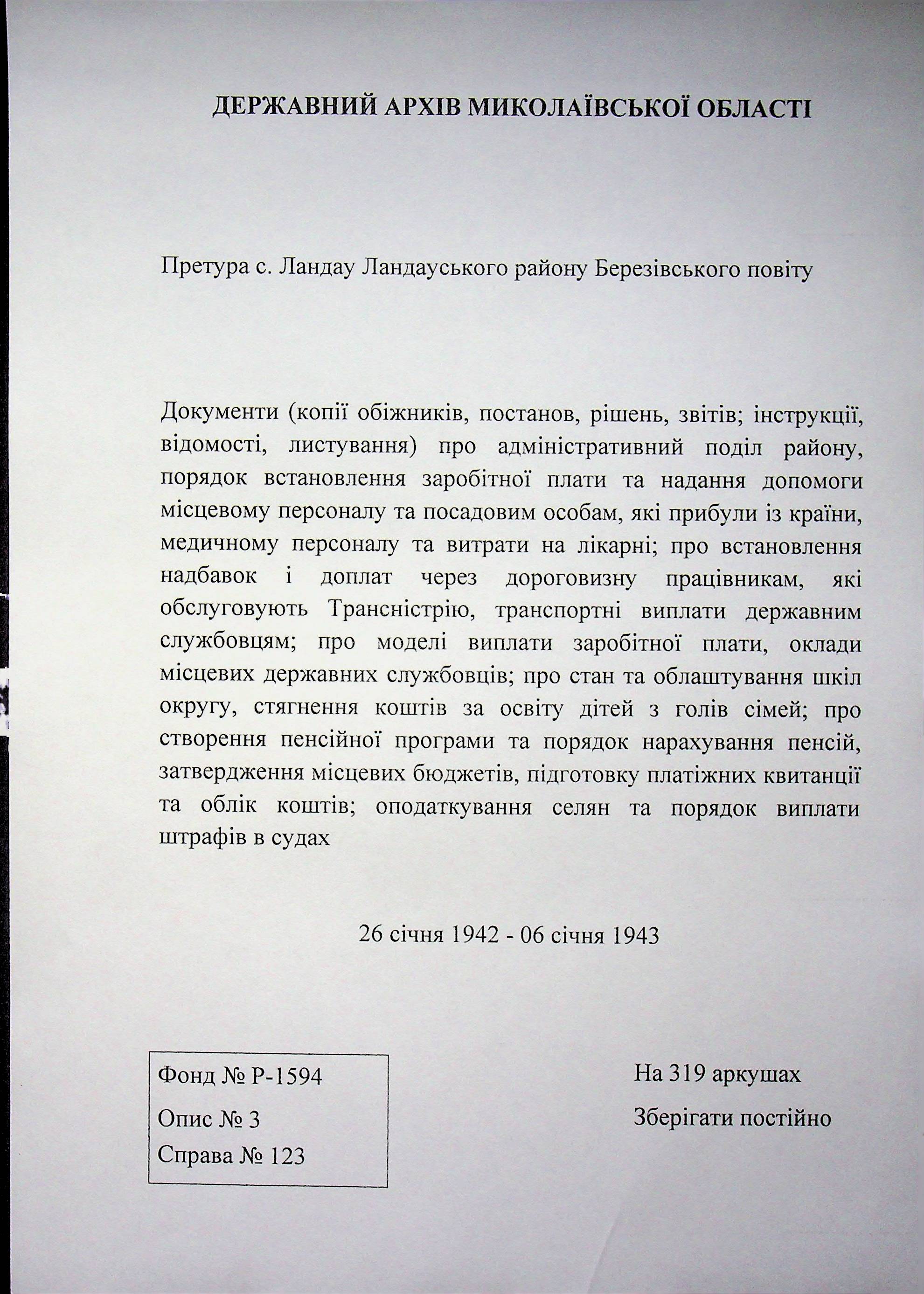 ◦ ◦ Фонд № Н-1594 “Претура Ландауського району”
