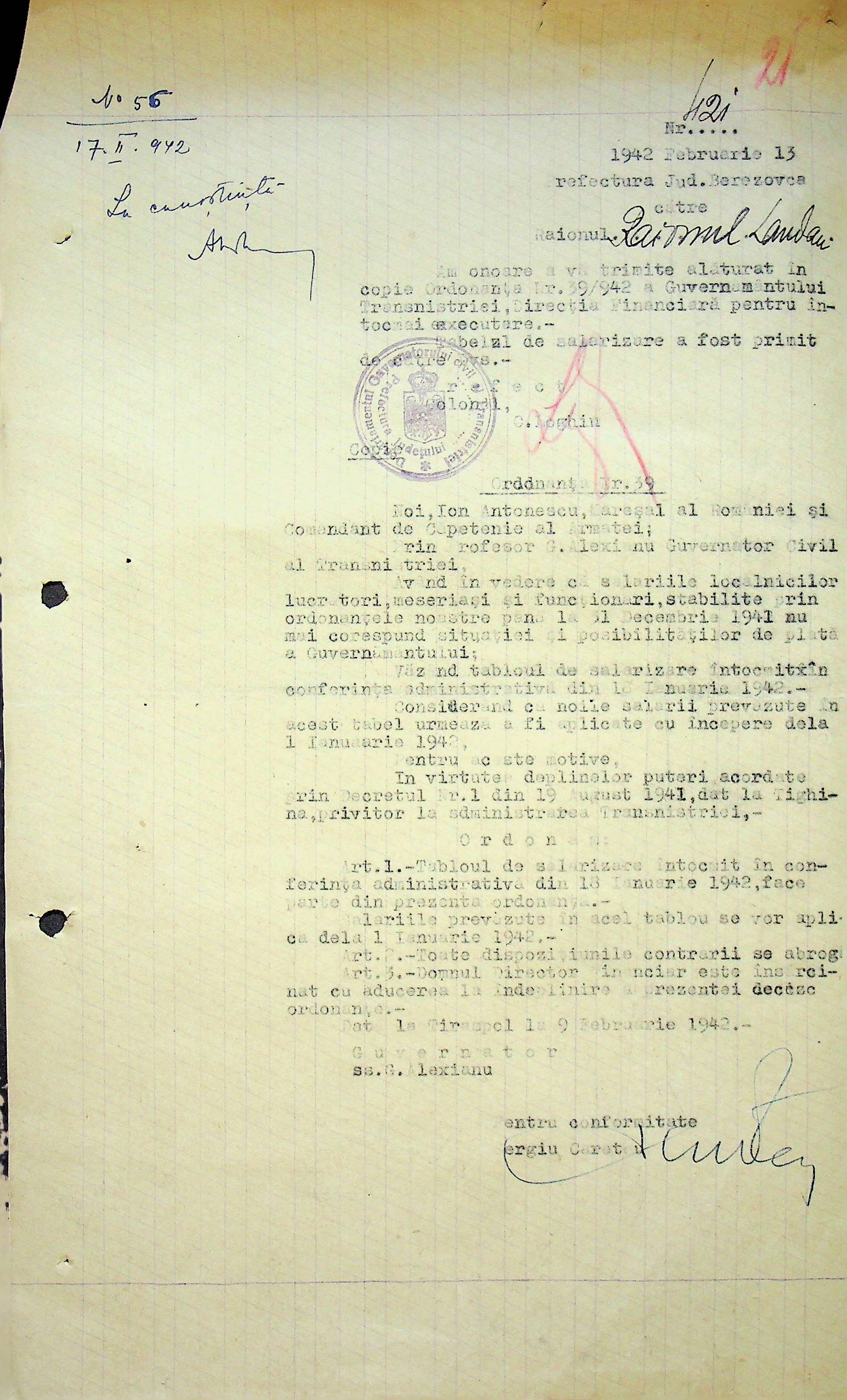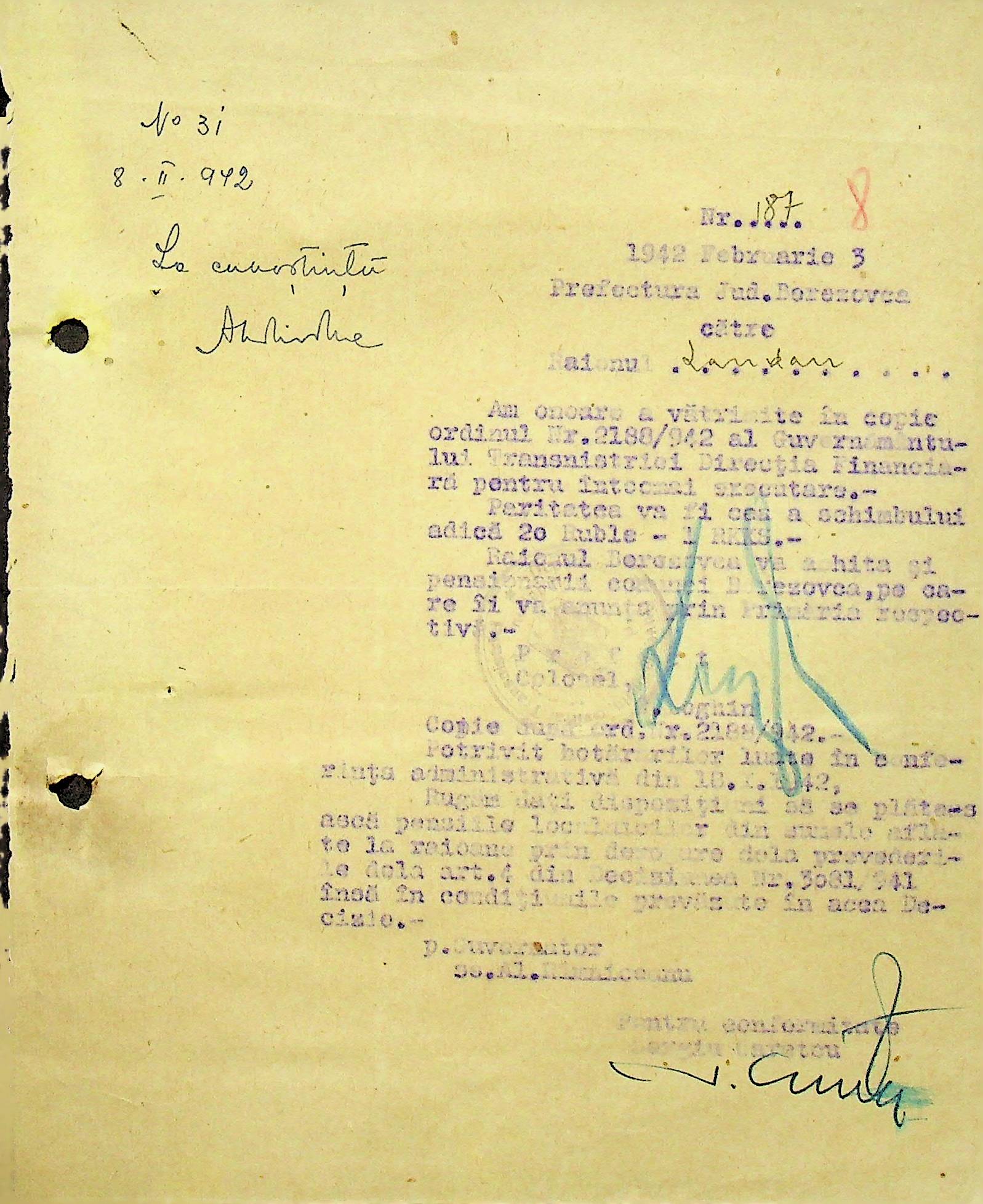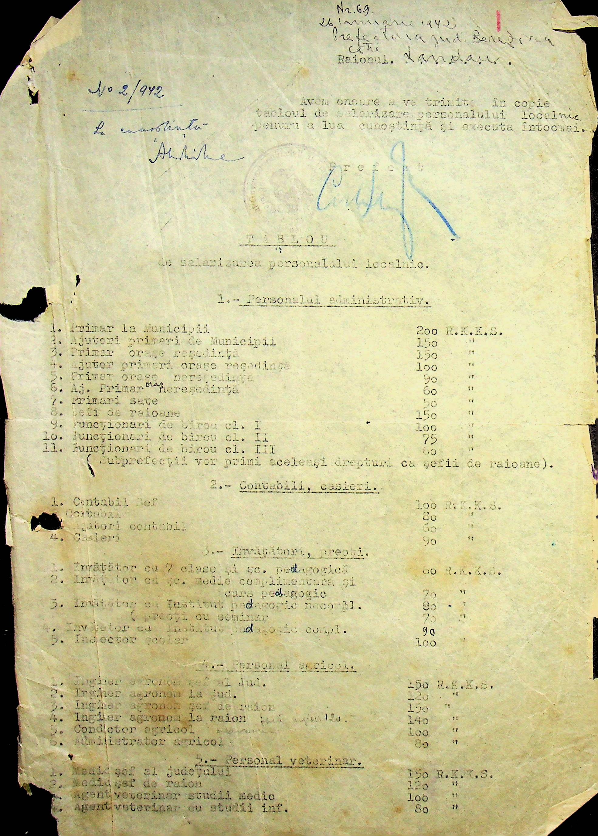 • • • • Справа № 123 Документи (копії обіжників, постанов, рішень, звітів; інструкції, відомості, листування) про адміністративний поділ району, порядок встановлення заробітної плати та надання допомоги місцевому персоналу та посадовим особам, які прибули із країни, медичному персоналу та витрати на лікарні; про встановлення надбавок і доплат через дороговизну працівникам, які обслуговують Трансністрію, транспортні виплати державним службовцям; про моделі виплати заробітної плати, оклади місцевих державних службовців; про стан та облаштування шкіл округу, стягнення коштів за освіту дітей з голів сімей; про створення пенсійної програми та порядок нарахування пенсій, затвердження місцевих бюджетів, підготовку платіжних квитанції та облік коштів; оподаткування селян та порядок виплати штрафів в судах