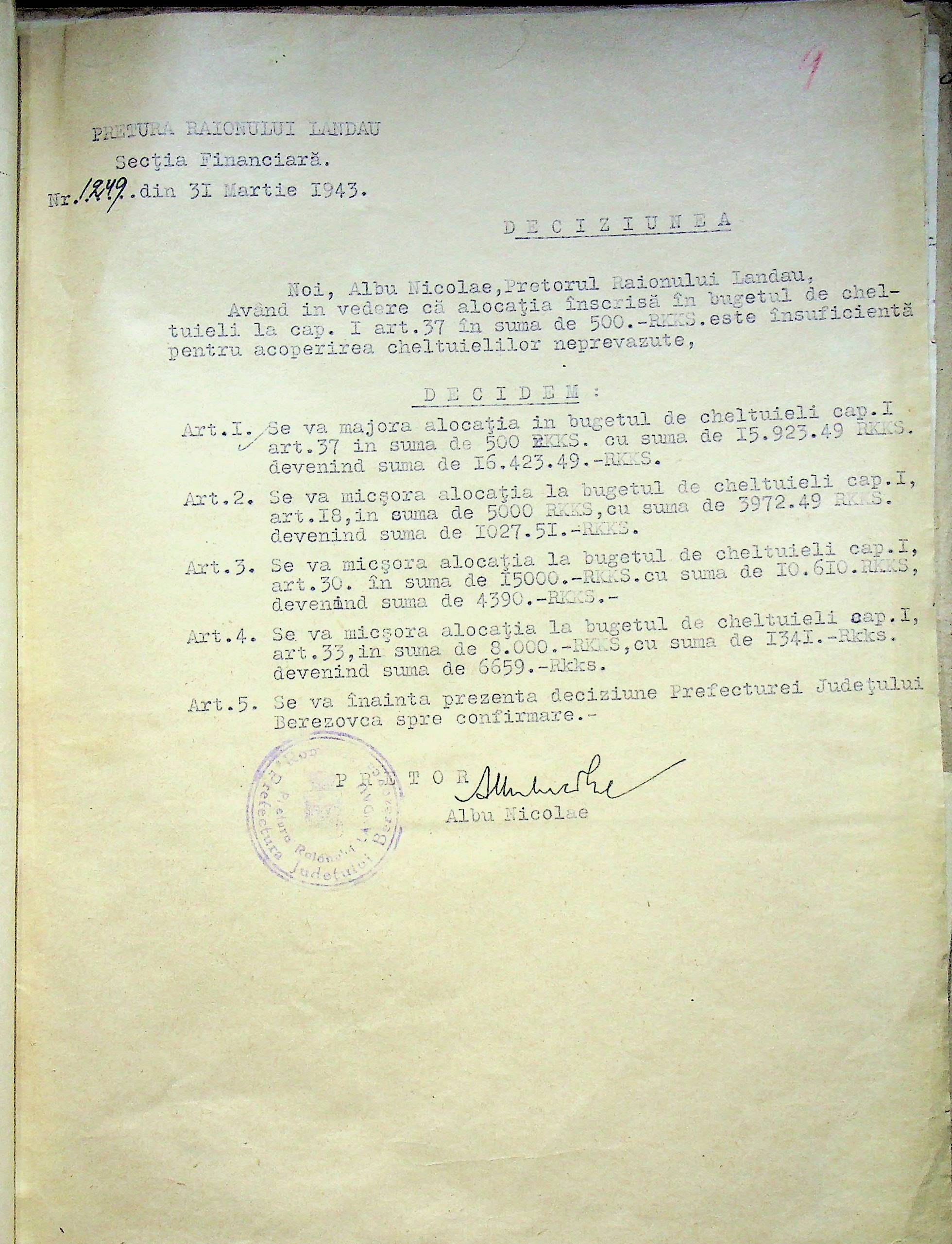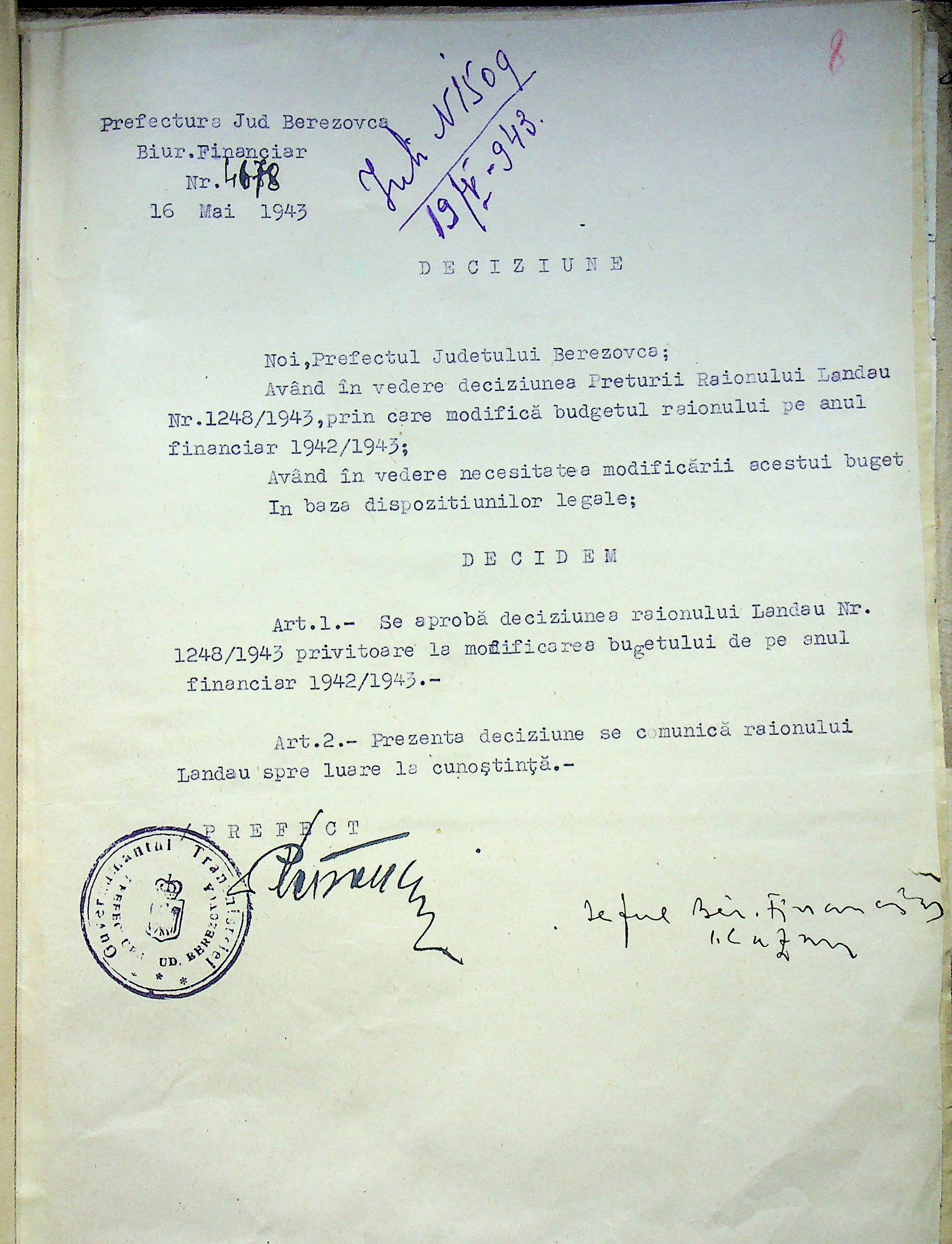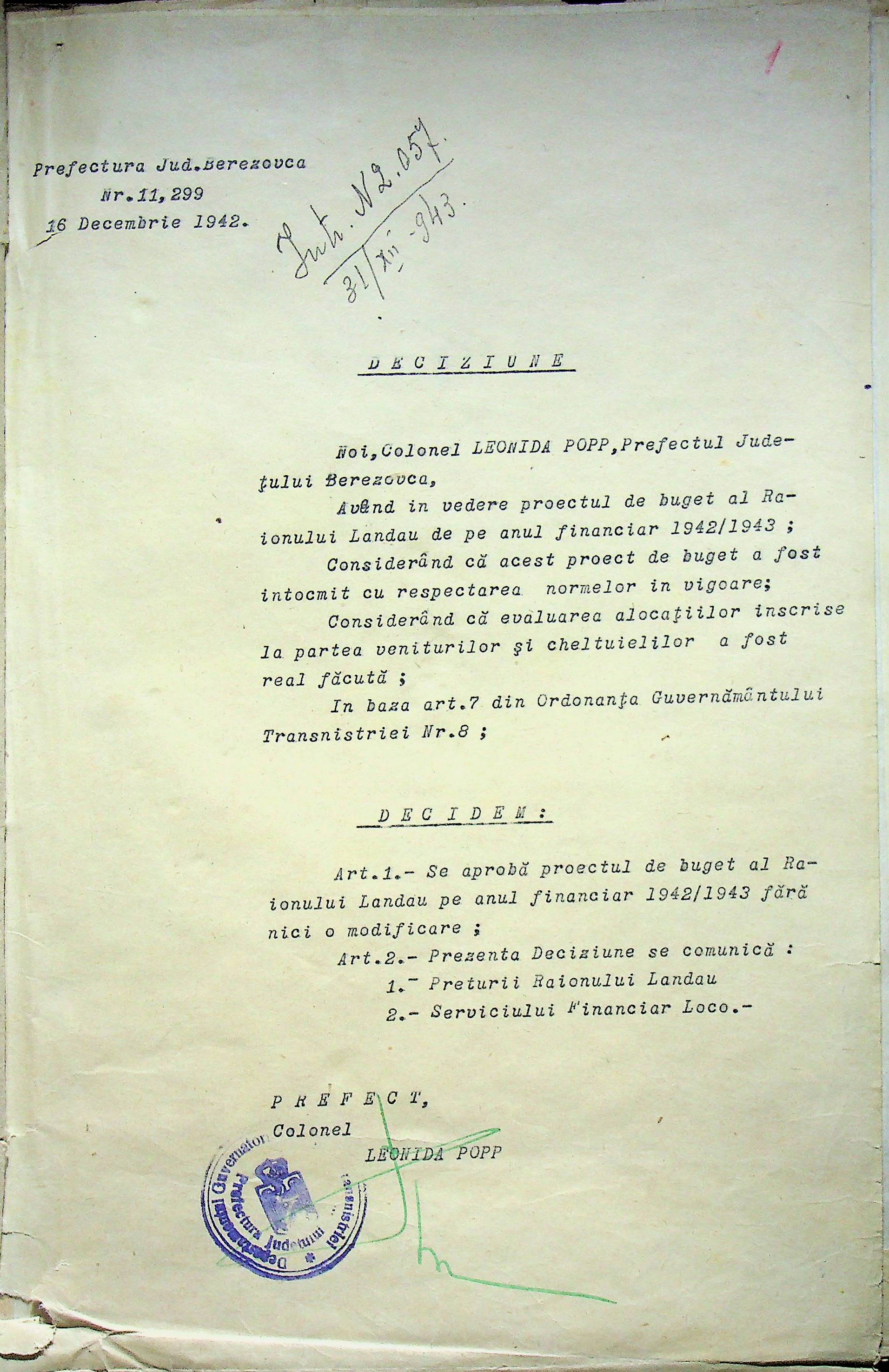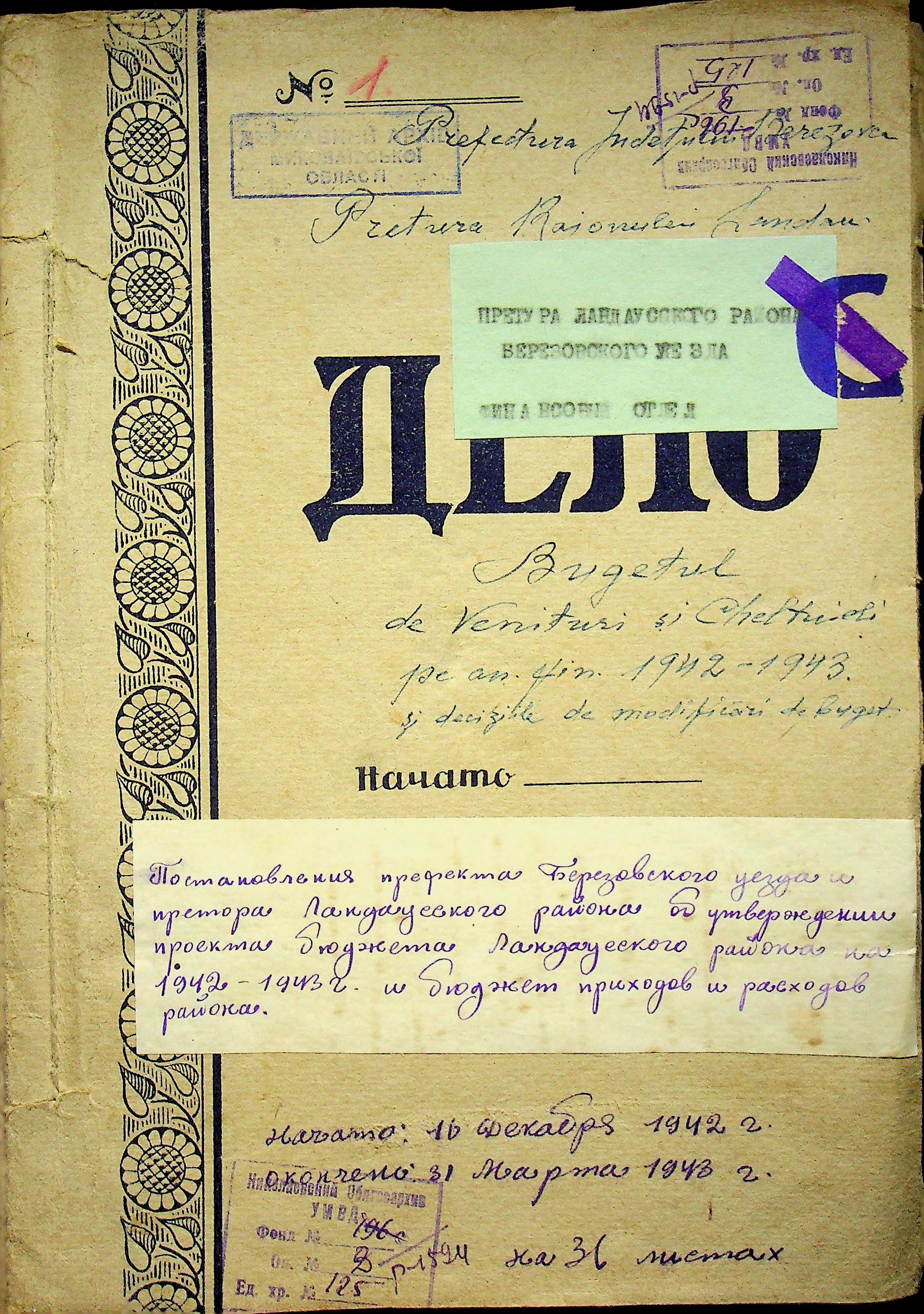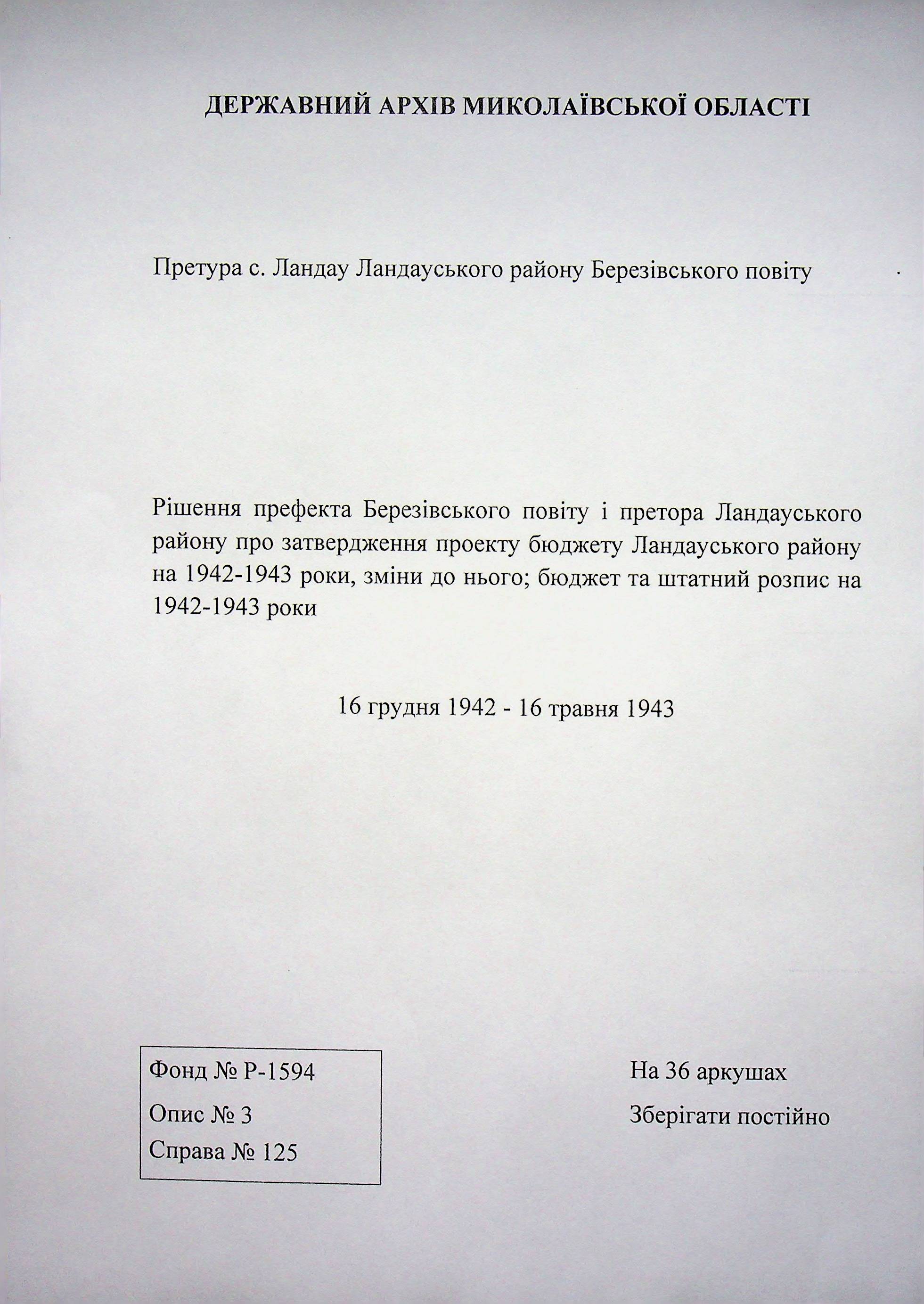 • • • • Справа № 125 Рішення префекта Березівського повіту і претора Ландауського району про затвердження проекту бюджету Ландауського району на 1942-1943 роки, зміни до нього; бюджет та штатний розпис на 1942-1943 роки