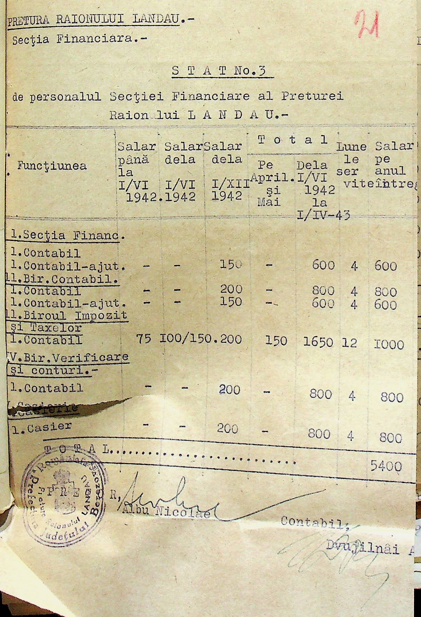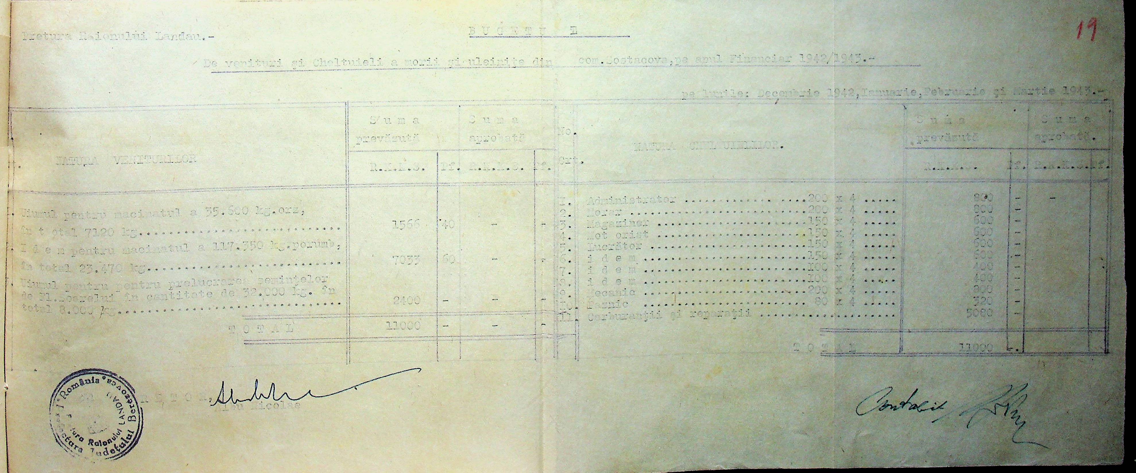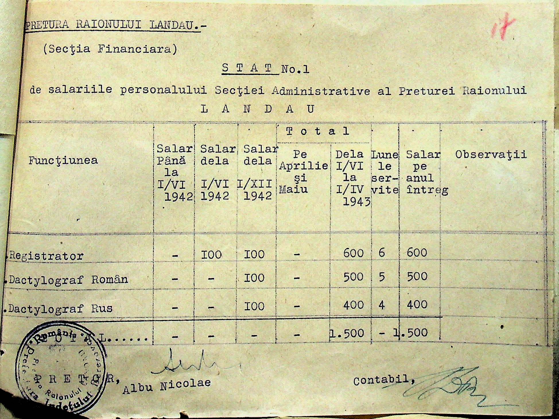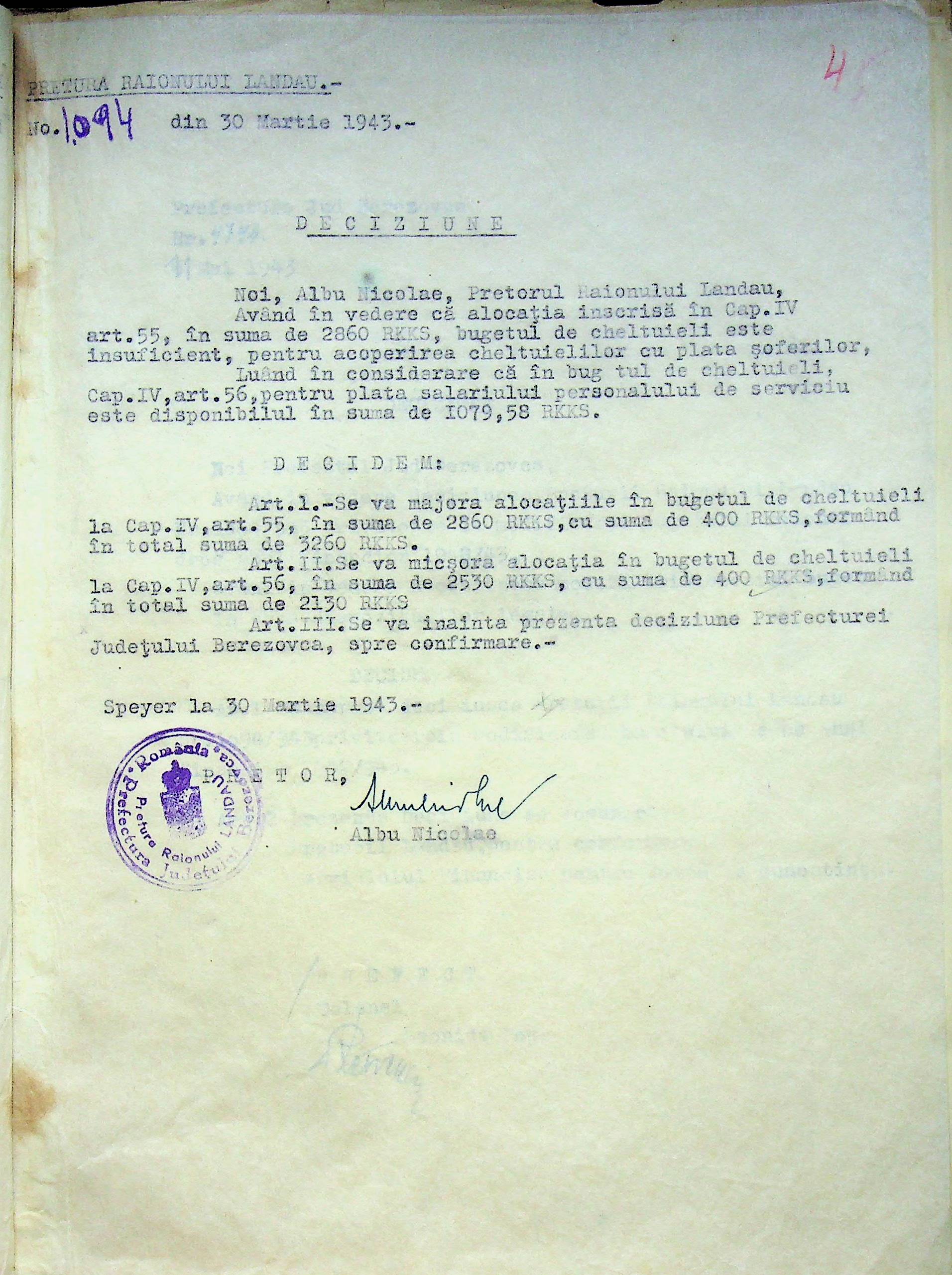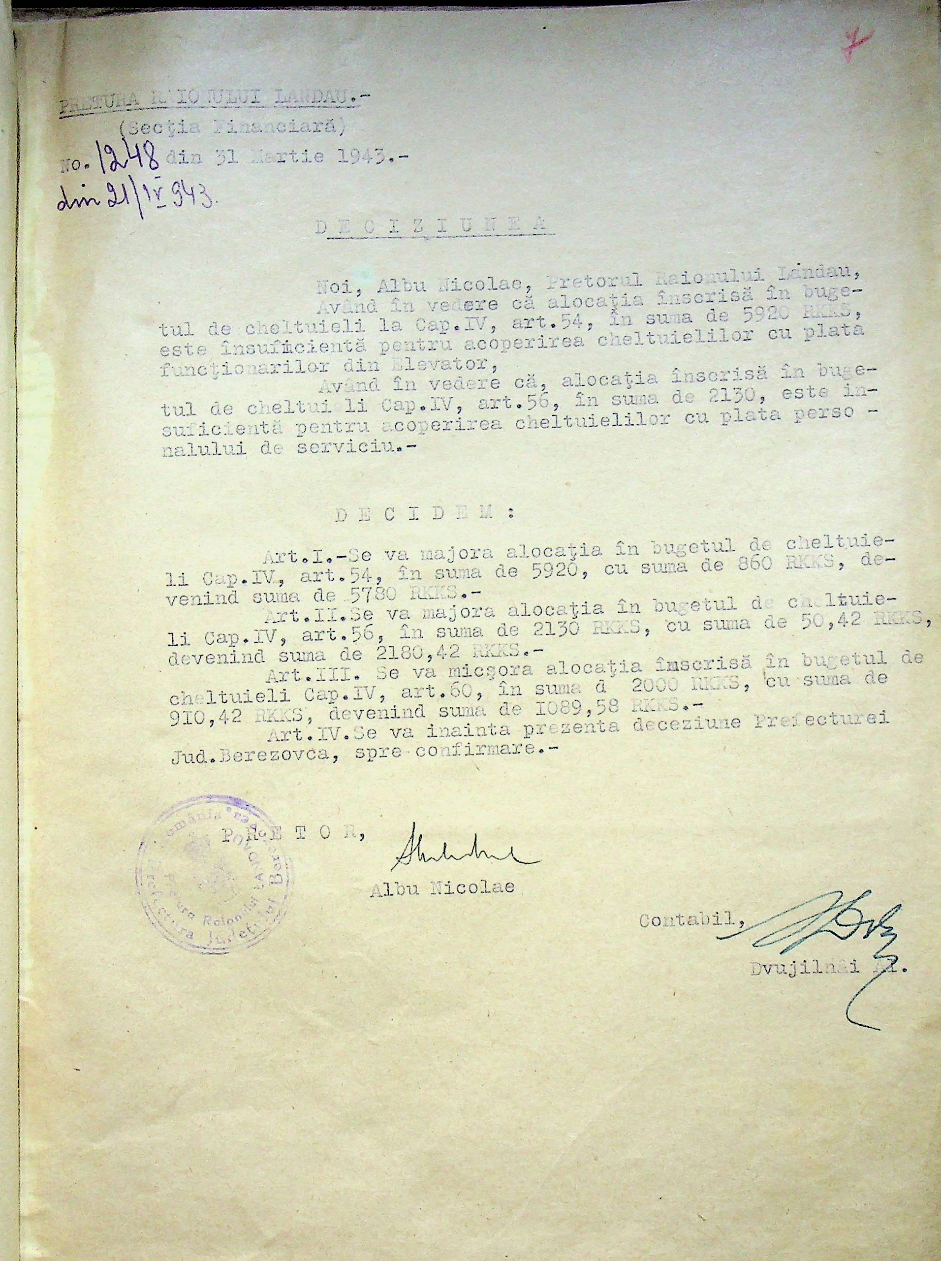• • • • Справа № 125 Рішення префекта Березівського повіту і претора Ландауського району про затвердження проекту бюджету Ландауського району на 1942-1943 роки, зміни до нього; бюджет та штатний розпис на 1942-1943 роки