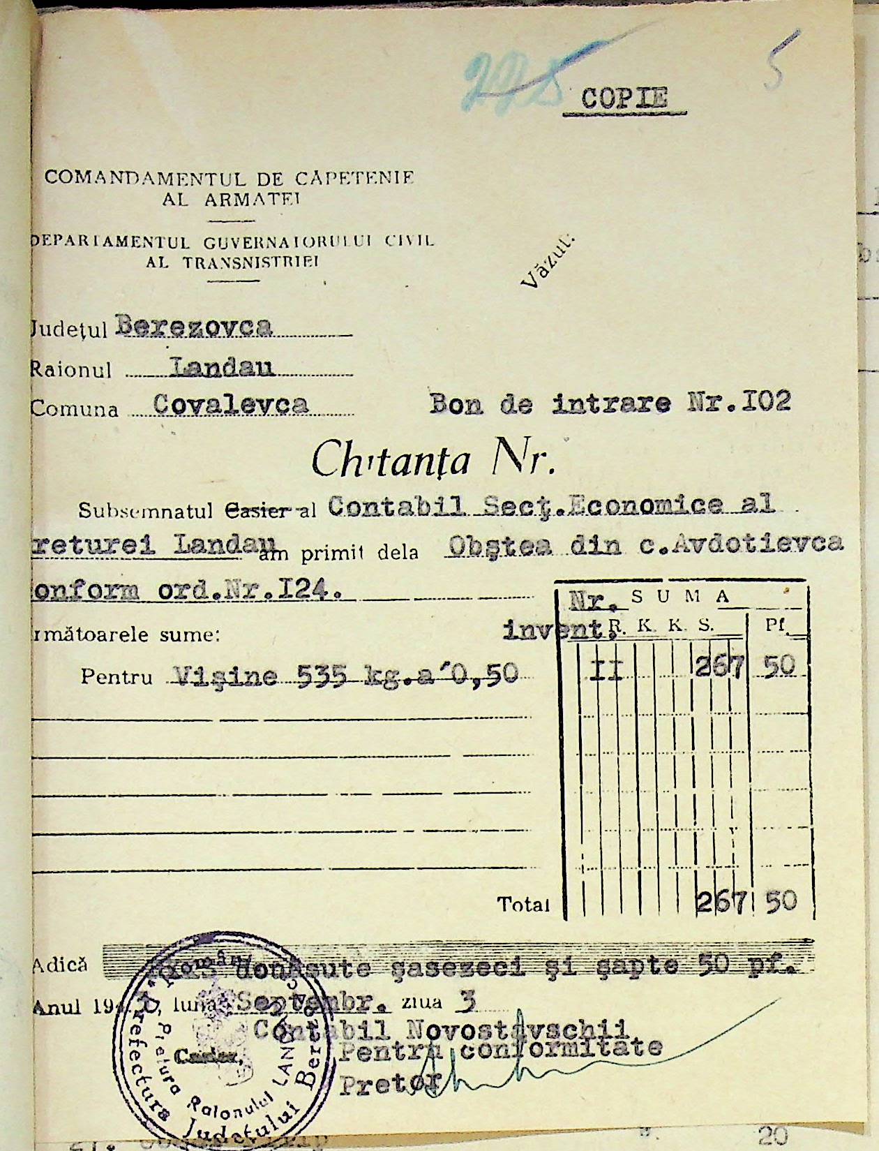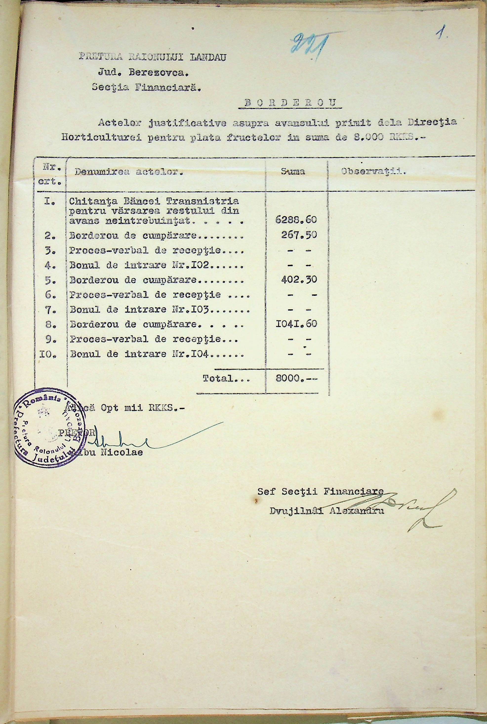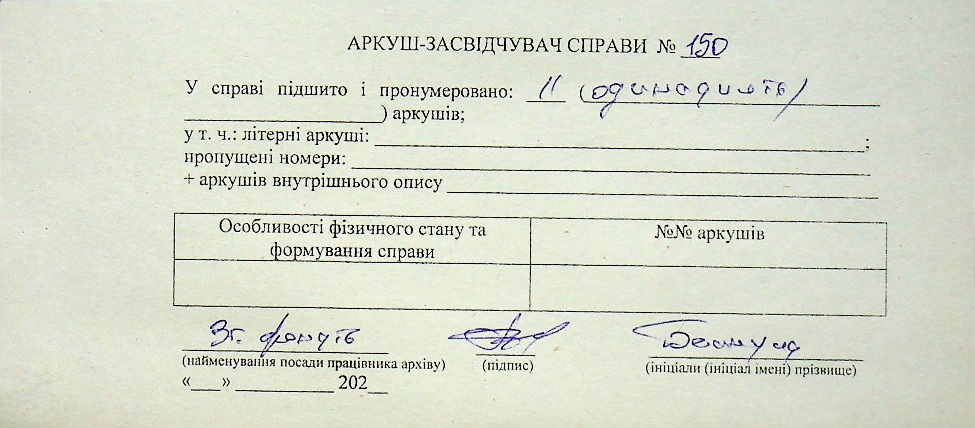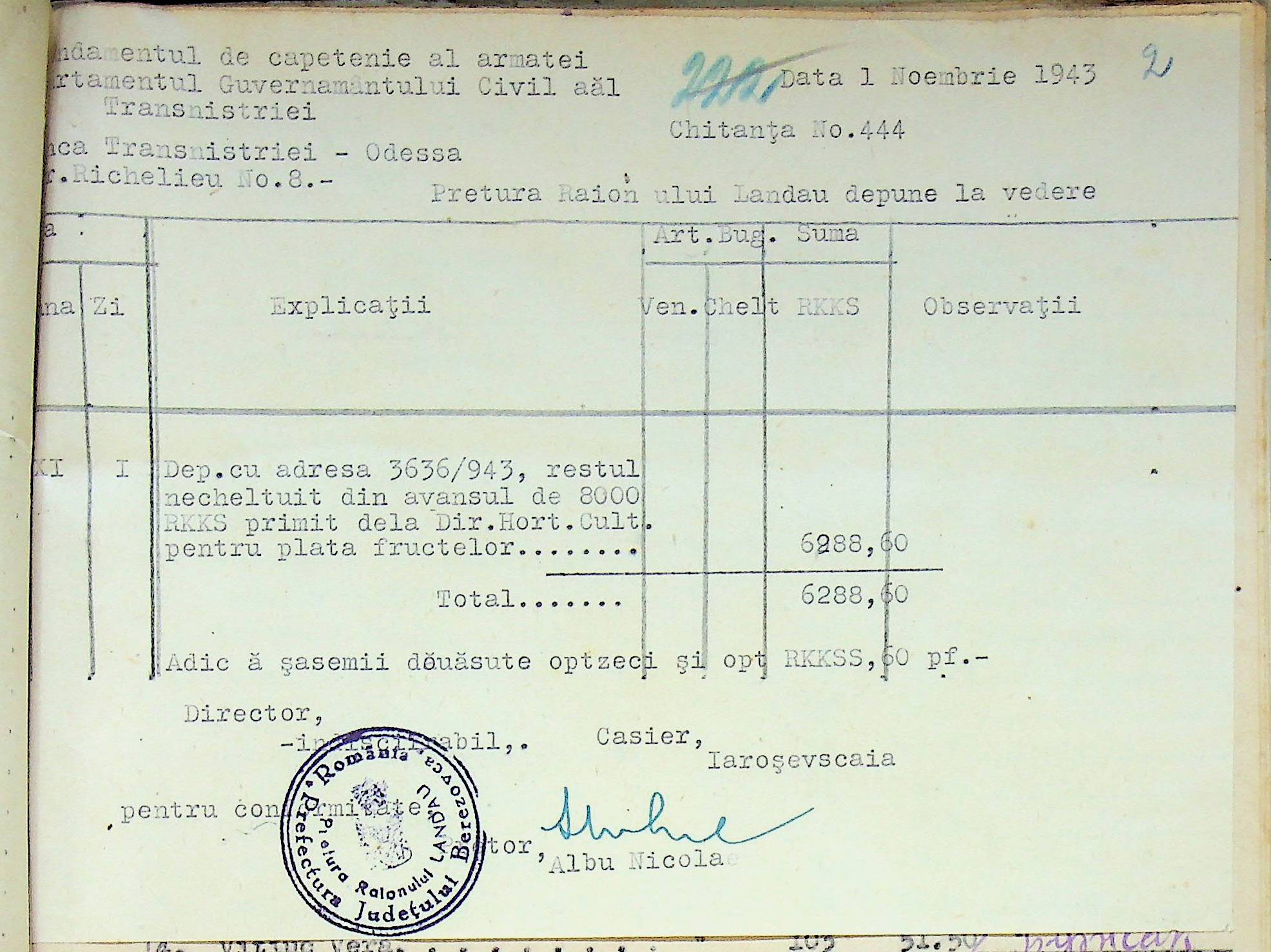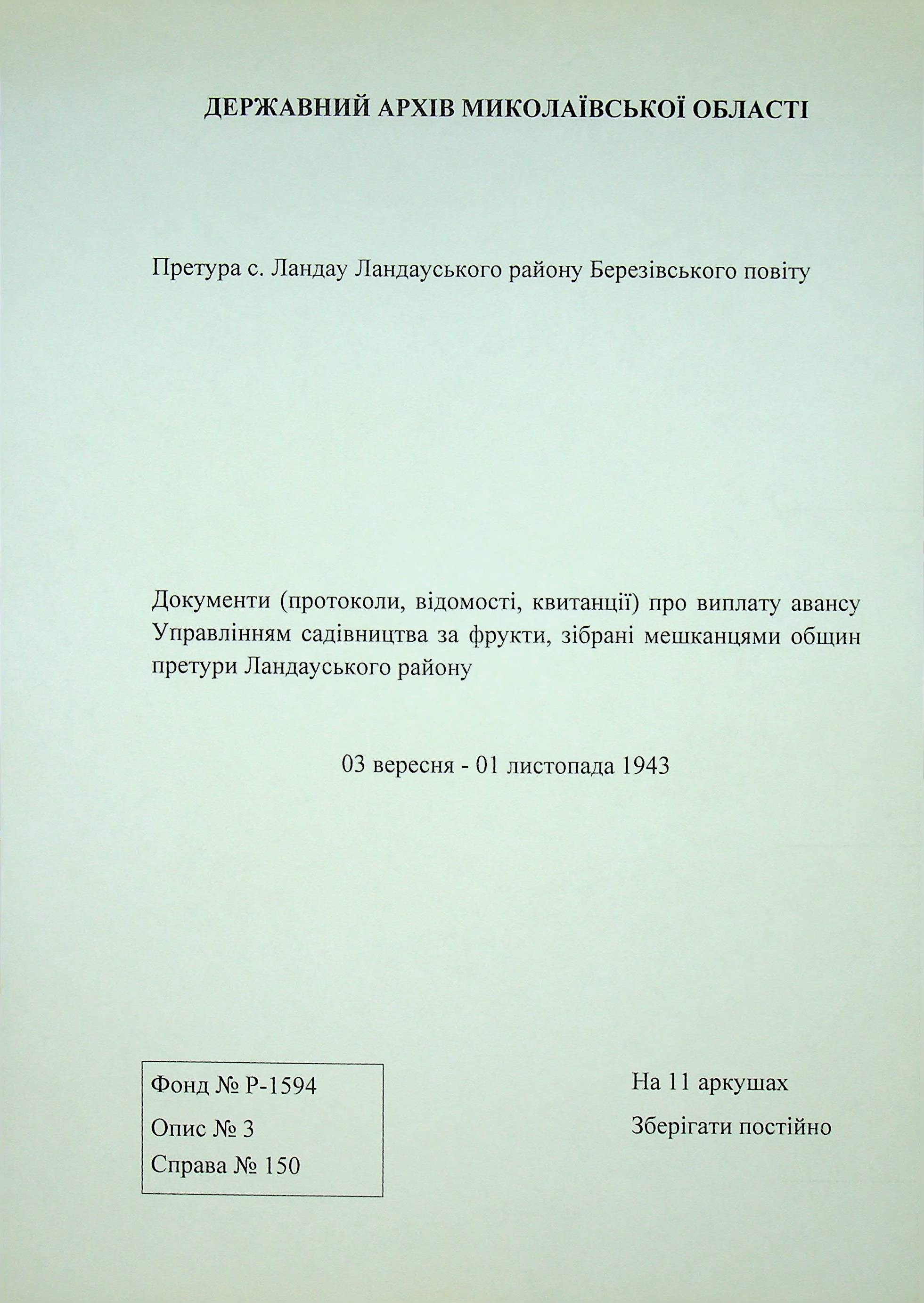 • • • • Справа № 150 Документи (протоколи, відомості, квитанції) про виплату авансу Управлінням садівництва за фрукти, зібрані мешканцями общин претури Ландауського району