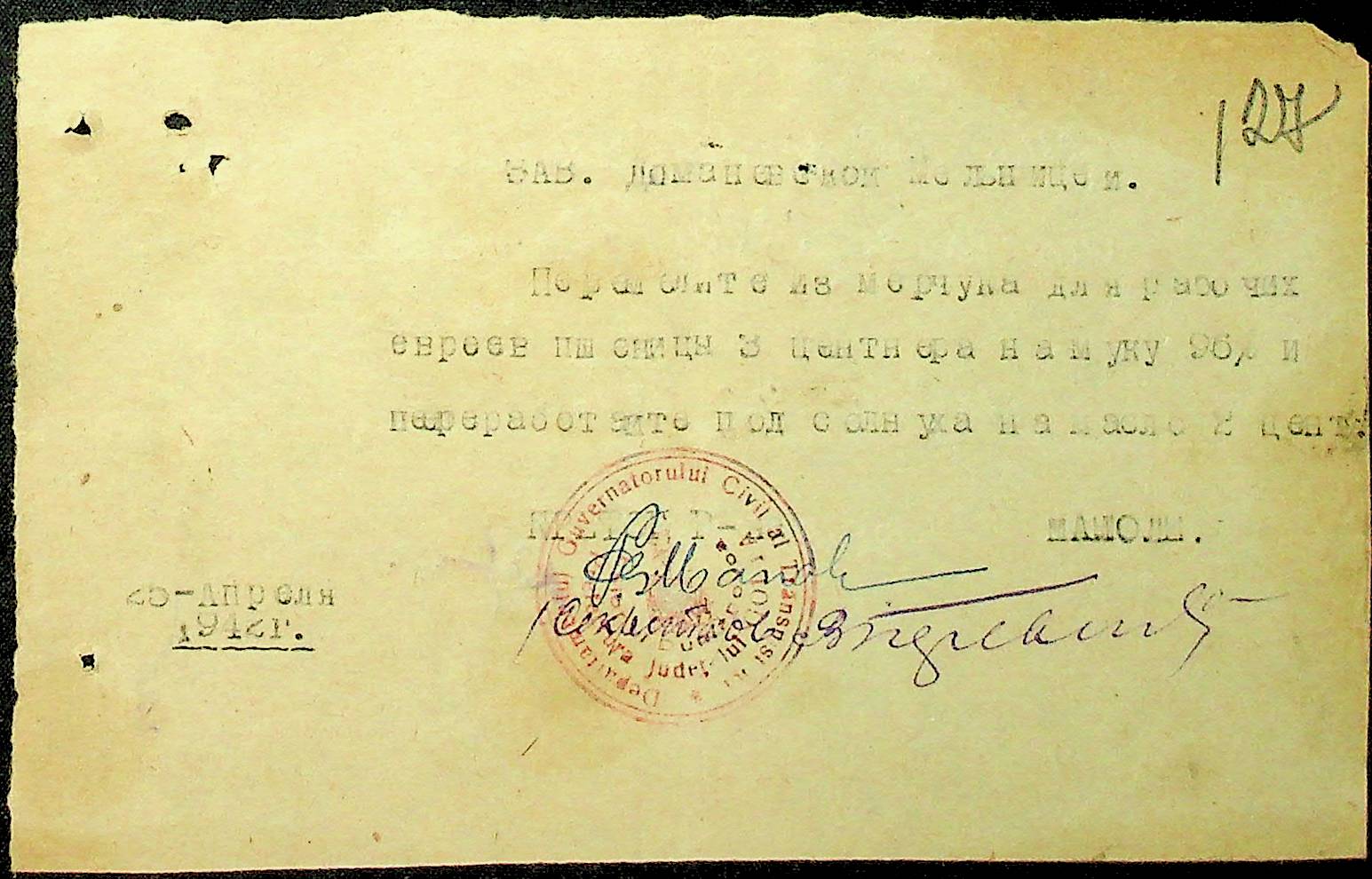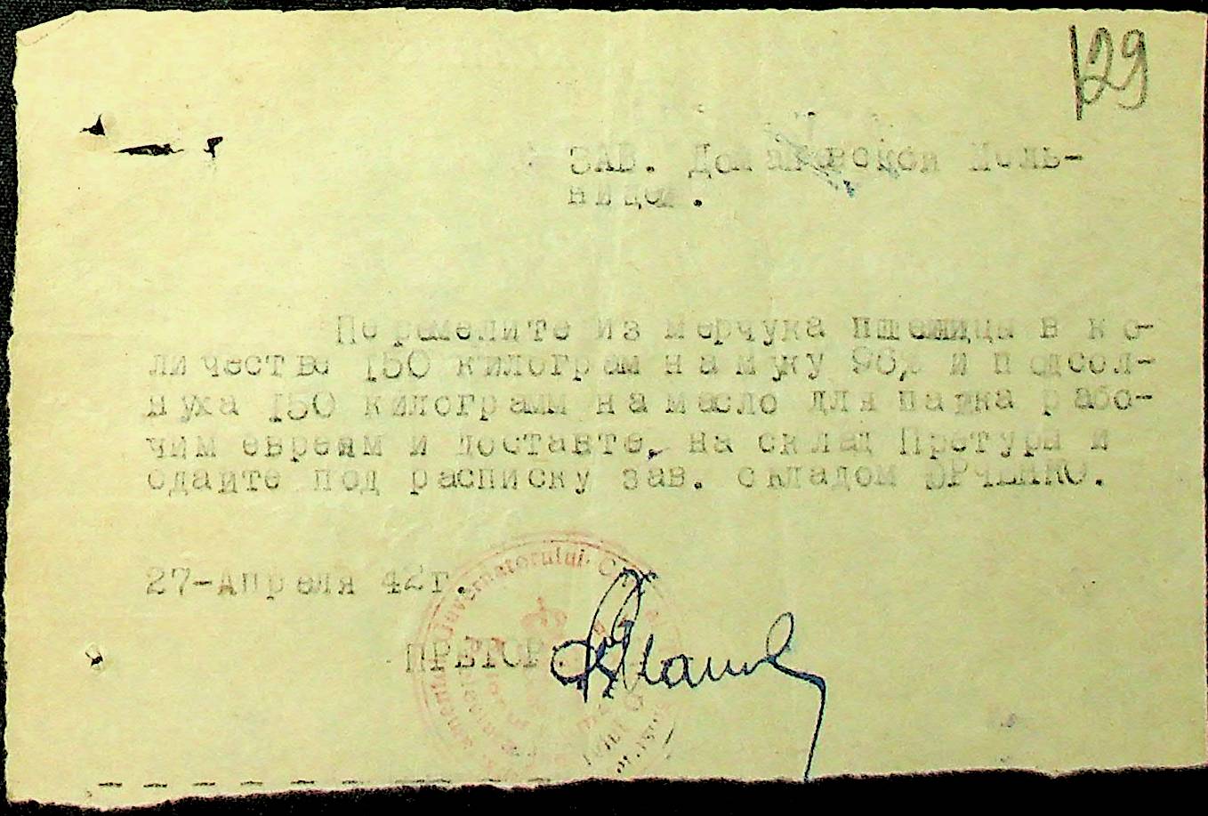 Документи (рахунки, відомості, накладні, списки, табелі, доручення, зведення, листування) про помел пшениці на борошно та видачу його німецькому командуванню, румунській жандармерії, працівникам поліції, службовцям претури; про вивезення соняшника зі складу претури на елеватор м. Голта, направлення мірчука (пшениці) на склад Доманівської претури; про отримання насіннєвого матеріалу озимої пшениці зі складу претури для трудових общин”