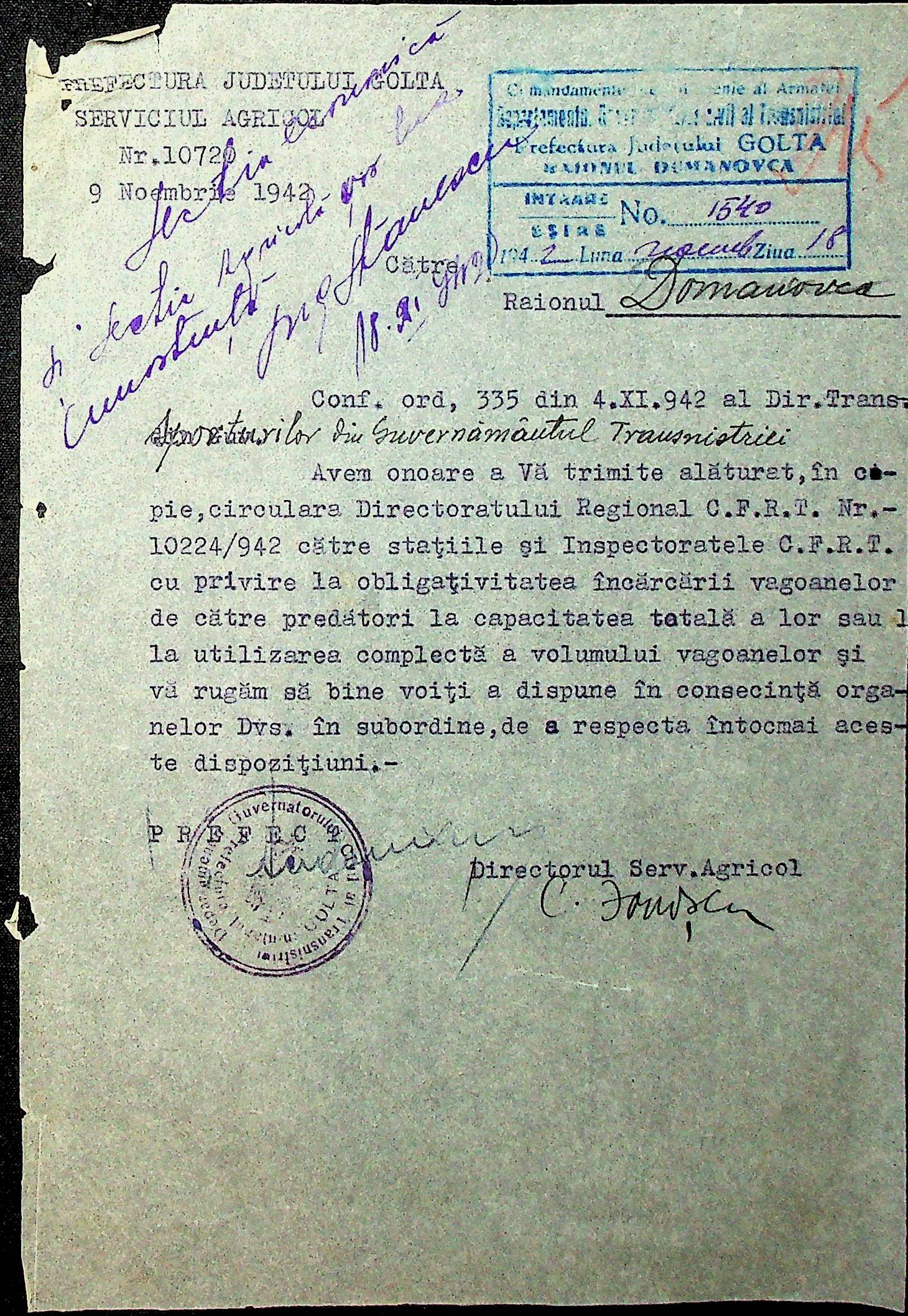 • • • • Справа № 14 “Документи (обіжники, накази, інструкції, рішення, відомості, листування) про покращення харчування армії, забезпечення жандармів продовольством, збір каракулевих шкірок, птиці, яєць, фруктів, овочів для відправки в Румунію; про порядок завантаження вагонів та використання їх об’єму в повному обсязі, випікання хліба, переробку соняшника, роботу млинів; про збір металів, що не містять заліза та матеріалів військового походження, встановлення цін на них”