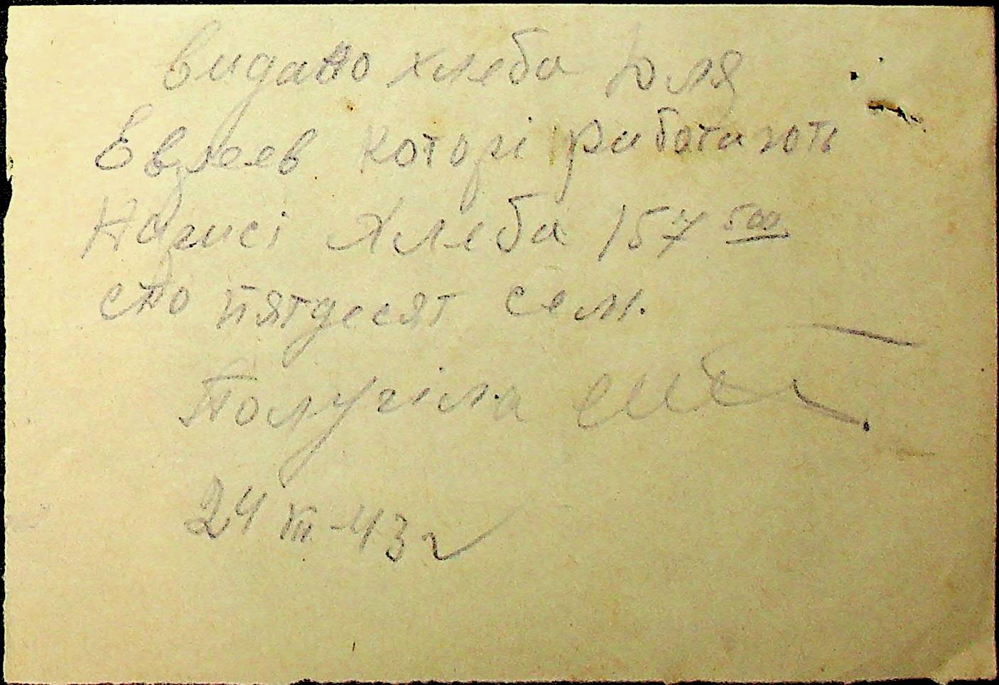 • • • • Справа № 20 “Документи (реєстри, квитанції, рахунки, товарно-матеріальні звіти, відомості, фактура, витратні ордери, довідки, акти ) про видачу мила з заводу по виготовленню мила; про продукти, що надійшли від забою худоби по реквізиції та через вимушене дорізування общинної і приватної худоби; про витрати сировини і пального для випікання хліба пекарнею Доманівської претури, кількість готової продукції, видачу хліба із пекарні; про збір молока та виробництво бринзи”