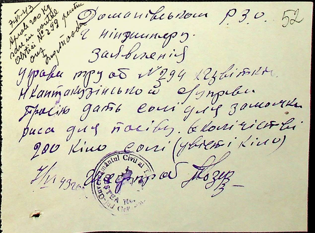 • • • • Справа № 22 “Документи (прохання, заяви, доручення, листування) про відпуск солі, ковальського вугілля, вапна, цвяхів, запчастин для сільгоспмашин; про засолювання огірків та посів рису, ремонт сільгоспінвентарю, встановлення насосних станцій водопостачання для рисосіяння; про виділення тари для збору меду трудовими общинами Доманівського району”