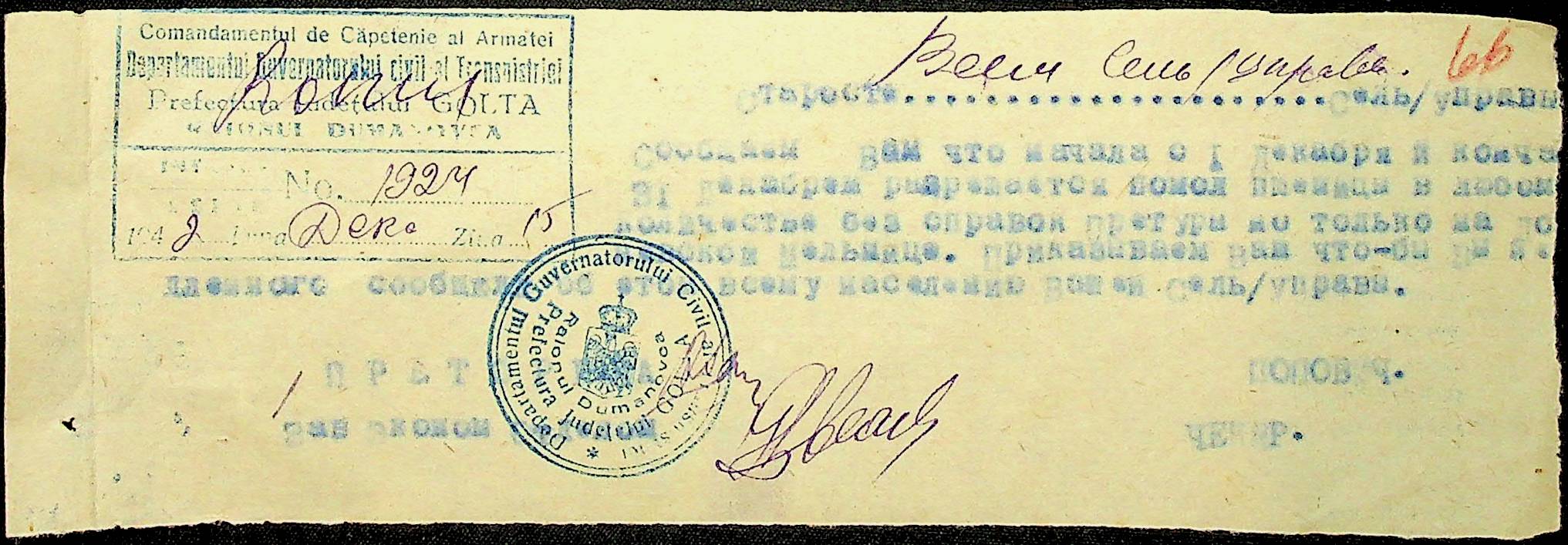 • • • • Справа № 28 “Постанова Губернаторства Трансністрії про порядок помелу зерна для цивільного населення на державних і орендованих млинах. Інструкція з пожежної охорони млинів Голтського повіту. Відомості про роботу млинів і олійниць трудових общин і держферм Доманівського району. Листування з завідувачем Доманівським млином про порядок реєстрації та ведення обліку помелу зерна”