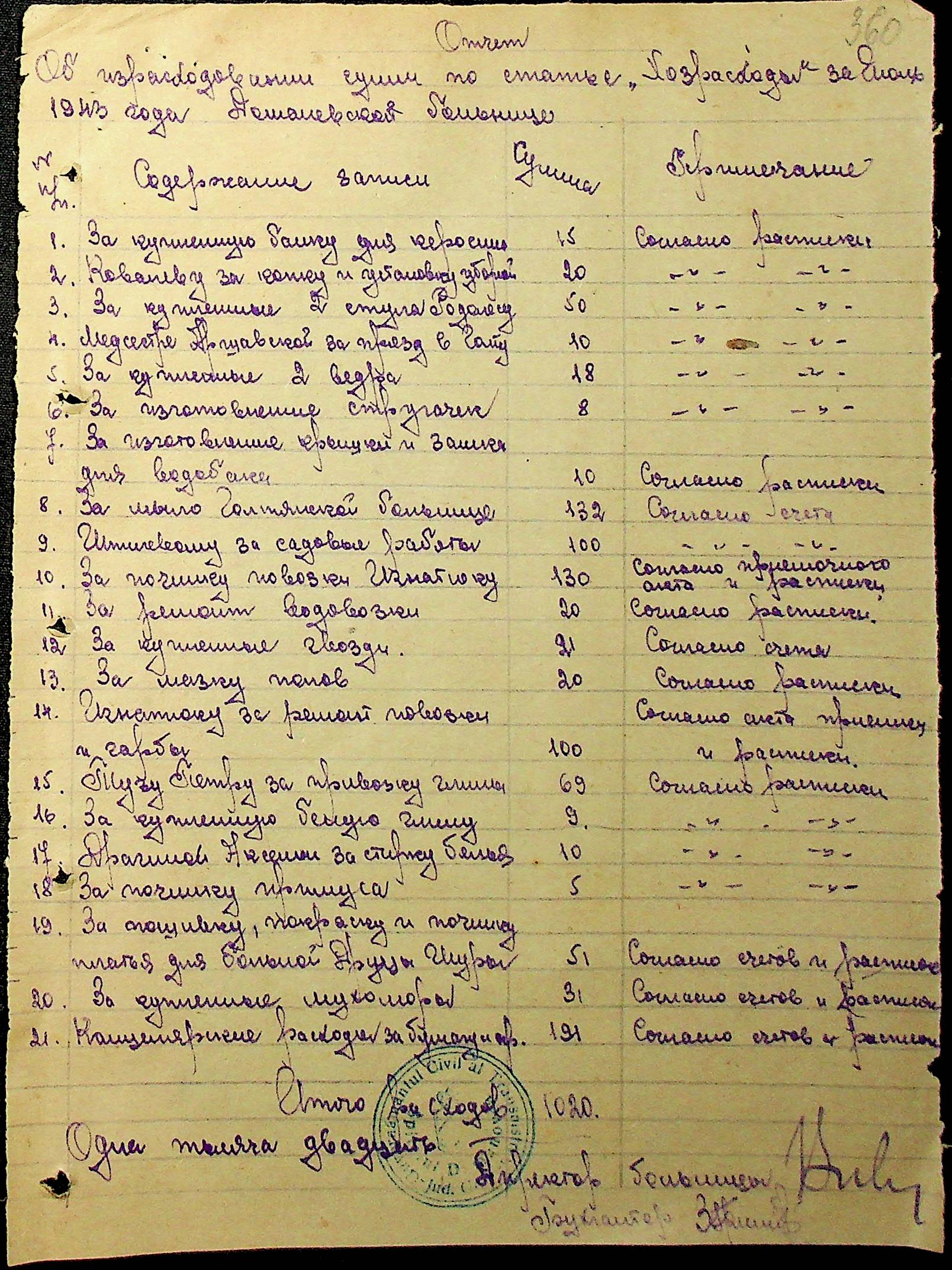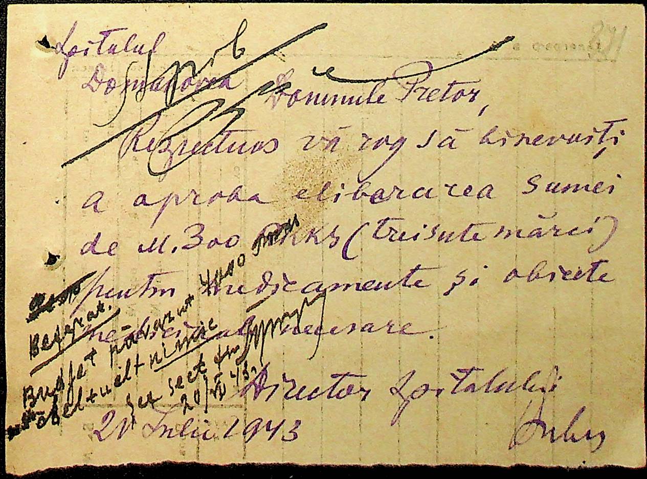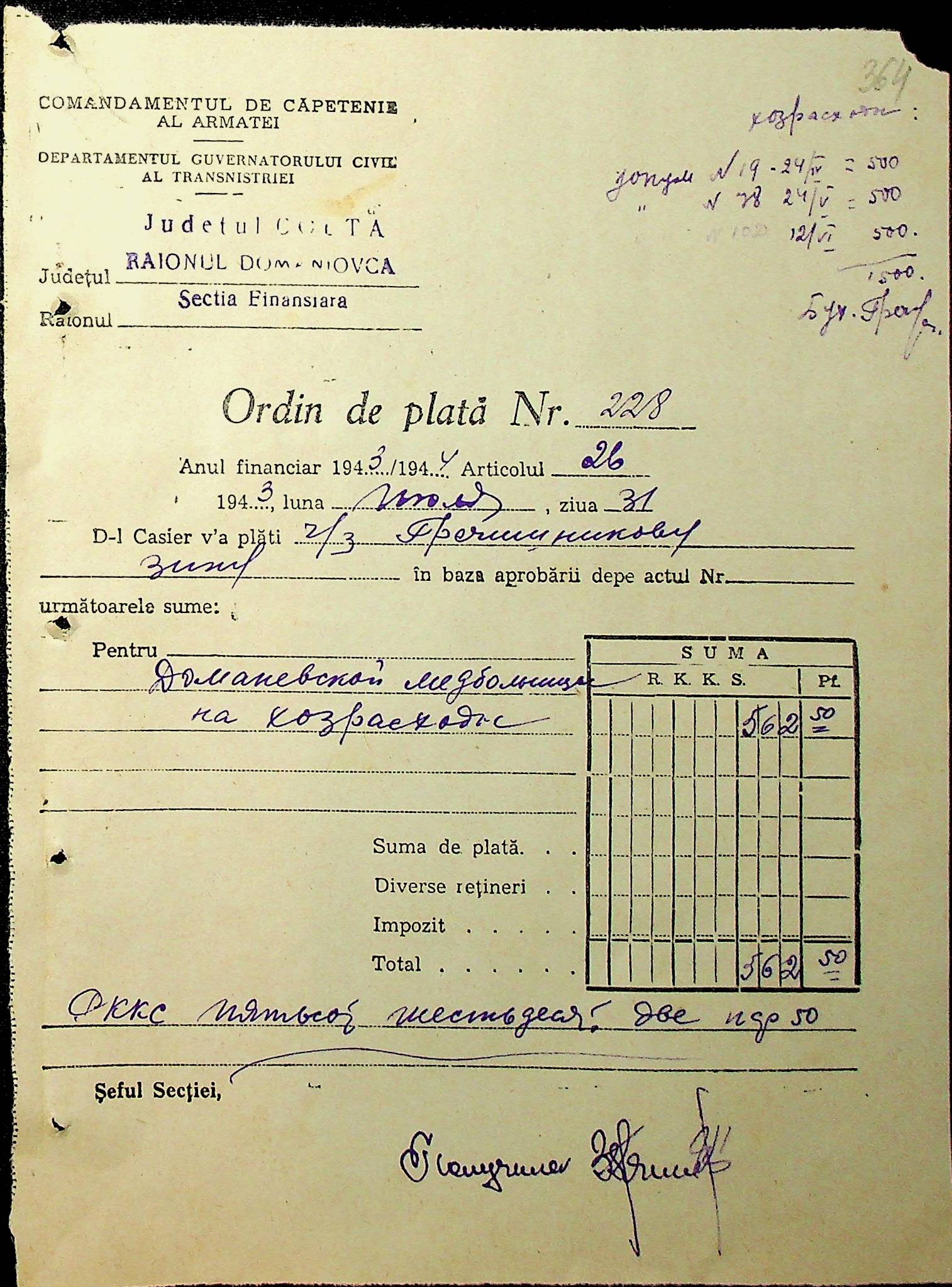 • • • • Справа № 54 “Первинні бухгалтерські документи (платіжні доручення, прибуткові та видаткові касові ордери, авансові звіти, касові документи) за 1943 рік. Відомості нарахування та виплати заробітної плати робітникам і службовцям претури, шкіл, пошти, лікарні, млина0”