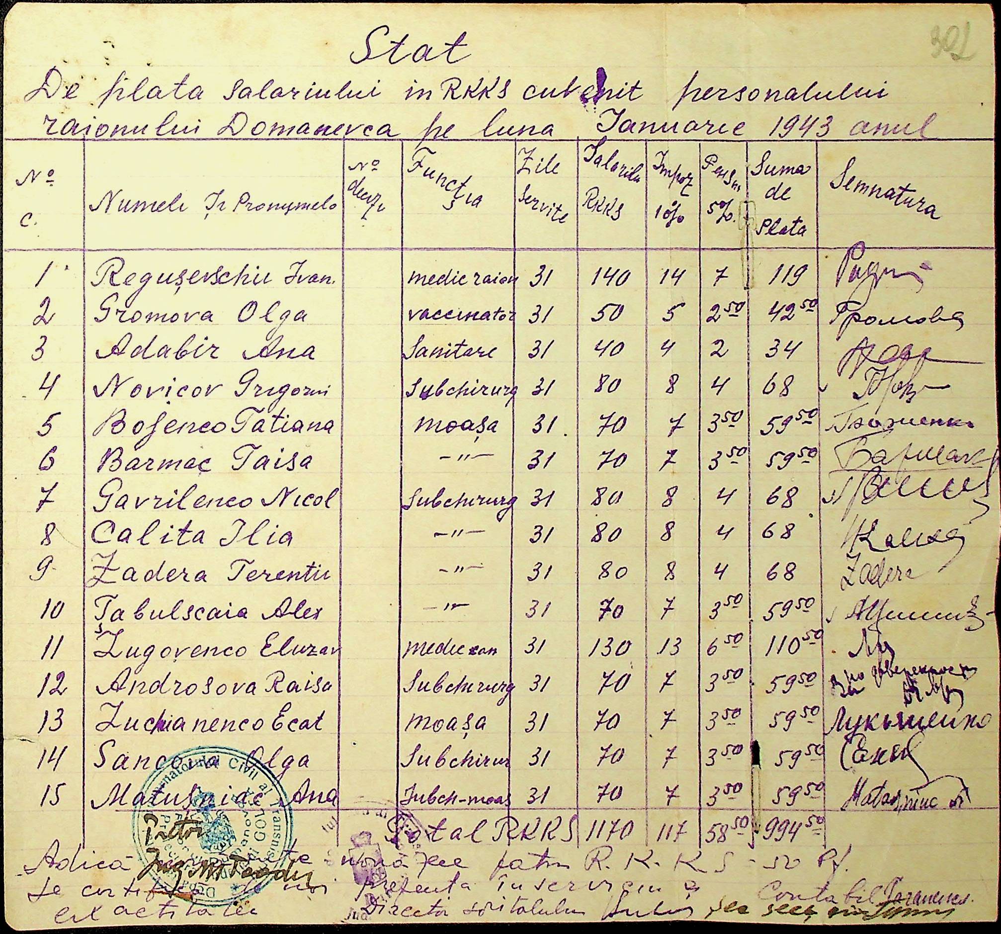 Відомості на виплату допомоги та заробітної плати службовцям за етнічне походження, вчителям, співробітникам ветеринарної лікарні, аптеки, санітарного відділу, млина та олійниці”