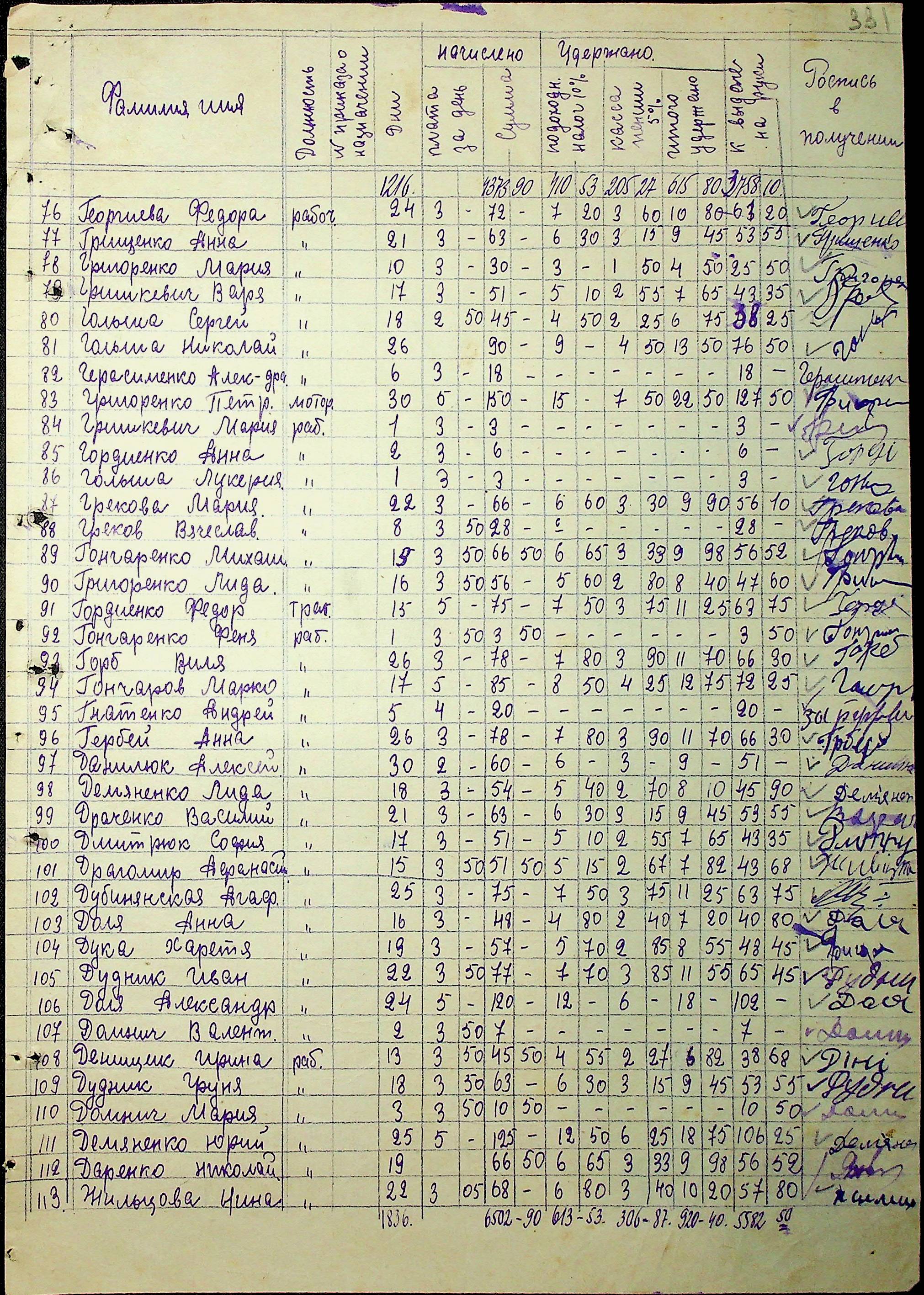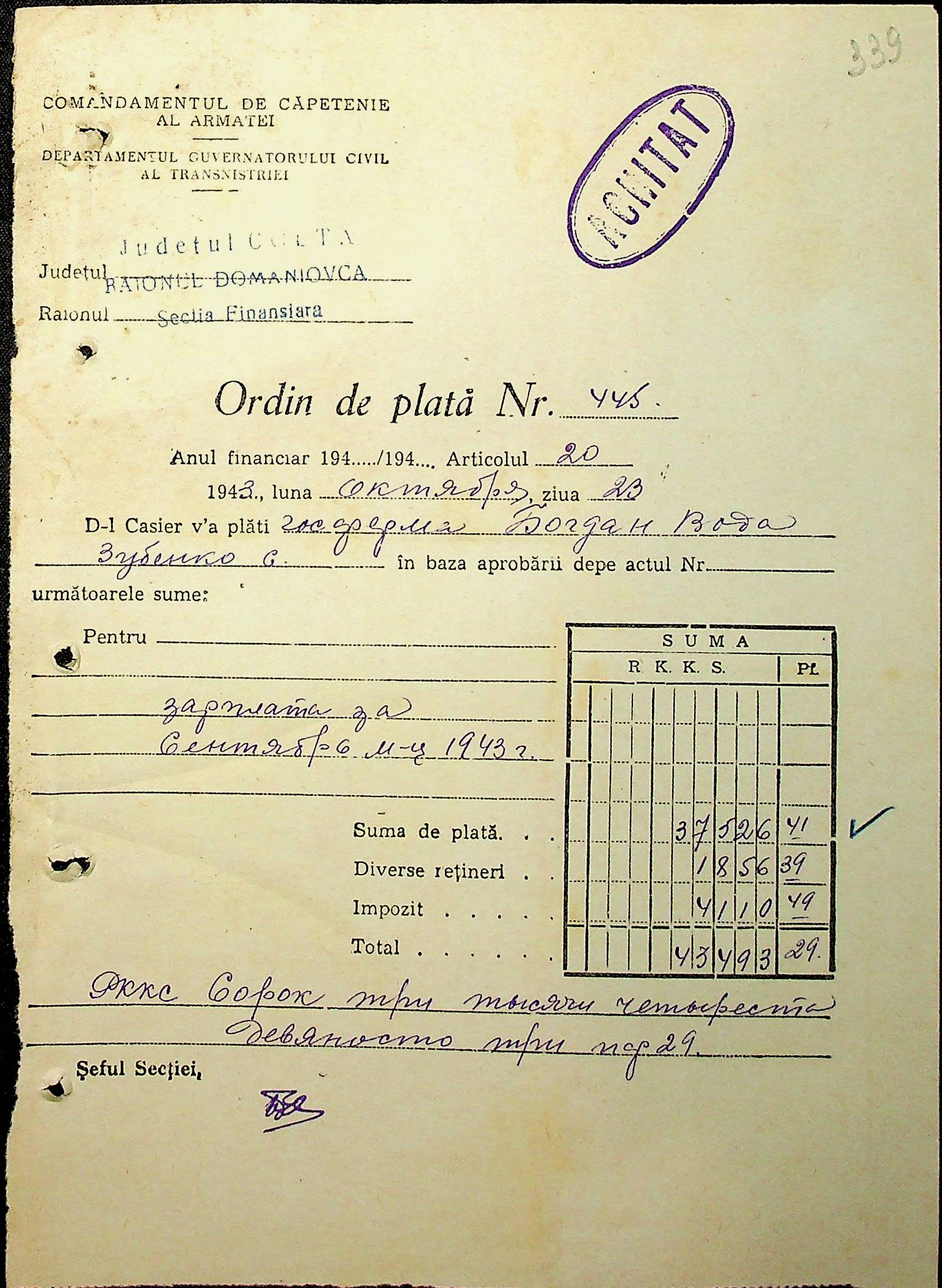 • • • • Справа № 91 “Первинні бухгалтерські документи (прибуткові касові ордери, авансові звіти, платіжні доручення, товарні чеки) за 1943 рік. Відомості нарахування та виплати заробітної плати робітникам і службовцям держферм, трактористам і бригадирам МТС, вчителям, будівельникам, євреям держферми «Маршал Антонеску». Кошториси на ремонт церков, приймально-здавальні та закупівельні акти щодо запасних частин, необхідних для ремонту тракторів та комбайнів”