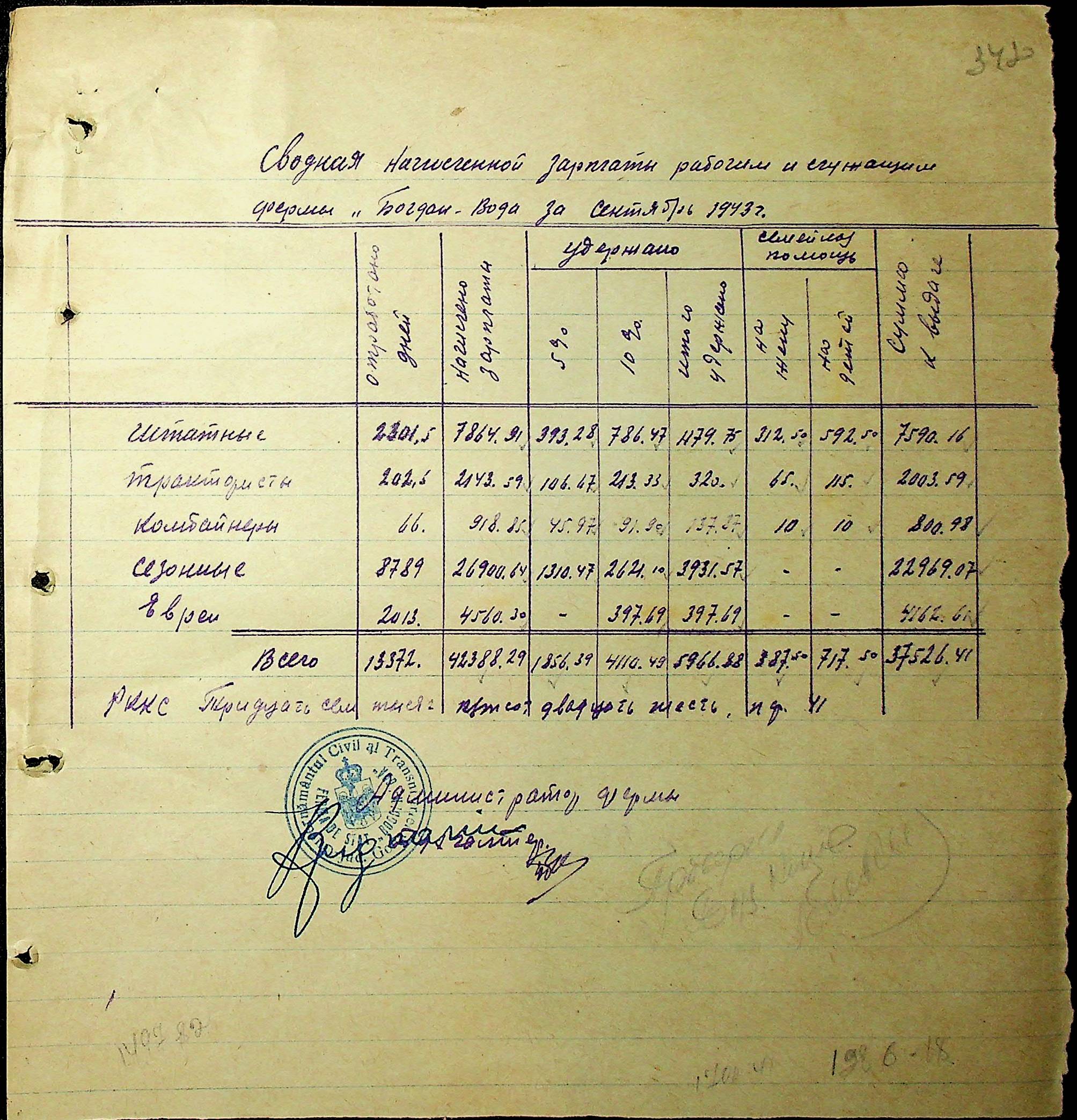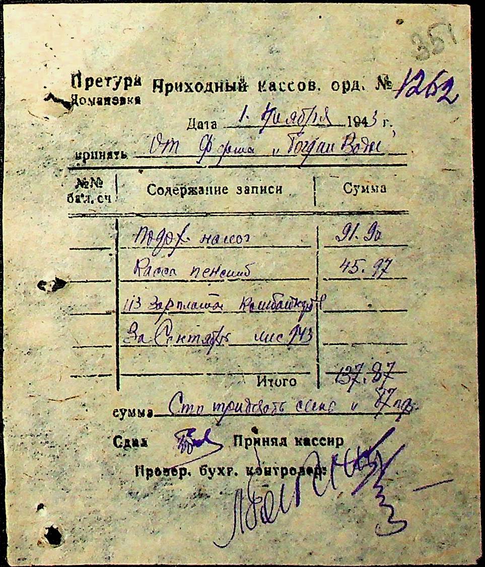 • • • • Справа № 91 “Первинні бухгалтерські документи (прибуткові касові ордери, авансові звіти, платіжні доручення, товарні чеки) за 1943 рік. Відомості нарахування та виплати заробітної плати робітникам і службовцям держферм, трактористам і бригадирам МТС, вчителям, будівельникам, євреям держферми «Маршал Антонеску». Кошториси на ремонт церков, приймально-здавальні та закупівельні акти щодо запасних частин, необхідних для ремонту тракторів та комбайнів”