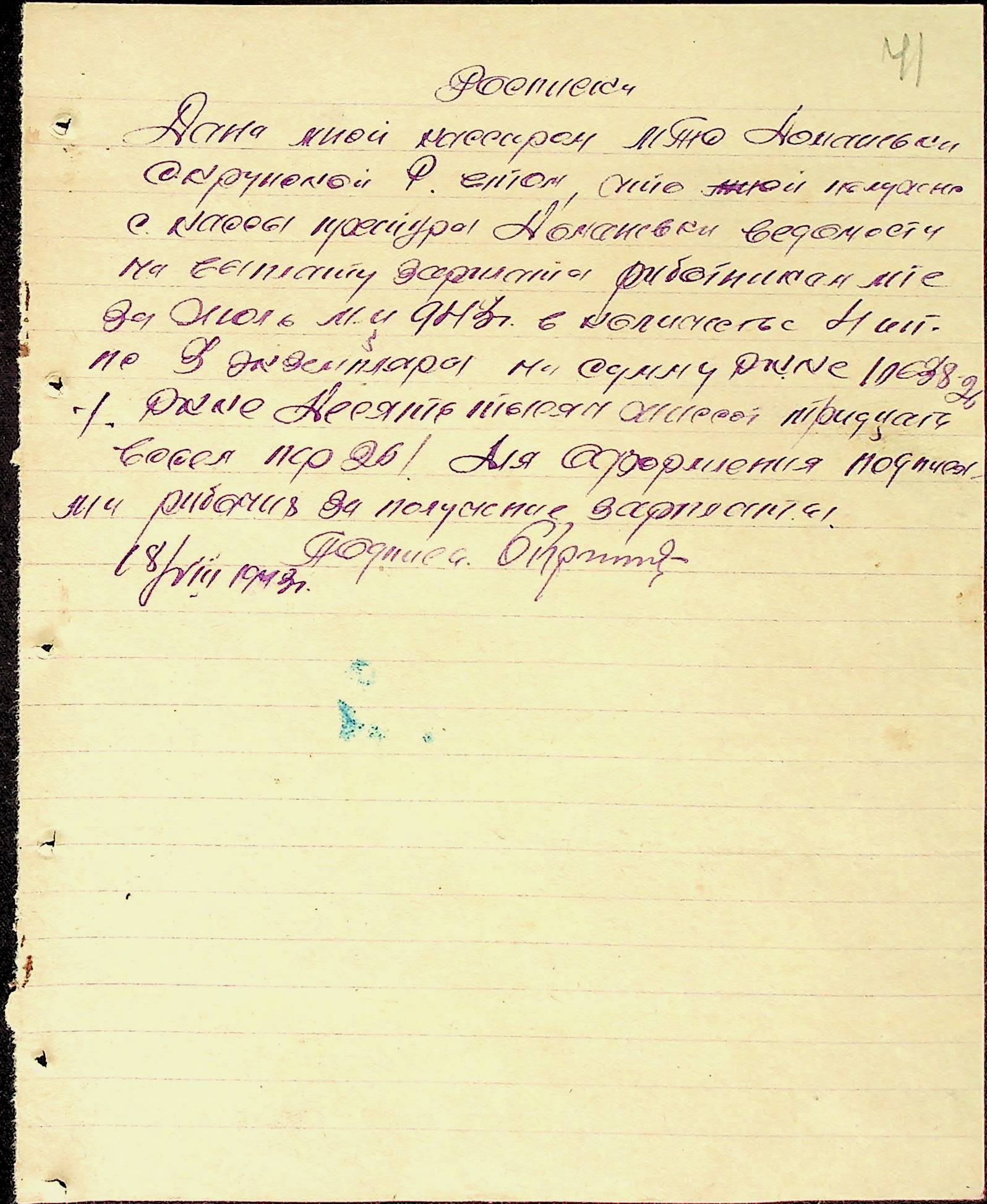 ◦ ◦ ◦ Опис № 1 справ постійного зберігання за 1941–1944 роки
