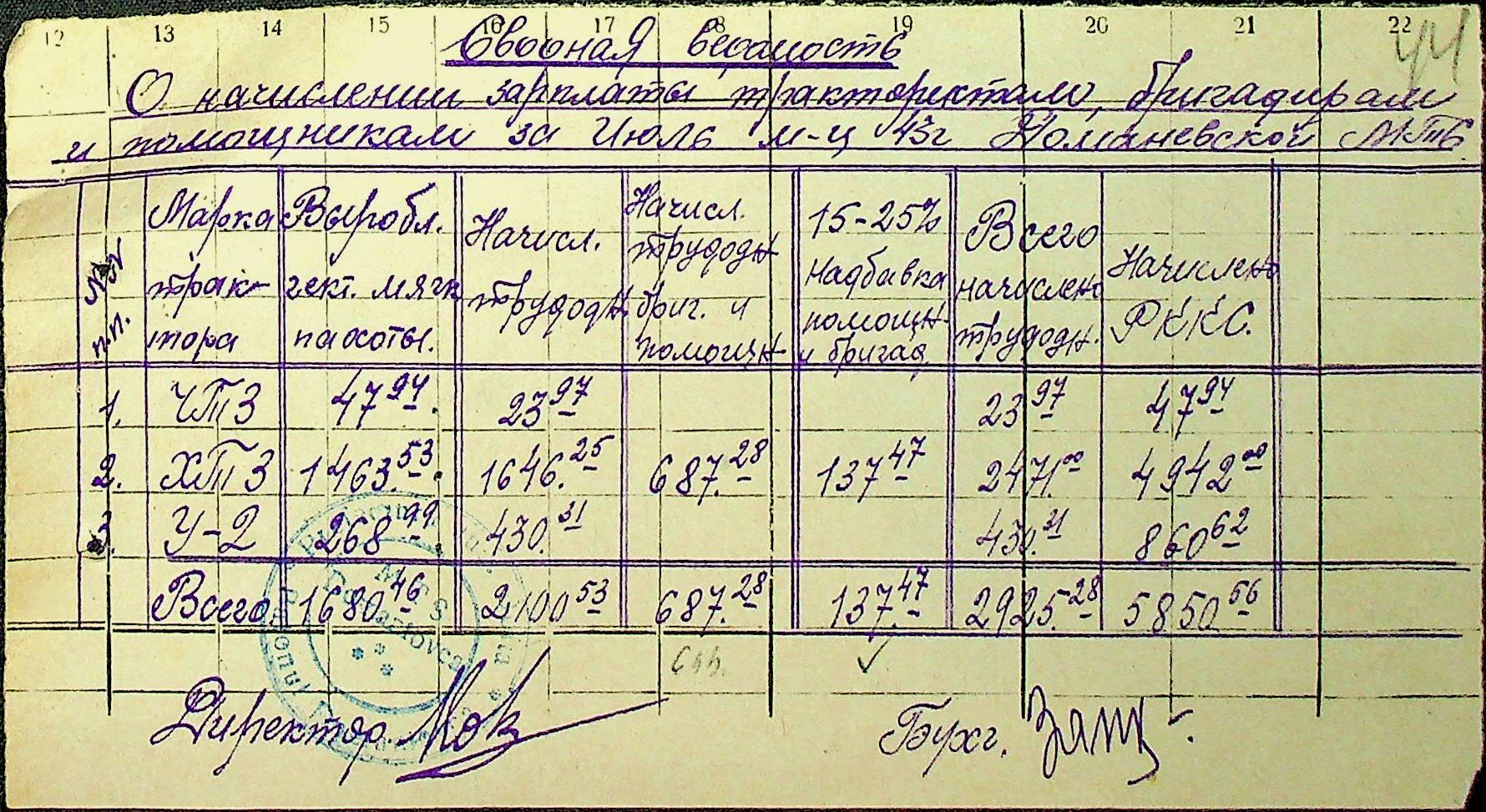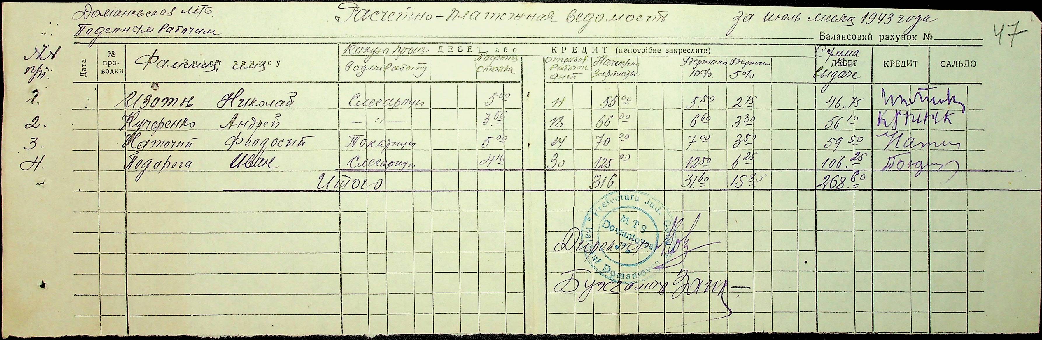 • • • • Справа № 103 “Відомості нарахування та виплати заробітної плати робітникам і службовцям держферм, трактористам і бригадирам МТС, працівникам аптек, лікарень; платіжні доручення та авансові звіти про сплату податків, переказ коштів на відрядження, ремонт претури та млина, харчування хворих, будівництво моста, ремонт тракторів, комбайнів та молотарок, книги обліку для примарій Доманівського району”