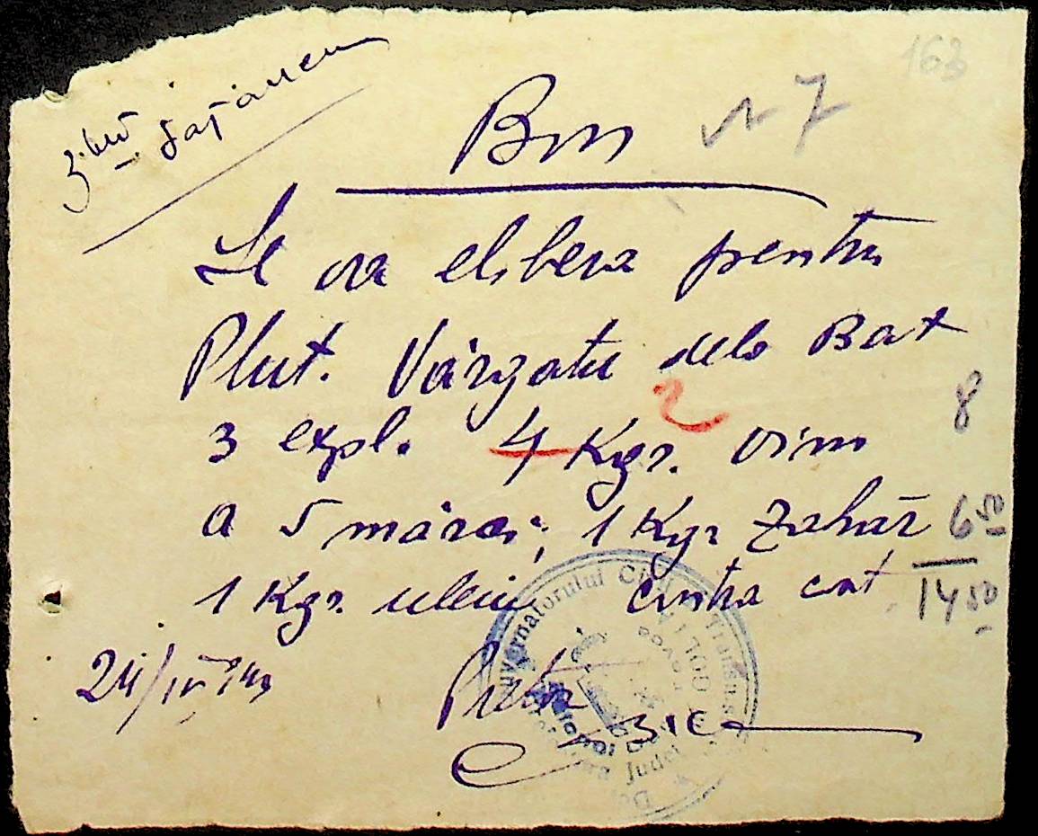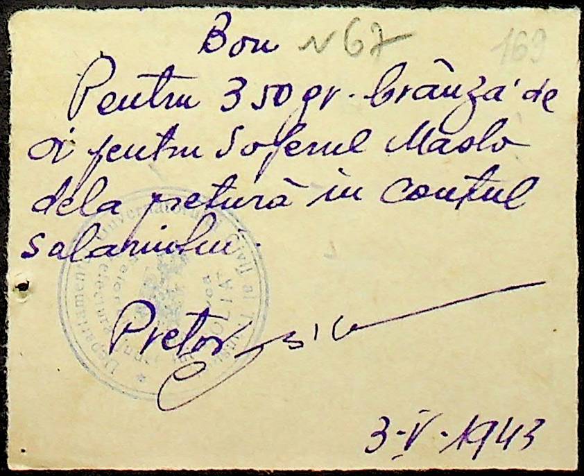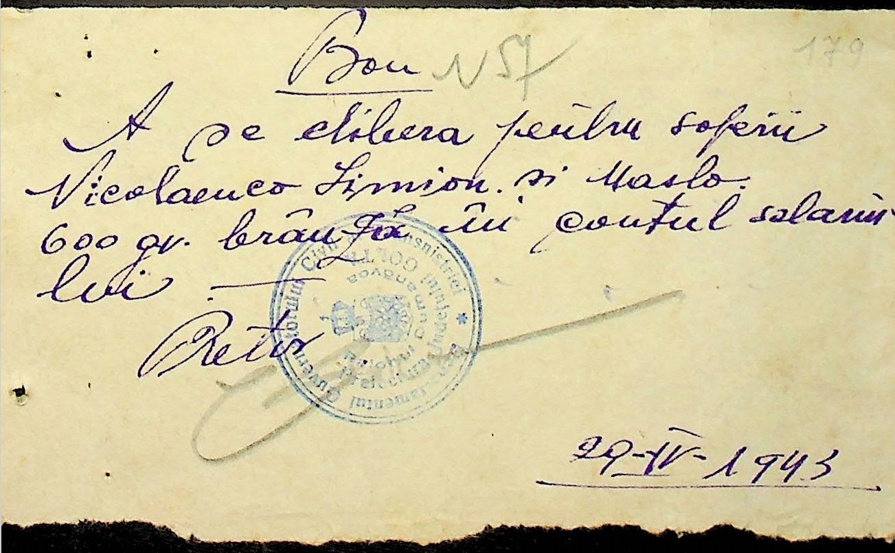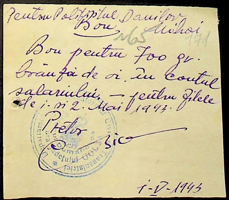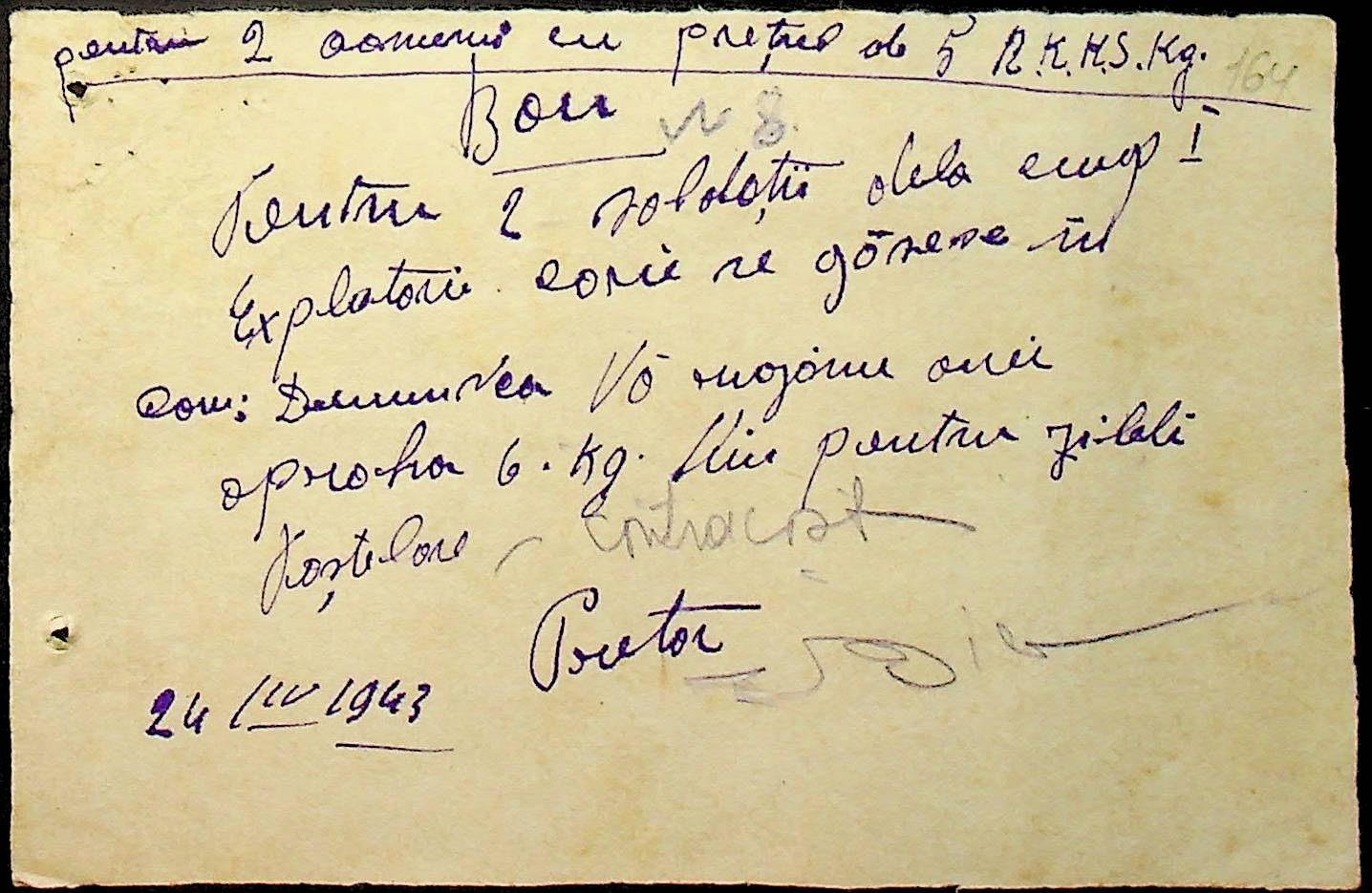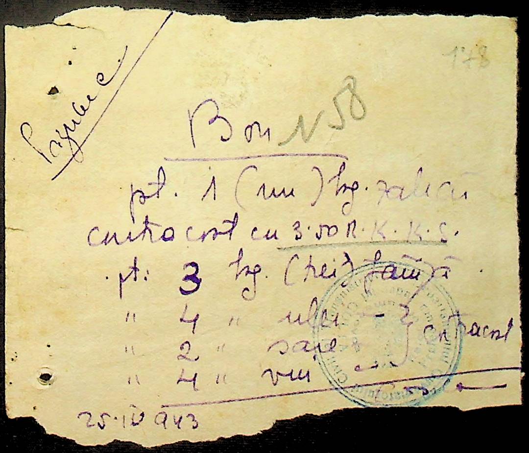• • • • Справа № 11 “Первинні документи (квитанції, фактури, прибуткові та витратні ордери, вхідні ваучери, рахунки, товарно-грошові звіти) за 1943 рік. Відомості на видачу солі общинам, фермам, претурі, пекарні, бійні; про видачу товарів із магазинів в кредит, видачу м’яса сім’ям трактористів, які виїхали в Румунію. Акти про забій худоби, звіти про випікання хлібу”