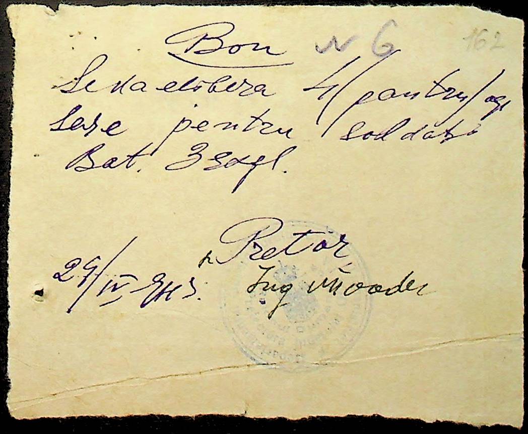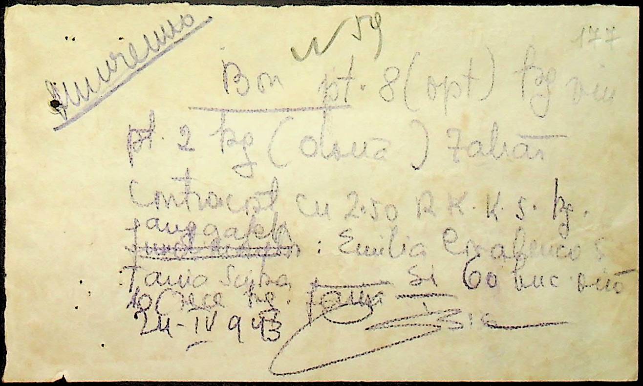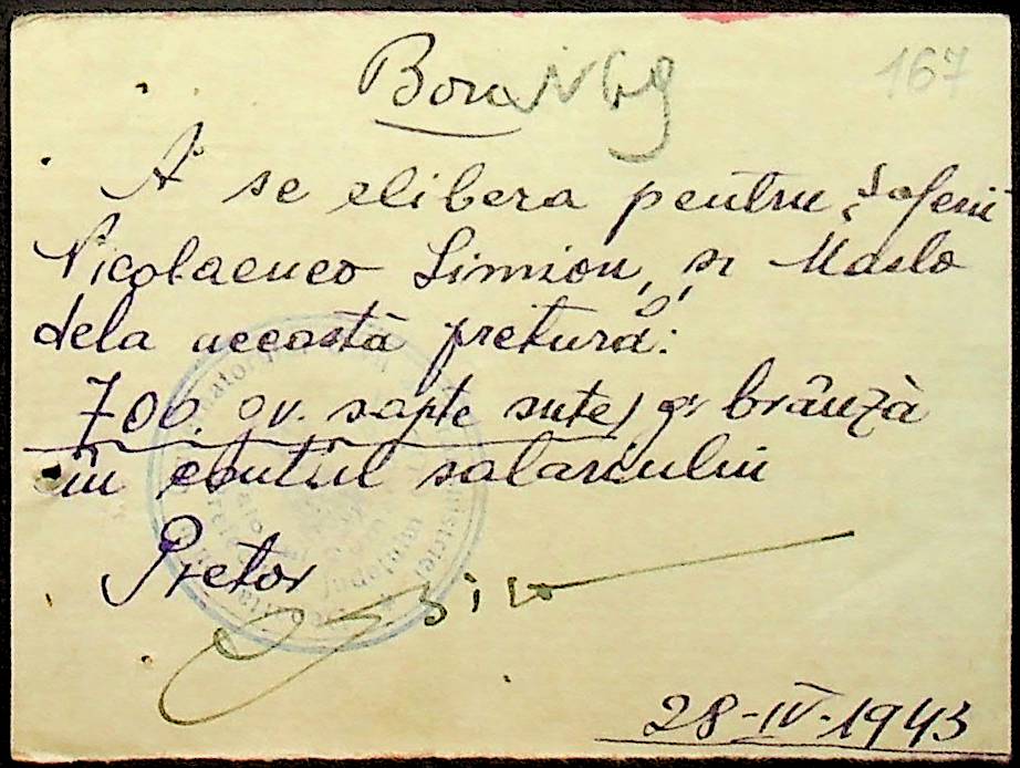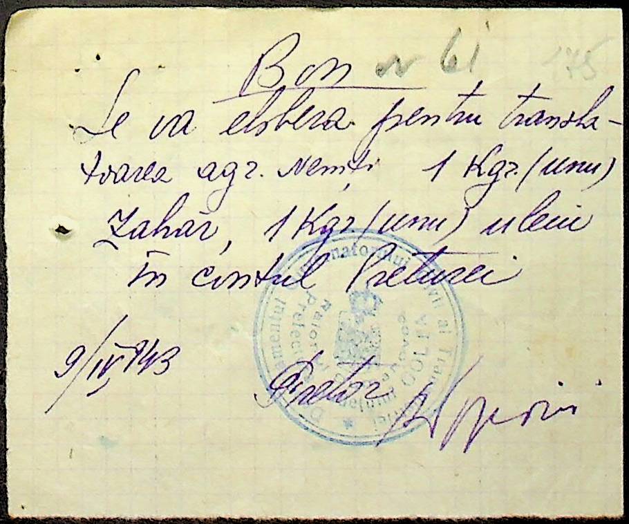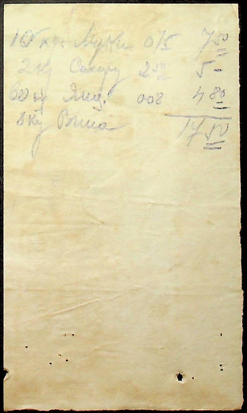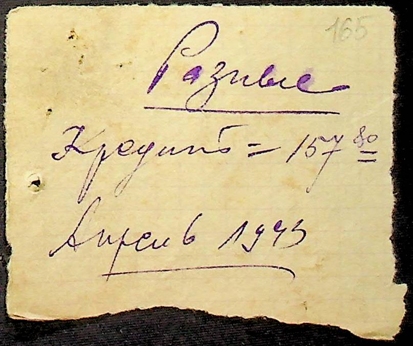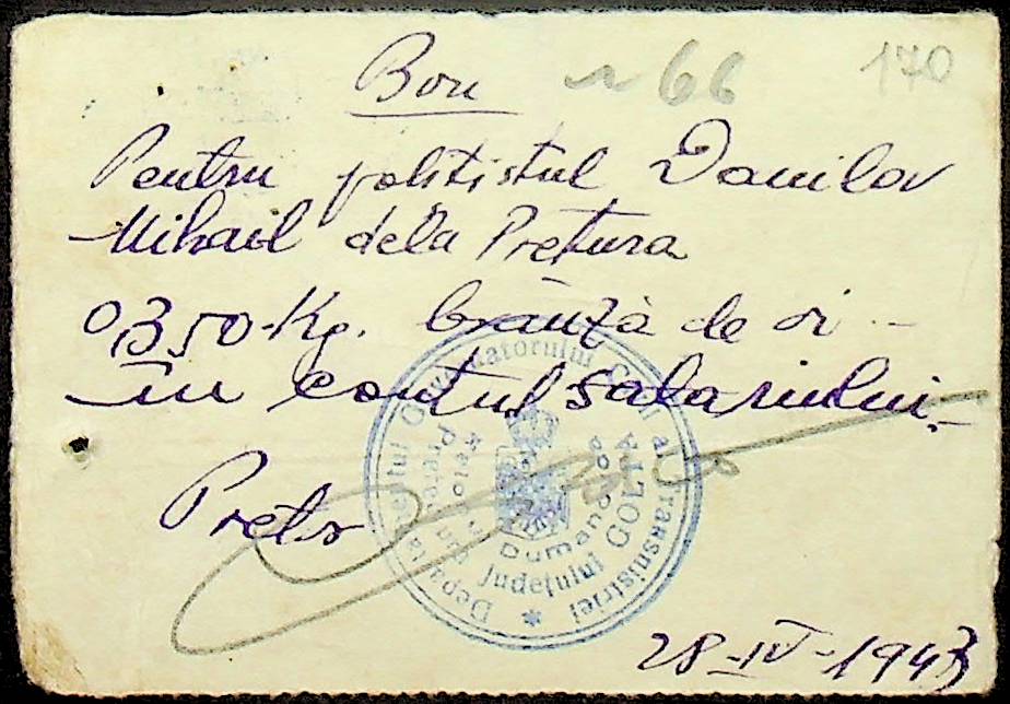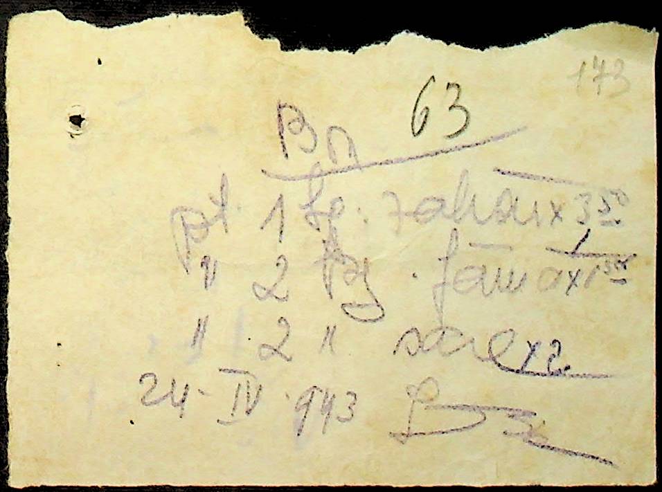 • • • • Справа № 11 “Первинні документи (квитанції, фактури, прибуткові та витратні ордери, вхідні ваучери, рахунки, товарно-грошові звіти) за 1943 рік. Відомості на видачу солі общинам, фермам, претурі, пекарні, бійні; про видачу товарів із магазинів в кредит, видачу м’яса сім’ям трактористів, які виїхали в Румунію. Акти про забій худоби, звіти про випікання хлібу”