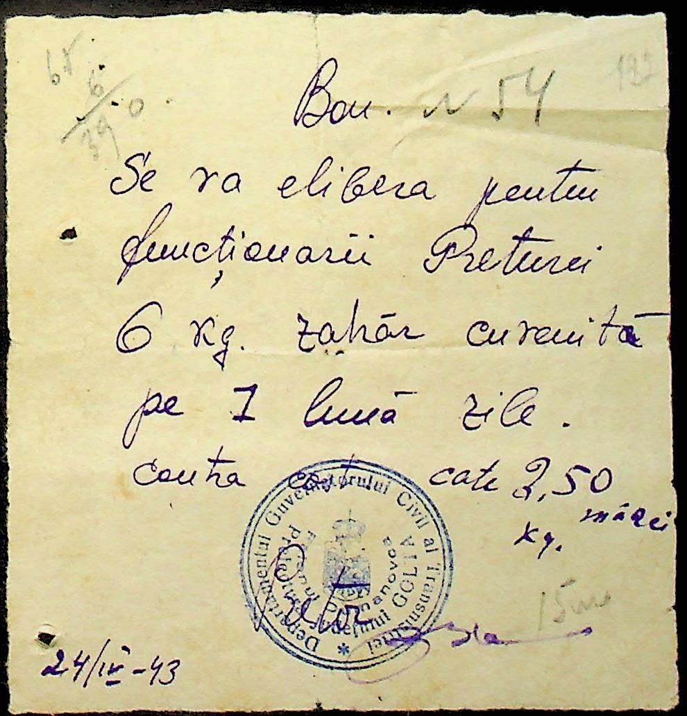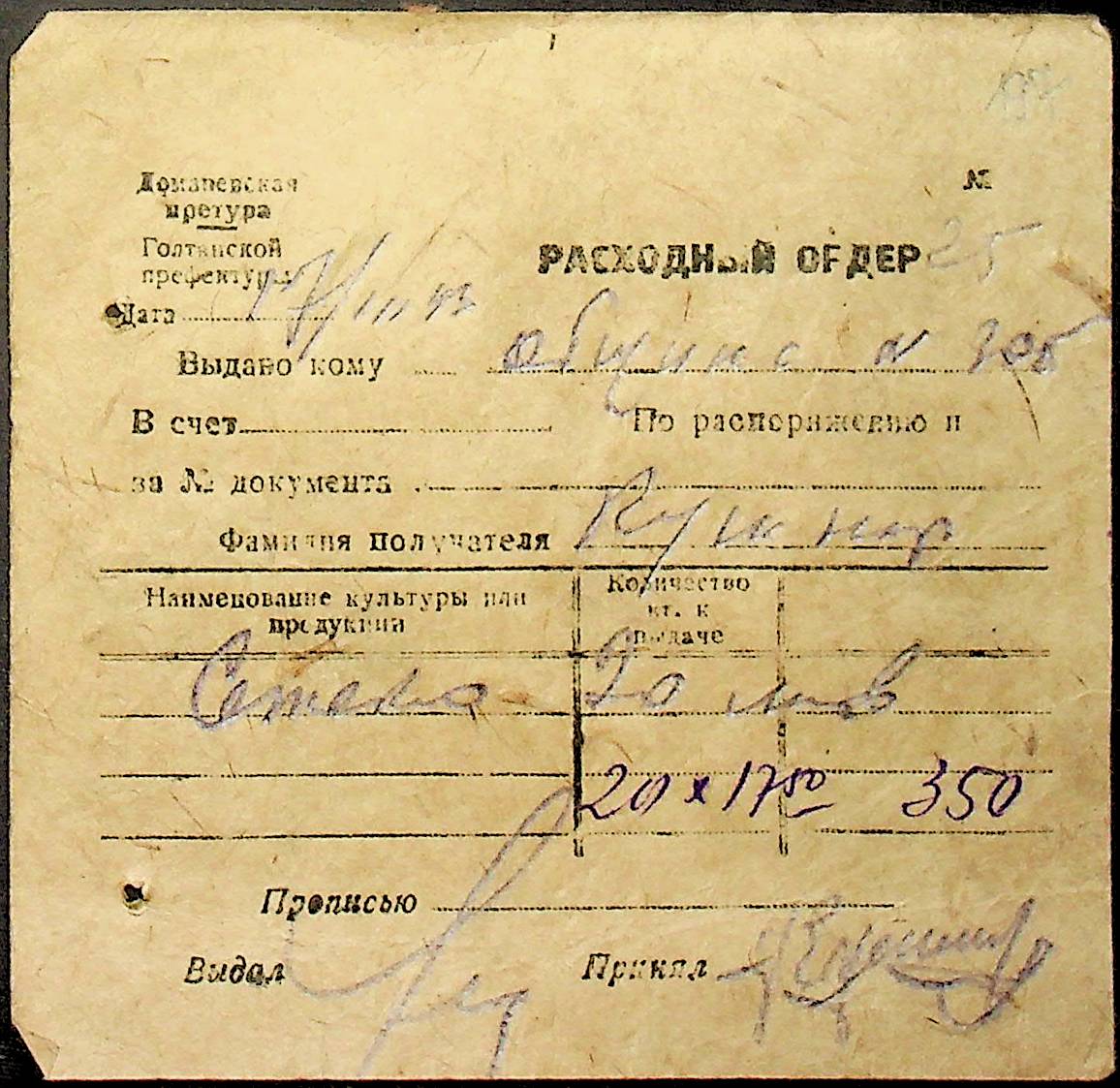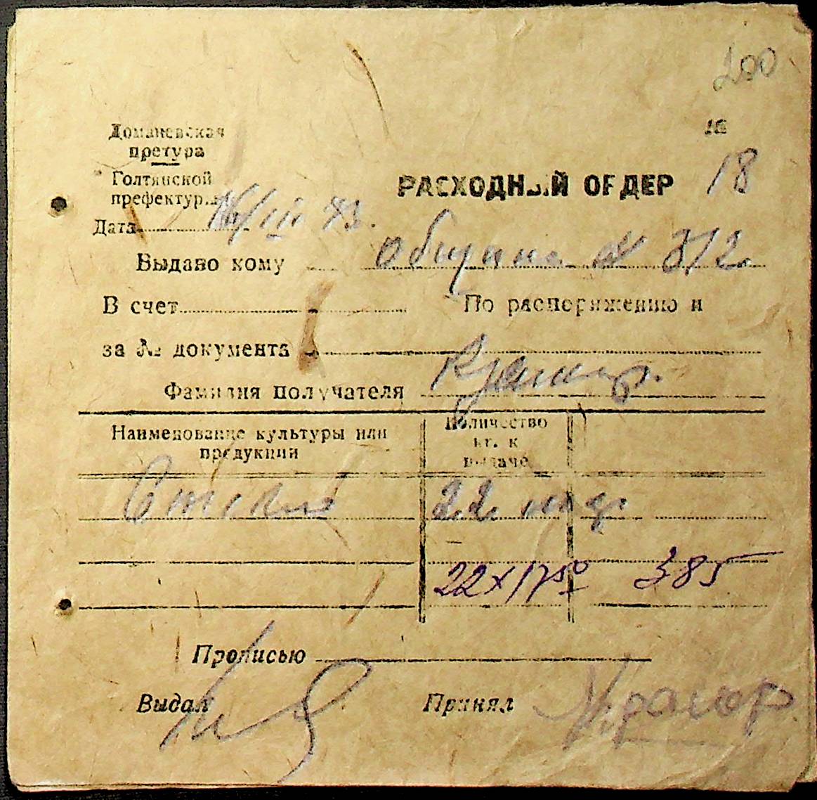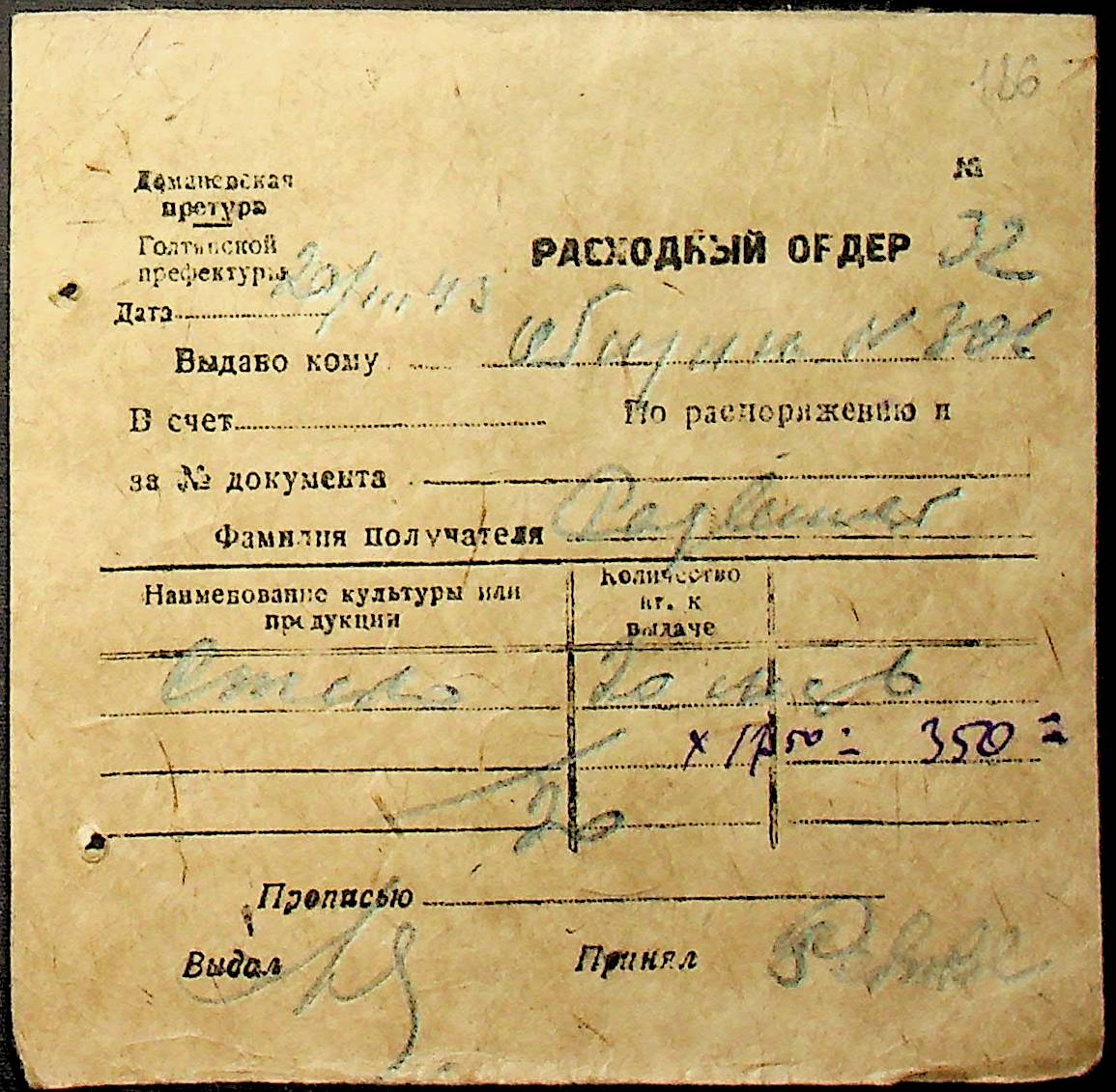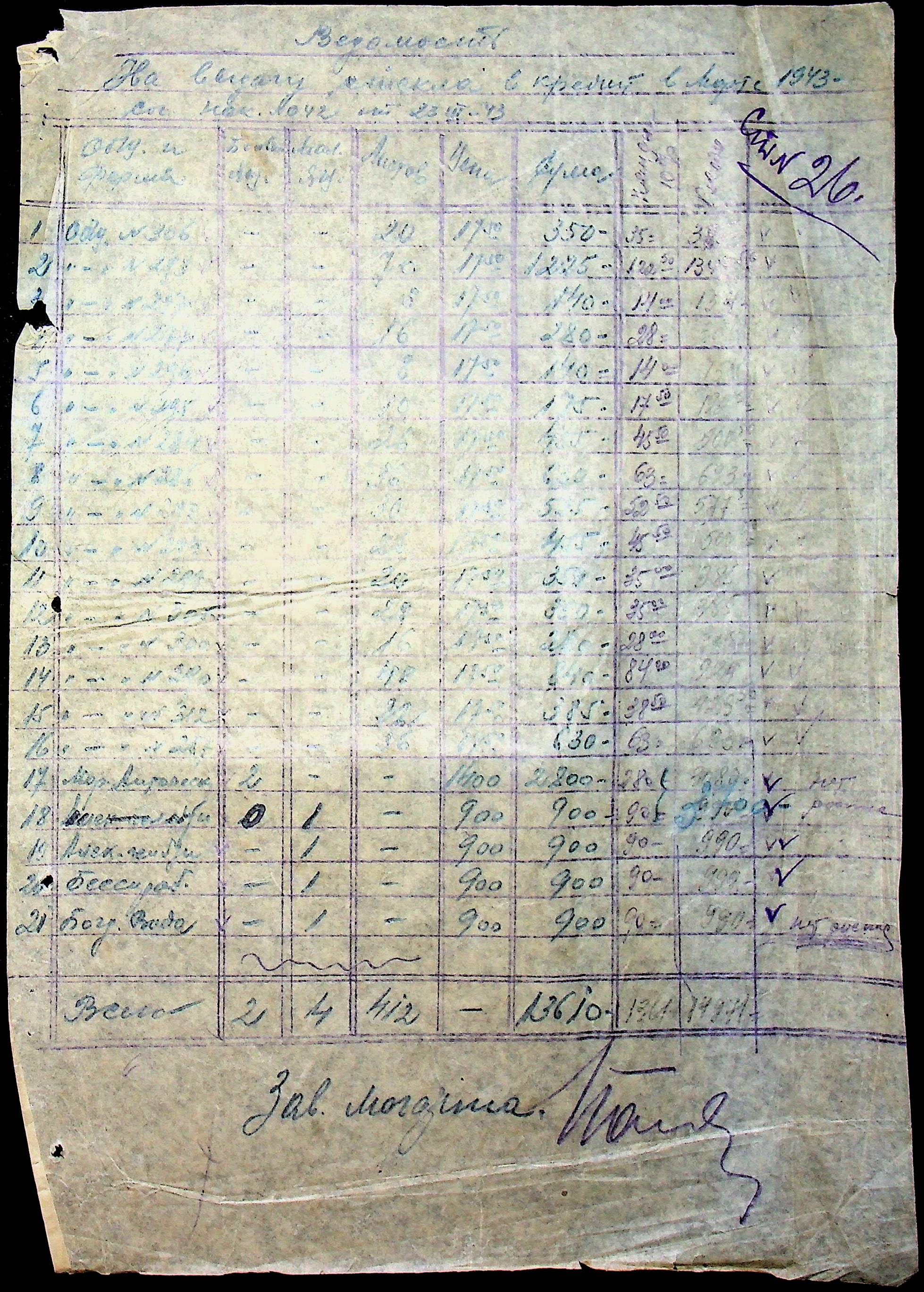 • • • • Справа № 11 “Первинні документи (квитанції, фактури, прибуткові та витратні ордери, вхідні ваучери, рахунки, товарно-грошові звіти) за 1943 рік. Відомості на видачу солі общинам, фермам, претурі, пекарні, бійні; про видачу товарів із магазинів в кредит, видачу м’яса сім’ям трактористів, які виїхали в Румунію. Акти про забій худоби, звіти про випікання хлібу”