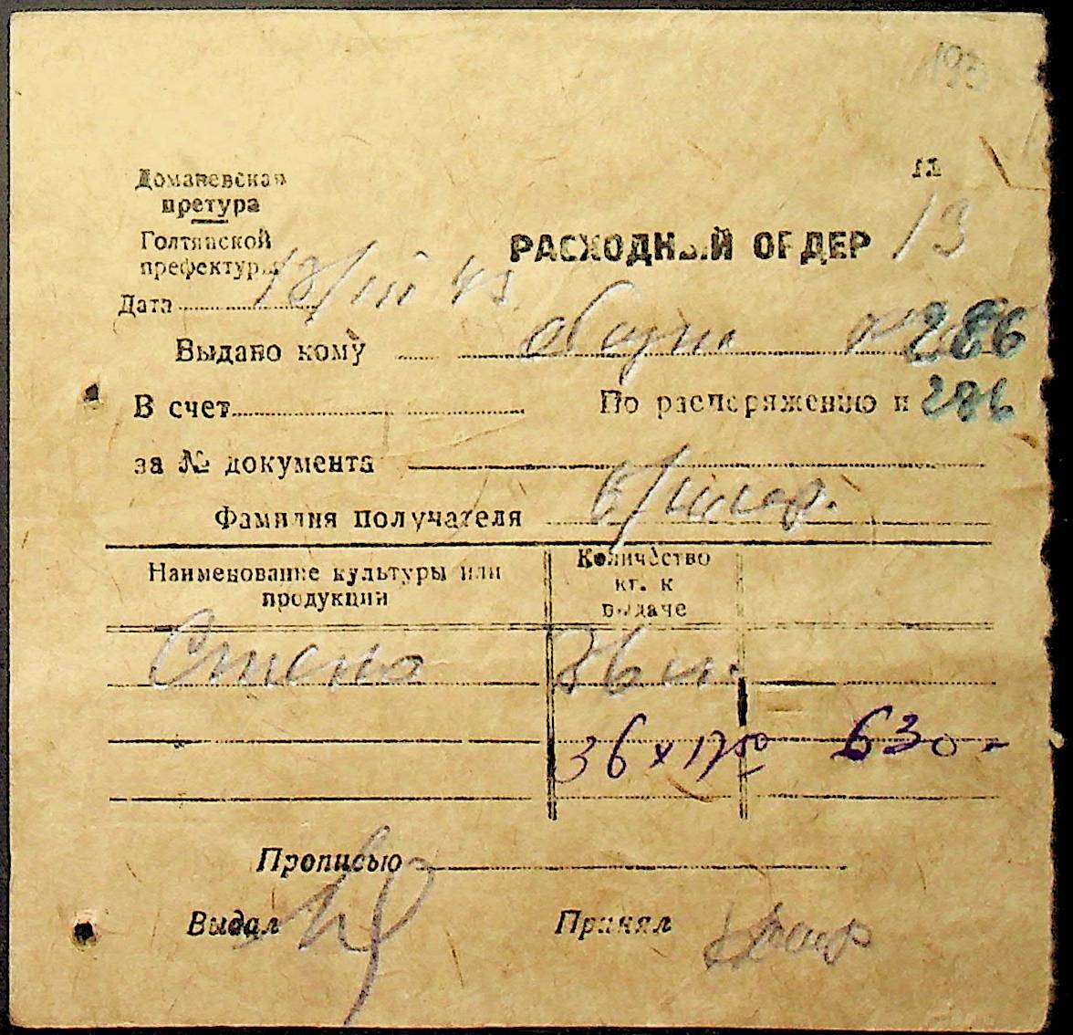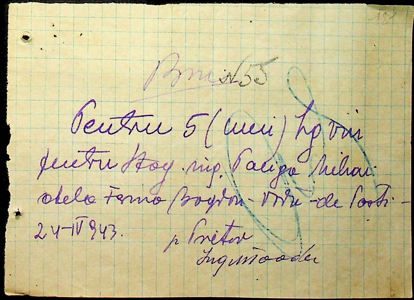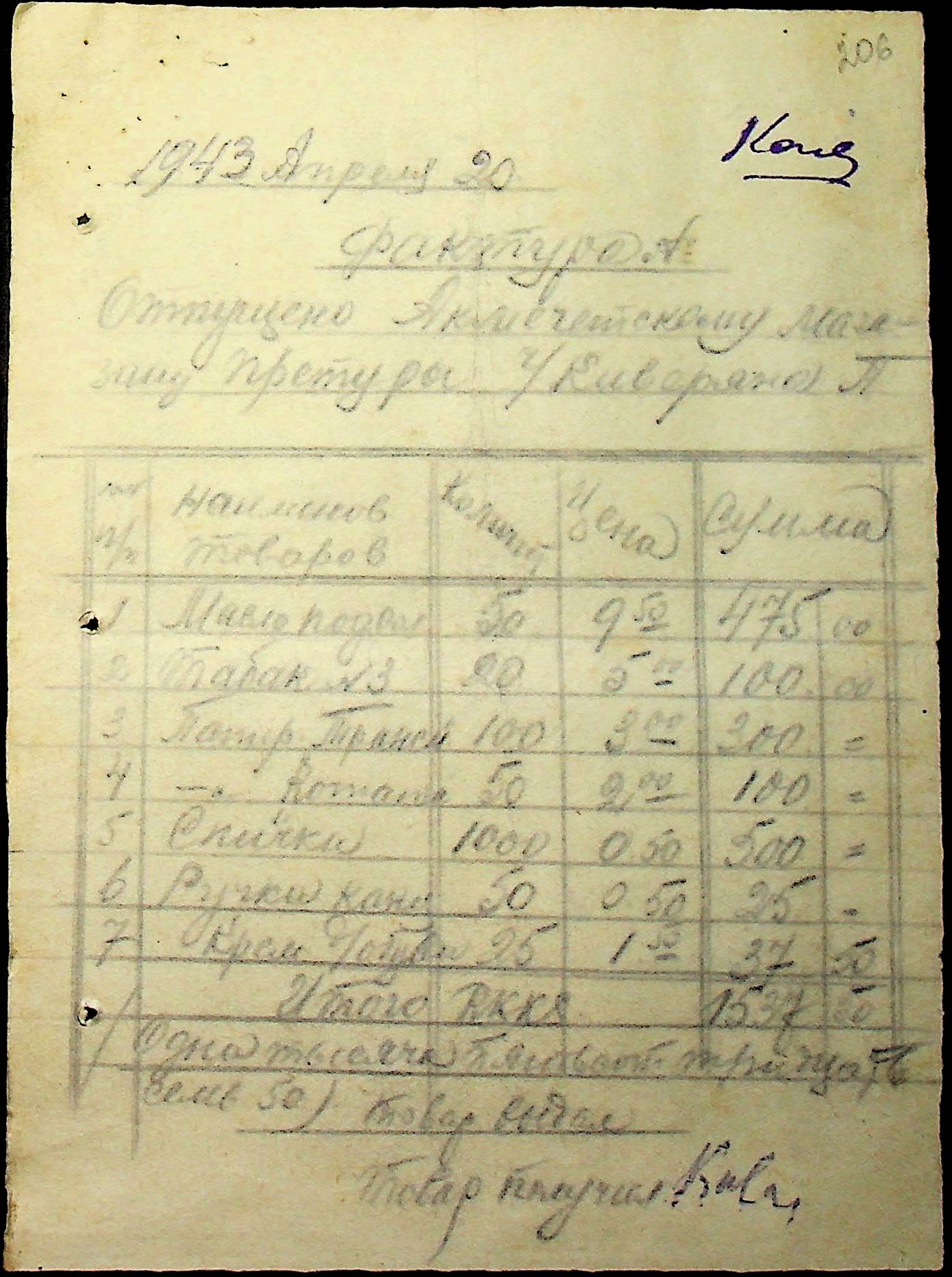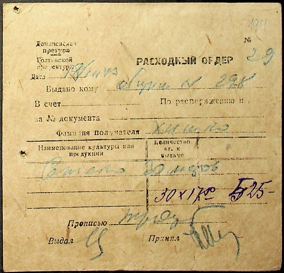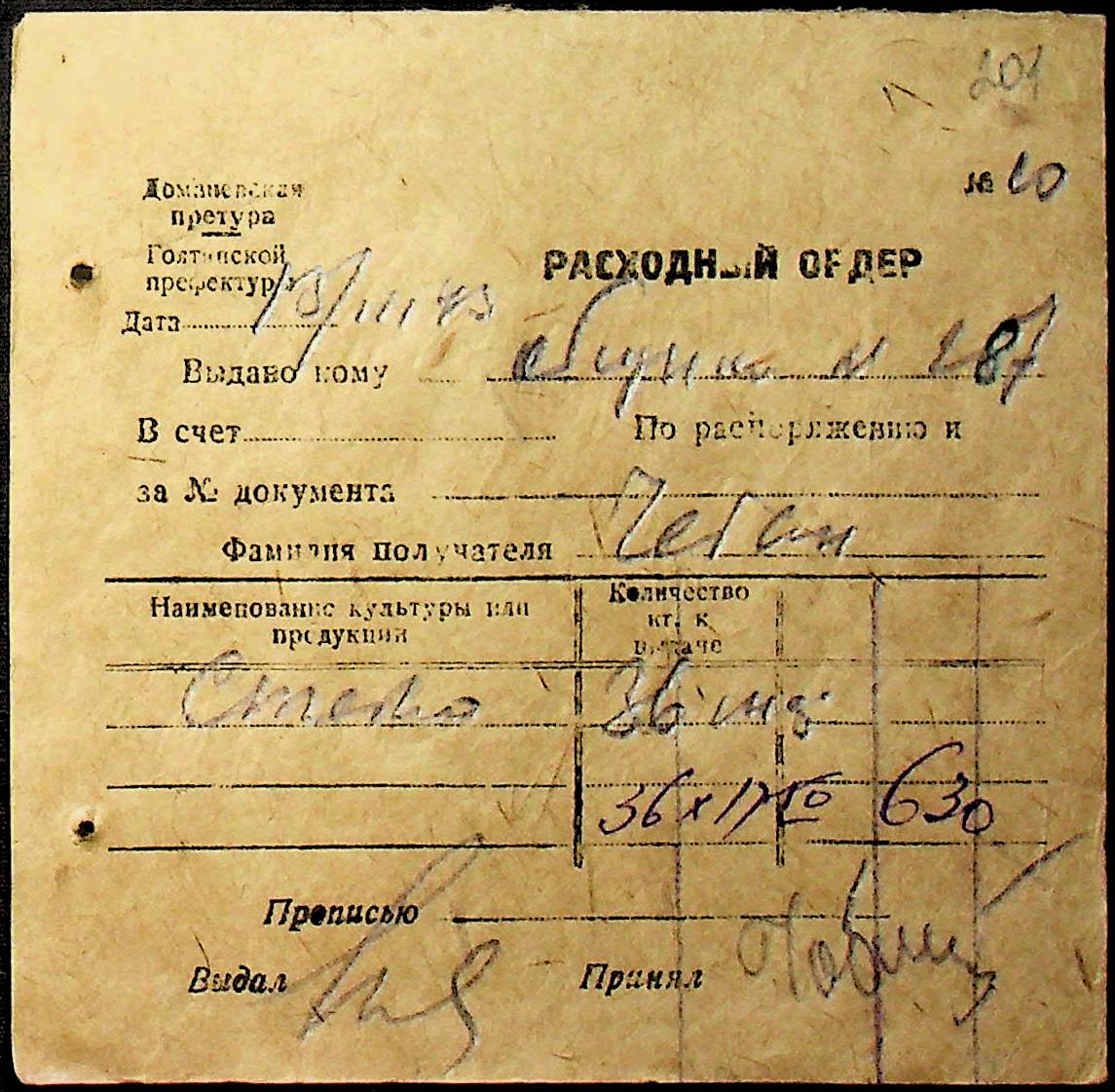 • • • • Справа № 11 “Первинні документи (квитанції, фактури, прибуткові та витратні ордери, вхідні ваучери, рахунки, товарно-грошові звіти) за 1943 рік. Відомості на видачу солі общинам, фермам, претурі, пекарні, бійні; про видачу товарів із магазинів в кредит, видачу м’яса сім’ям трактористів, які виїхали в Румунію. Акти про забій худоби, звіти про випікання хлібу”