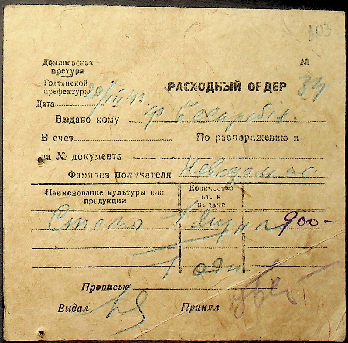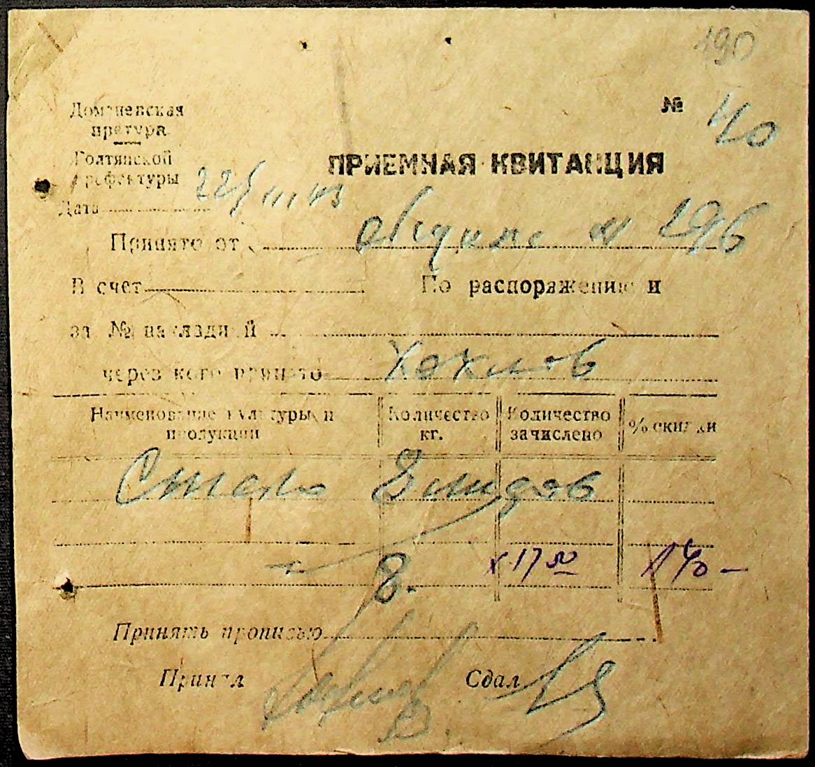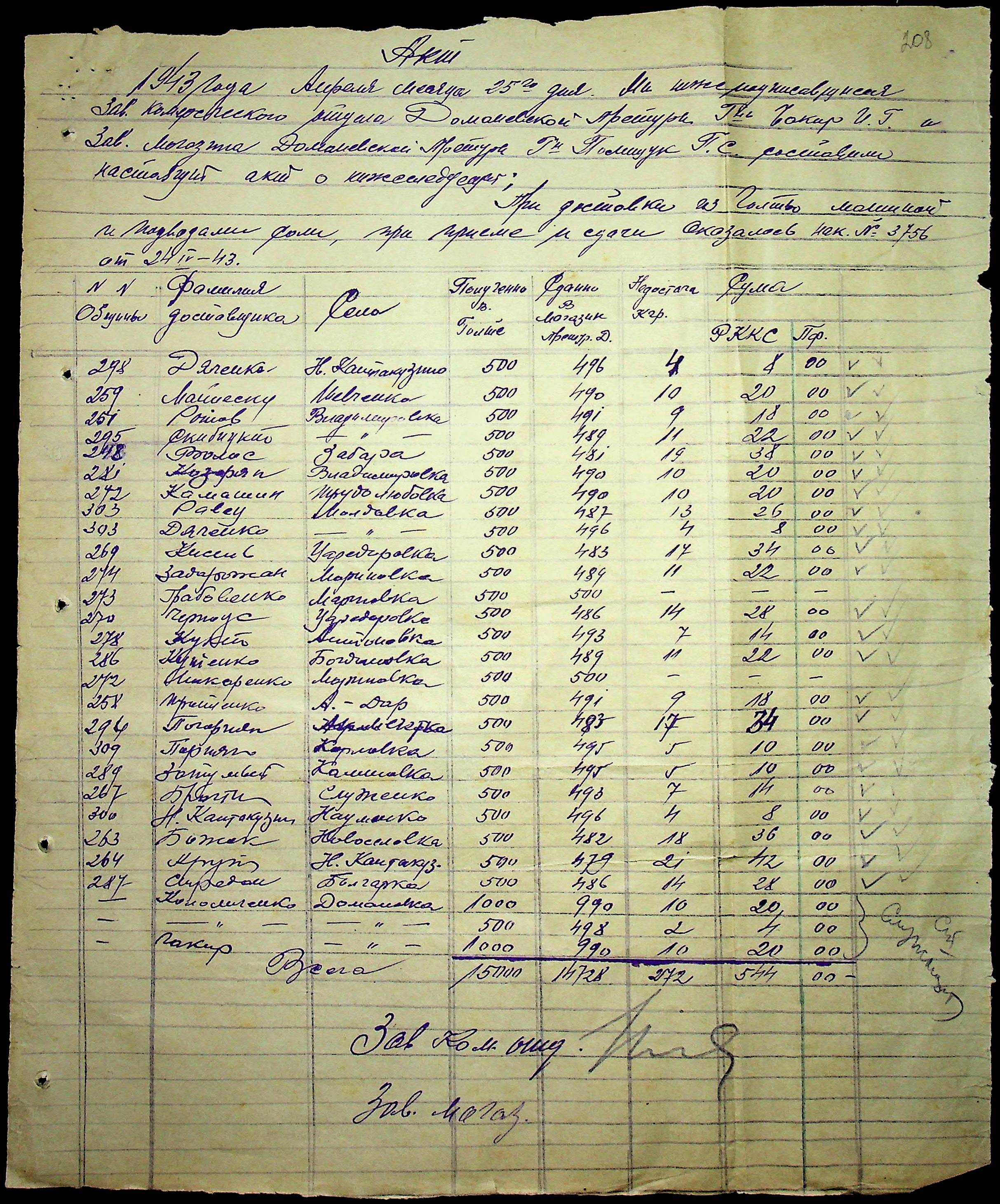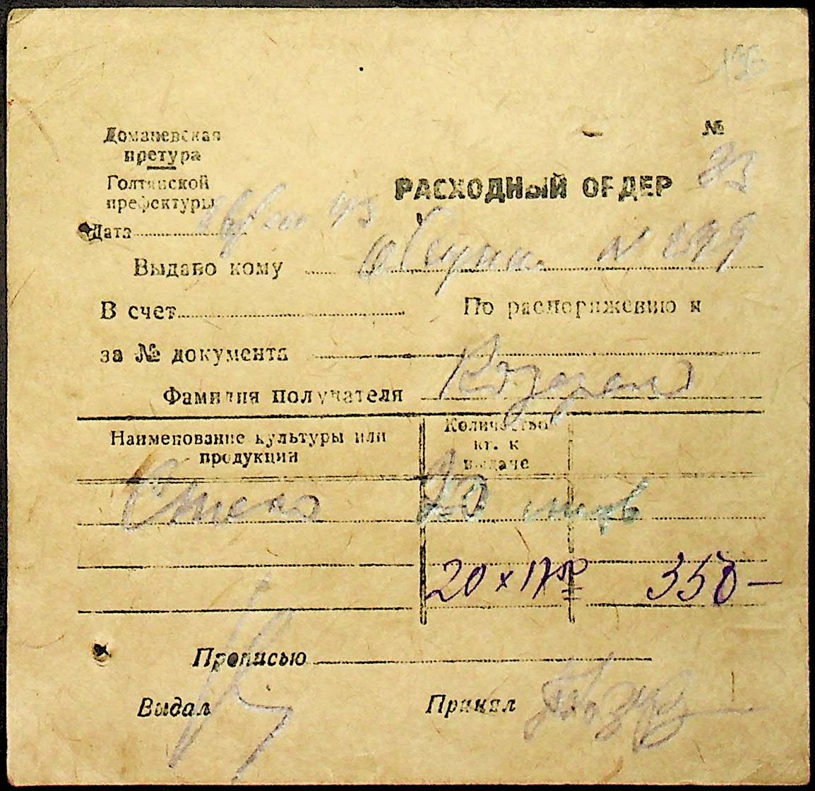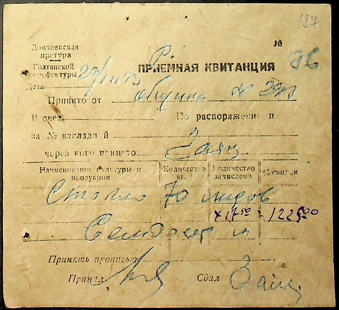 • • • • Справа № 11 “Первинні документи (квитанції, фактури, прибуткові та витратні ордери, вхідні ваучери, рахунки, товарно-грошові звіти) за 1943 рік. Відомості на видачу солі общинам, фермам, претурі, пекарні, бійні; про видачу товарів із магазинів в кредит, видачу м’яса сім’ям трактористів, які виїхали в Румунію. Акти про забій худоби, звіти про випікання хлібу”