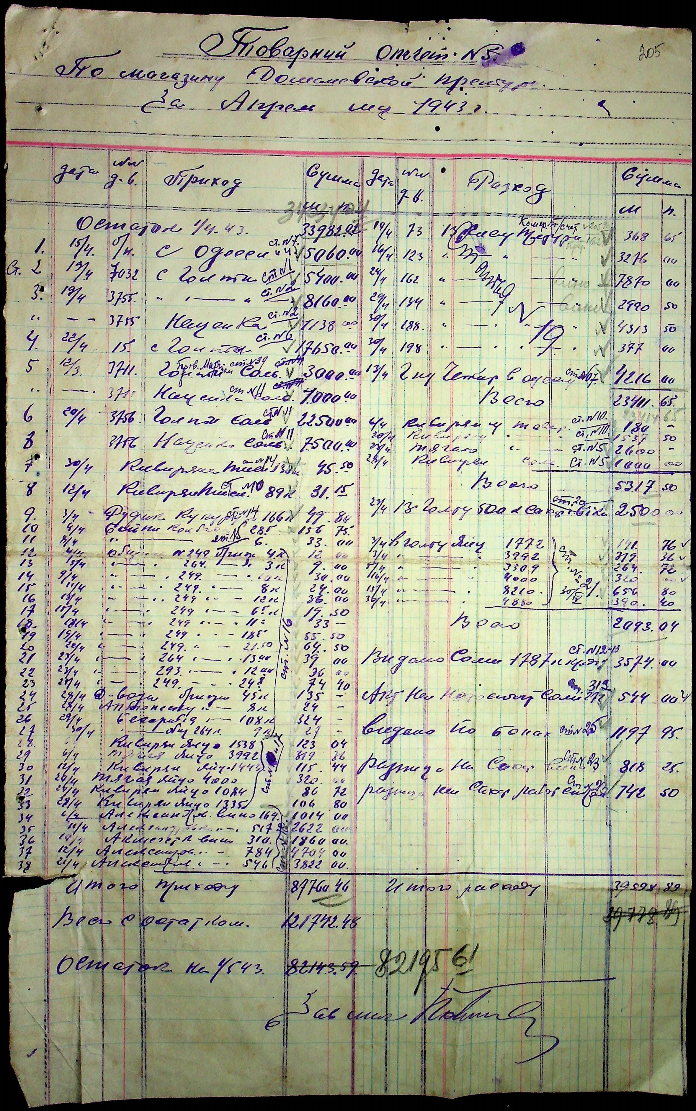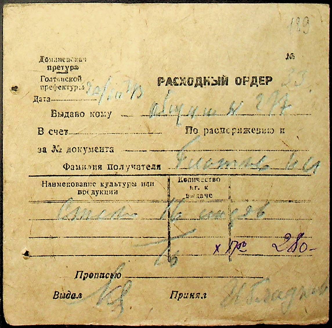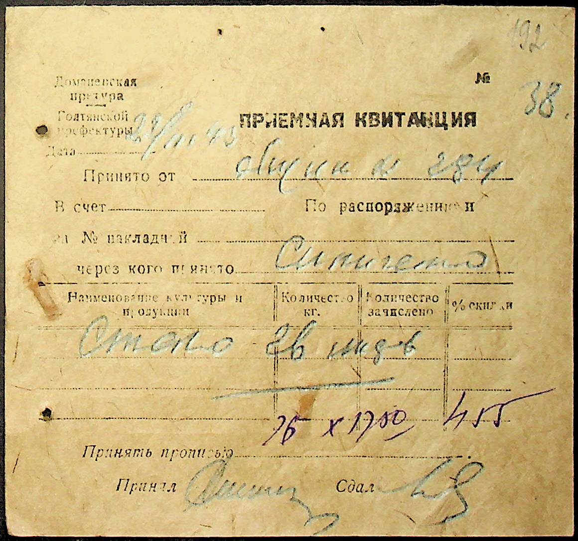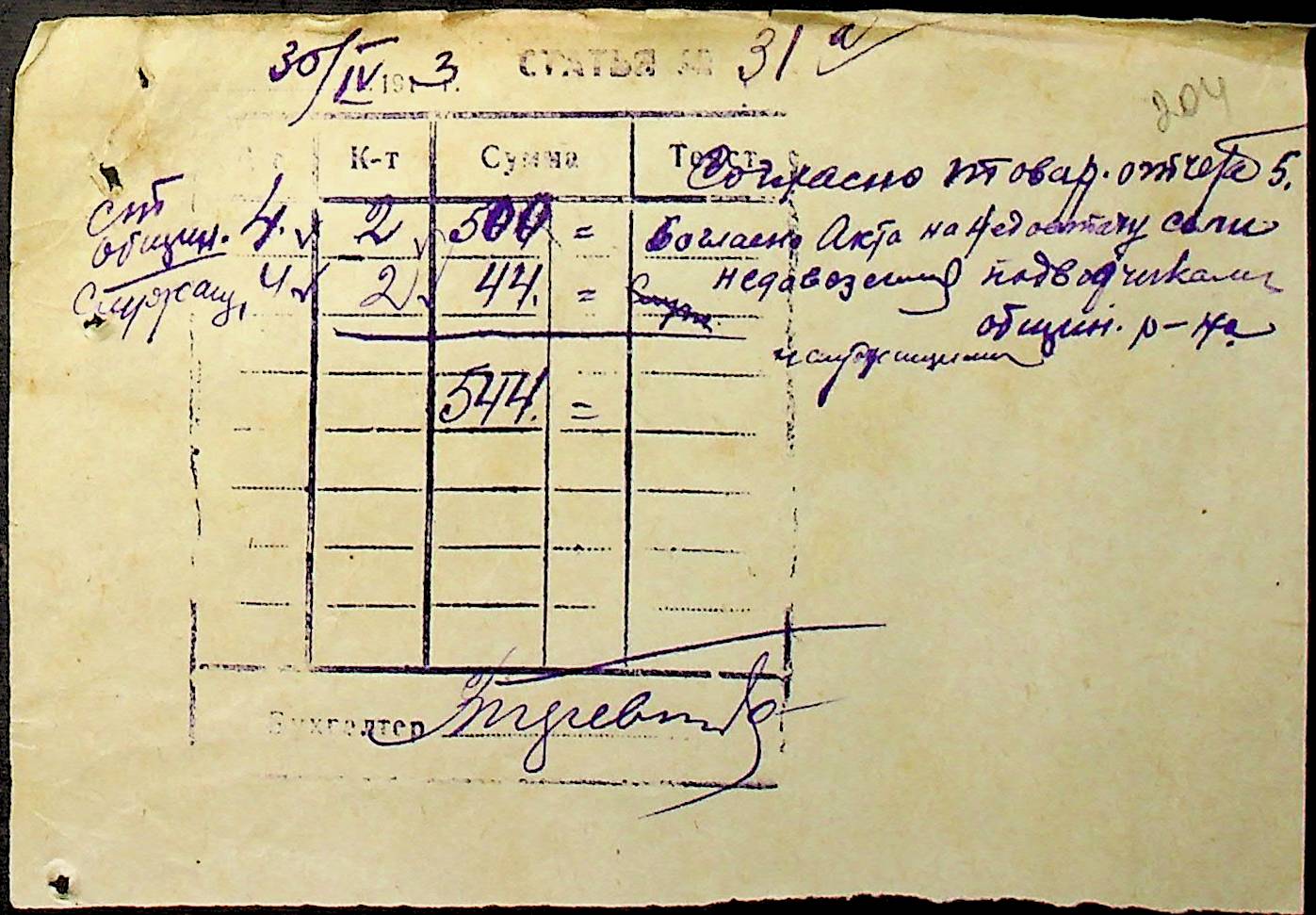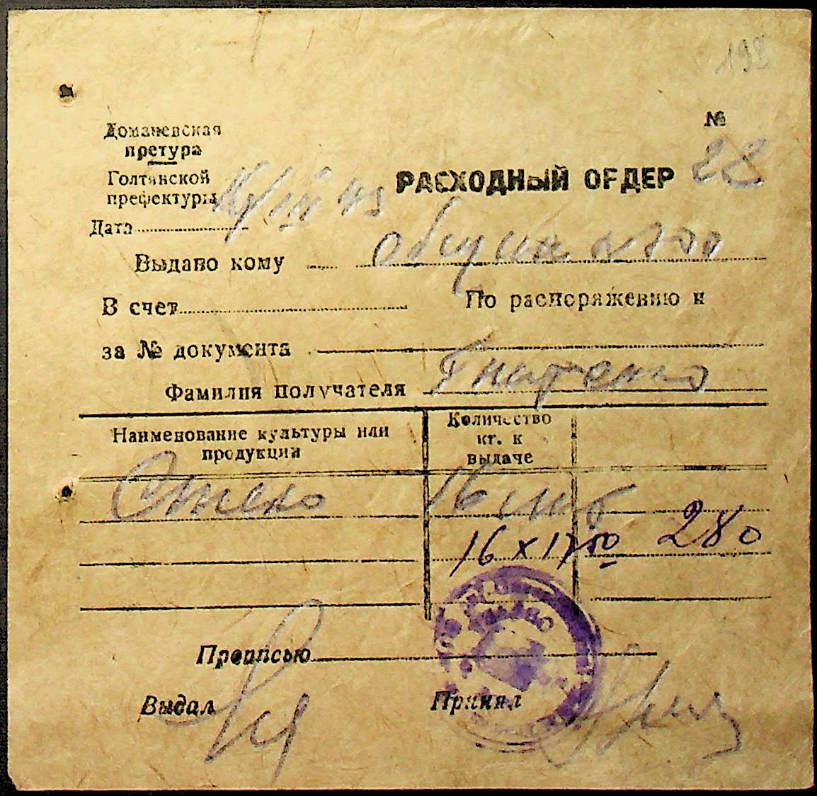 • • • • Справа № 11 “Первинні документи (квитанції, фактури, прибуткові та витратні ордери, вхідні ваучери, рахунки, товарно-грошові звіти) за 1943 рік. Відомості на видачу солі общинам, фермам, претурі, пекарні, бійні; про видачу товарів із магазинів в кредит, видачу м’яса сім’ям трактористів, які виїхали в Румунію. Акти про забій худоби, звіти про випікання хлібу”