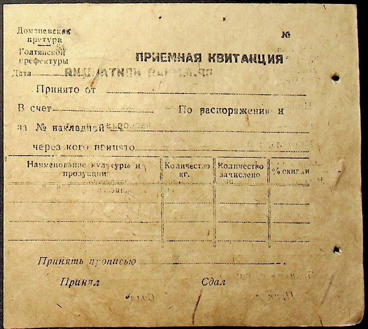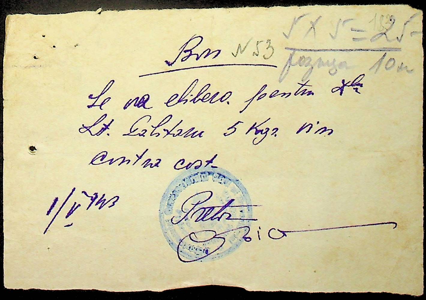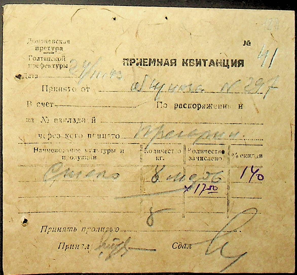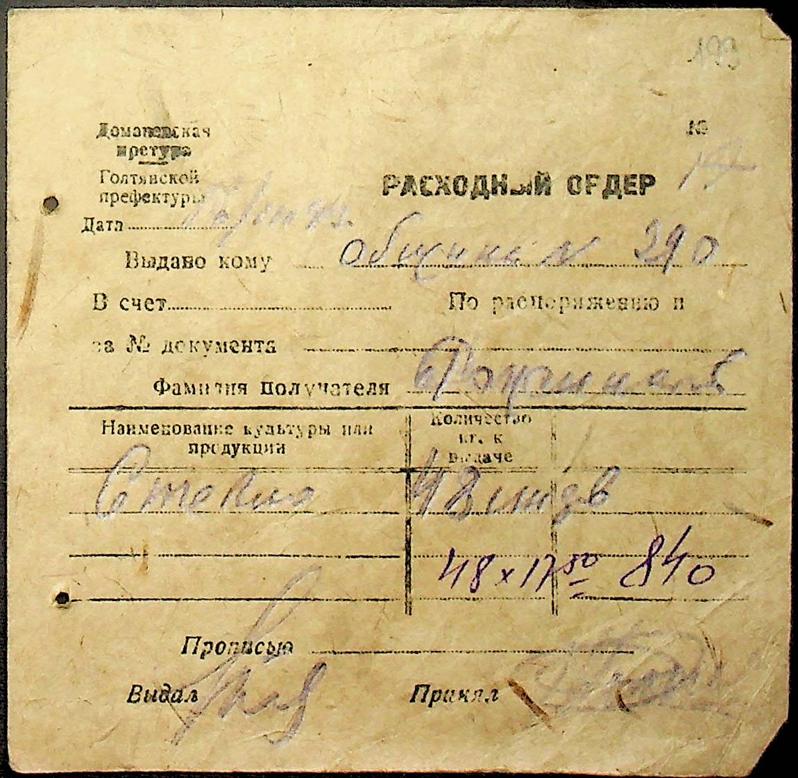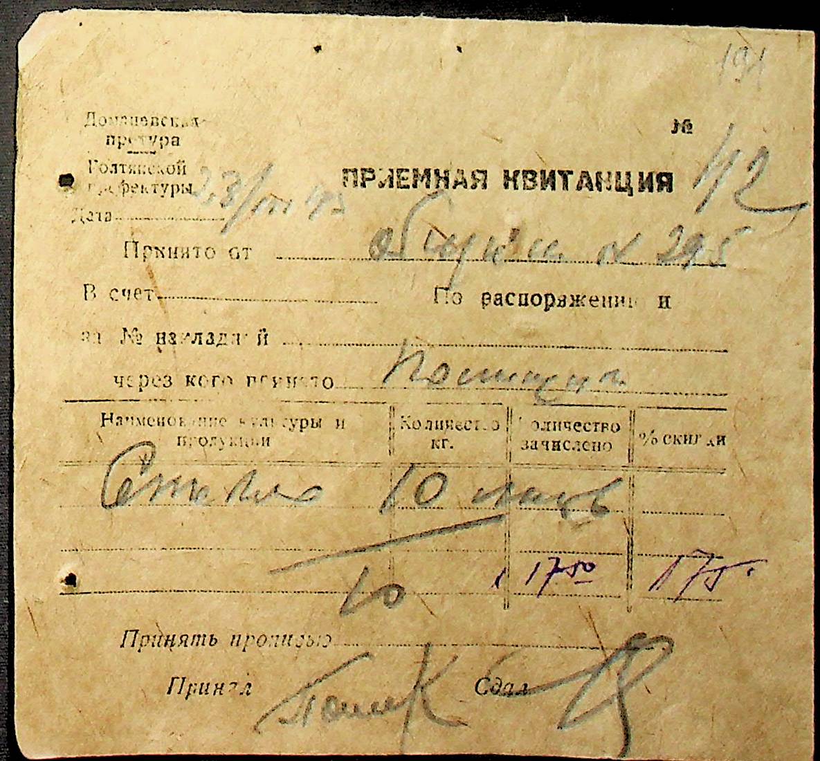 • • • • Справа № 11 “Первинні документи (квитанції, фактури, прибуткові та витратні ордери, вхідні ваучери, рахунки, товарно-грошові звіти) за 1943 рік. Відомості на видачу солі общинам, фермам, претурі, пекарні, бійні; про видачу товарів із магазинів в кредит, видачу м’яса сім’ям трактористів, які виїхали в Румунію. Акти про забій худоби, звіти про випікання хлібу”