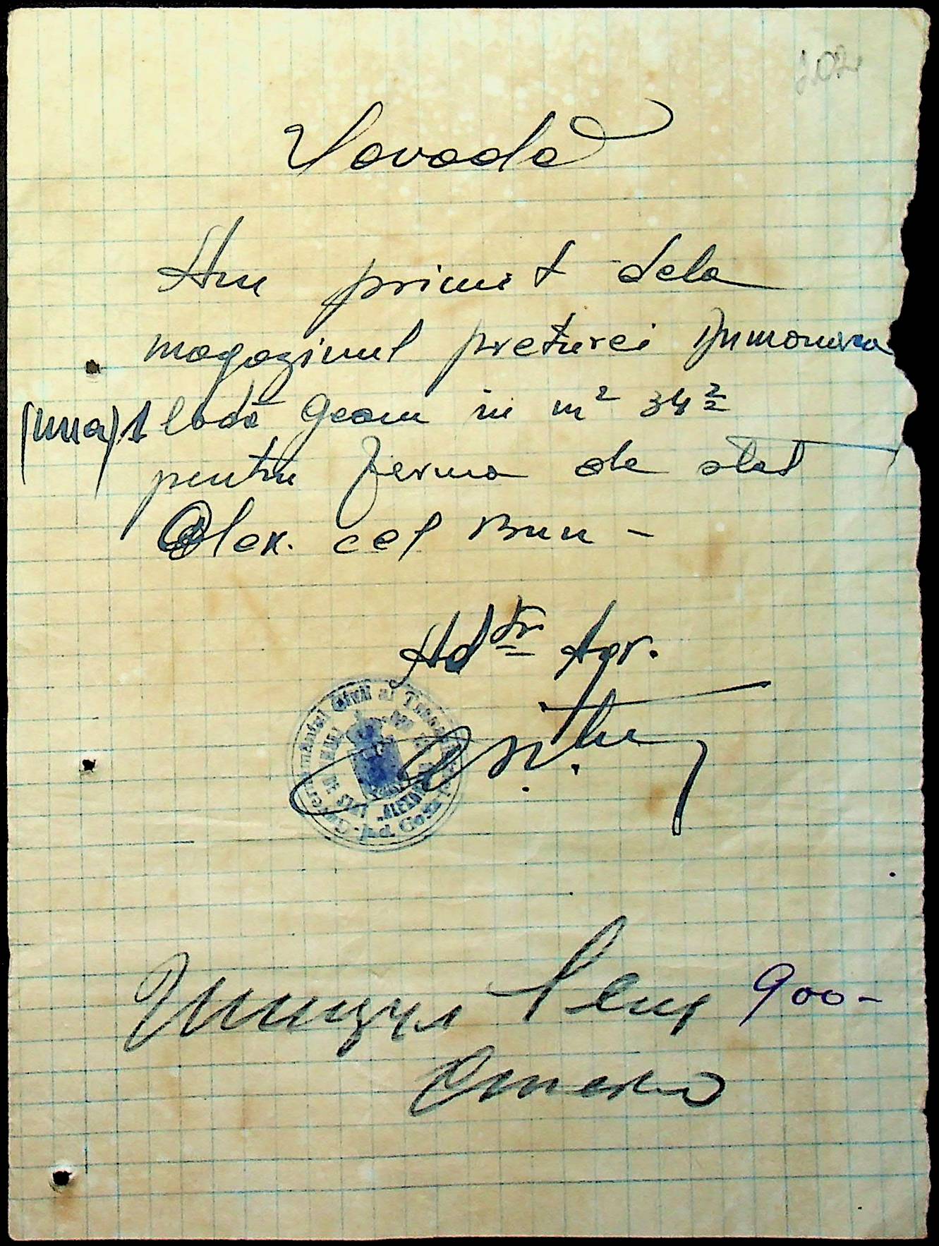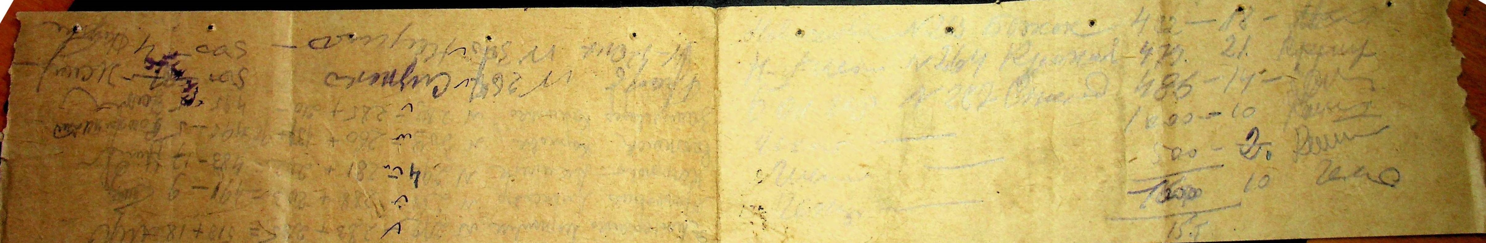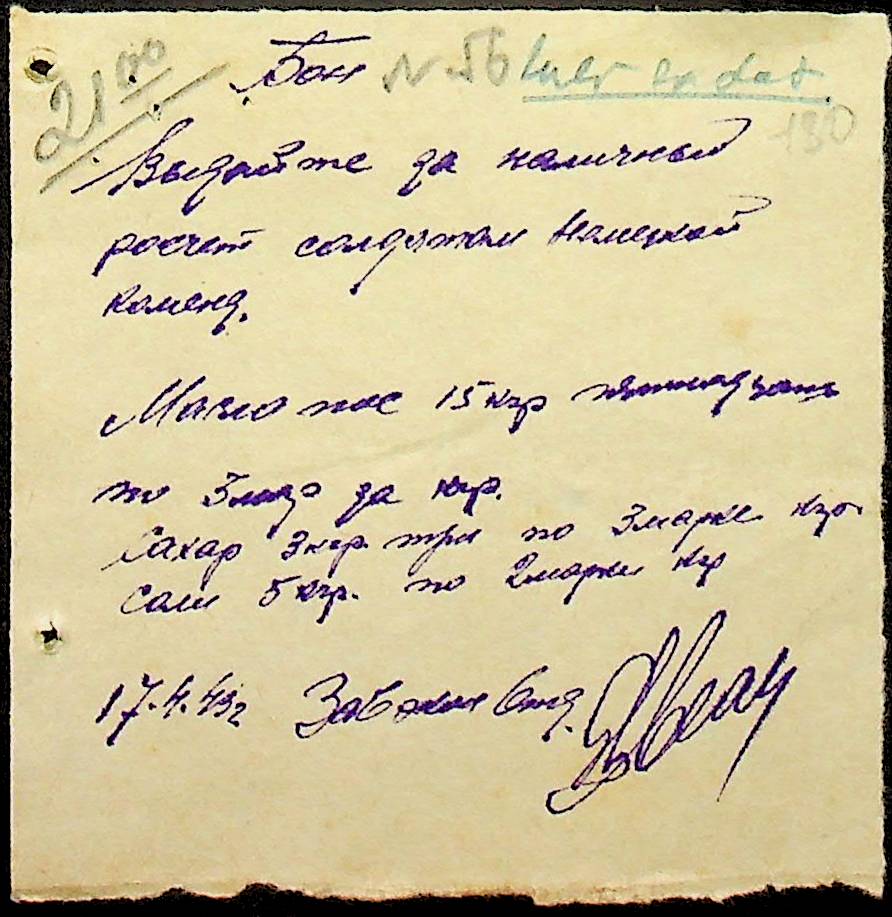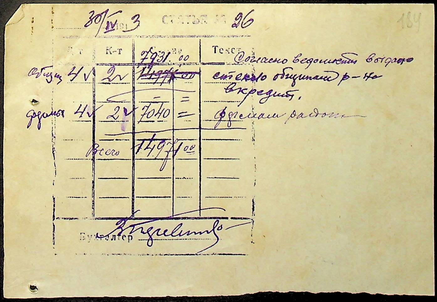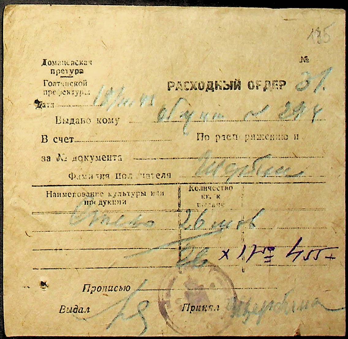 • • • • Справа № 11 “Первинні документи (квитанції, фактури, прибуткові та витратні ордери, вхідні ваучери, рахунки, товарно-грошові звіти) за 1943 рік. Відомості на видачу солі общинам, фермам, претурі, пекарні, бійні; про видачу товарів із магазинів в кредит, видачу м’яса сім’ям трактористів, які виїхали в Румунію. Акти про забій худоби, звіти про випікання хлібу”
