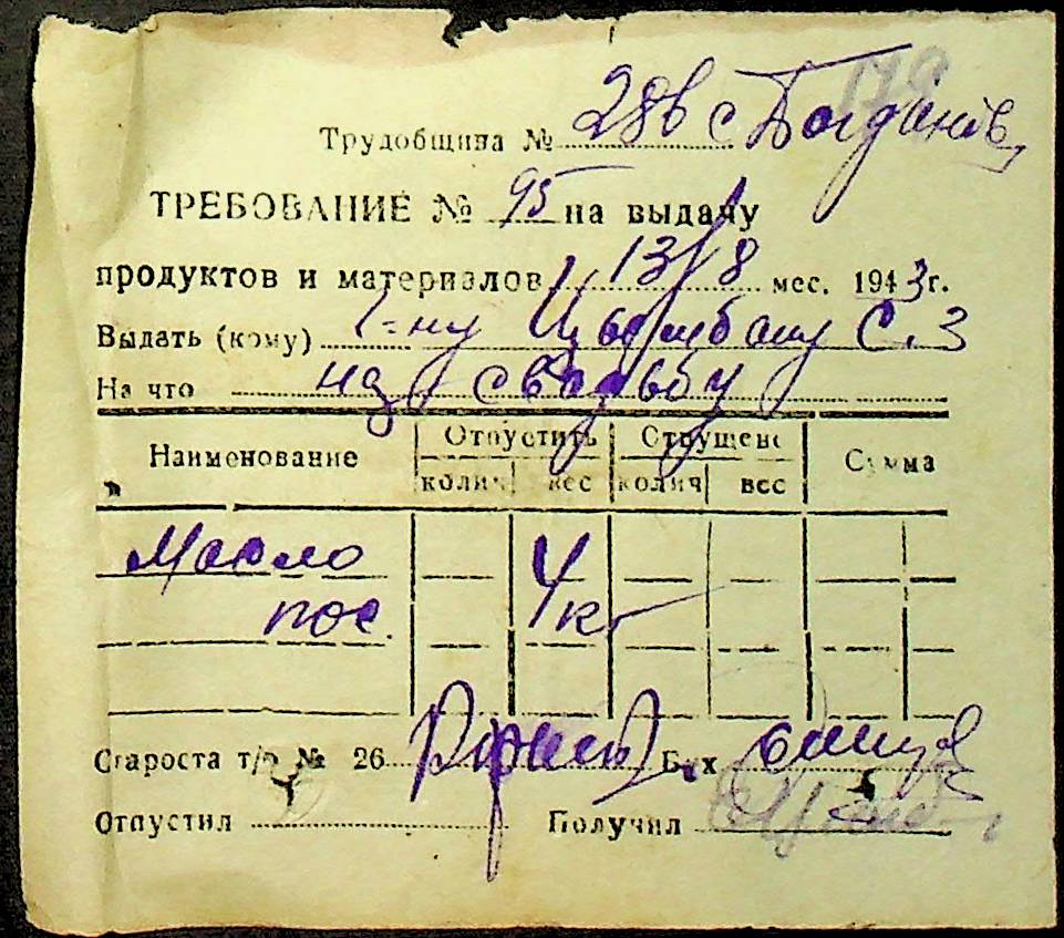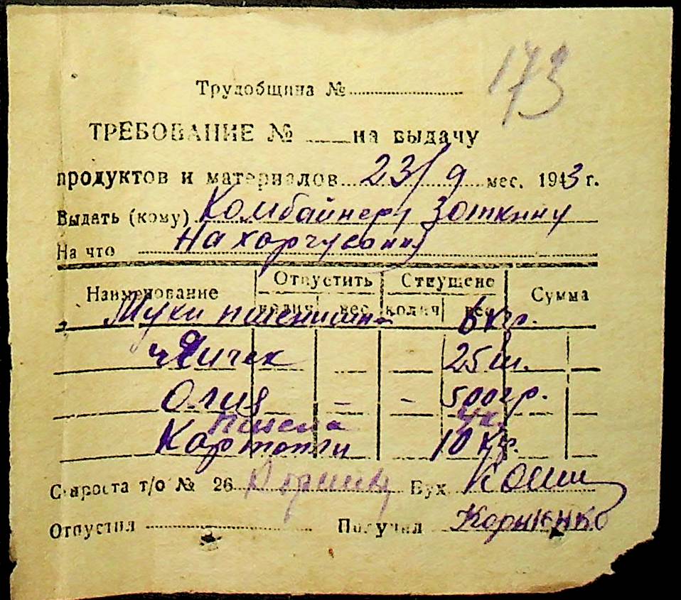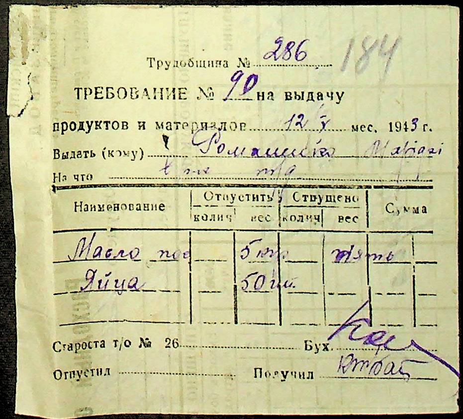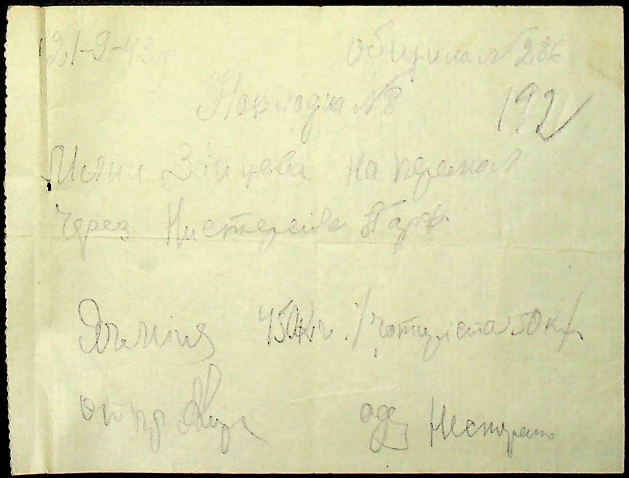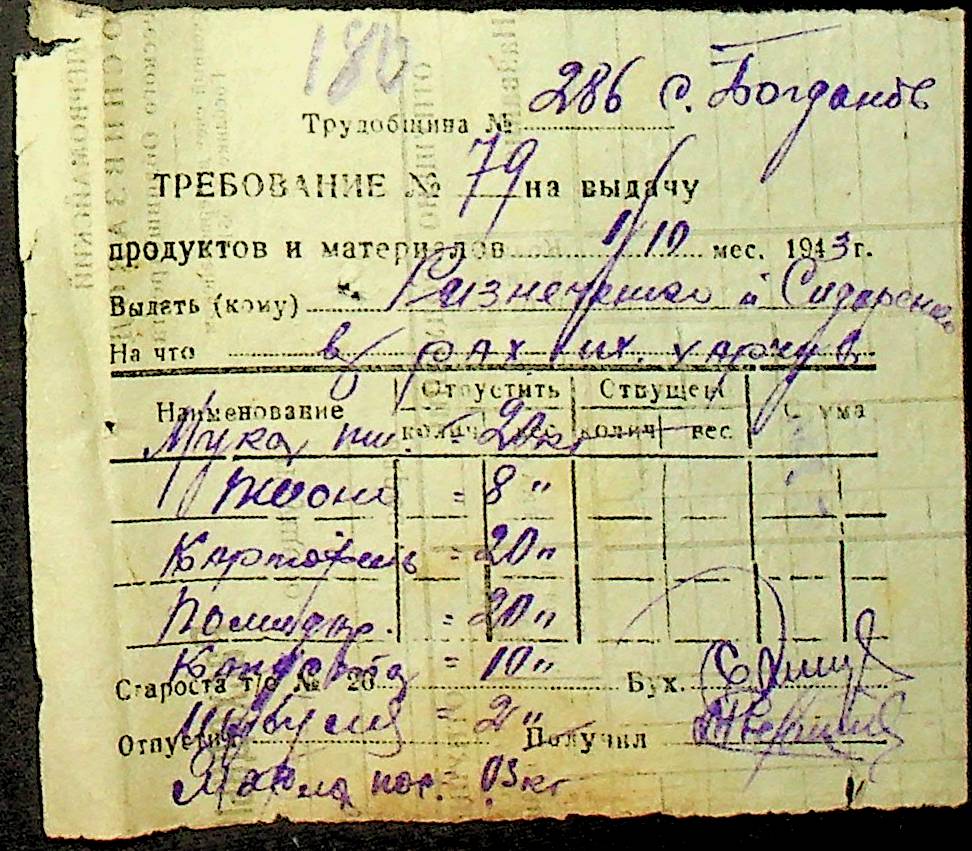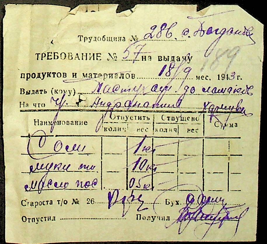 • • • • Справа № 26 “Документи (касові документи, квитанції, товарні чеки, акти, щоденники молотьби, накладні, наряди, довіреності) про отримання сортового насіннєвого матеріалу в обмін на ячмінь в трудовій общині № 286 Богданівської сільської управи. Відомості реєстрації накладних на видачу пшениці з комори та відомості на видачу озимої пшениці в рахунок трудоднів членам трудової общини № 286”