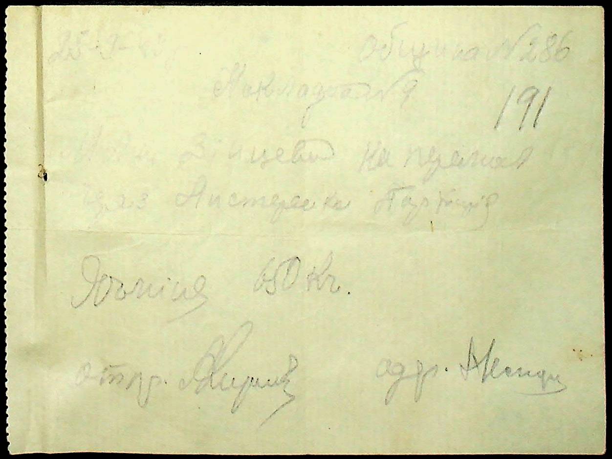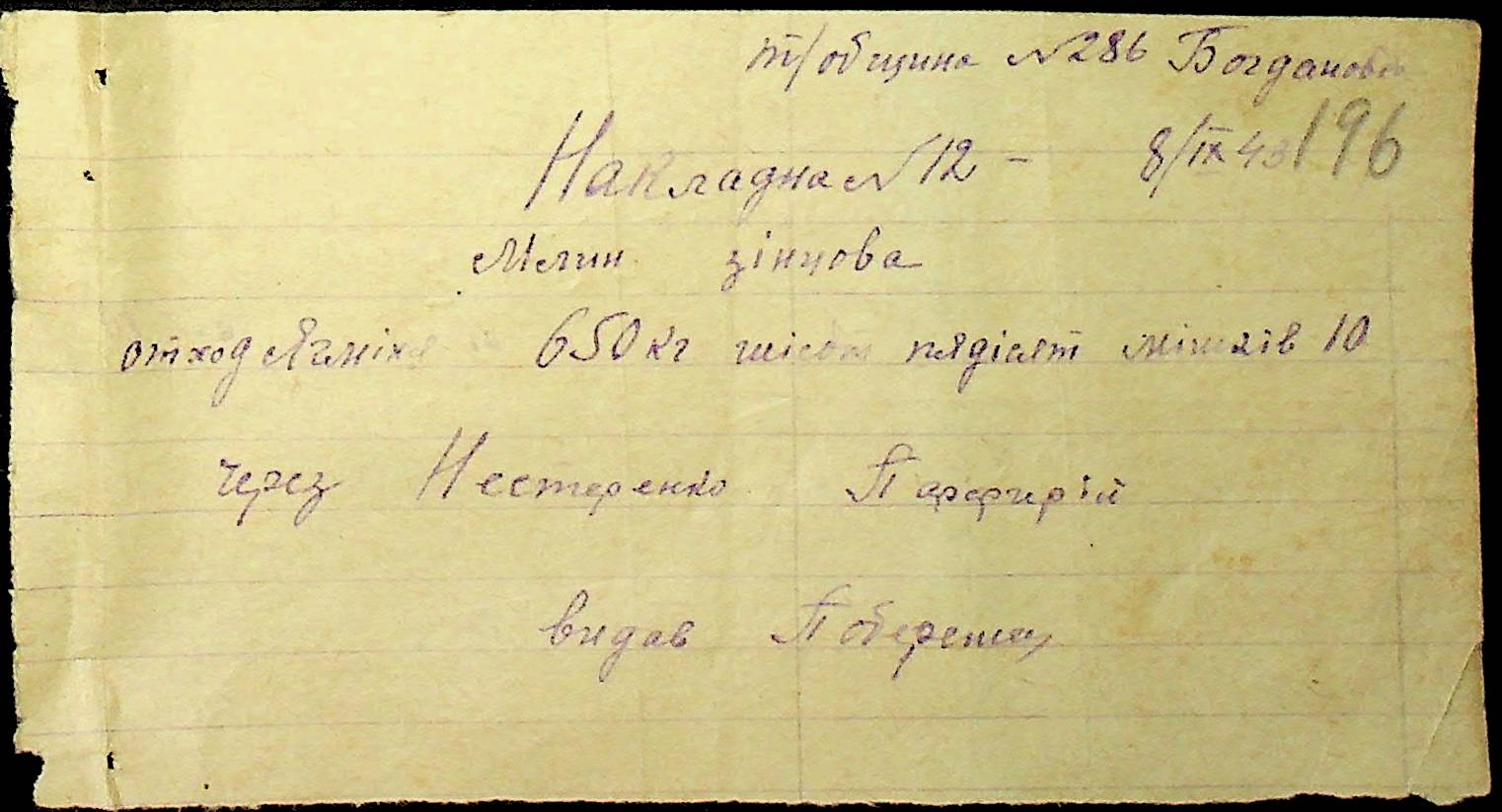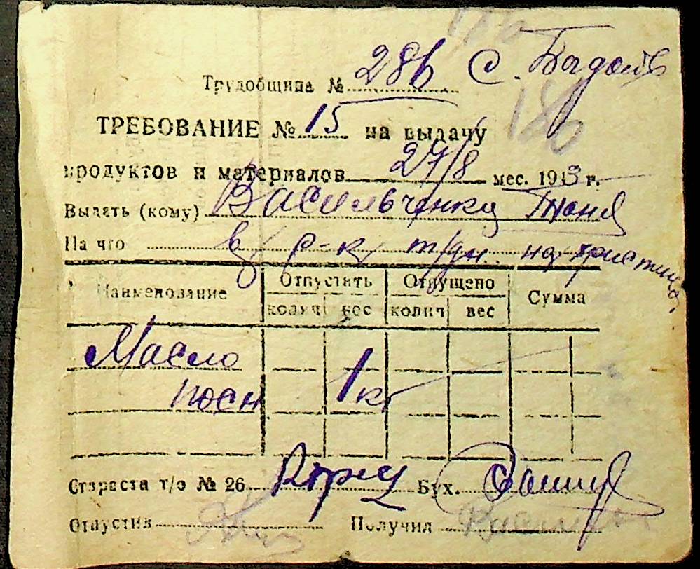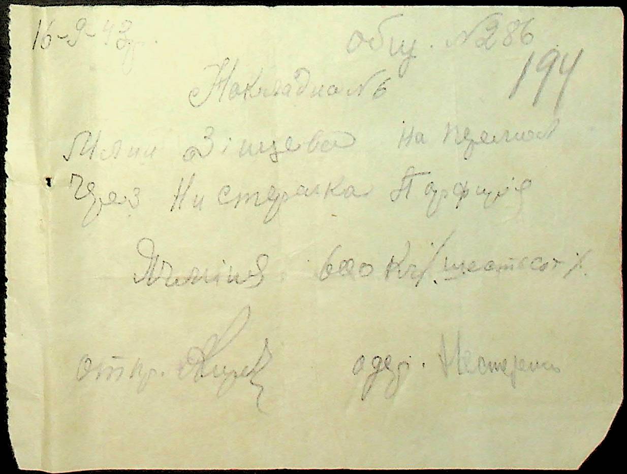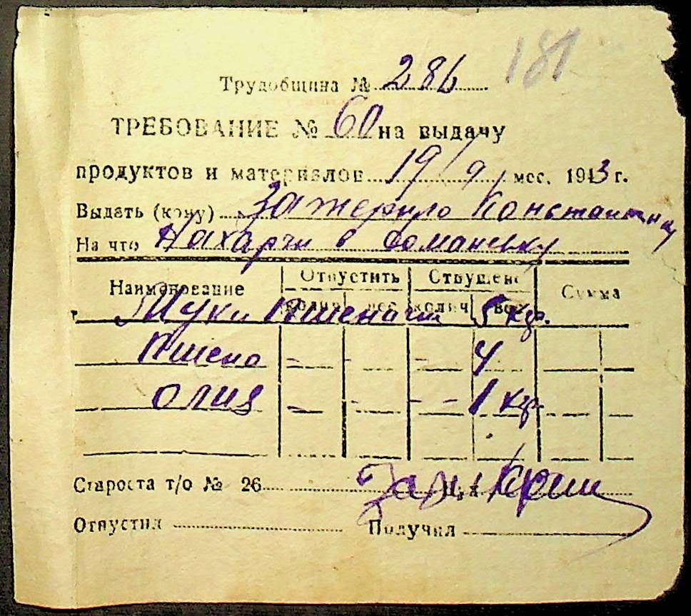 • • • • Справа № 26 “Документи (касові документи, квитанції, товарні чеки, акти, щоденники молотьби, накладні, наряди, довіреності) про отримання сортового насіннєвого матеріалу в обмін на ячмінь в трудовій общині № 286 Богданівської сільської управи. Відомості реєстрації накладних на видачу пшениці з комори та відомості на видачу озимої пшениці в рахунок трудоднів членам трудової общини № 286”
