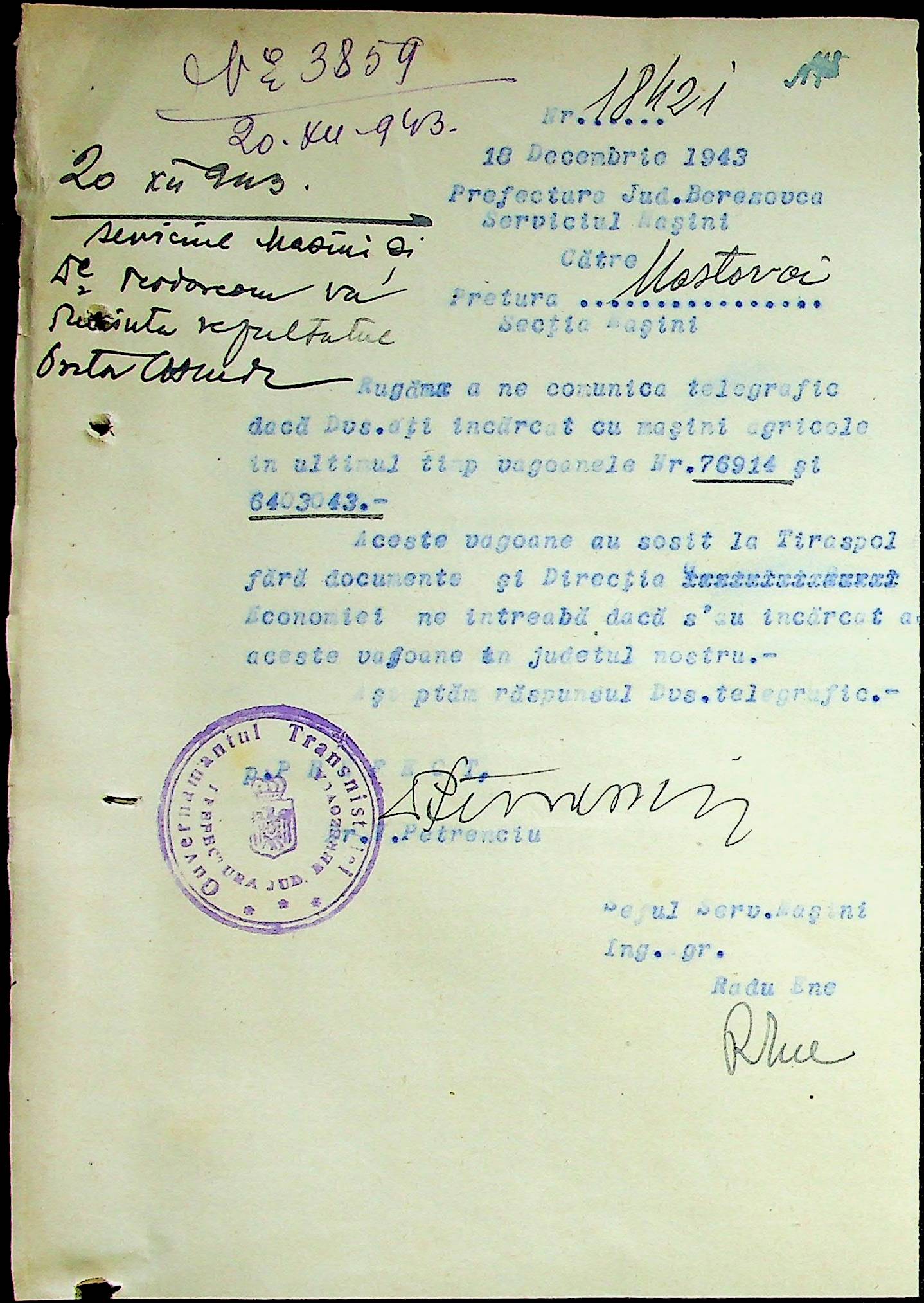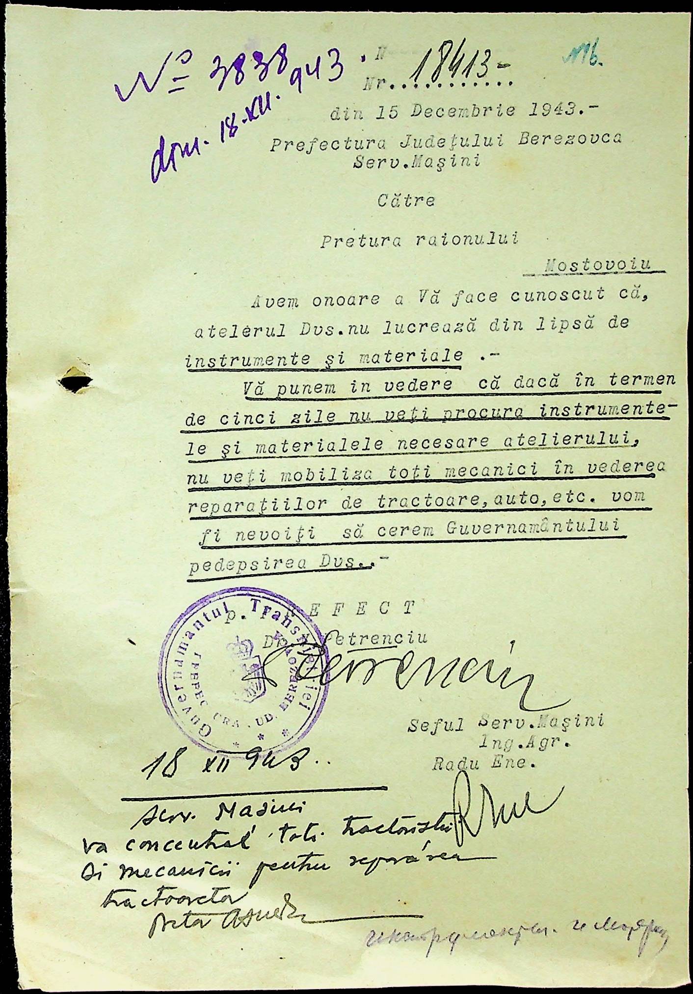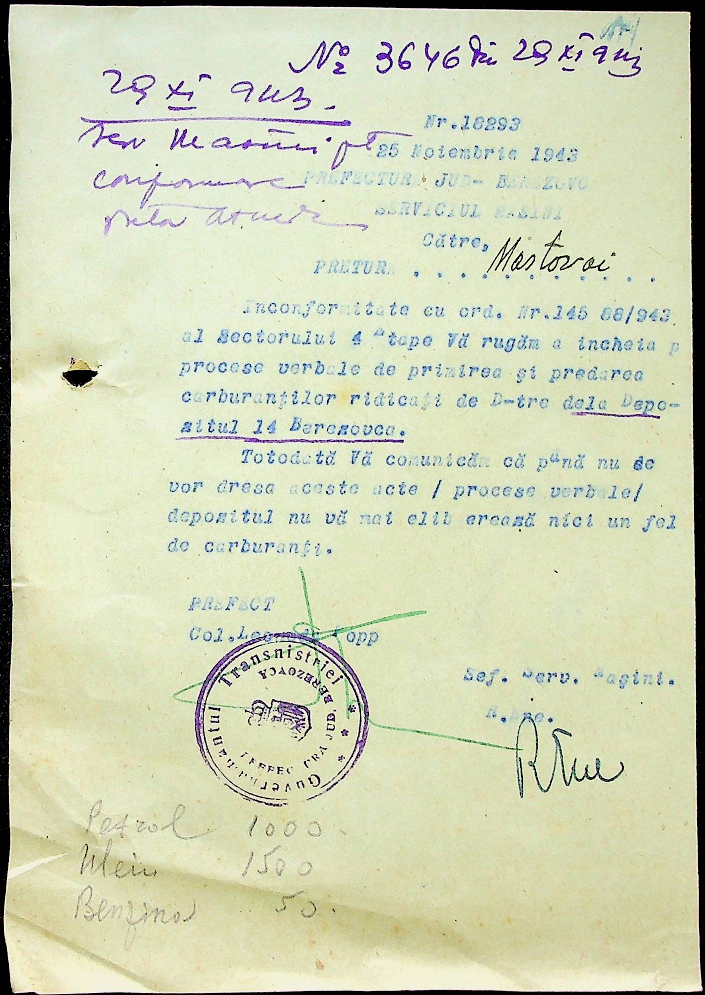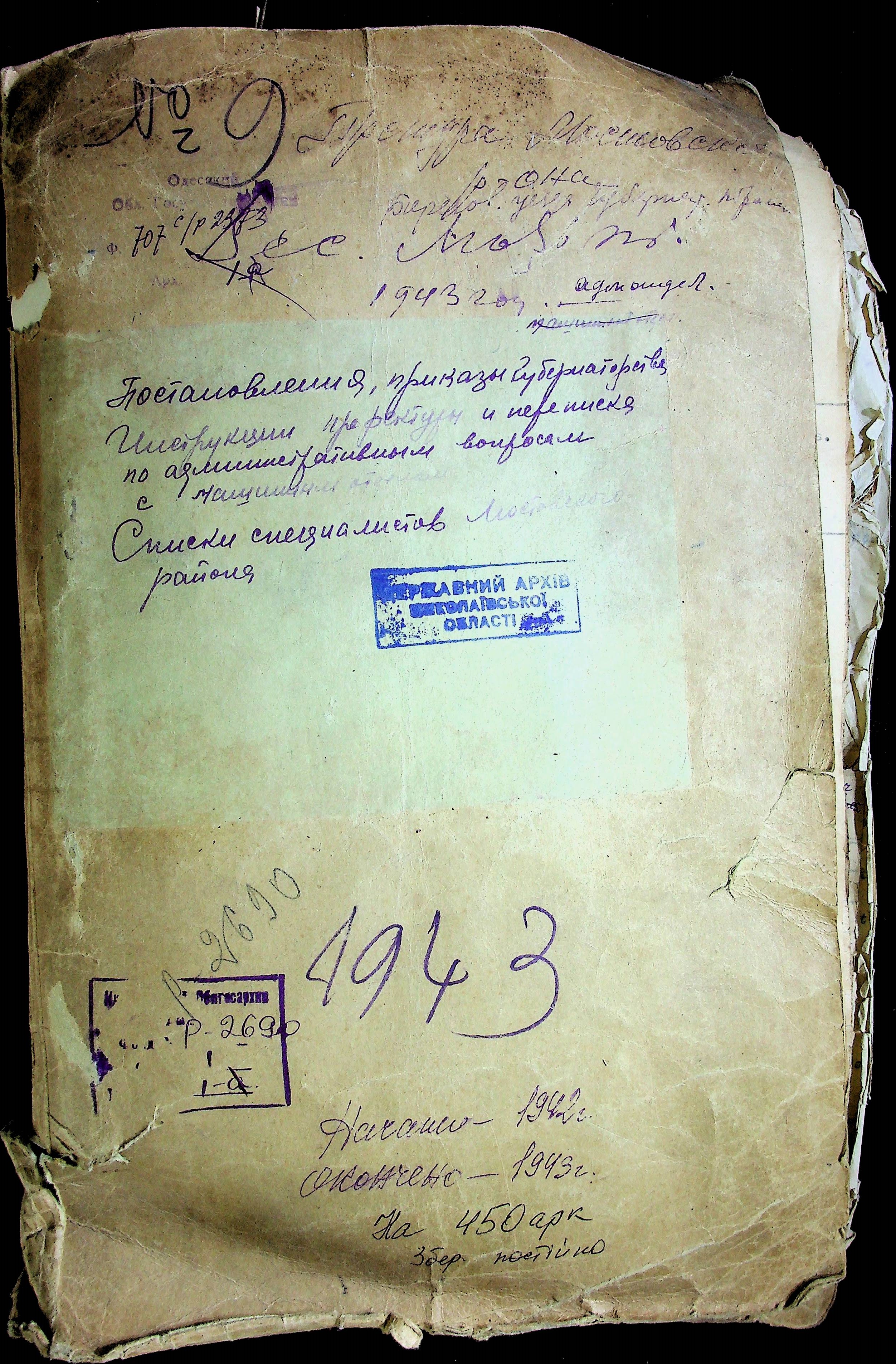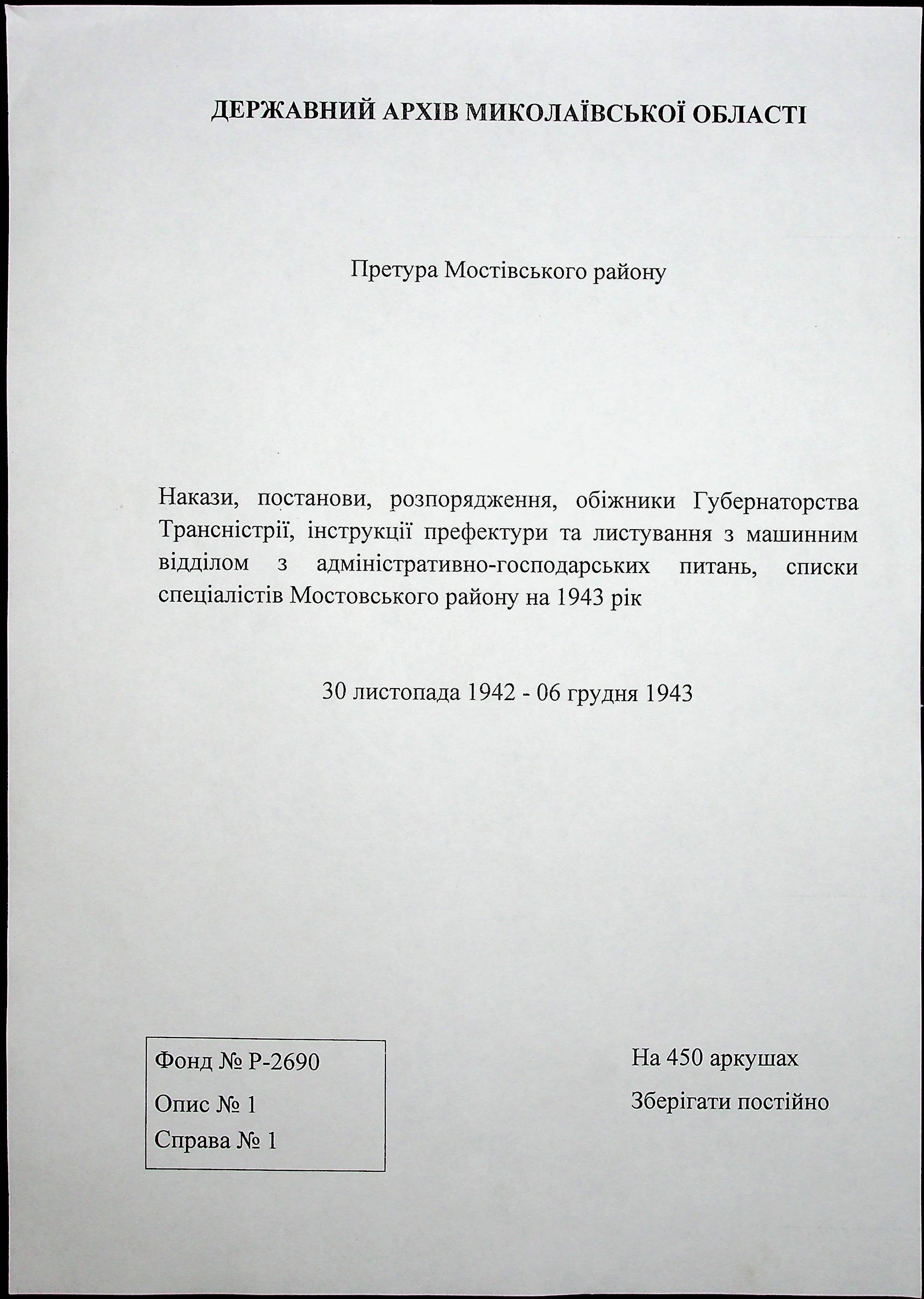 • • • • Справа № 1 “Накази, постанови, розпорядження, обіжники Губернаторства Трансністрії, інструкції префектури та листування з машинним відділом з адміністративно-господарських питань, списки спеціалістів Мостовського району на 1943 рік”