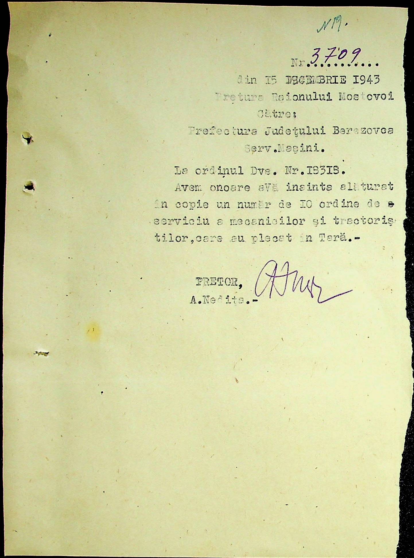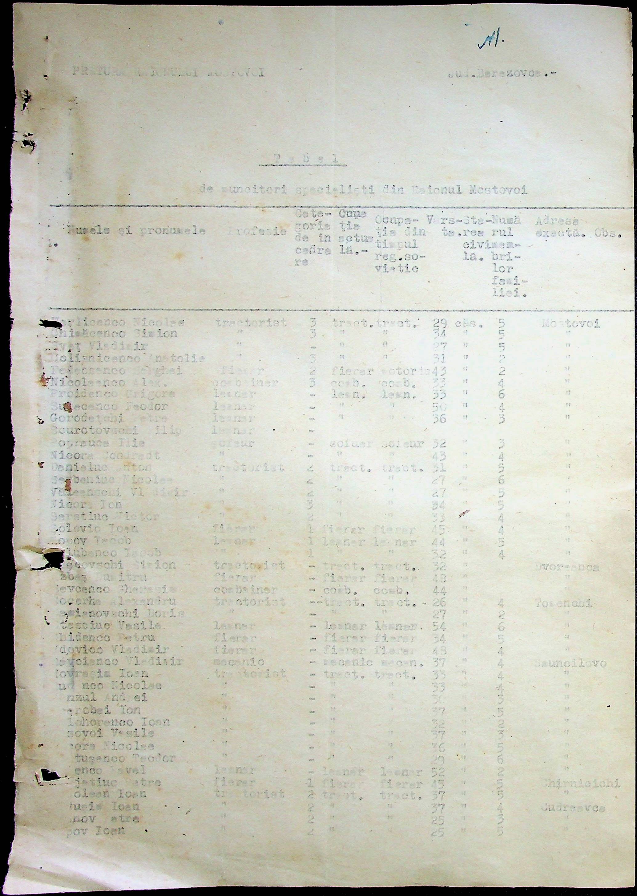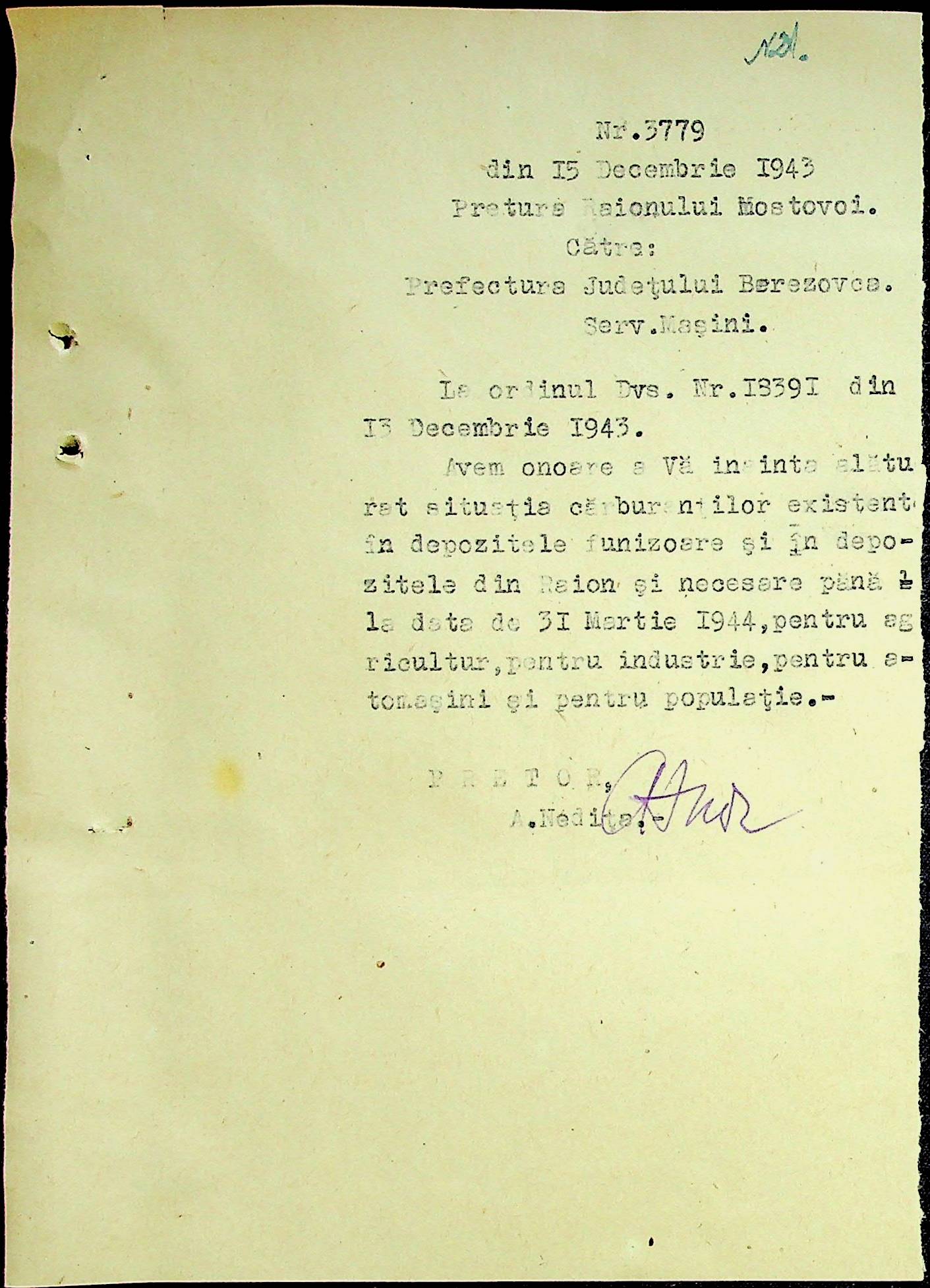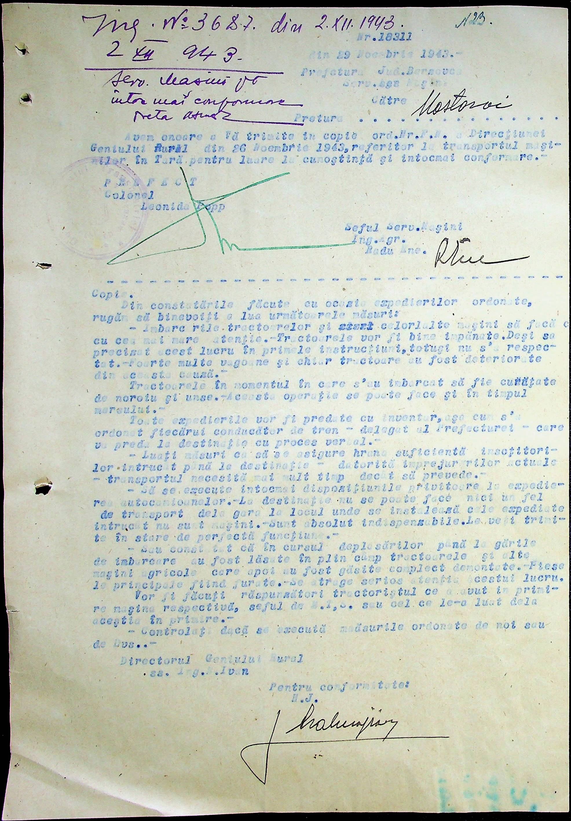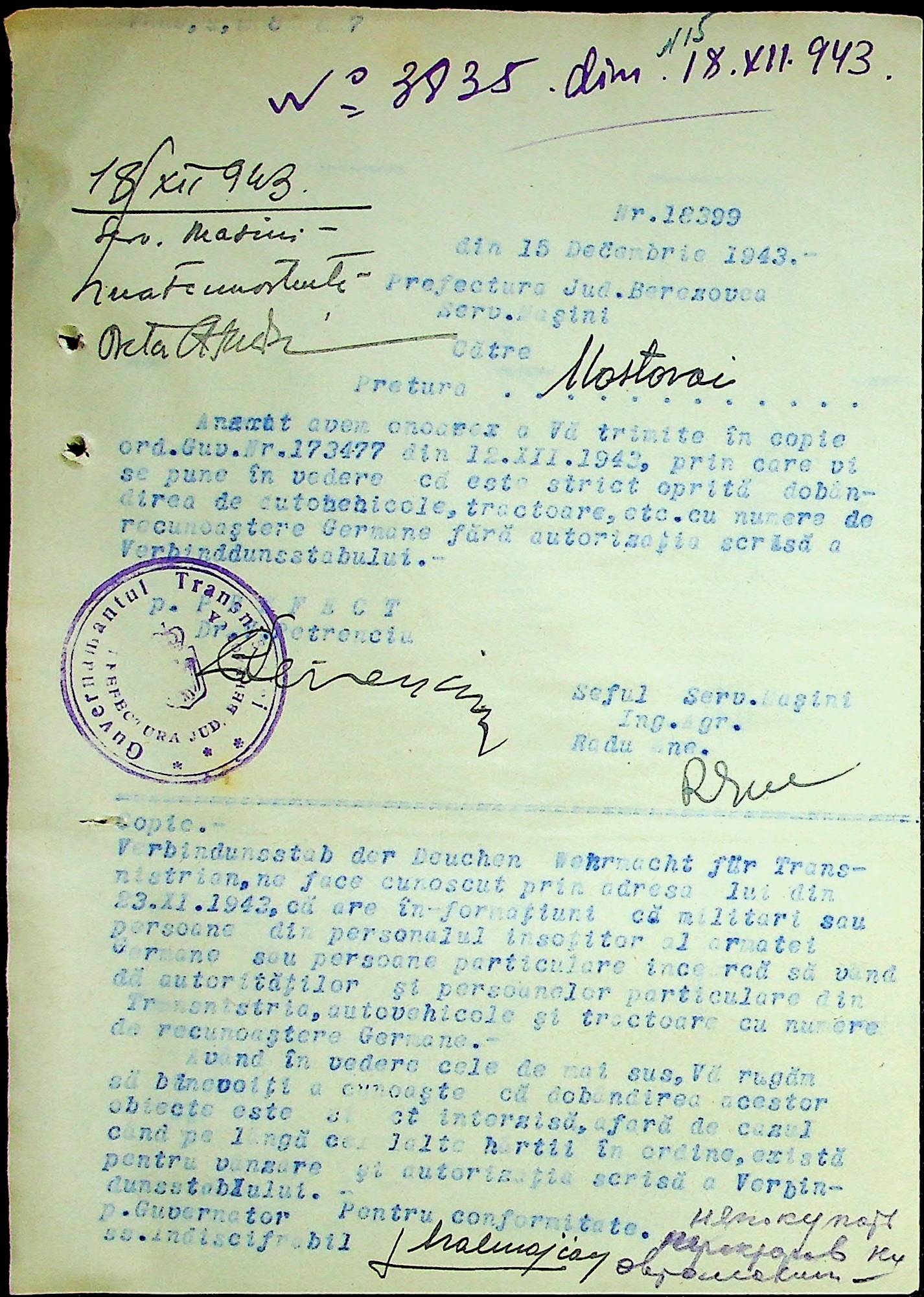 • • • • Справа № 1 “Накази, постанови, розпорядження, обіжники Губернаторства Трансністрії, інструкції префектури та листування з машинним відділом з адміністративно-господарських питань, списки спеціалістів Мостовського району на 1943 рік”