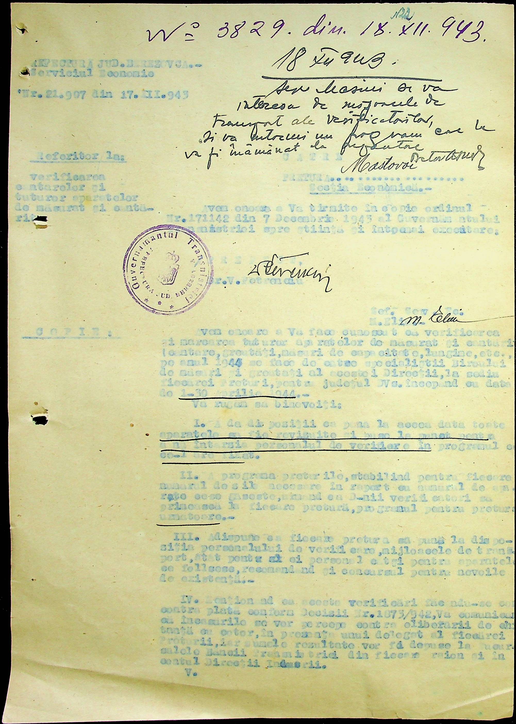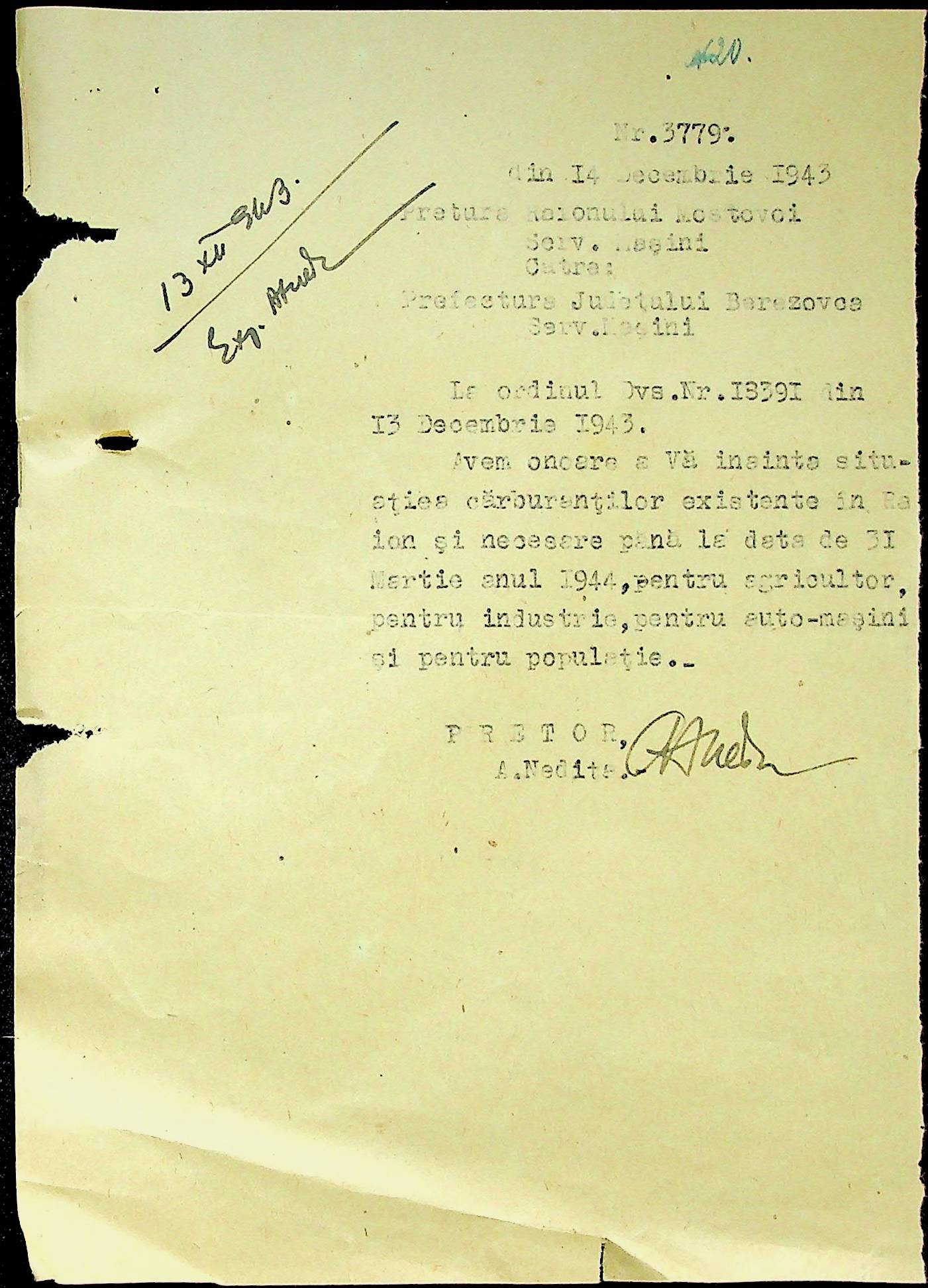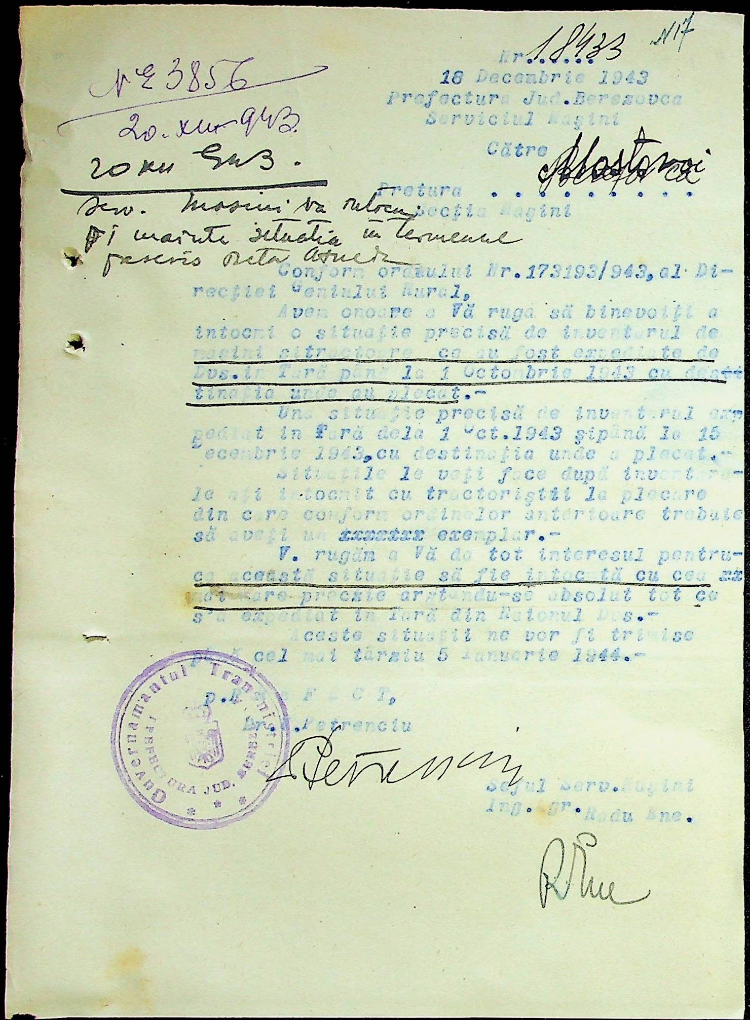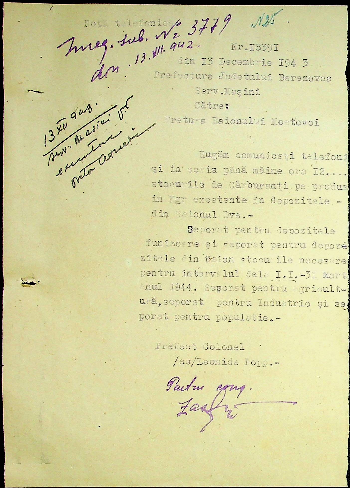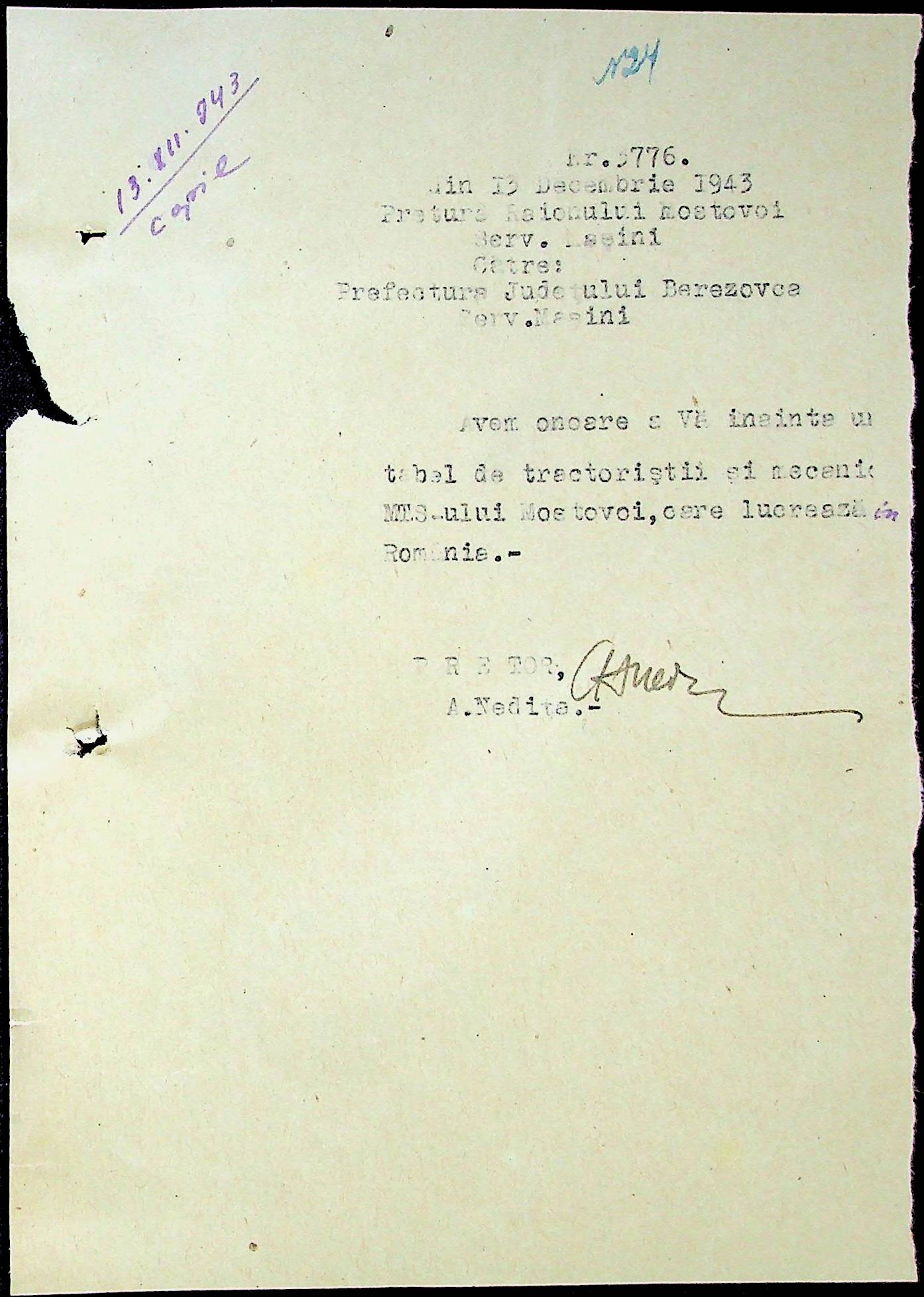• • • • Справа № 1 “Накази, постанови, розпорядження, обіжники Губернаторства Трансністрії, інструкції префектури та листування з машинним відділом з адміністративно-господарських питань, списки спеціалістів Мостовського району на 1943 рік”