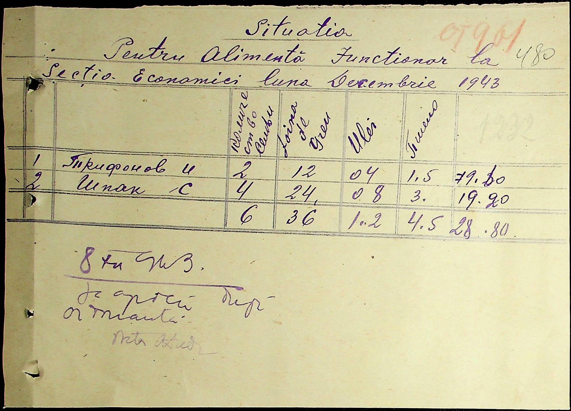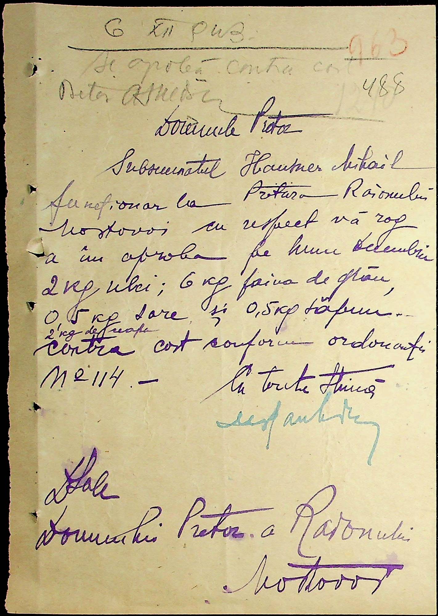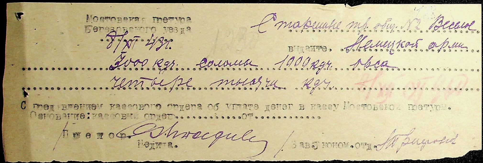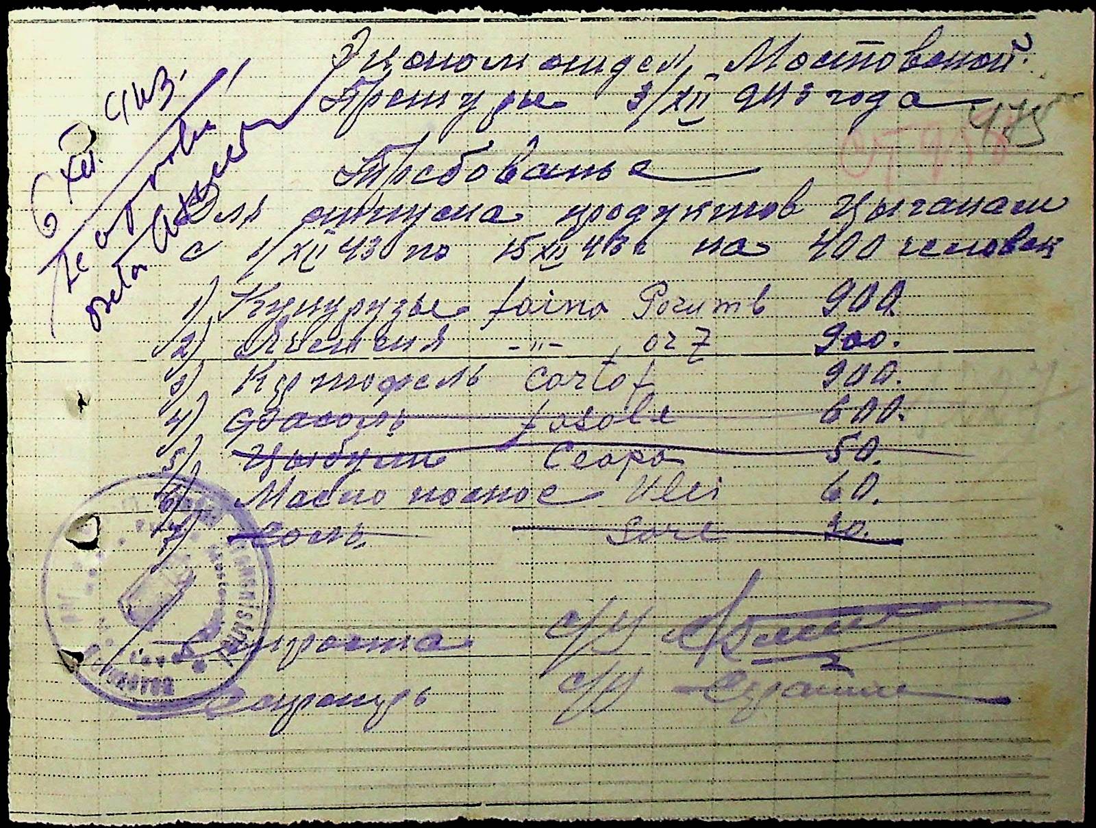 • • • • Справа № 23а Листування претури Мостівського району з установами, підприємствами і трудовими общинами про видачу продуктів службовцям румунських установ та німецькій армії. Звіти та відомості про надходження зерна, картоплі від трудових общин. Відомость про видачу продуктів євреям-майстровим. Списки худоби, вивезеної до Румунії