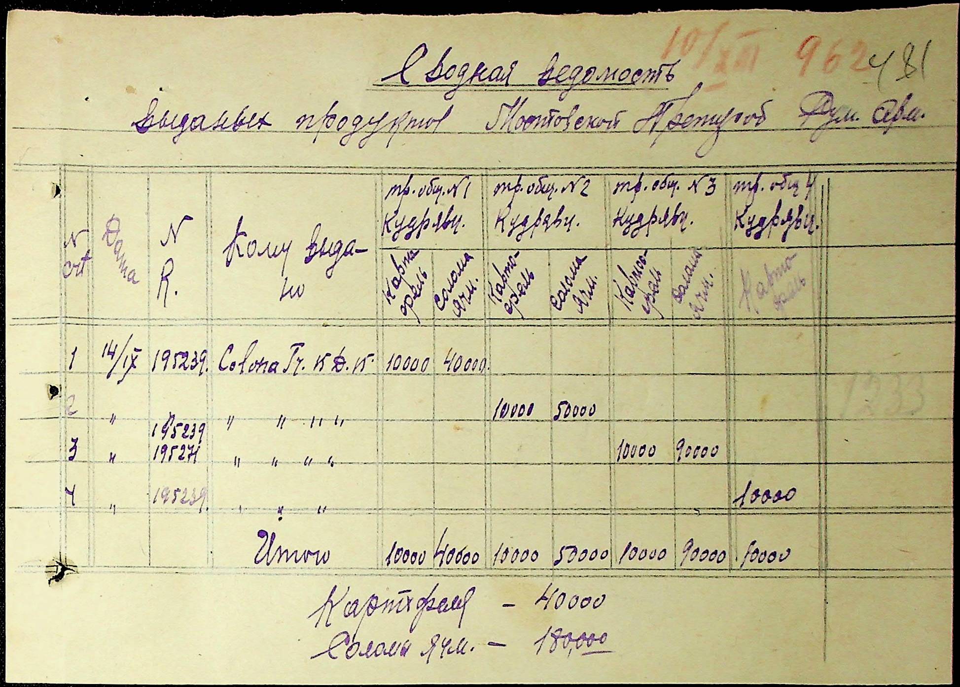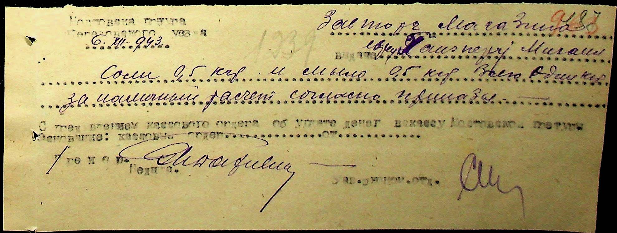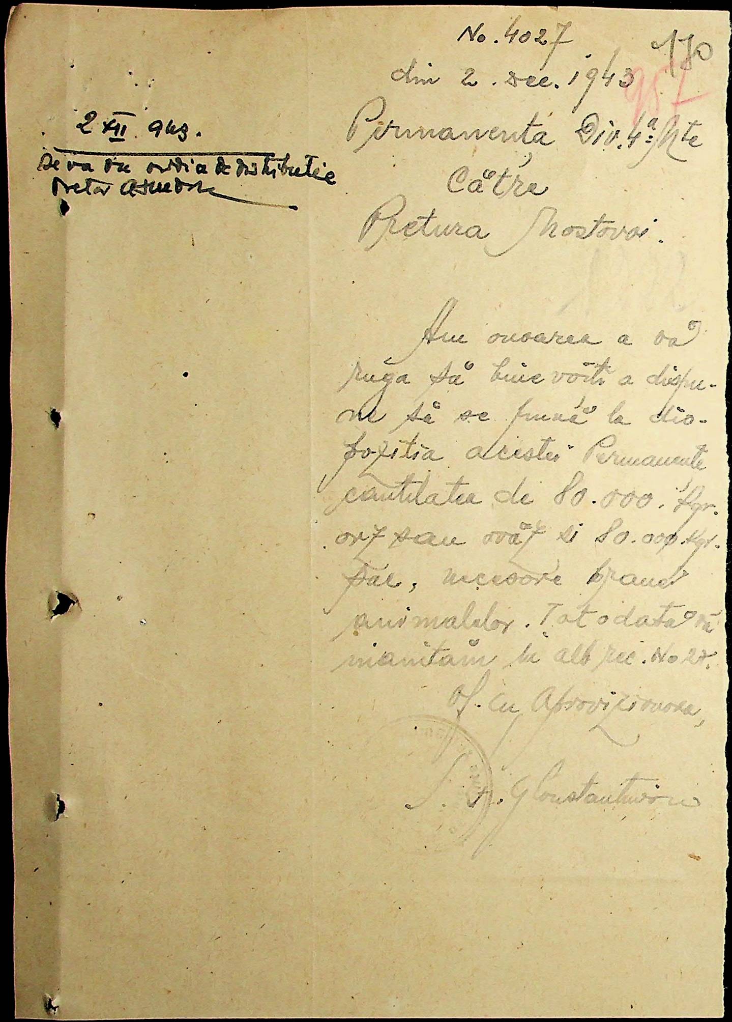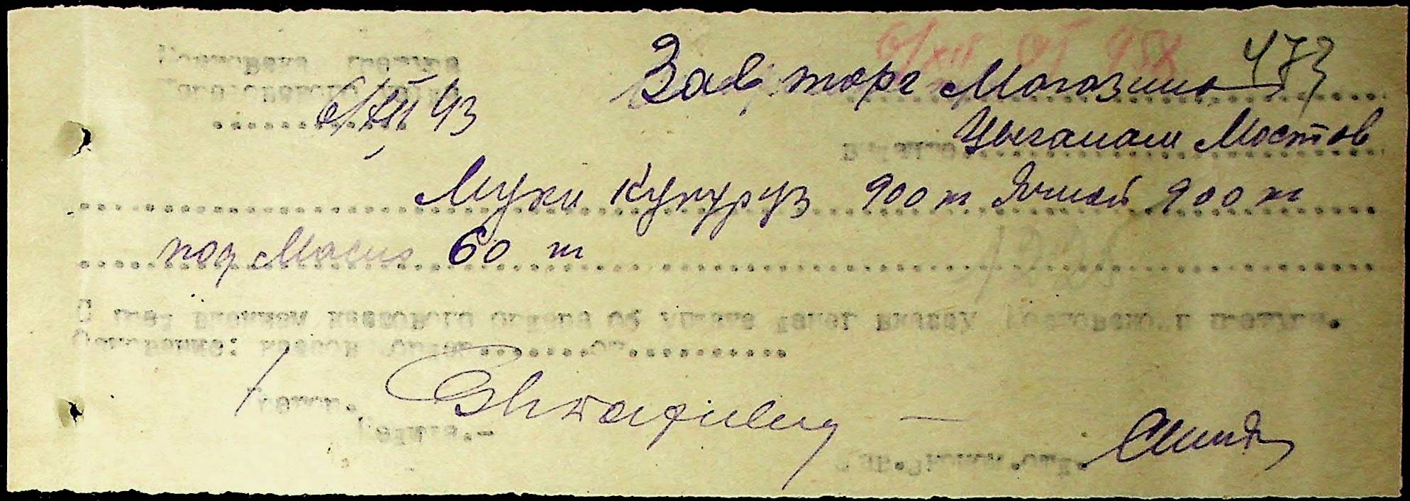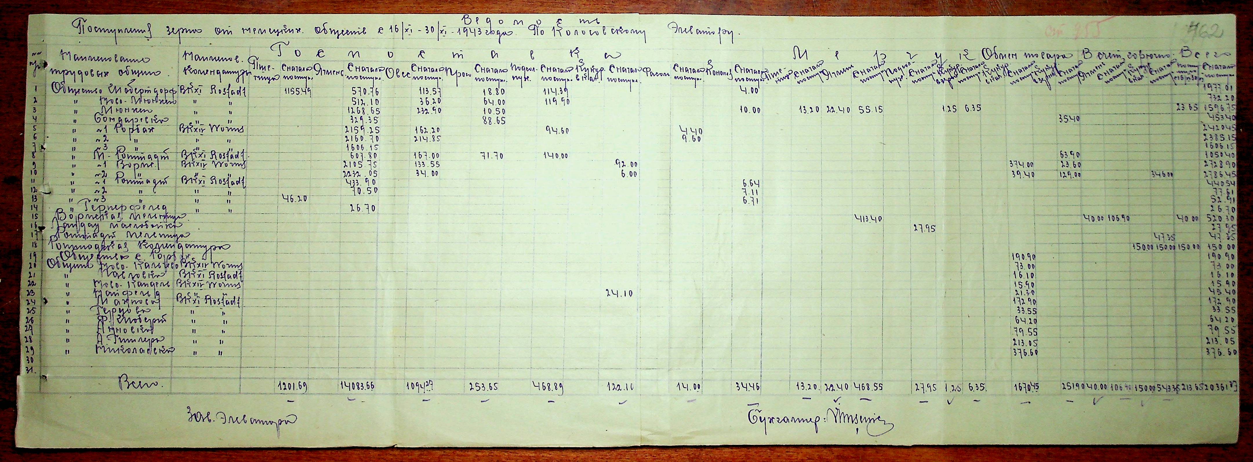 • • • • Справа № 23а Листування претури Мостівського району з установами, підприємствами і трудовими общинами про видачу продуктів службовцям румунських установ та німецькій армії. Звіти та відомості про надходження зерна, картоплі від трудових общин. Відомость про видачу продуктів євреям-майстровим. Списки худоби, вивезеної до Румунії