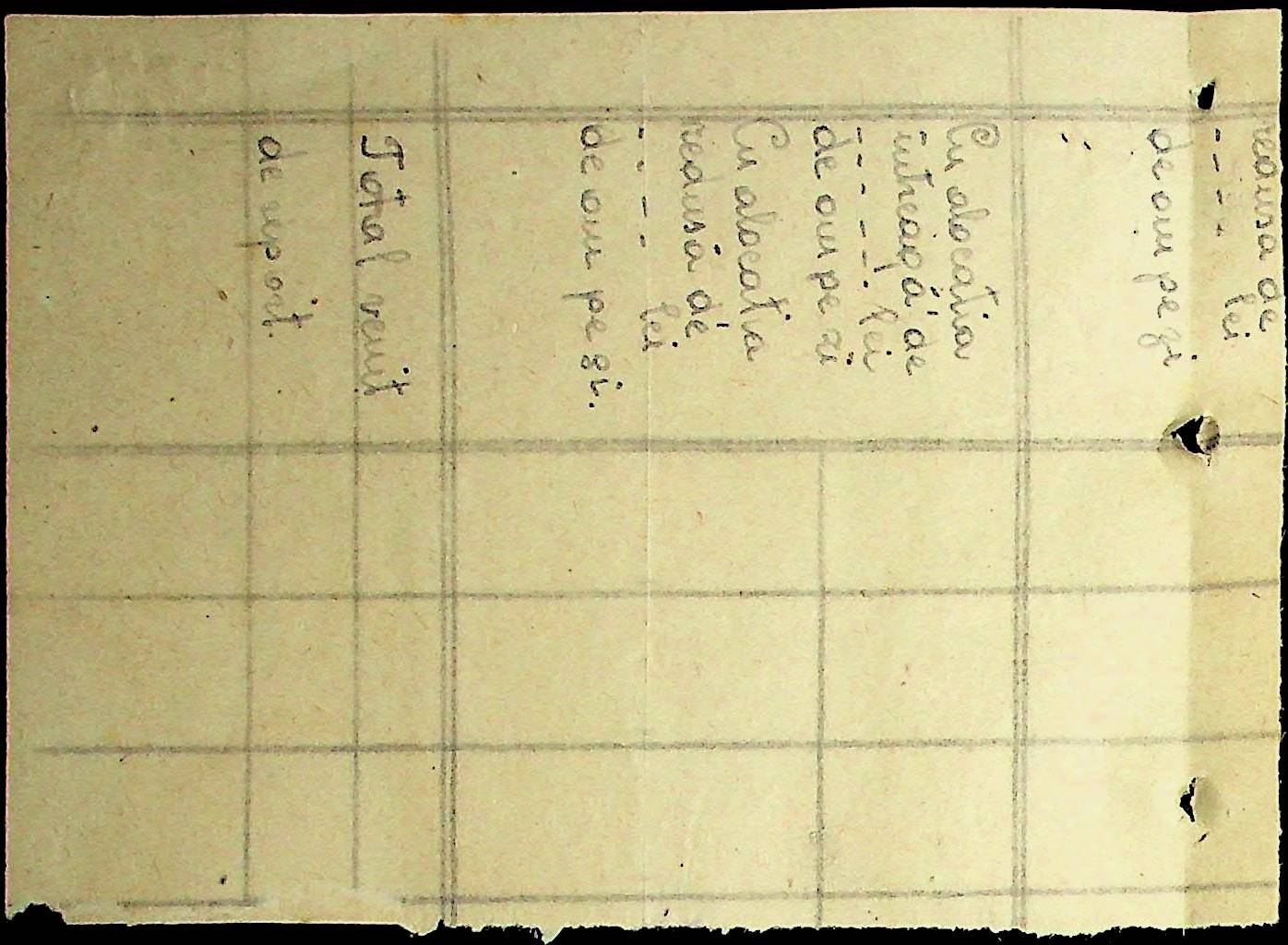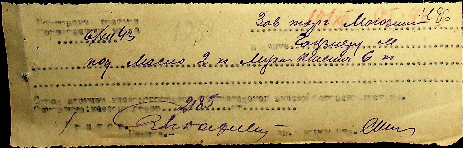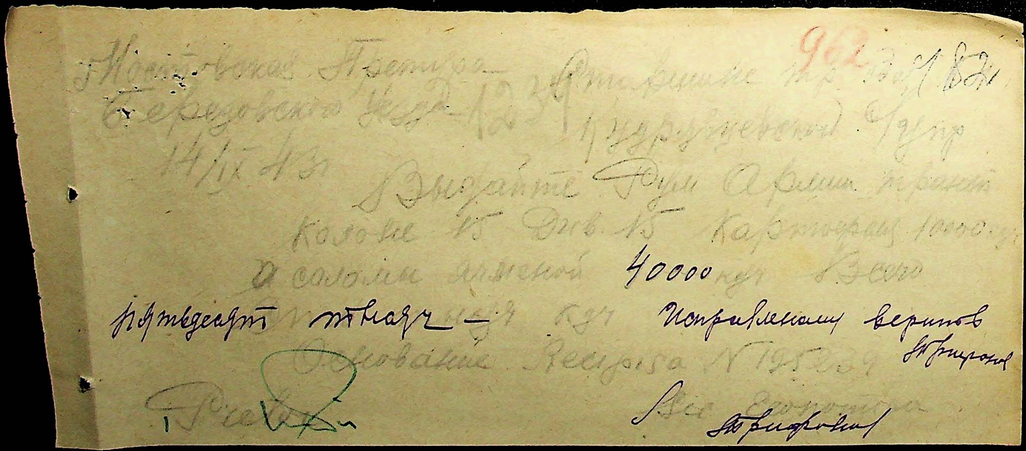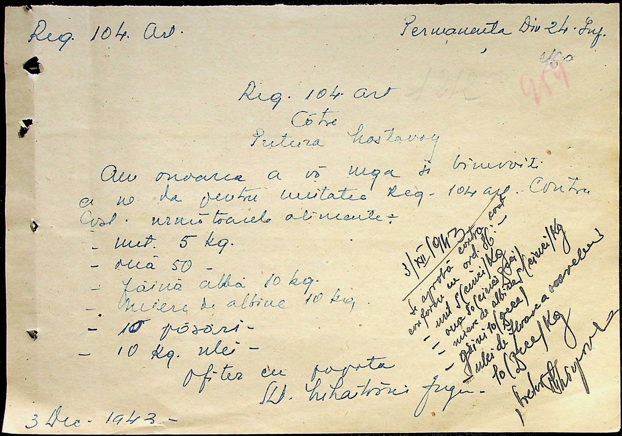 • • • • Справа № 23а Листування претури Мостівського району з установами, підприємствами і трудовими общинами про видачу продуктів службовцям румунських установ та німецькій армії. Звіти та відомості про надходження зерна, картоплі від трудових общин. Відомость про видачу продуктів євреям-майстровим. Списки худоби, вивезеної до Румунії