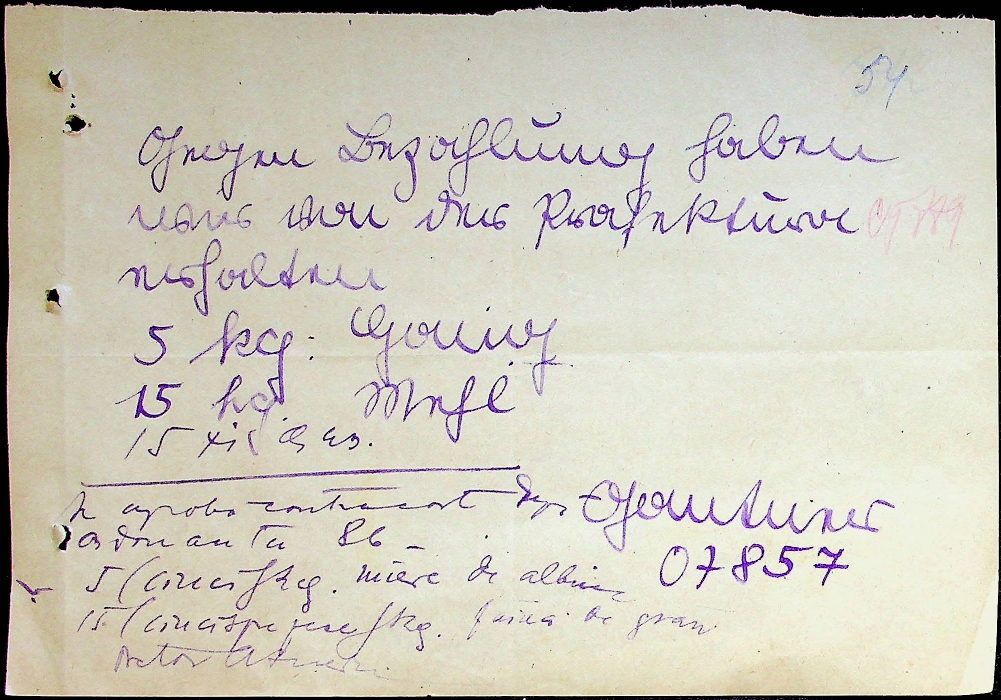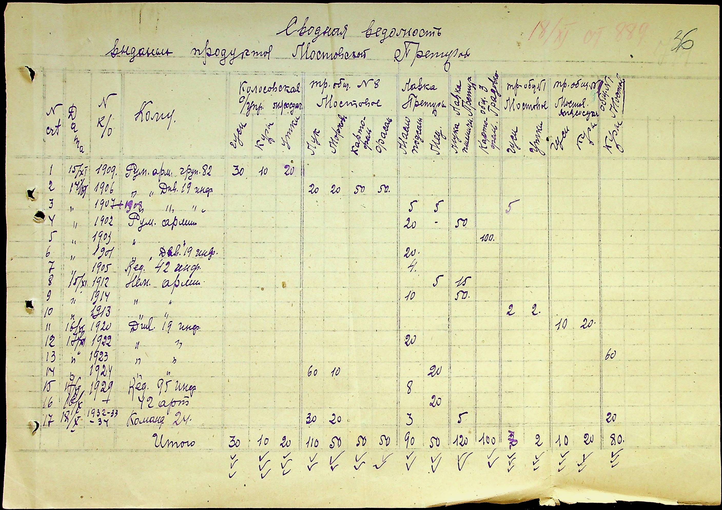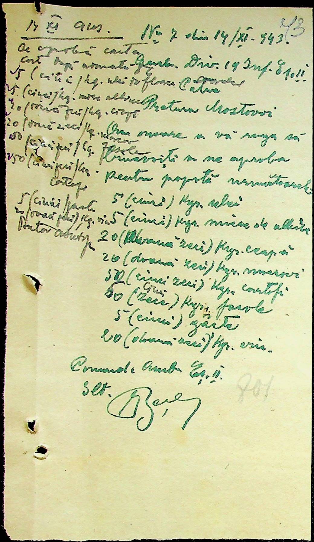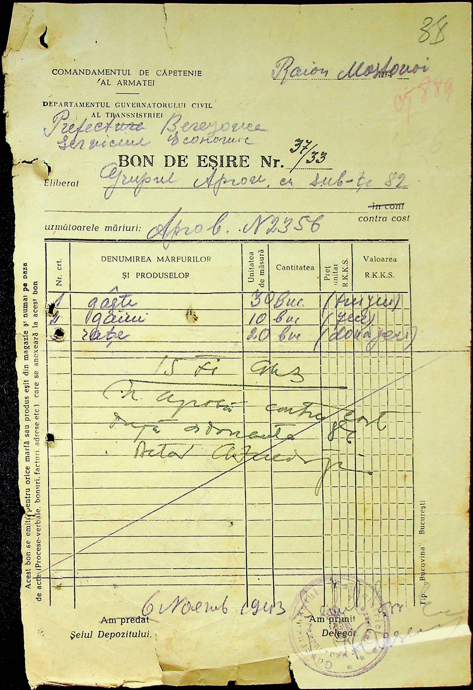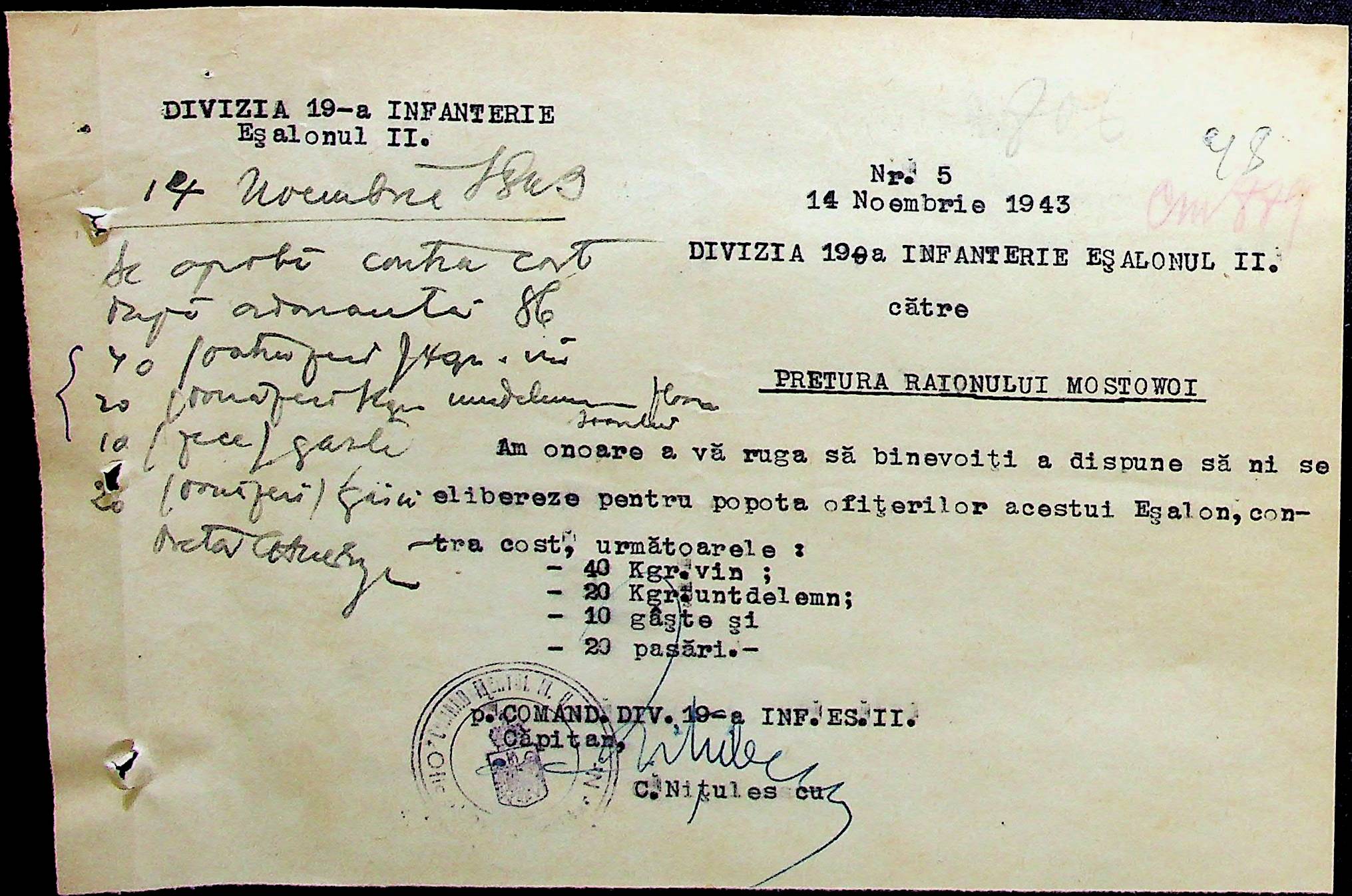 • • • • Справа № 23а Листування претури Мостівського району з установами, підприємствами і трудовими общинами про видачу продуктів службовцям румунських установ та німецькій армії. Звіти та відомості про надходження зерна, картоплі від трудових общин. Відомость про видачу продуктів євреям-майстровим. Списки худоби, вивезеної до Румунії