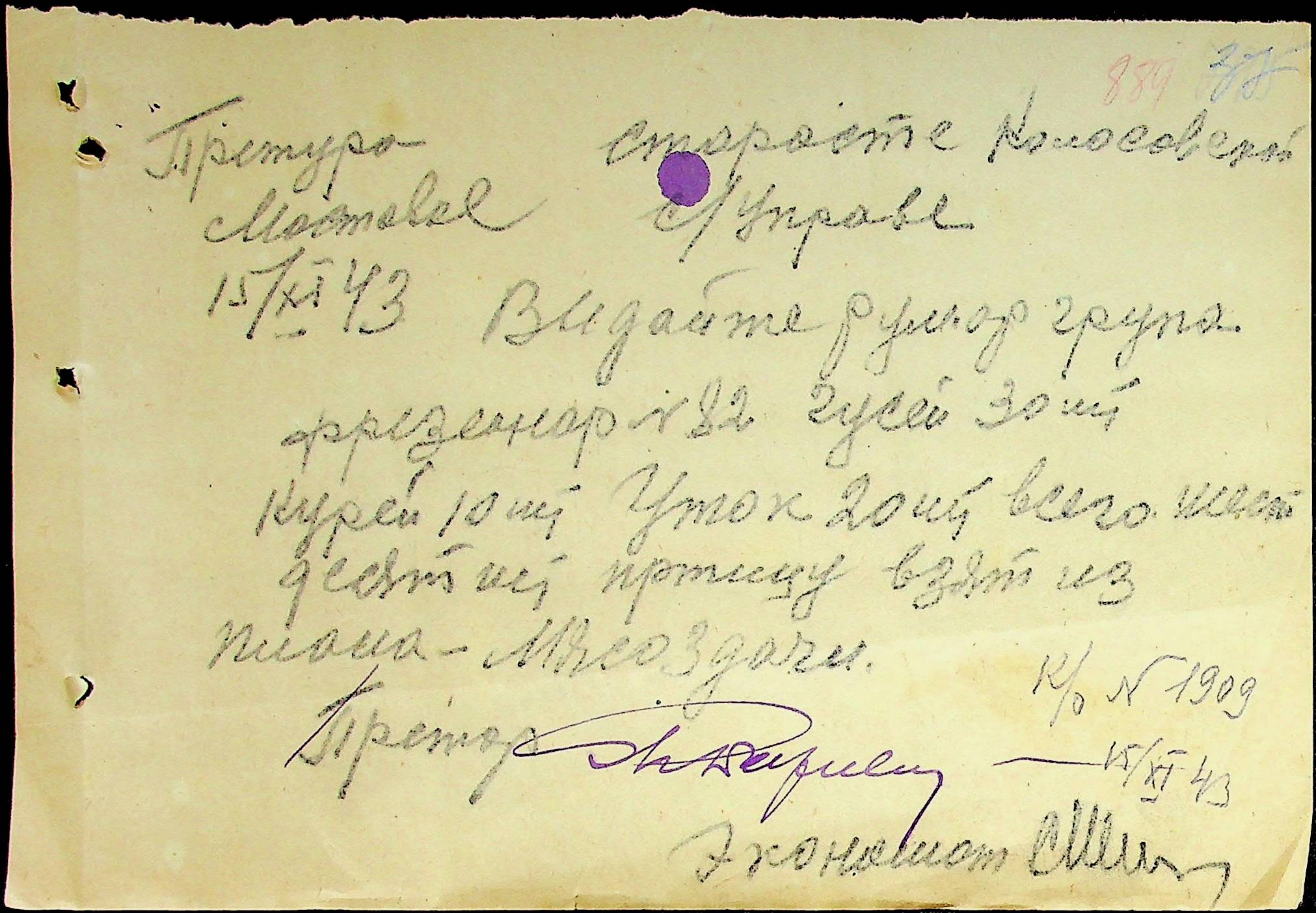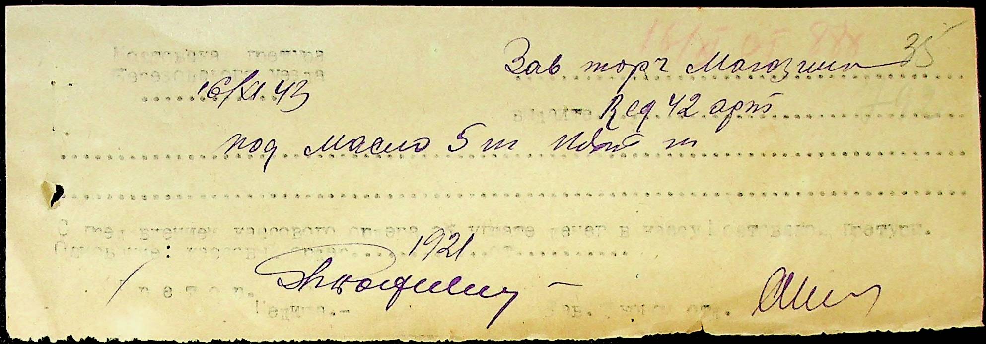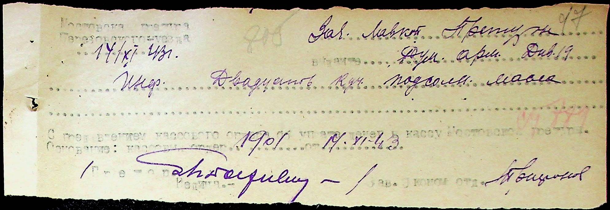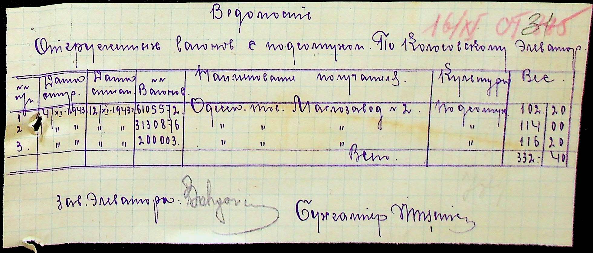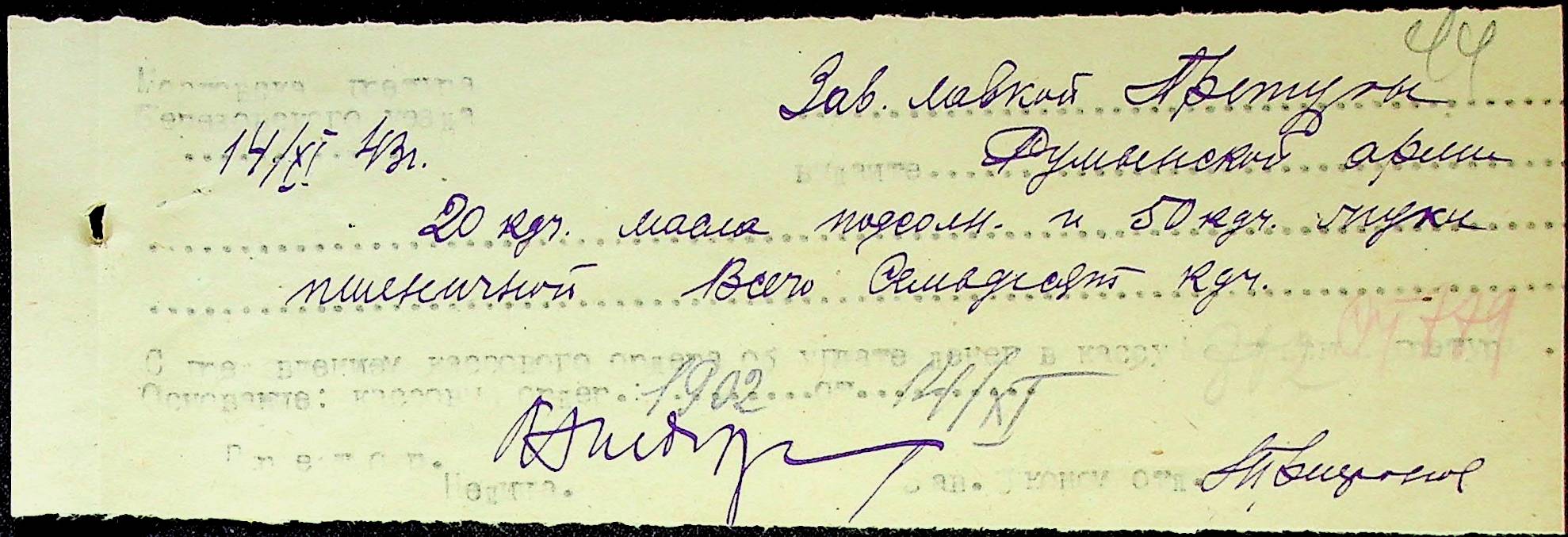 • • • • Справа № 23а Листування претури Мостівського району з установами, підприємствами і трудовими общинами про видачу продуктів службовцям румунських установ та німецькій армії. Звіти та відомості про надходження зерна, картоплі від трудових общин. Відомость про видачу продуктів євреям-майстровим. Списки худоби, вивезеної до Румунії