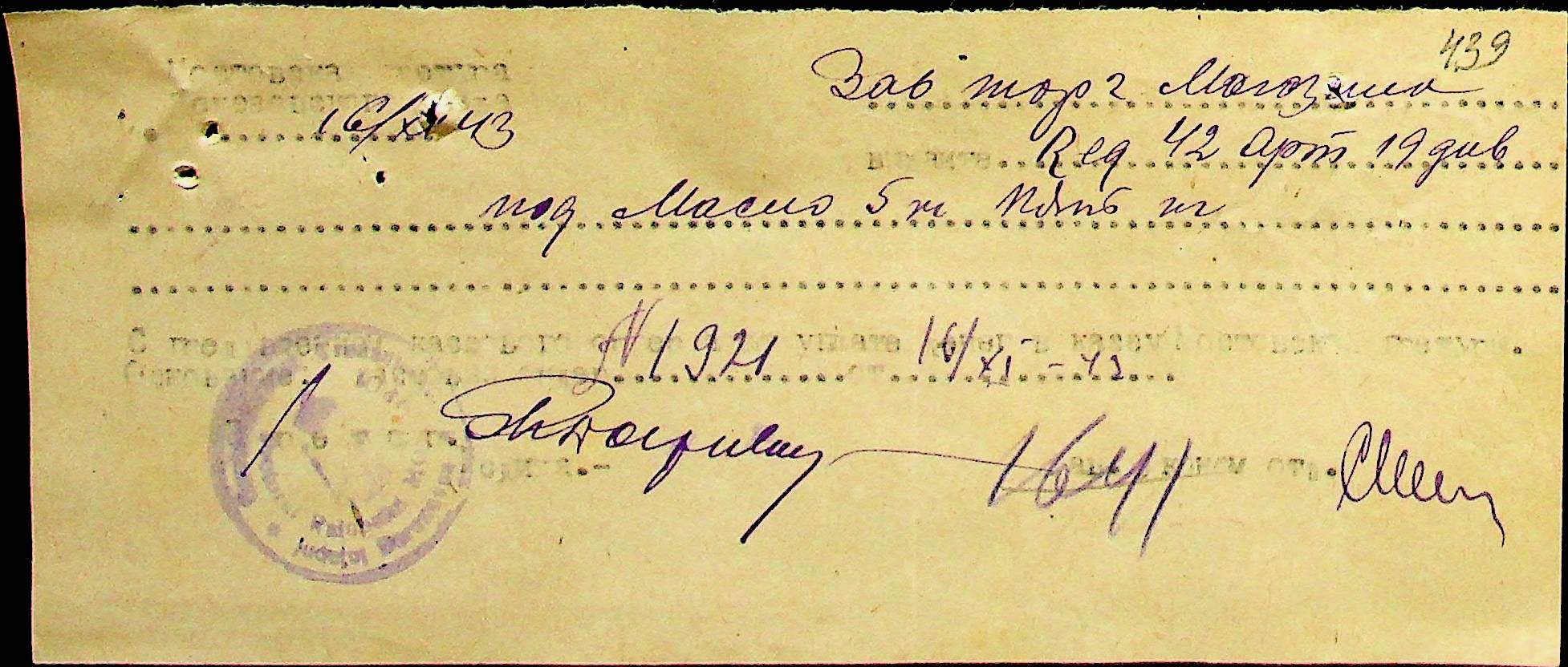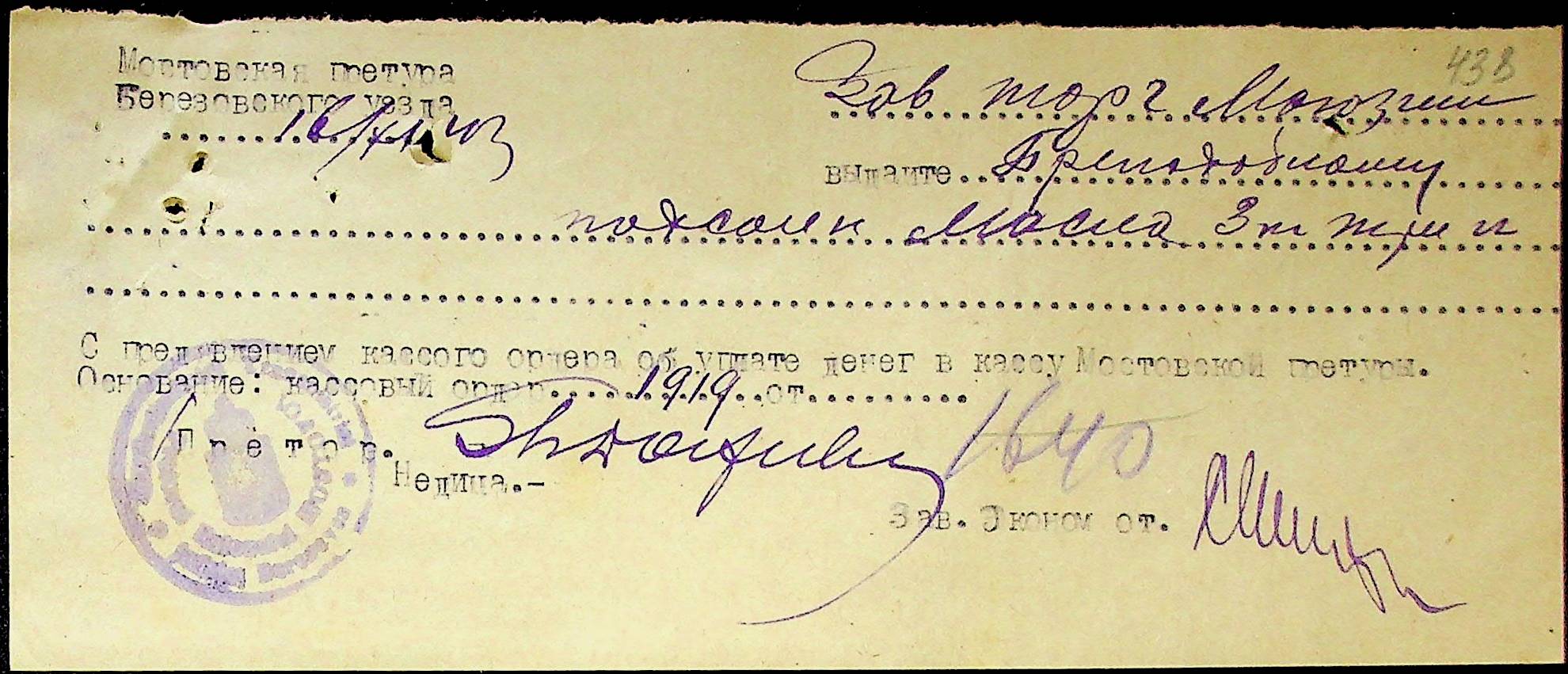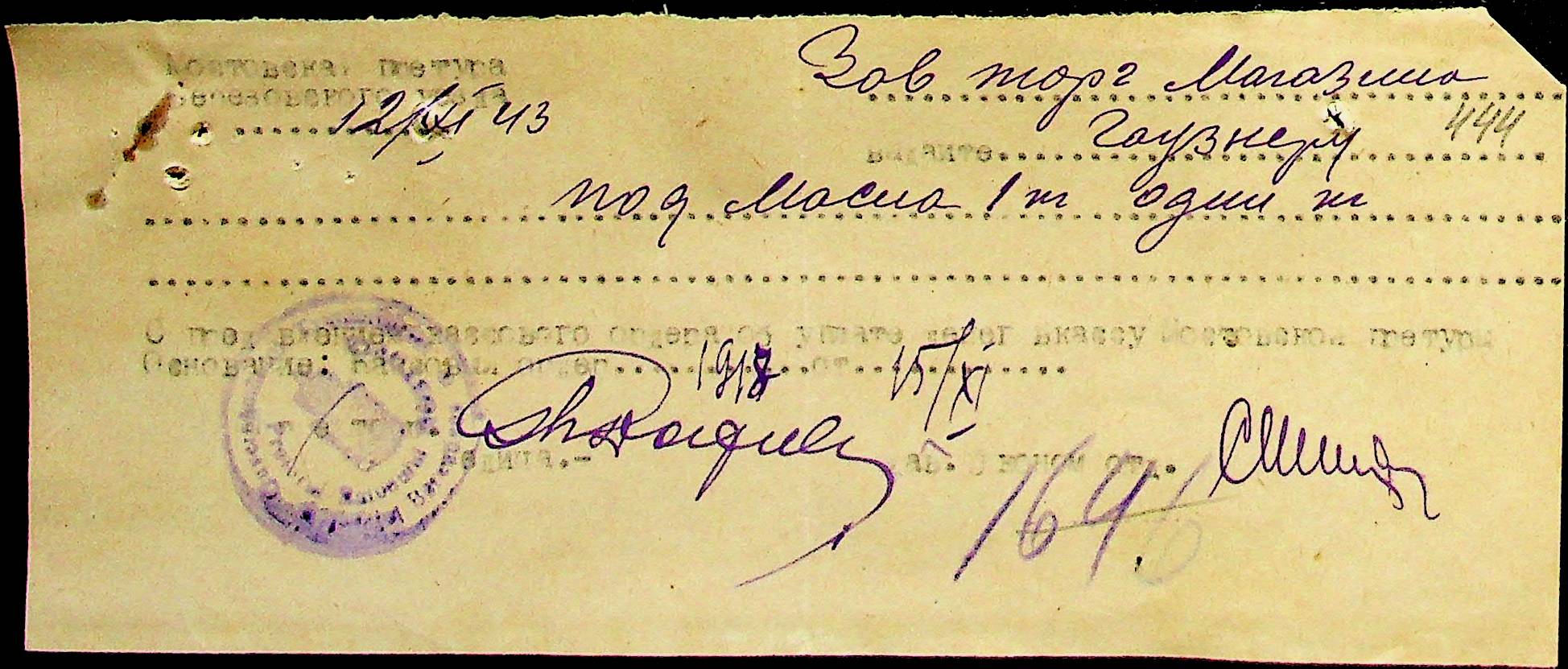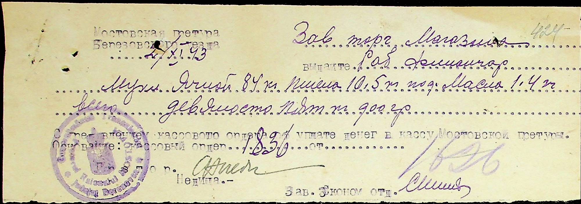 • • • • Справа № 27б Списки службовців відділів претури на отримання пайка. Відомості про надходження та витрати продуктів по магазинам претури Мостівського району. Листування з магазинами про видачу трудовим общинам продуктів та будівельних матеріалів