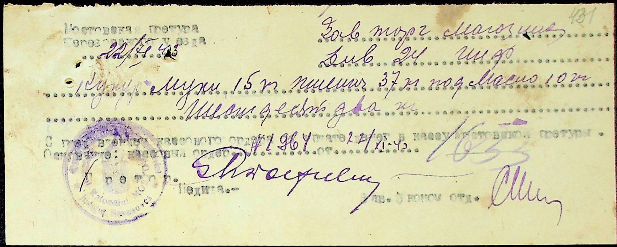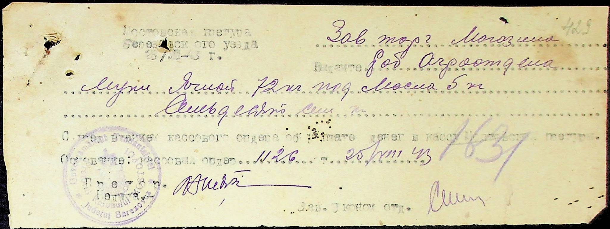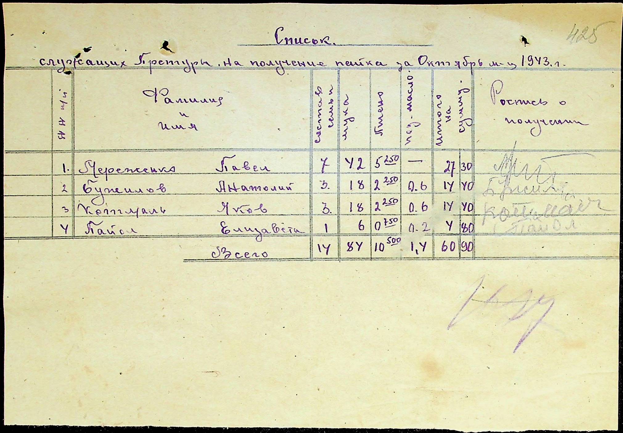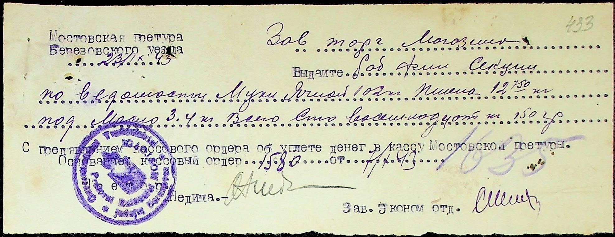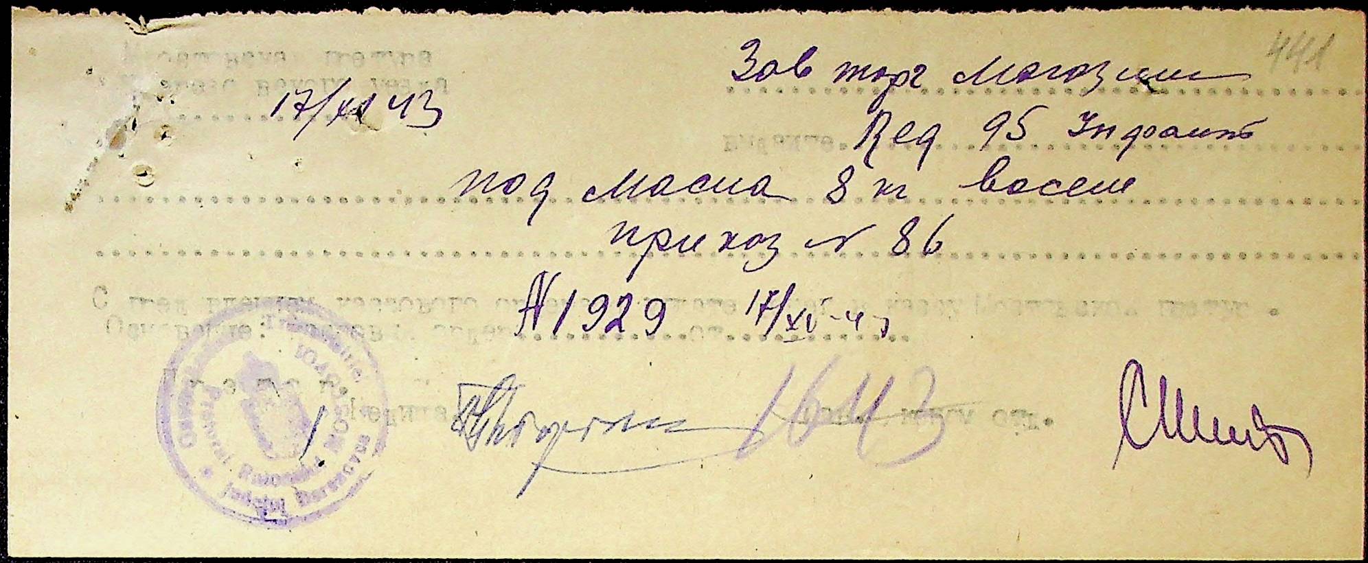 • • • • Справа № 27б Списки службовців відділів претури на отримання пайка. Відомості про надходження та витрати продуктів по магазинам претури Мостівського району. Листування з магазинами про видачу трудовим общинам продуктів та будівельних матеріалів