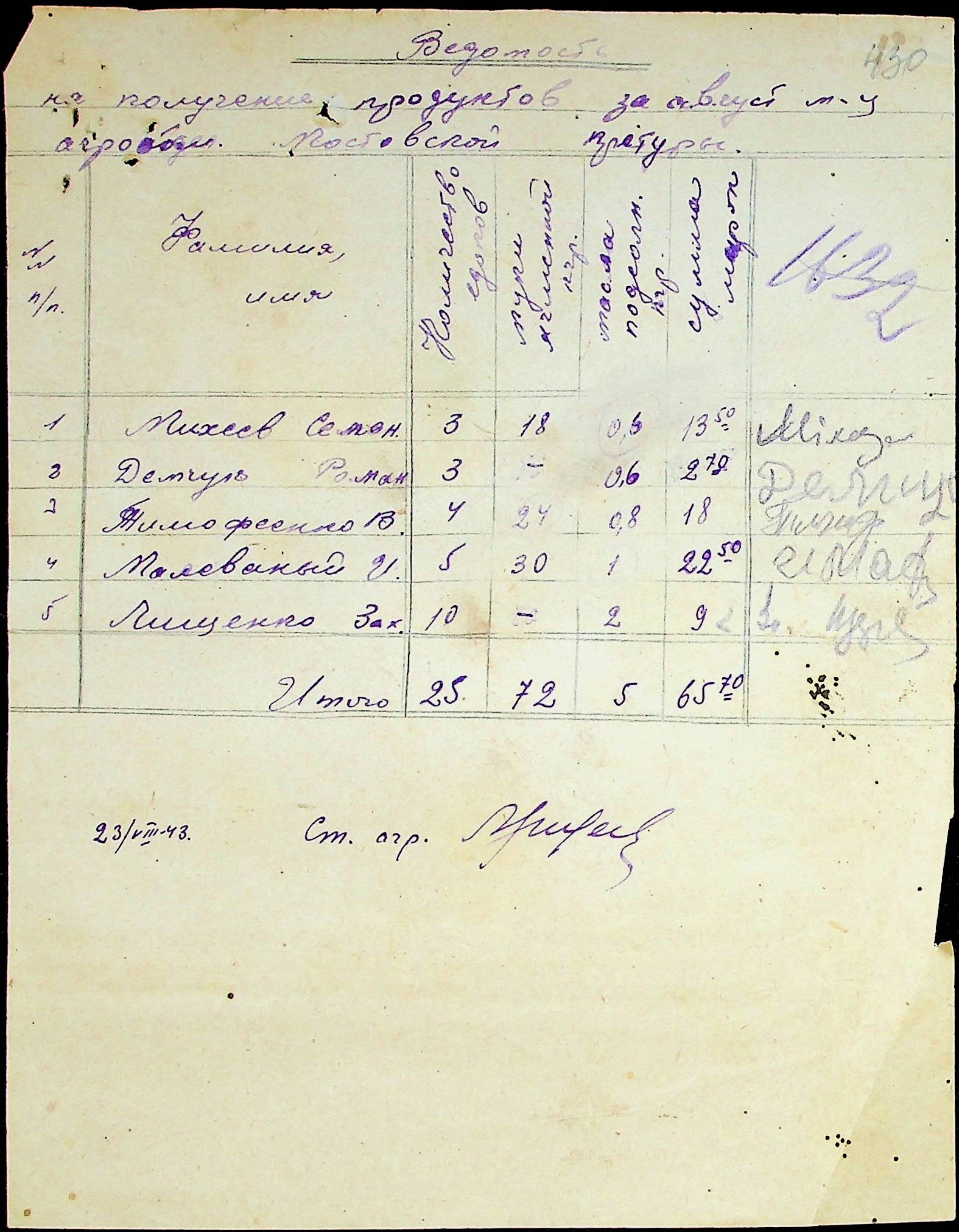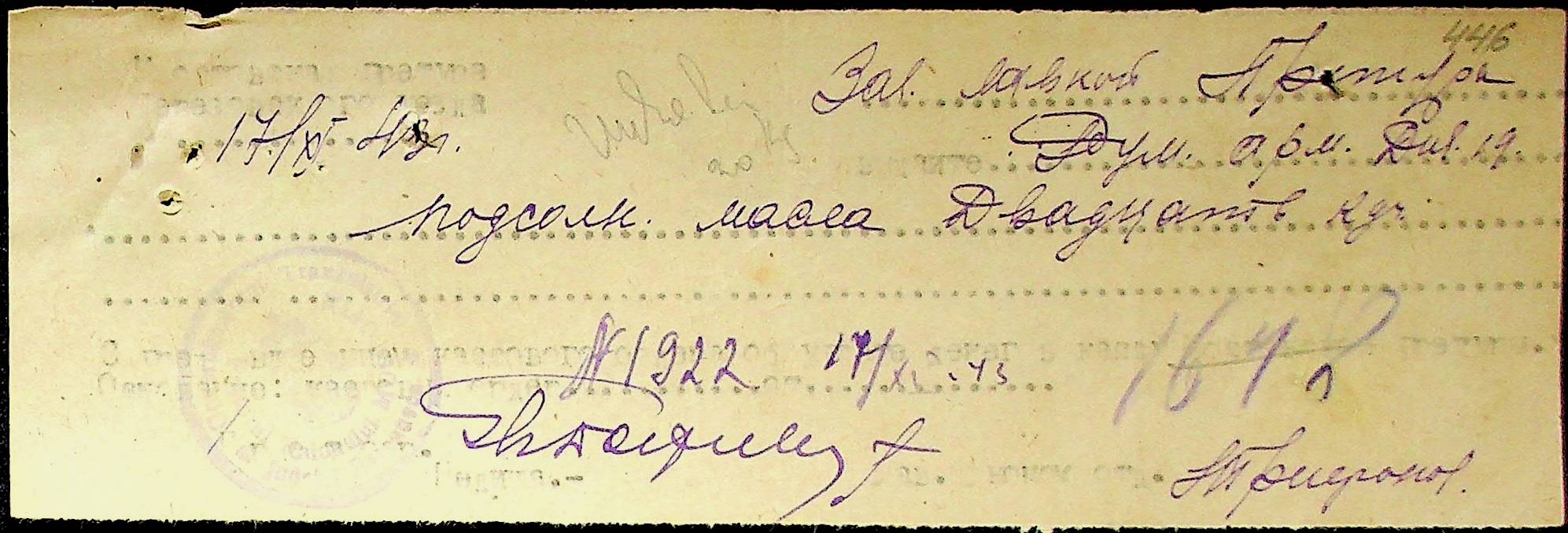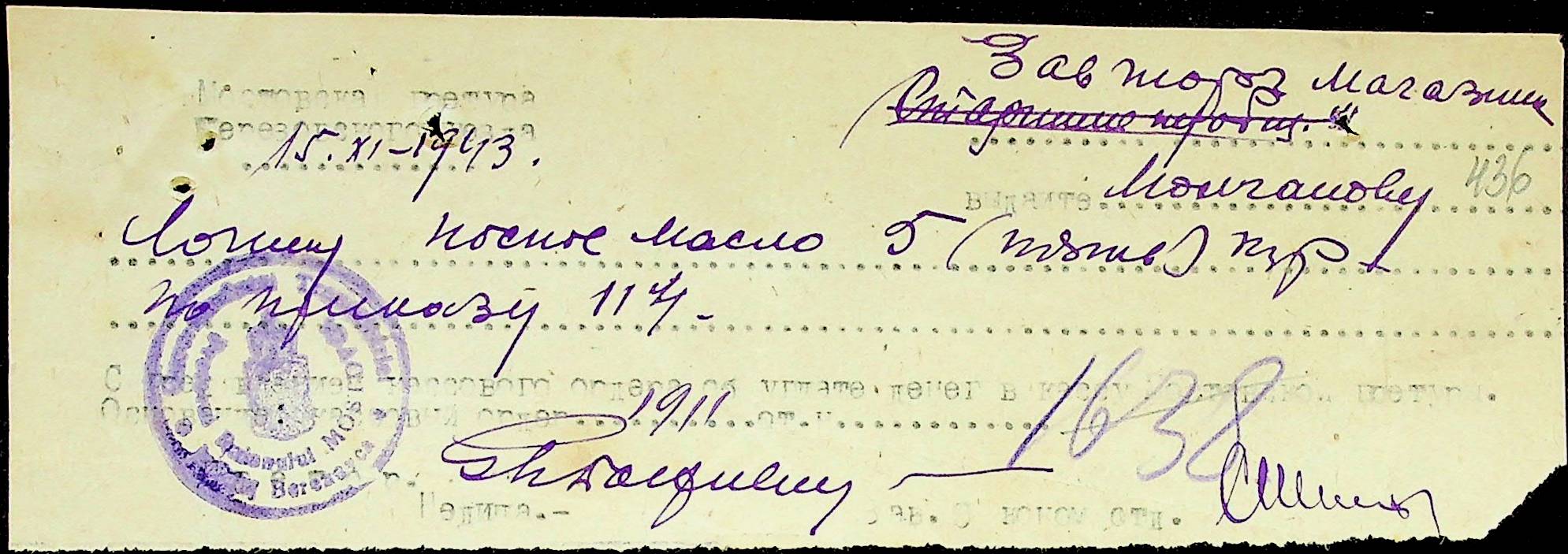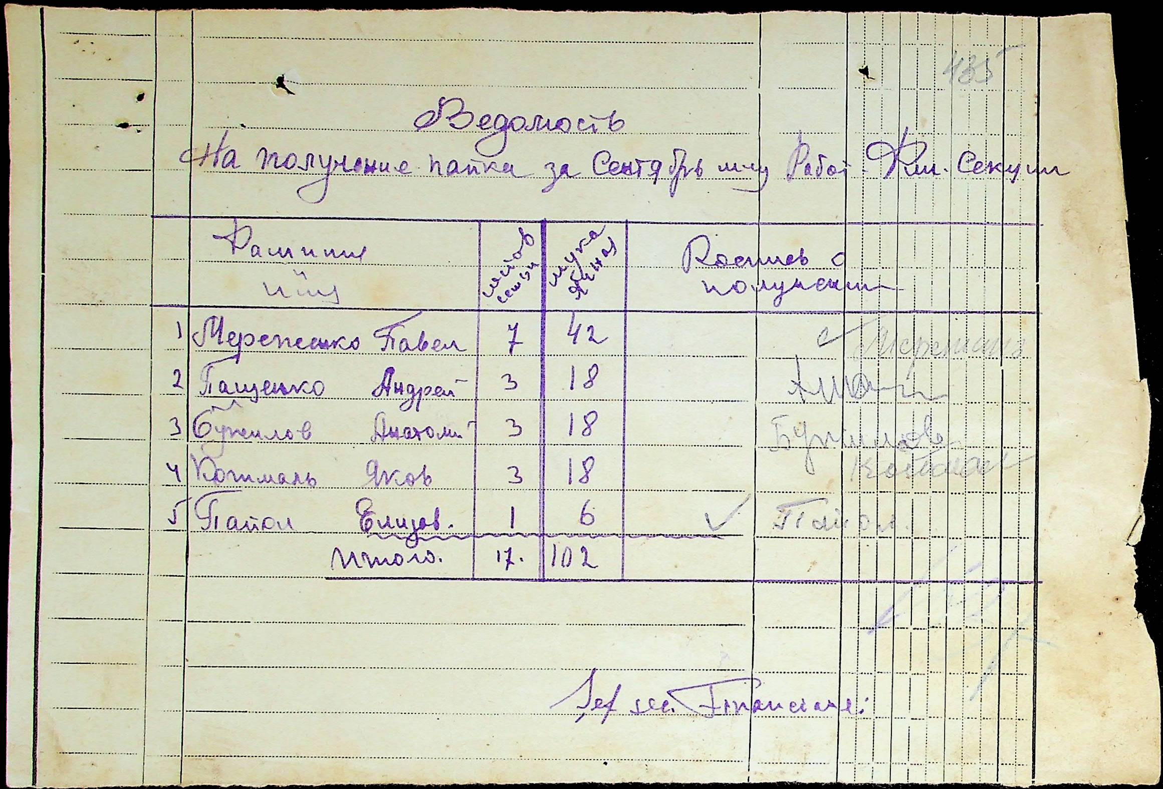• • • • Справа № 27б Списки службовців відділів претури на отримання пайка. Відомості про надходження та витрати продуктів по магазинам претури Мостівського району. Листування з магазинами про видачу трудовим общинам продуктів та будівельних матеріалів