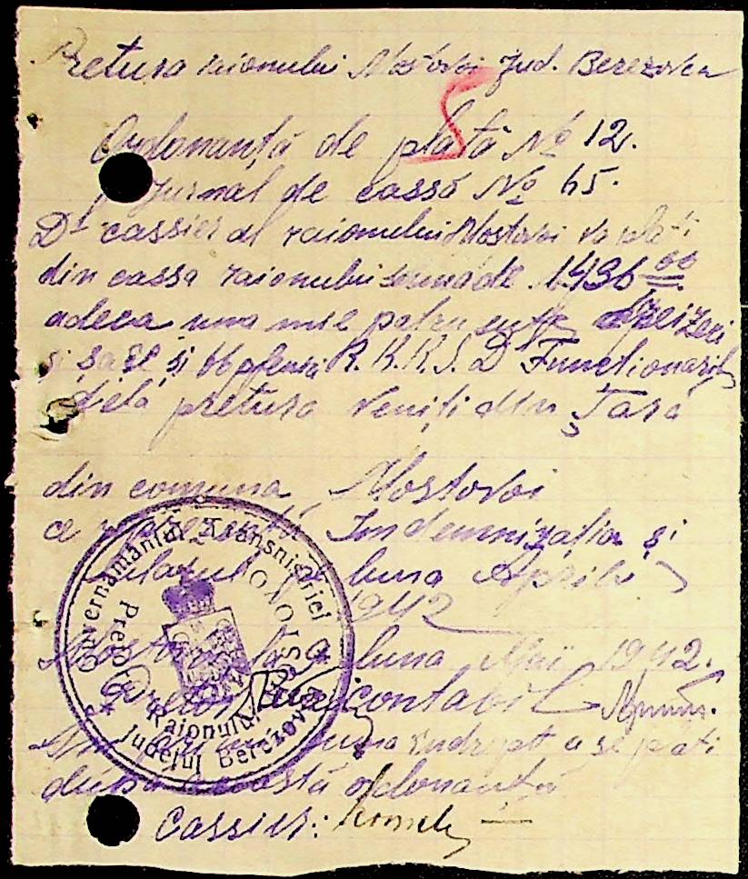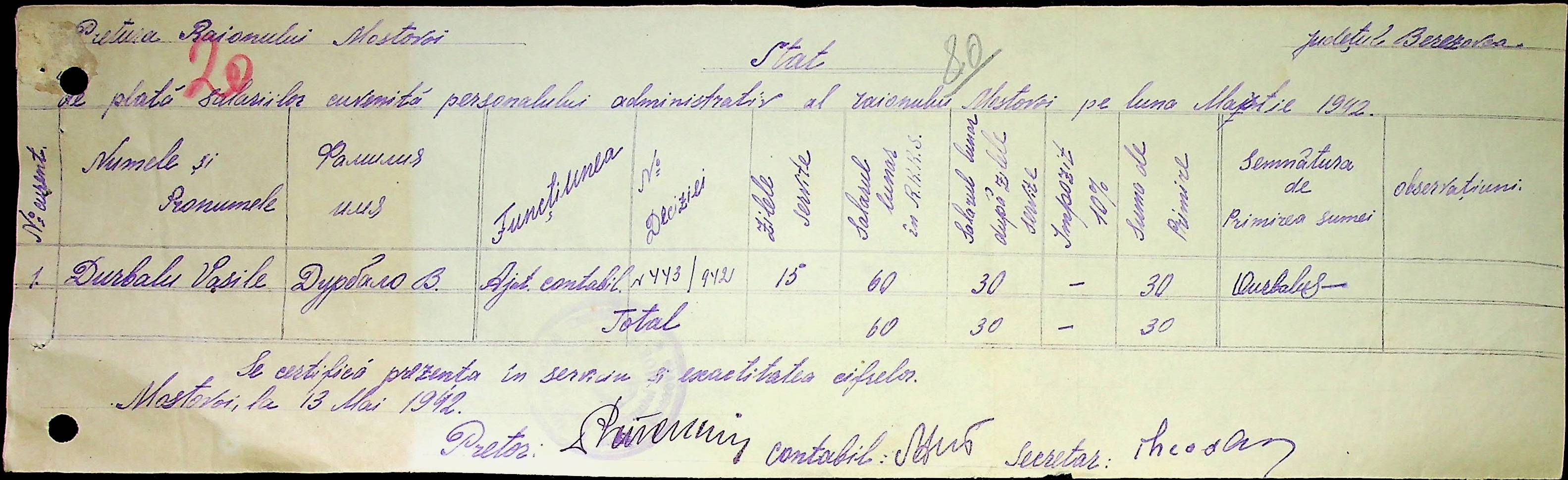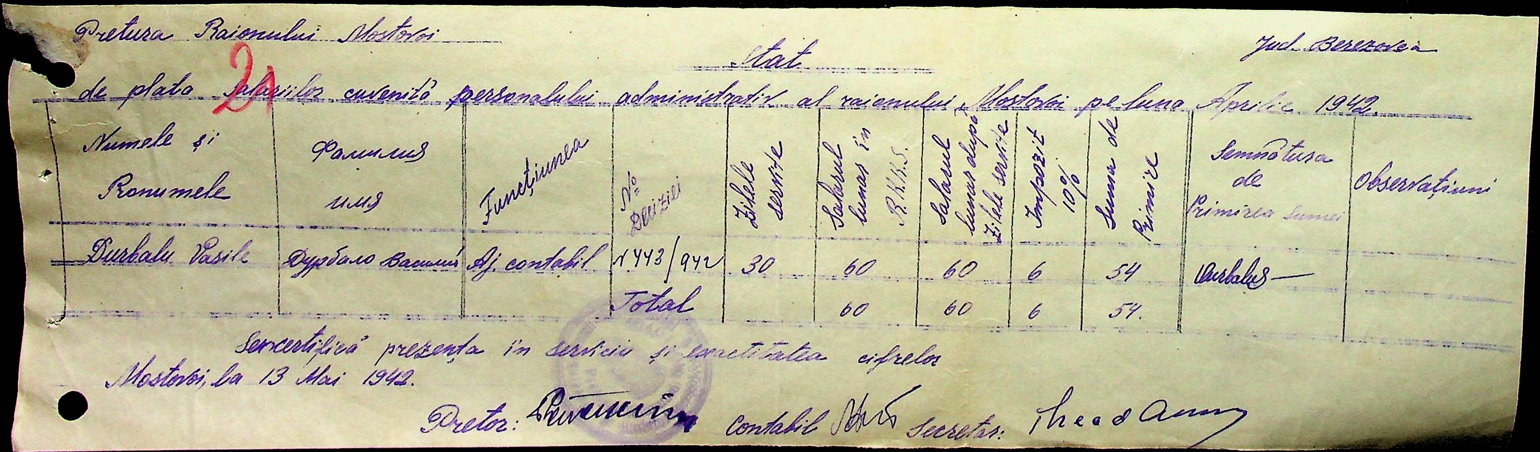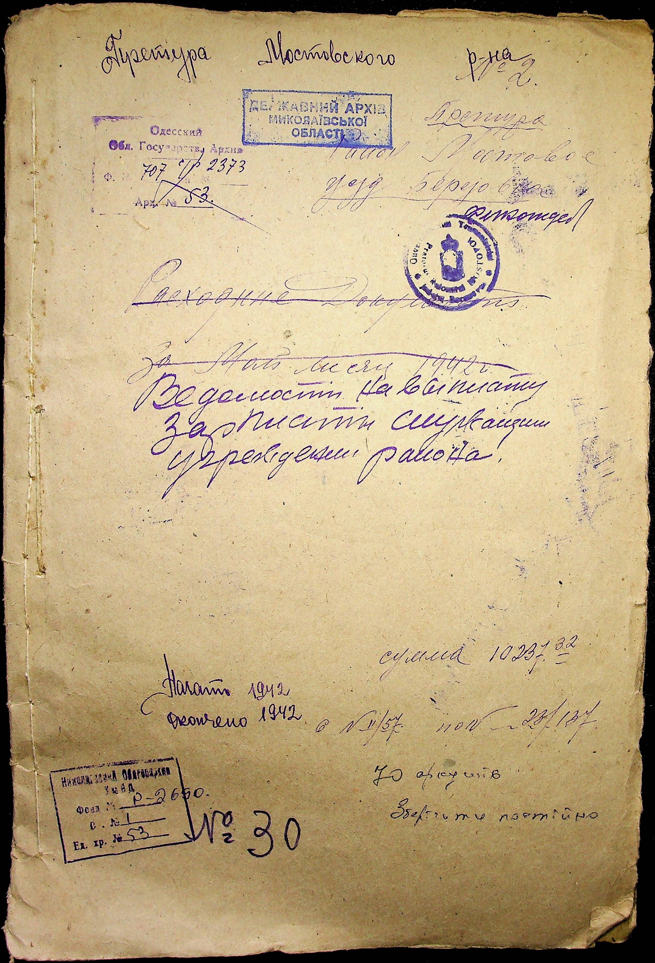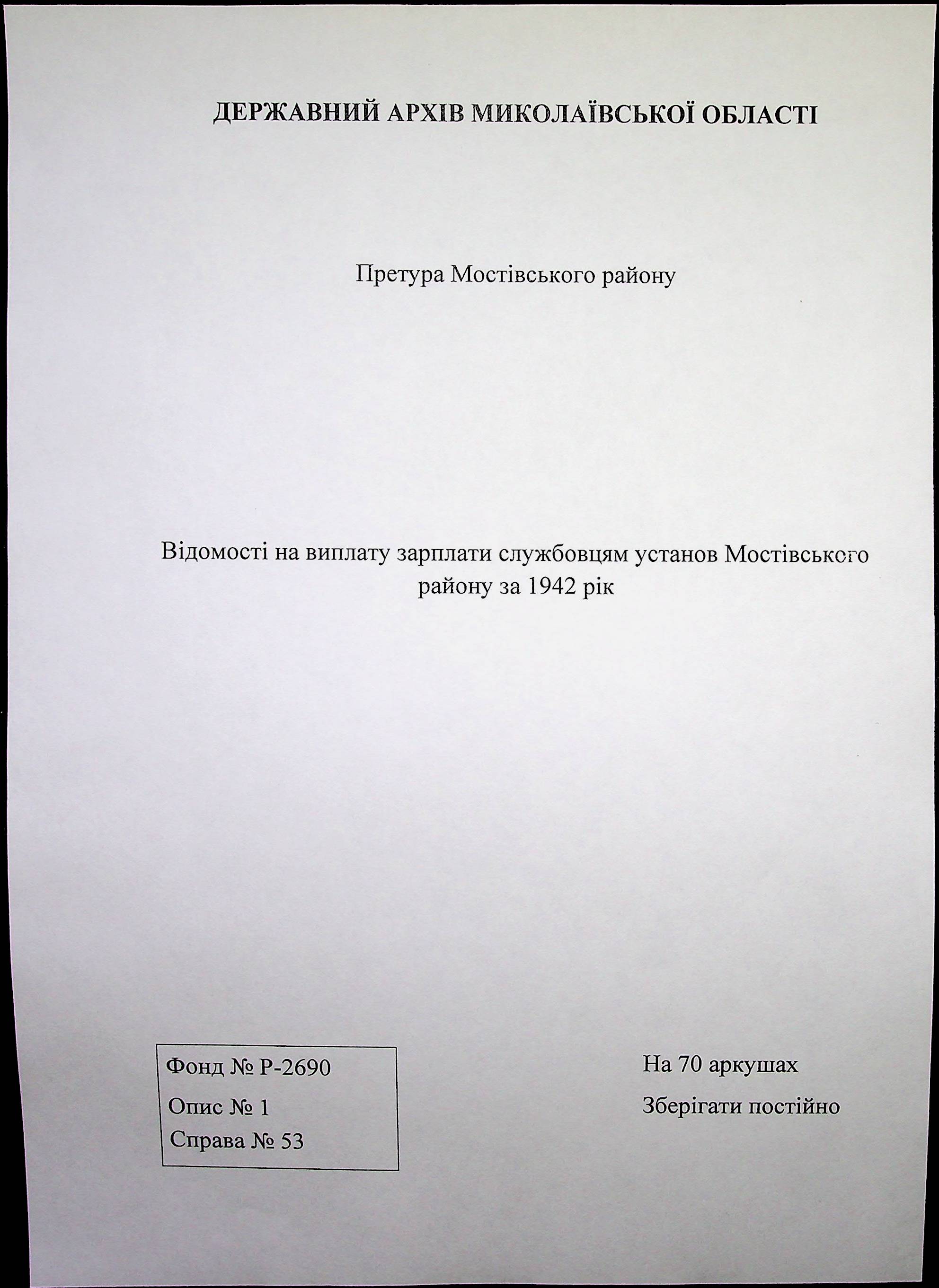 • • • • Справа № 53 Відомості на виплату зарплати службовцям установ Мостівського району за 1942 рік