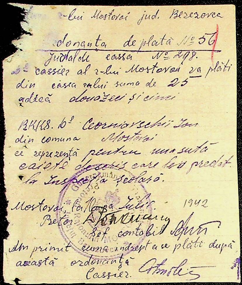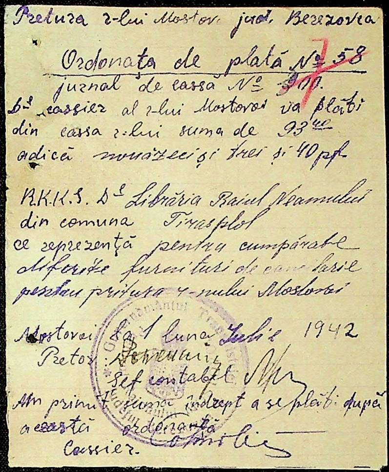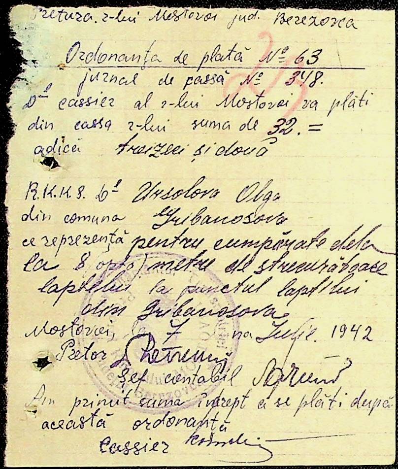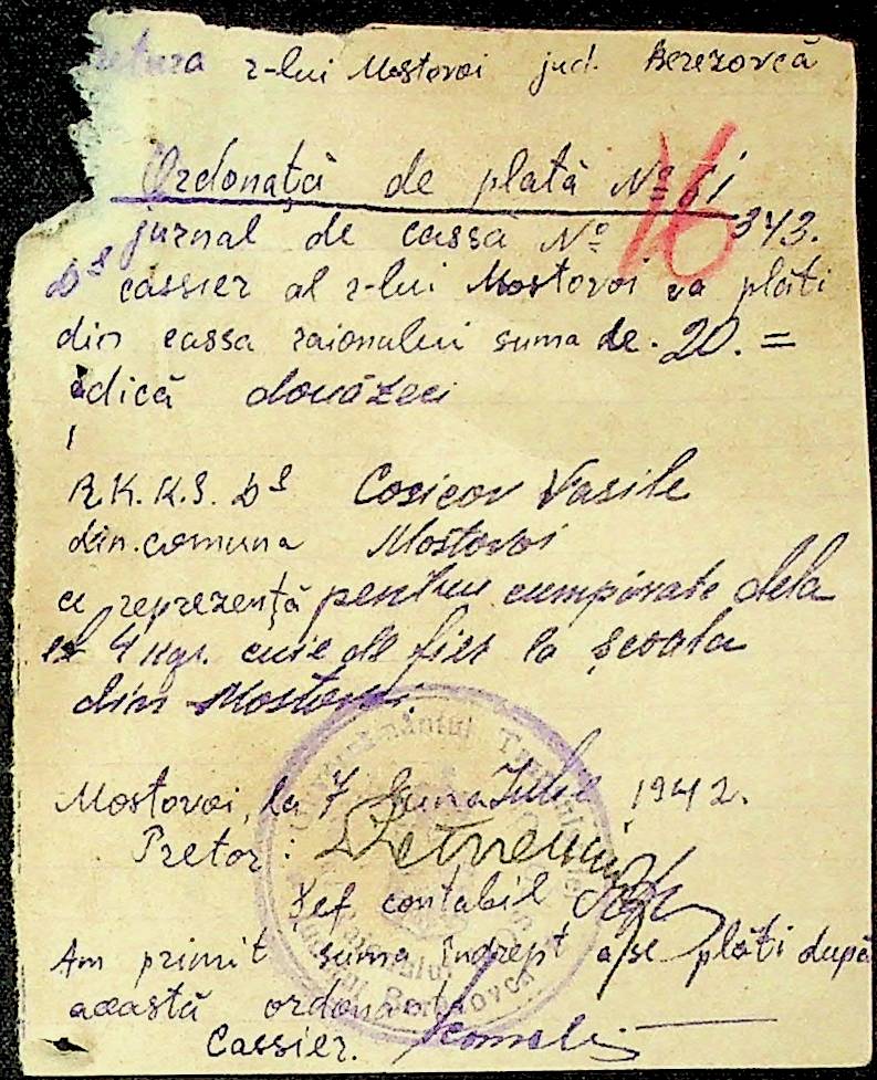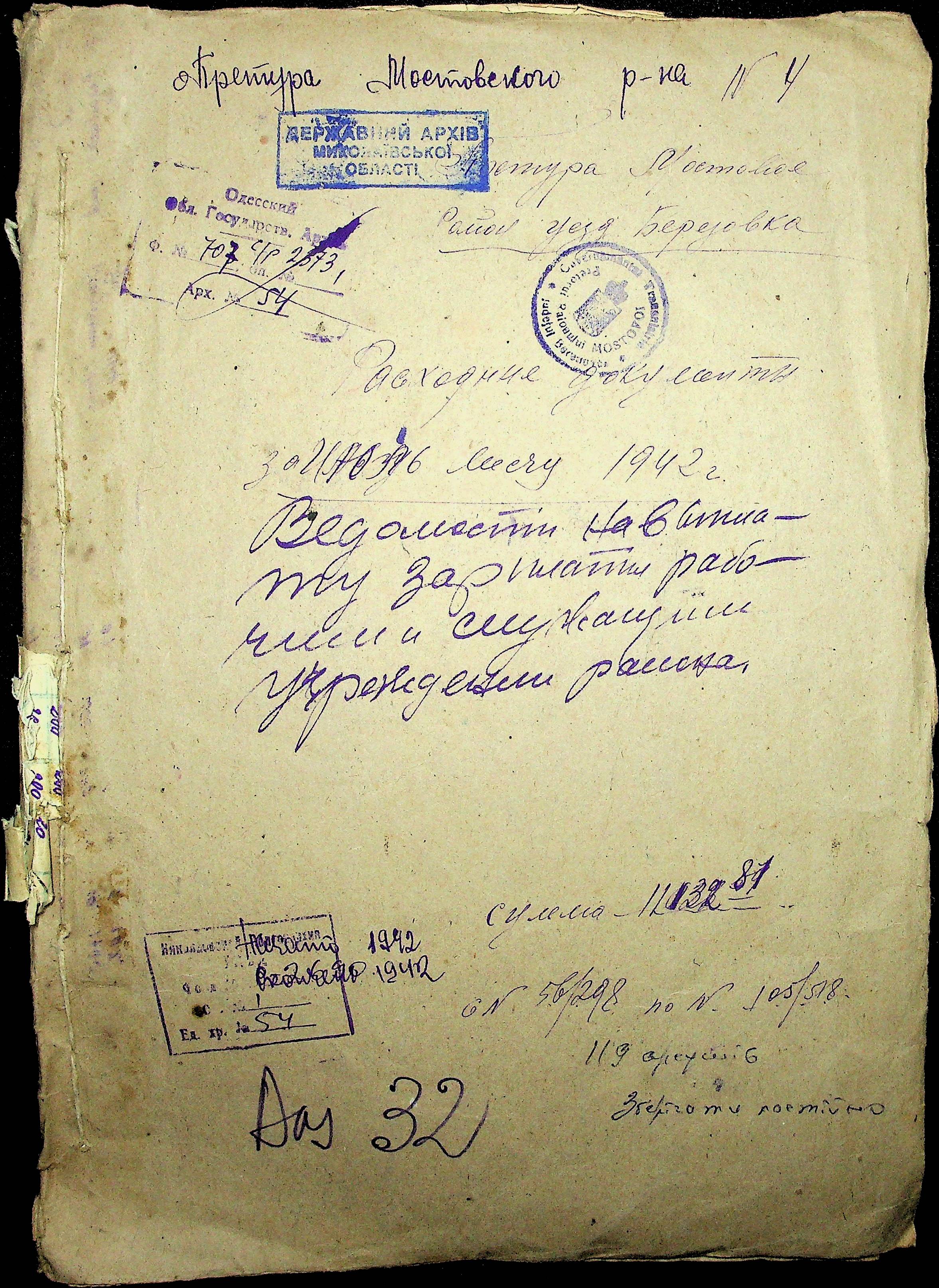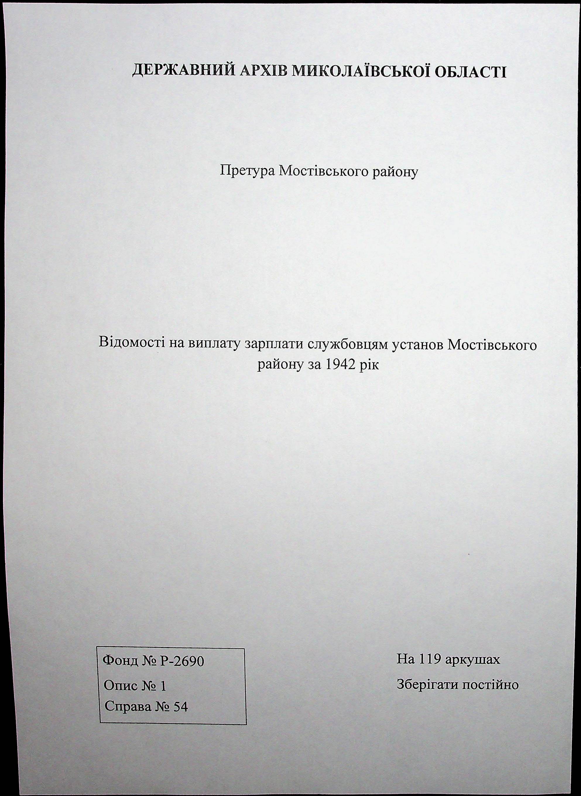 • • • • Справа № 54 Відомості на виплату зарплати службовцям установ Мостівського району за 1942 рік