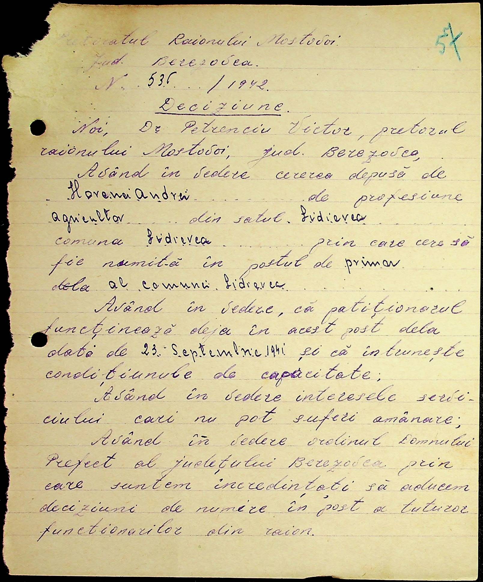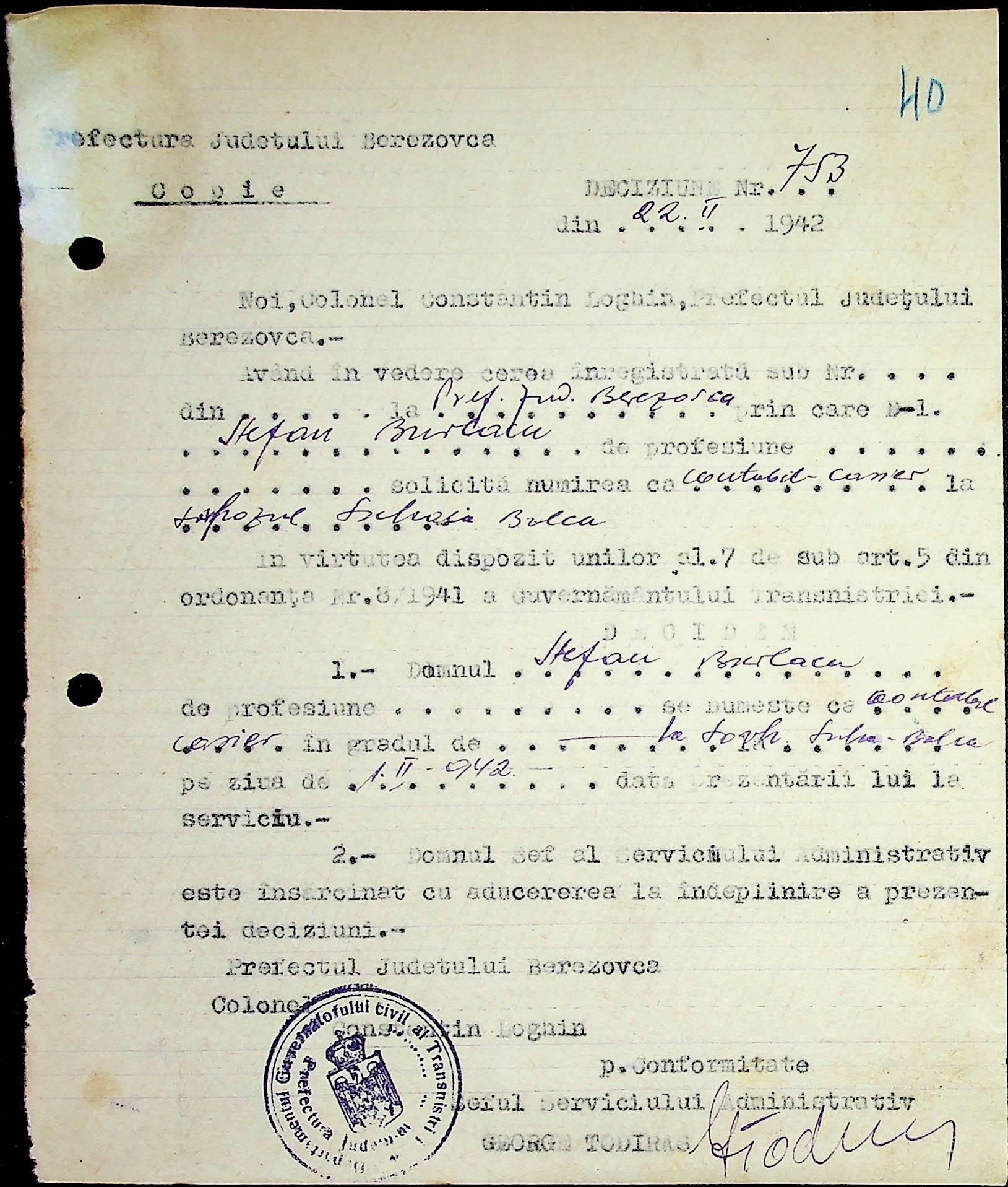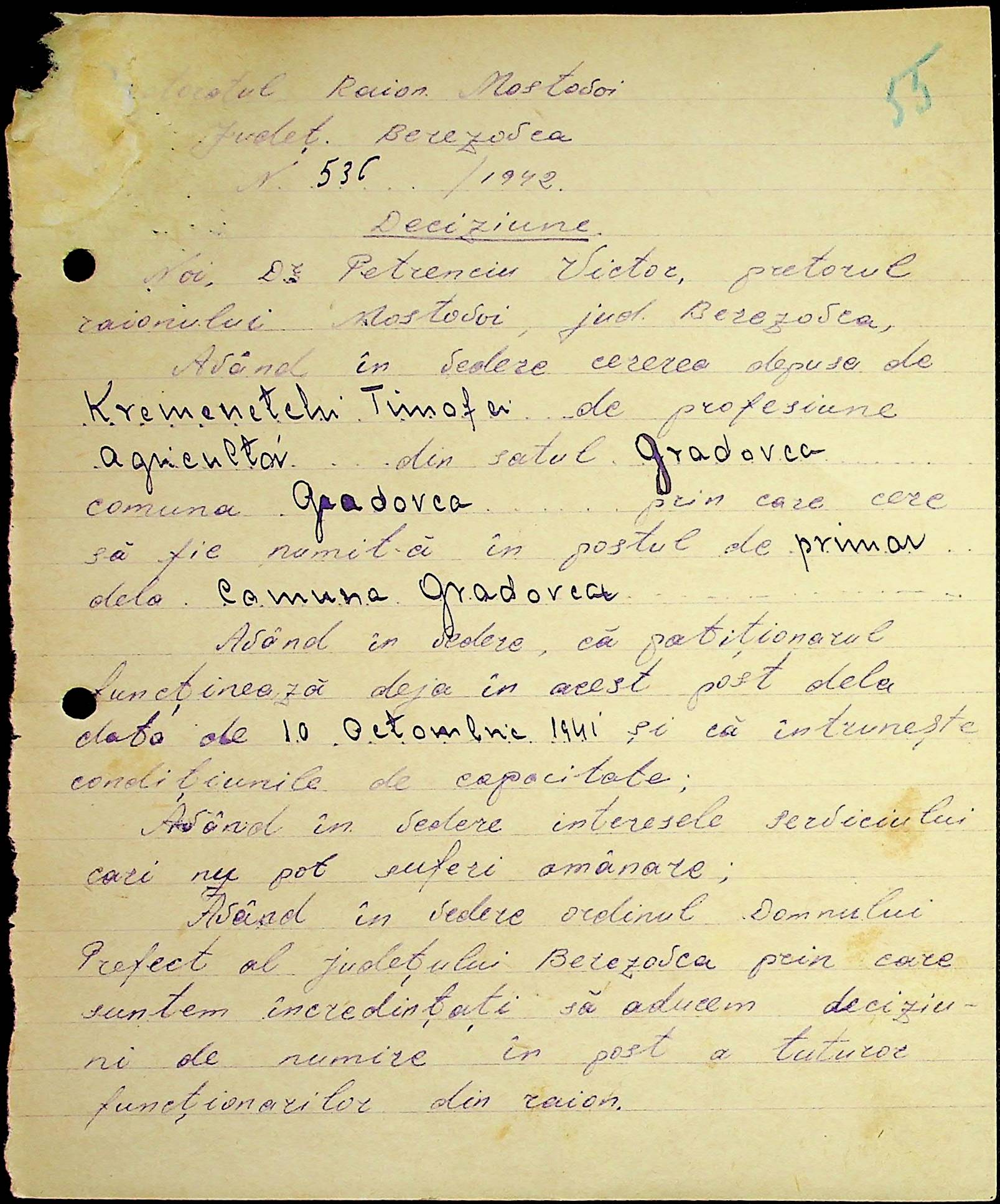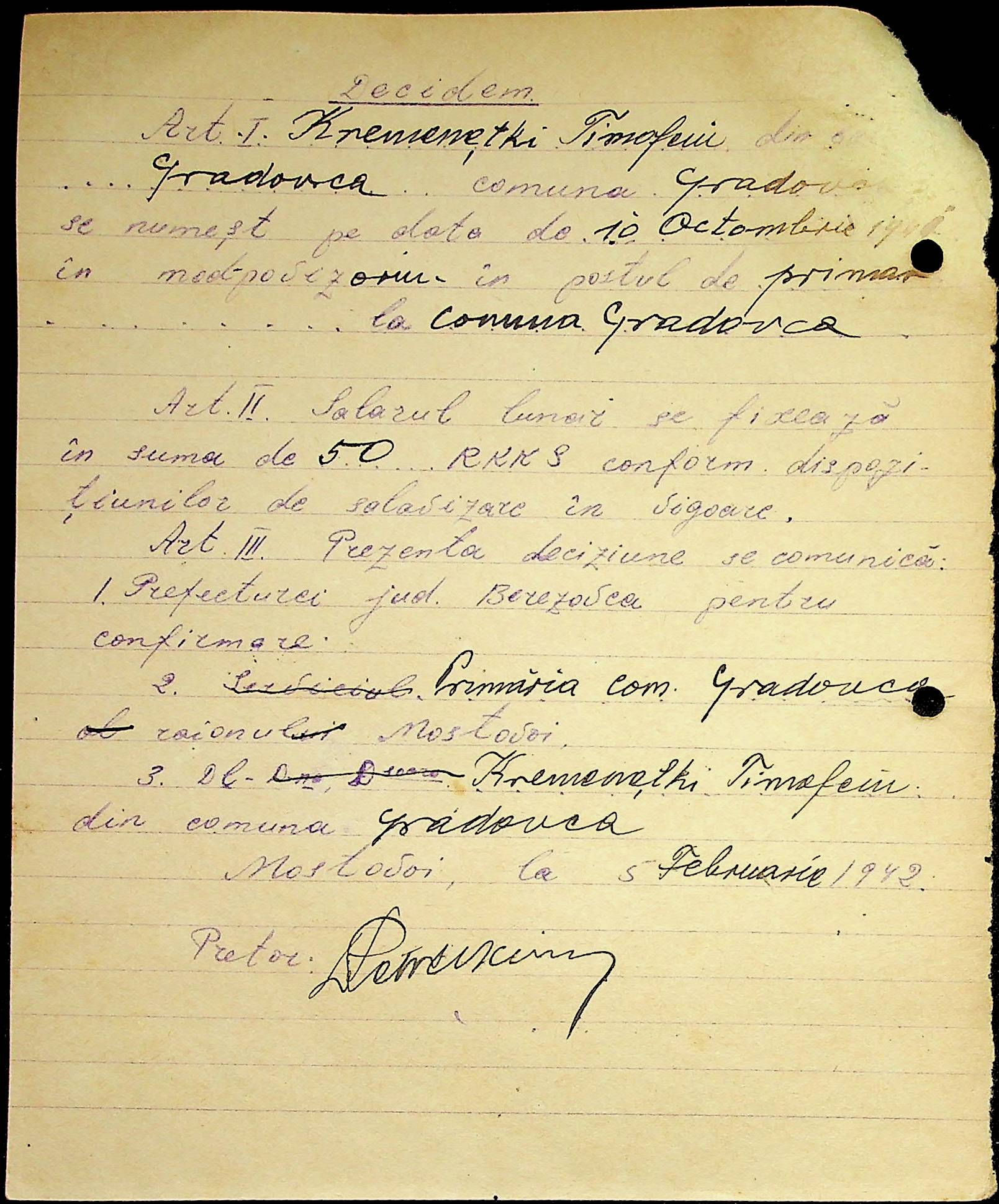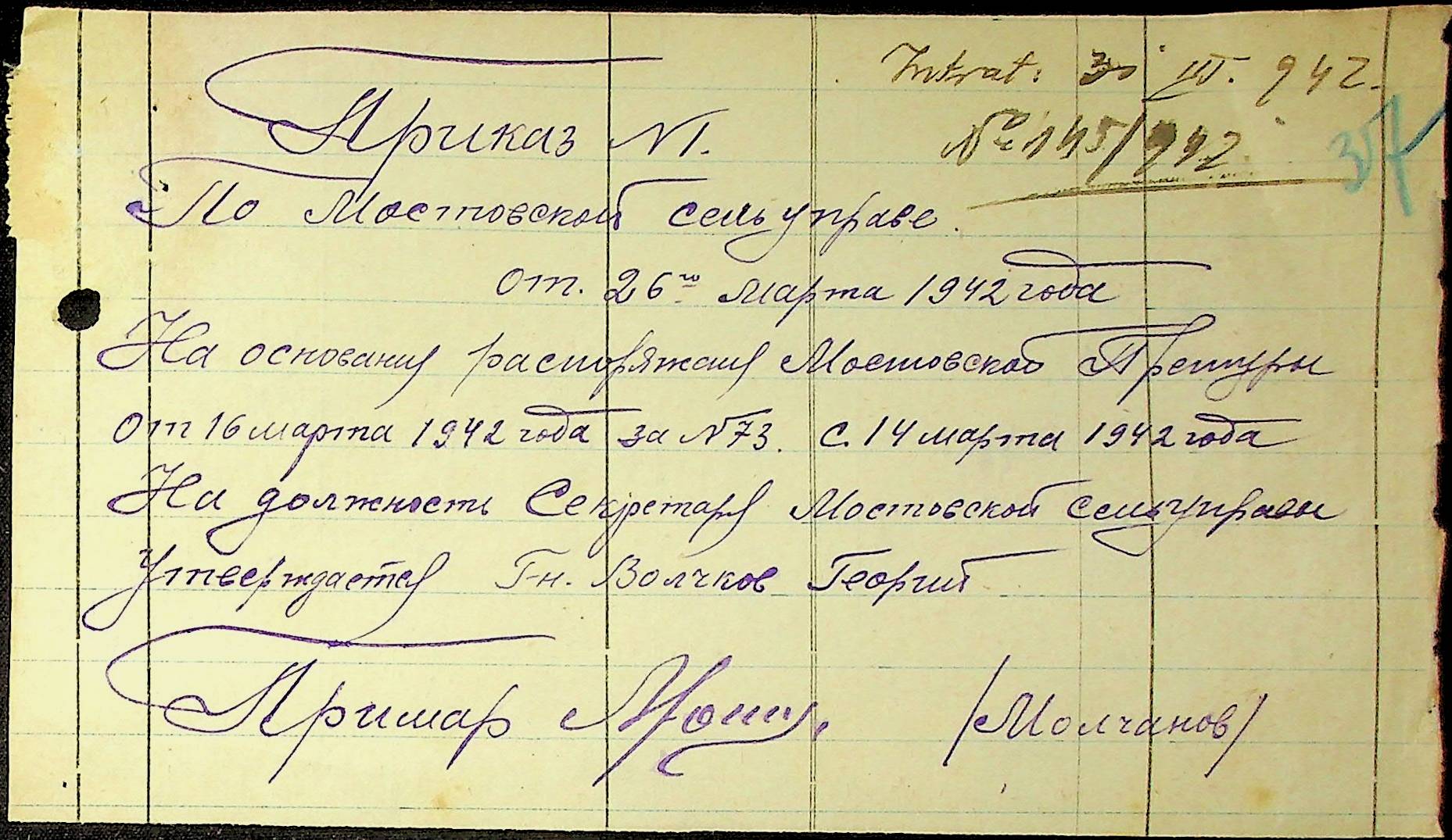 • • • • Справа № 89 Постанови Губернаторства про призначення на службу, звільнення з роботи чиновників установ. Списки примарій, працівників відділів претури, викладачів шкіл, робітників МТС за 1942 рік