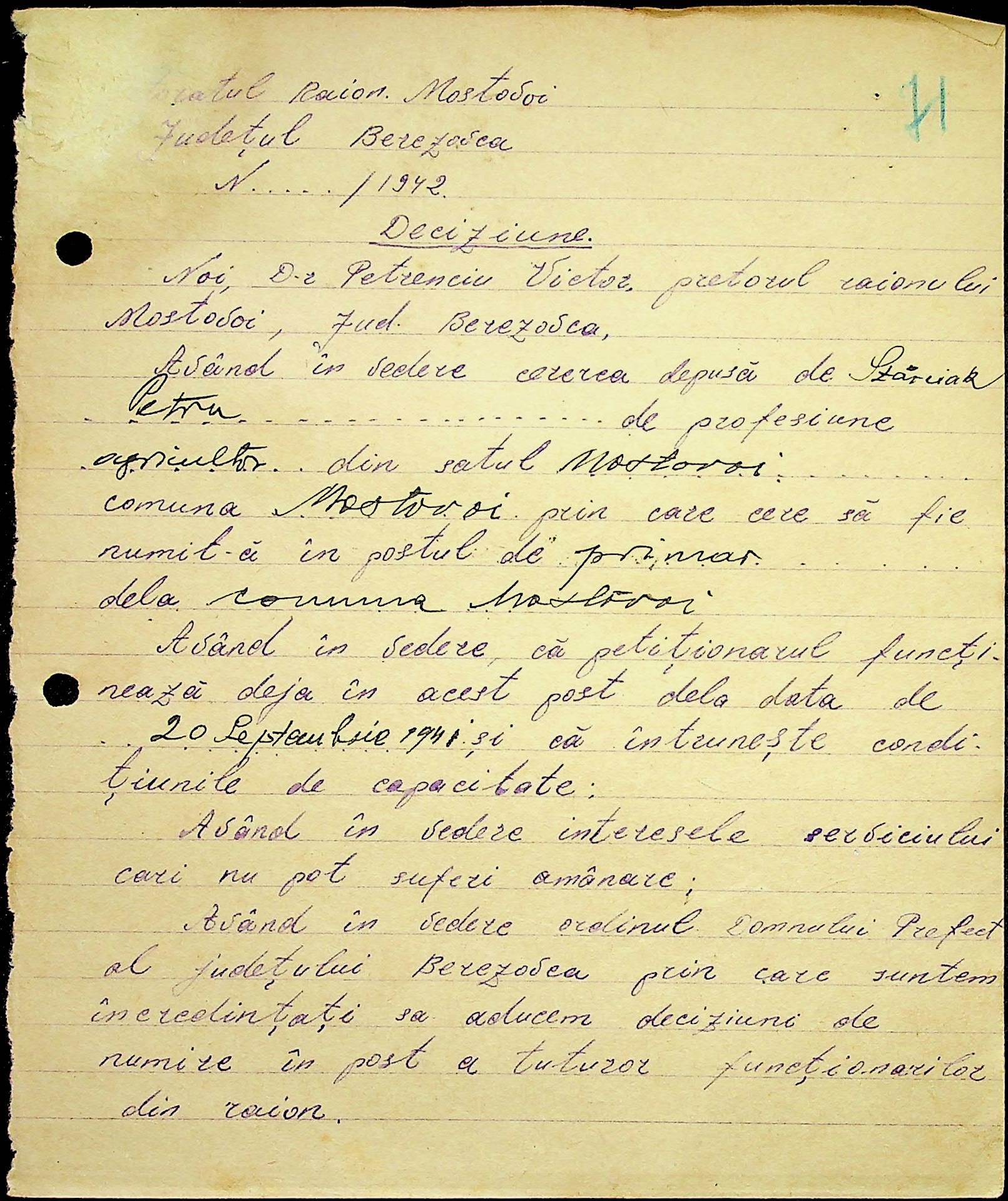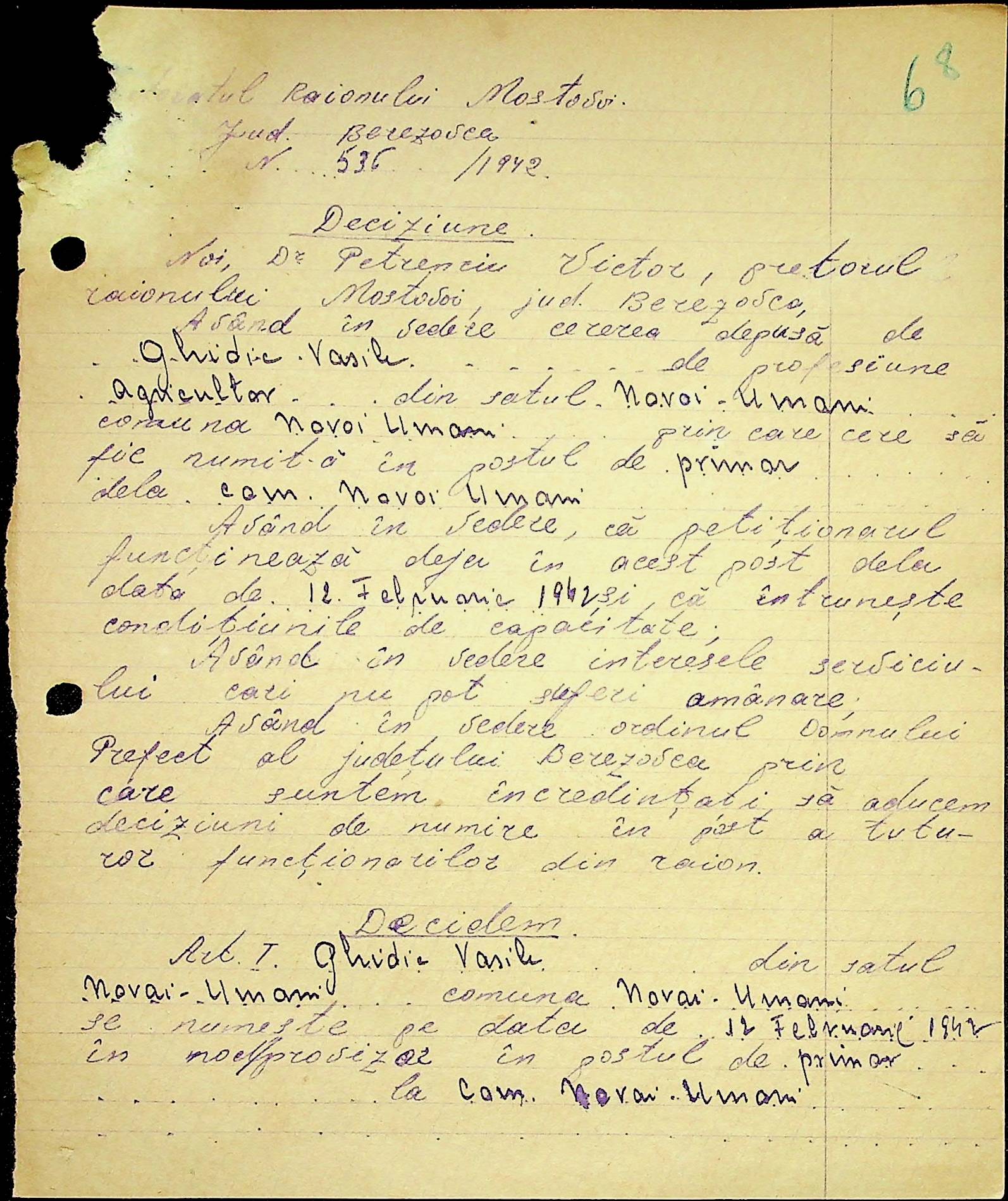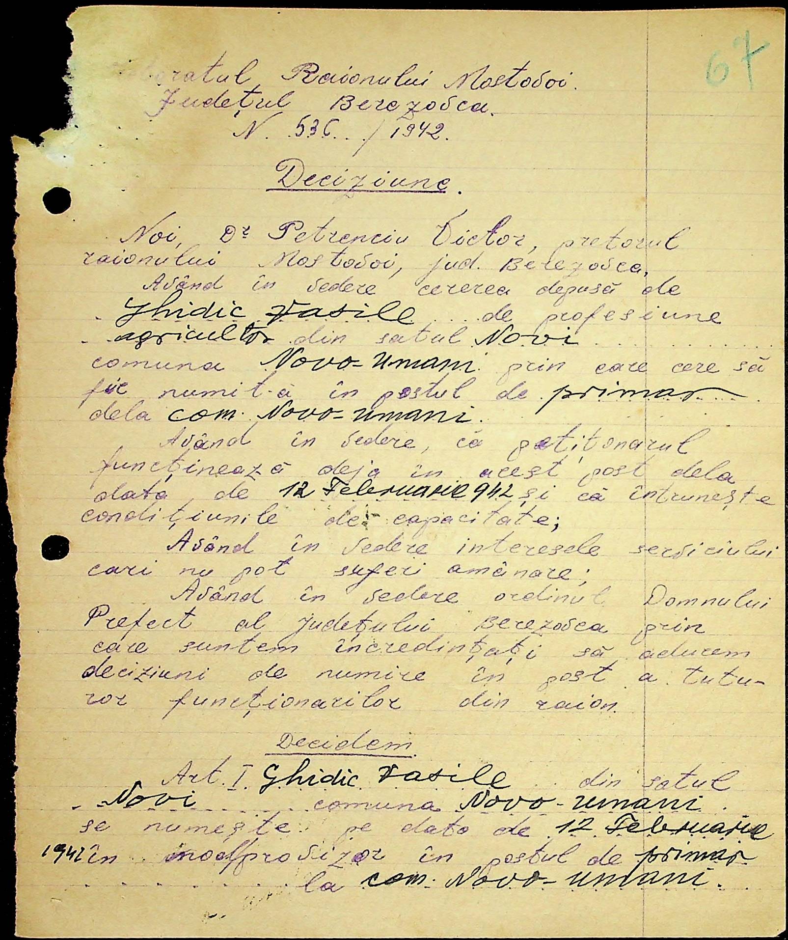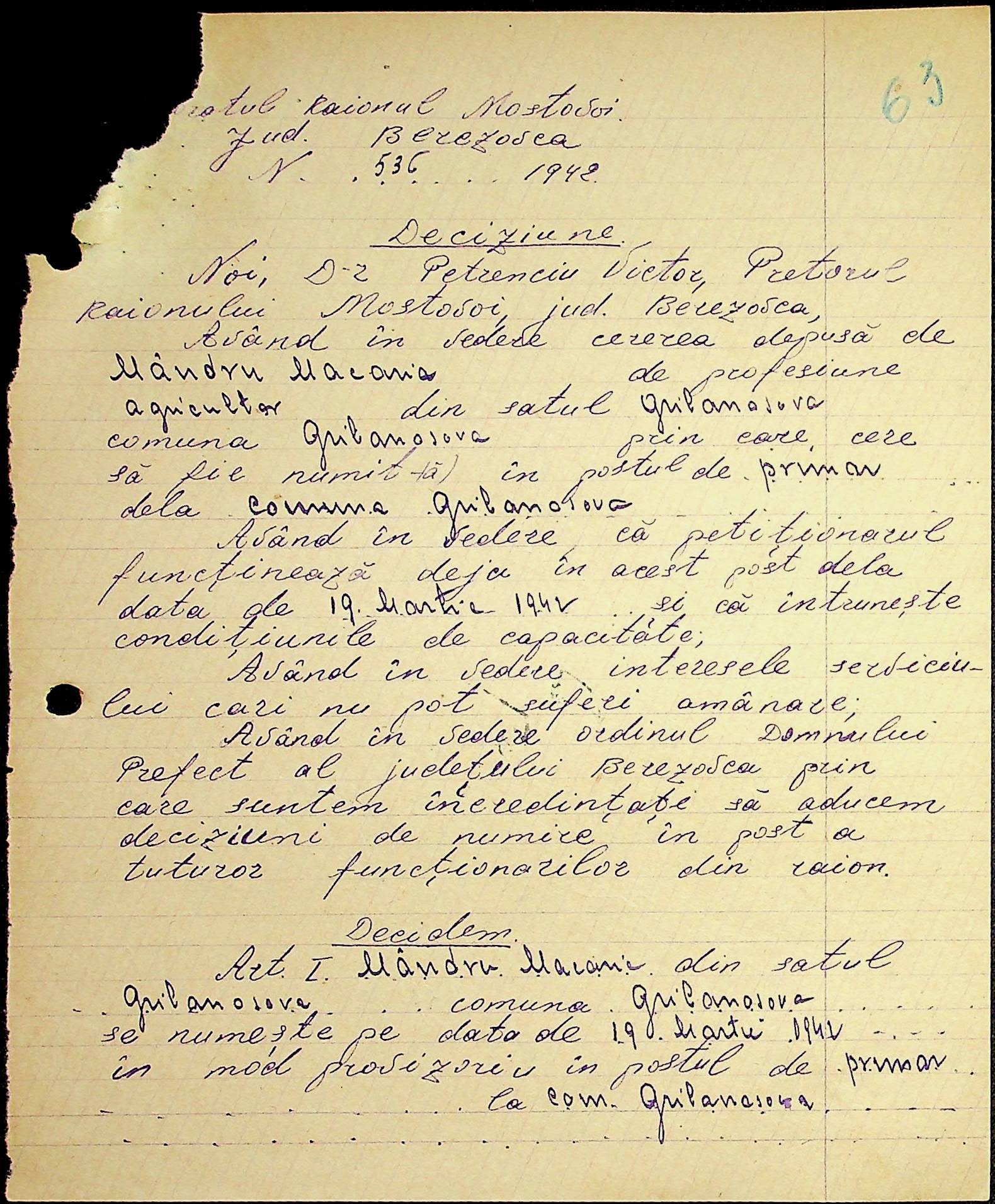 • • • • Справа № 89 Постанови Губернаторства про призначення на службу, звільнення з роботи чиновників установ. Списки примарій, працівників відділів претури, викладачів шкіл, робітників МТС за 1942 рік
