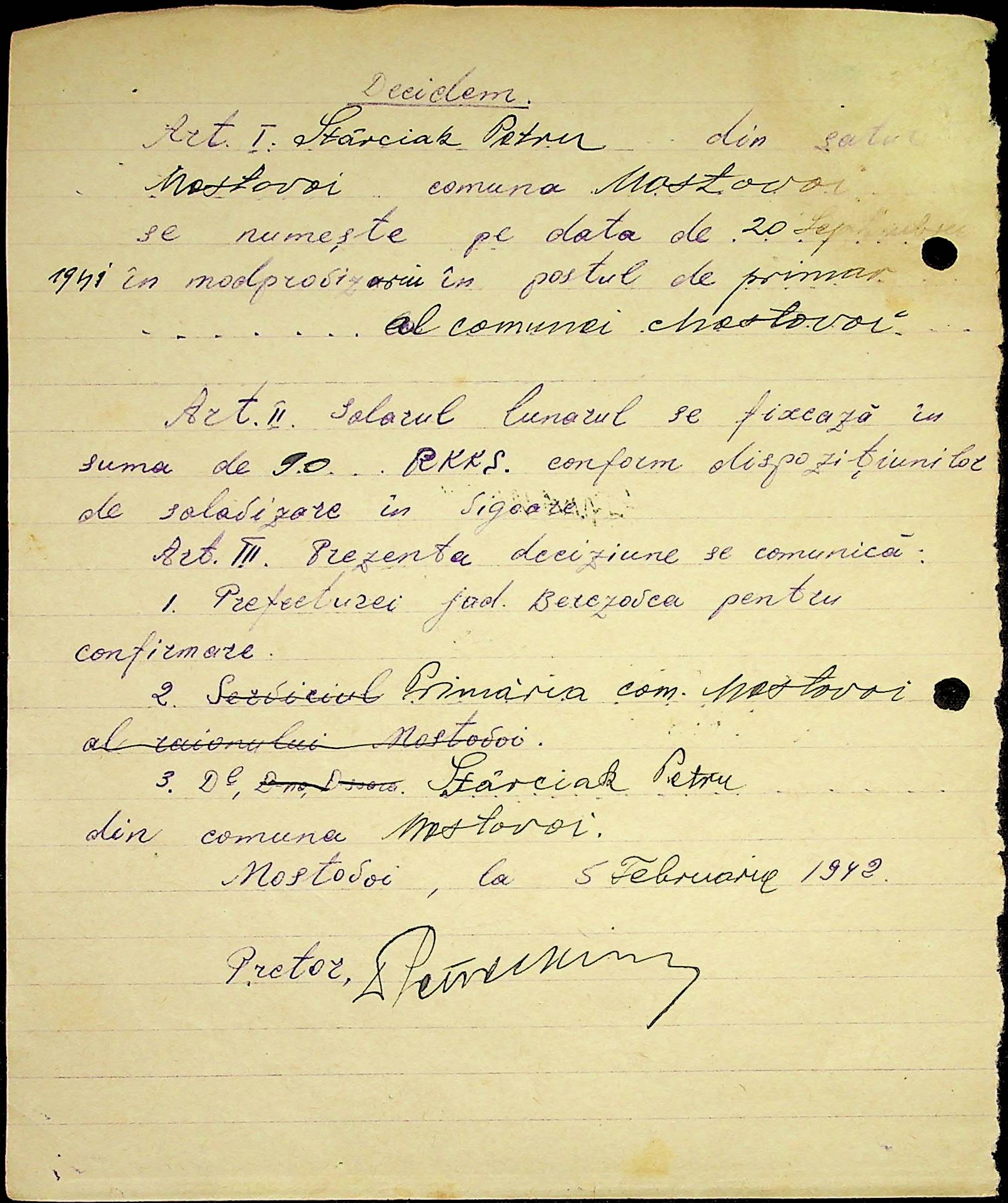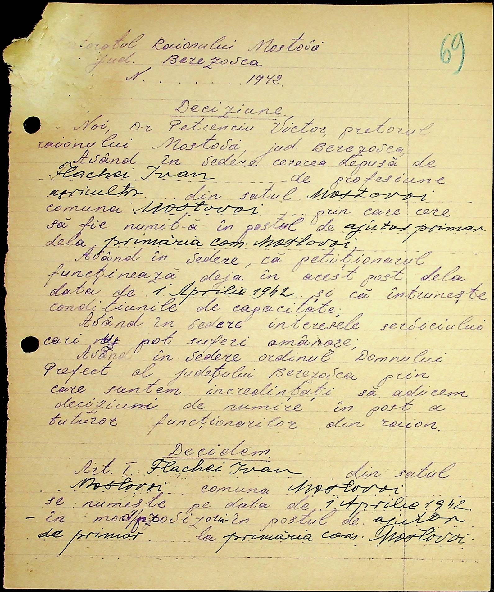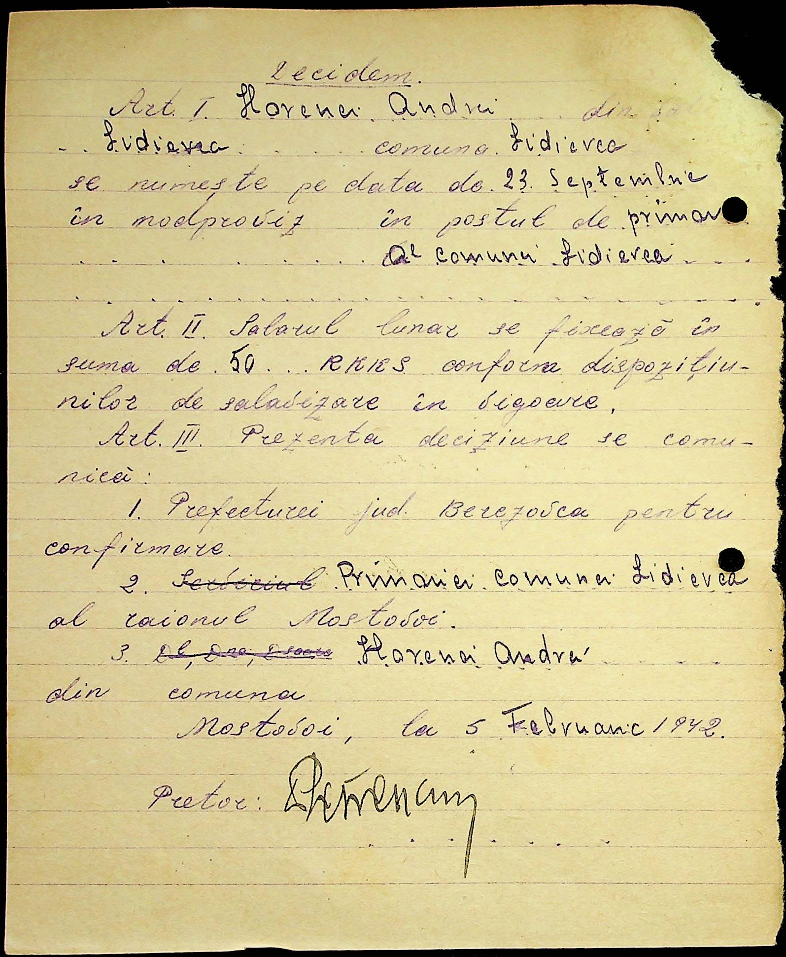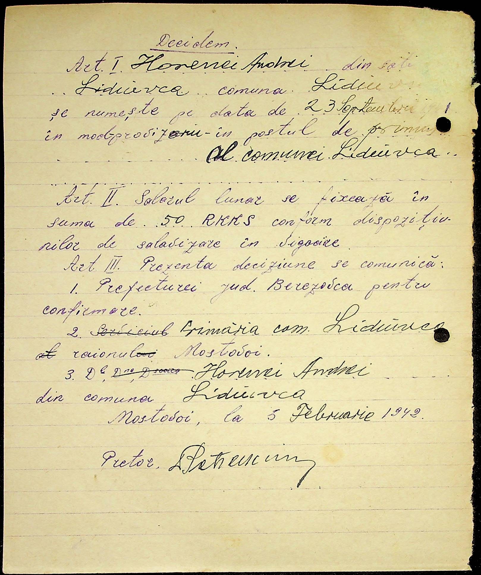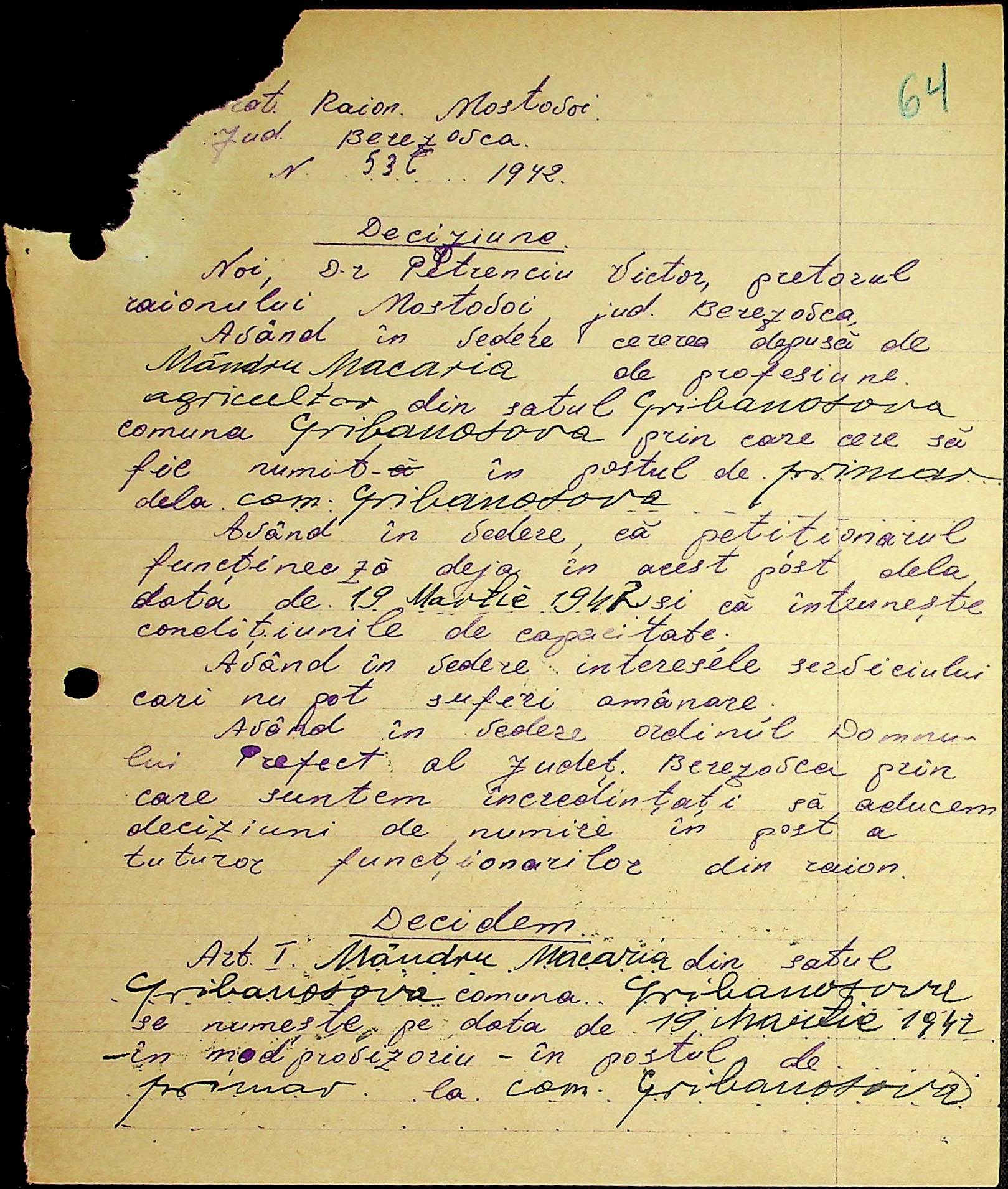 • • • • Справа № 89 Постанови Губернаторства про призначення на службу, звільнення з роботи чиновників установ. Списки примарій, працівників відділів претури, викладачів шкіл, робітників МТС за 1942 рік