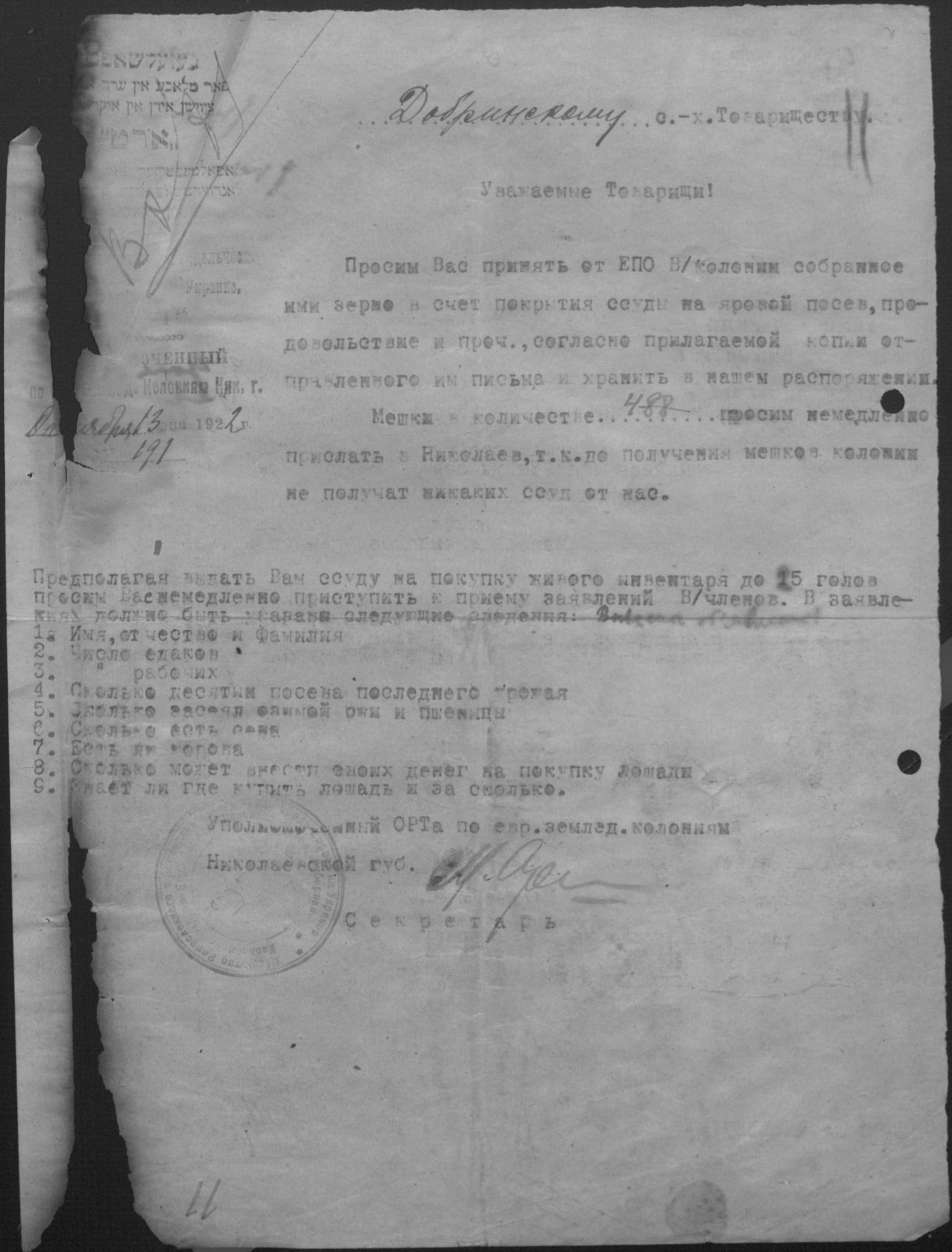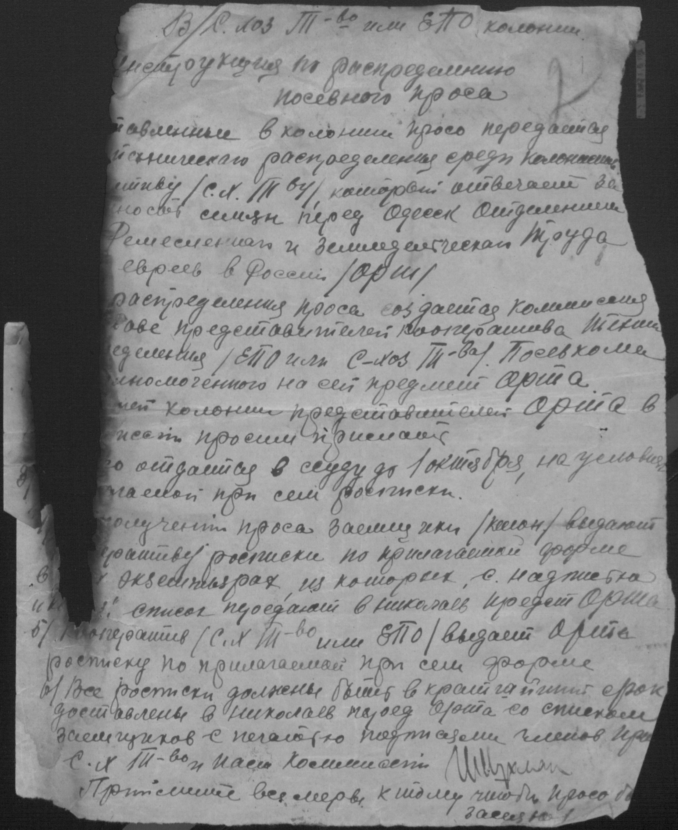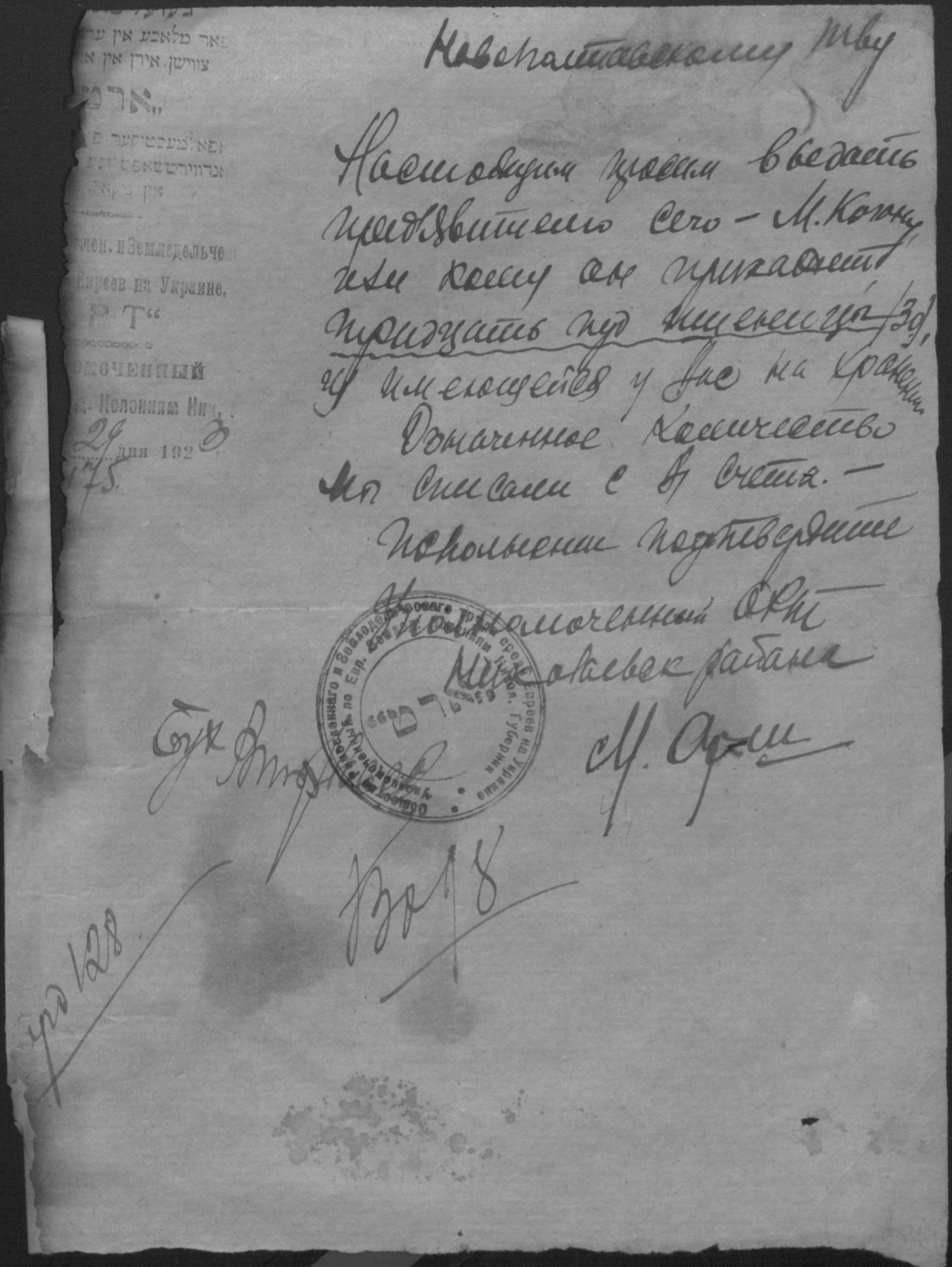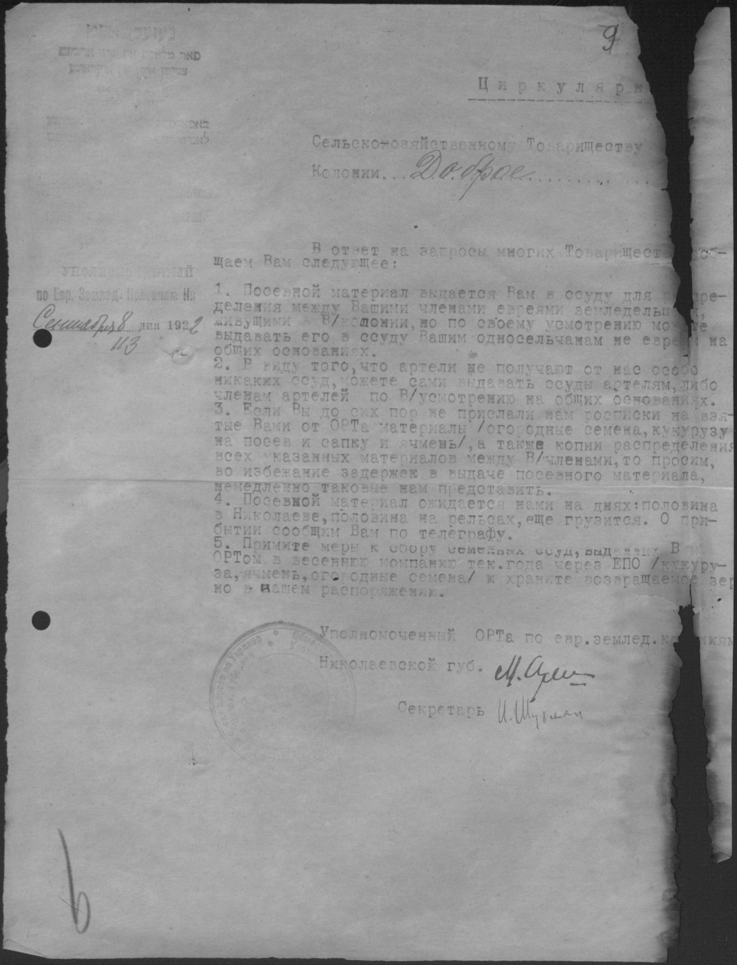 • • • • Справа № 2 “Листування з уповноваженим єврейських землеробських колоній Миколаївської губернії про розподіл інвентаря, насіннєвого фонду, придбання сільськогосподарських машин”