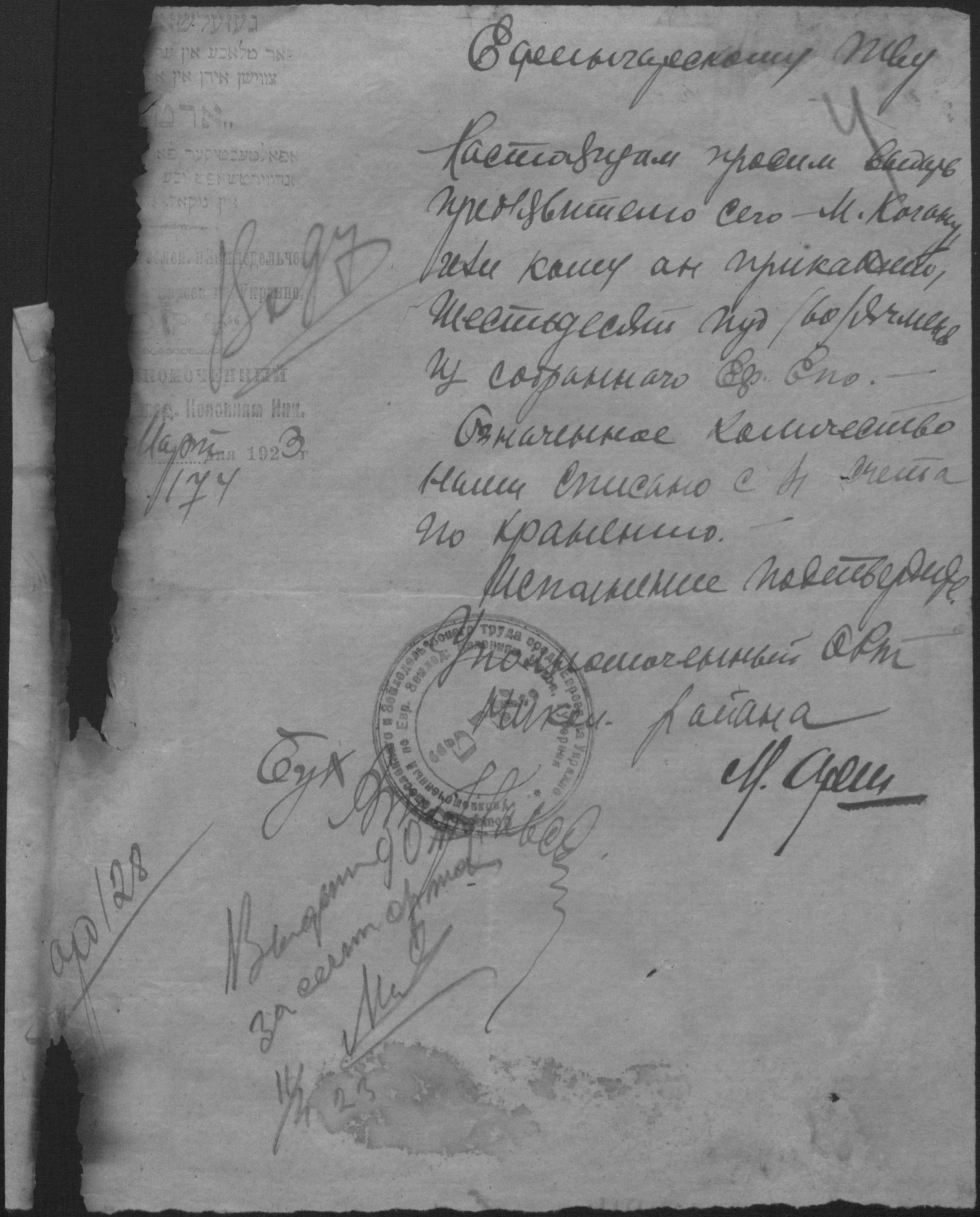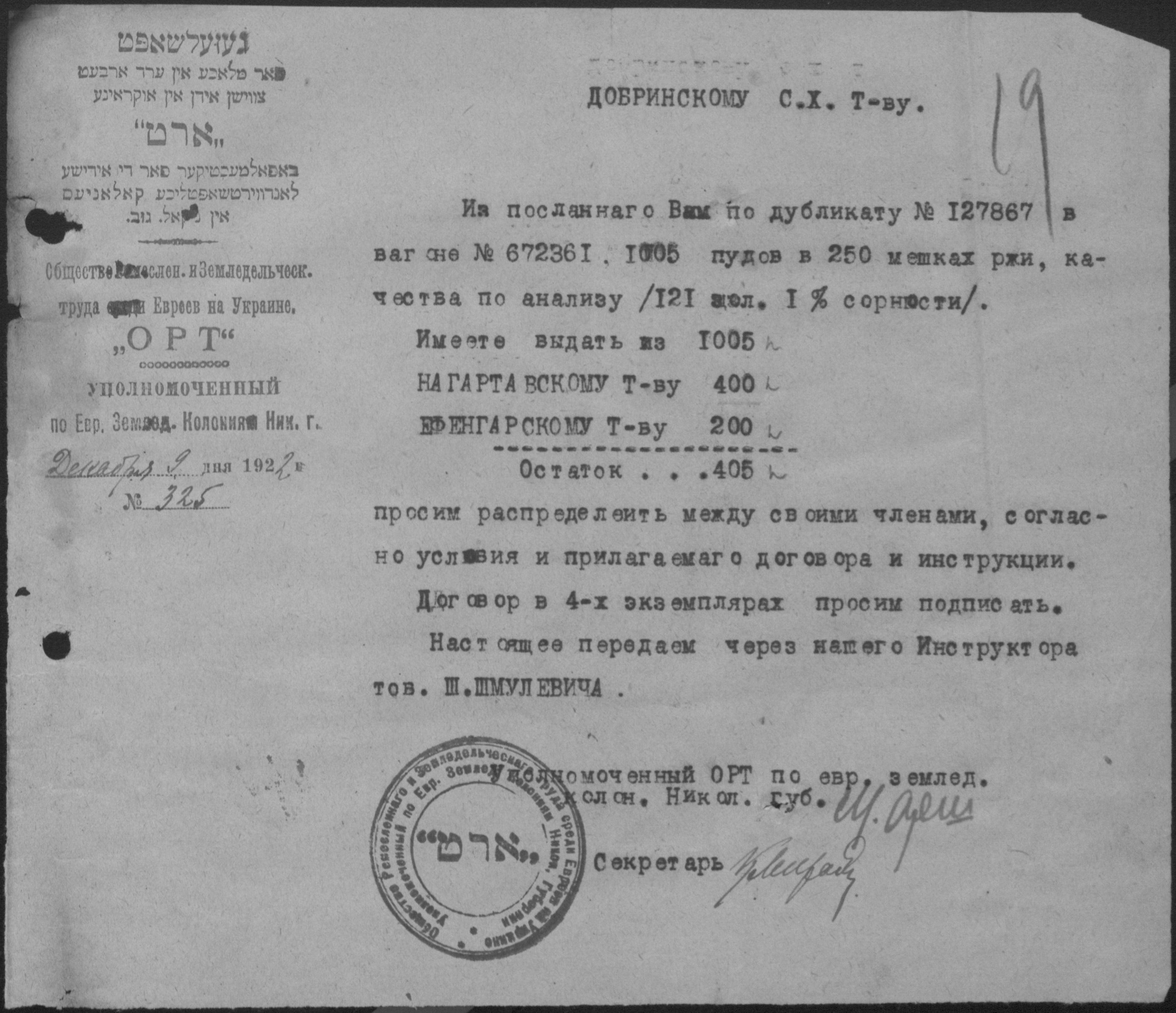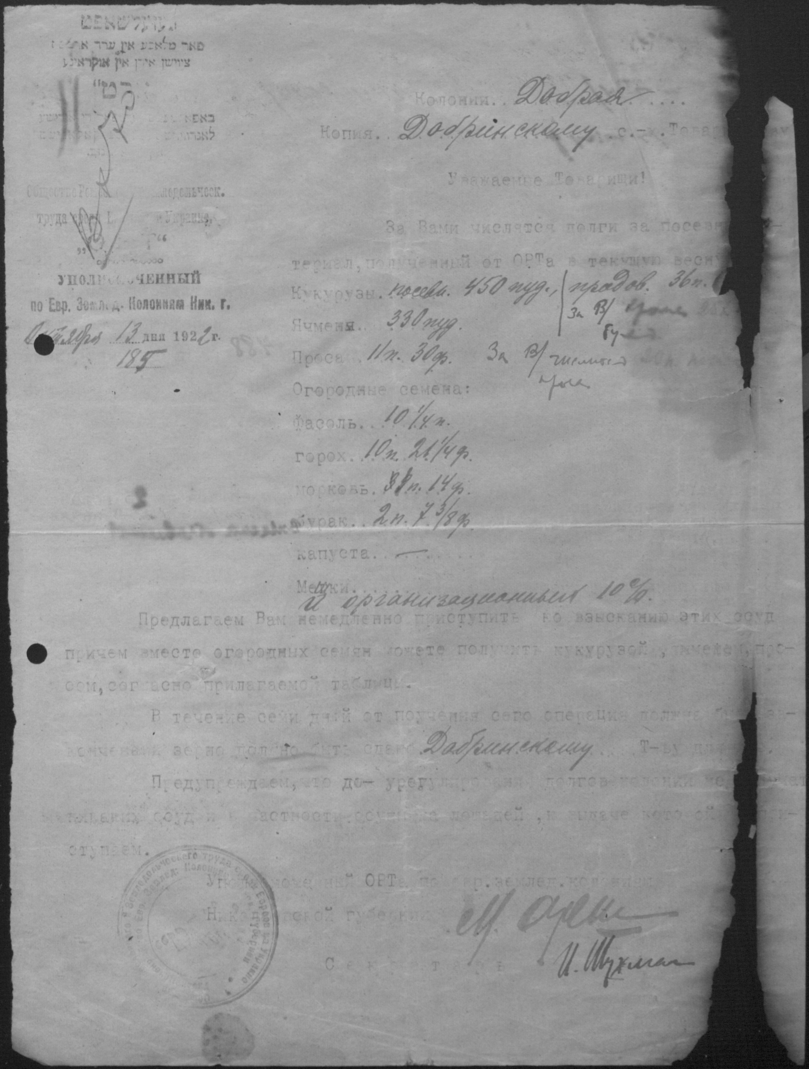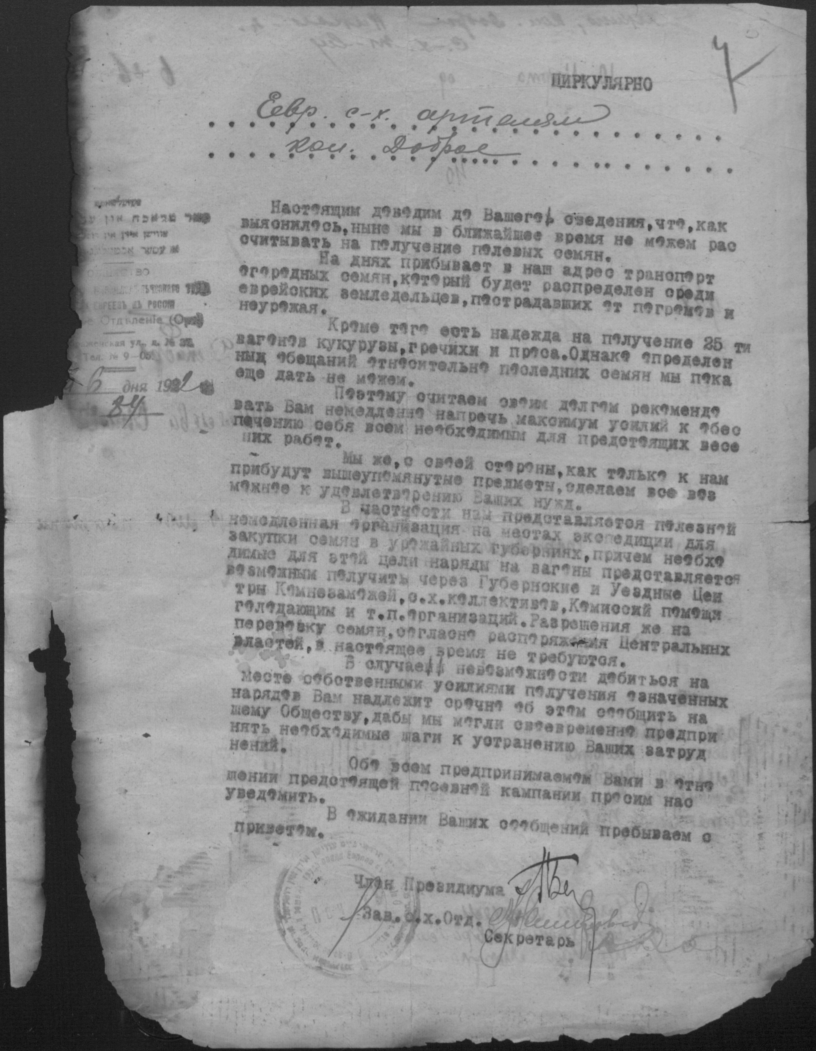 • • • • Справа № 2 “Листування з уповноваженим єврейських землеробських колоній Миколаївської губернії про розподіл інвентаря, насіннєвого фонду, придбання сільськогосподарських машин”