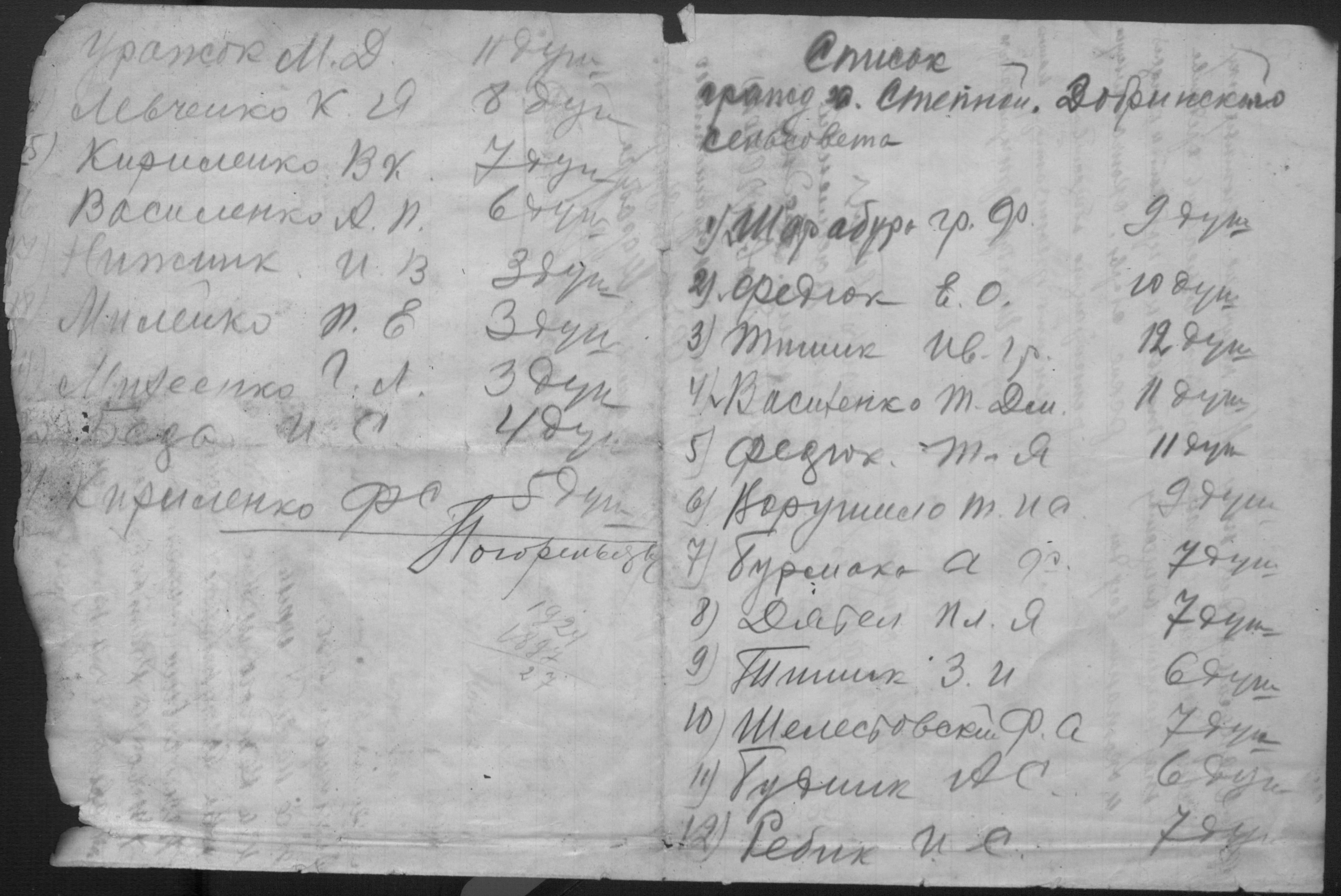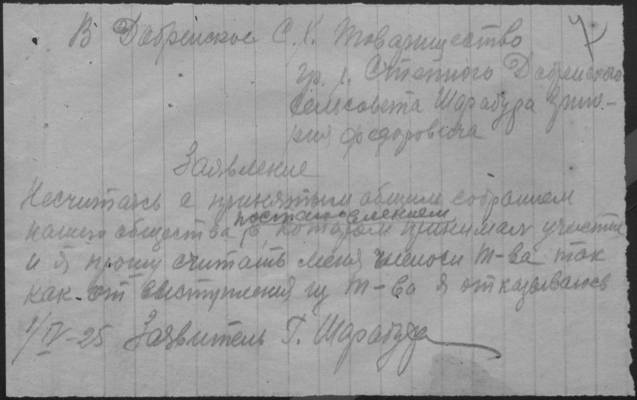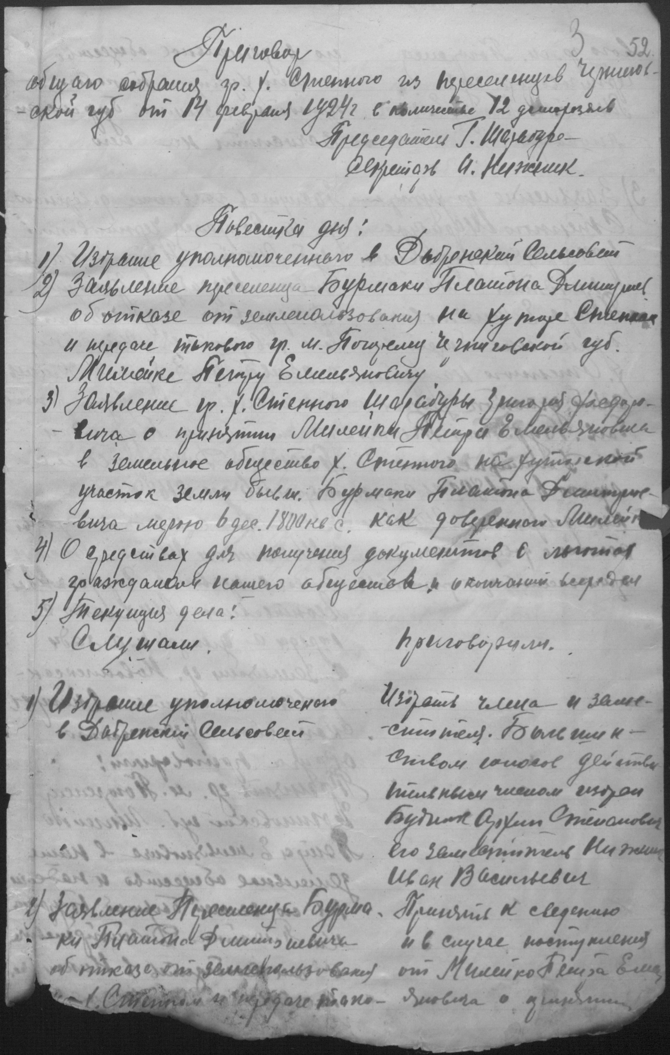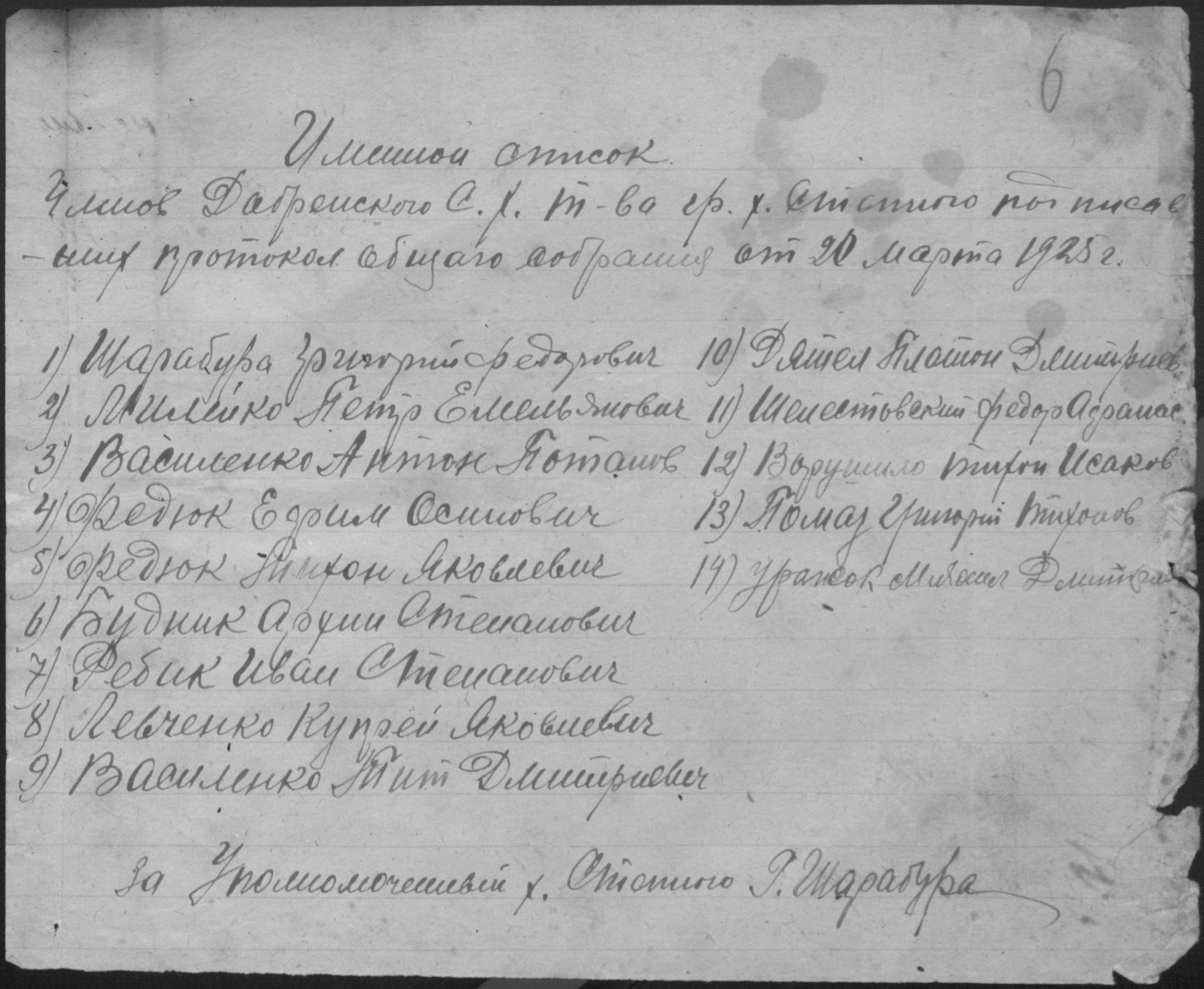 • • • • Справа № 10 “Рішення загальних зборів громадян хутора Степного Добренської сільради Миколаївського району про зарахування переселенців до товариства; список громадян хутора”