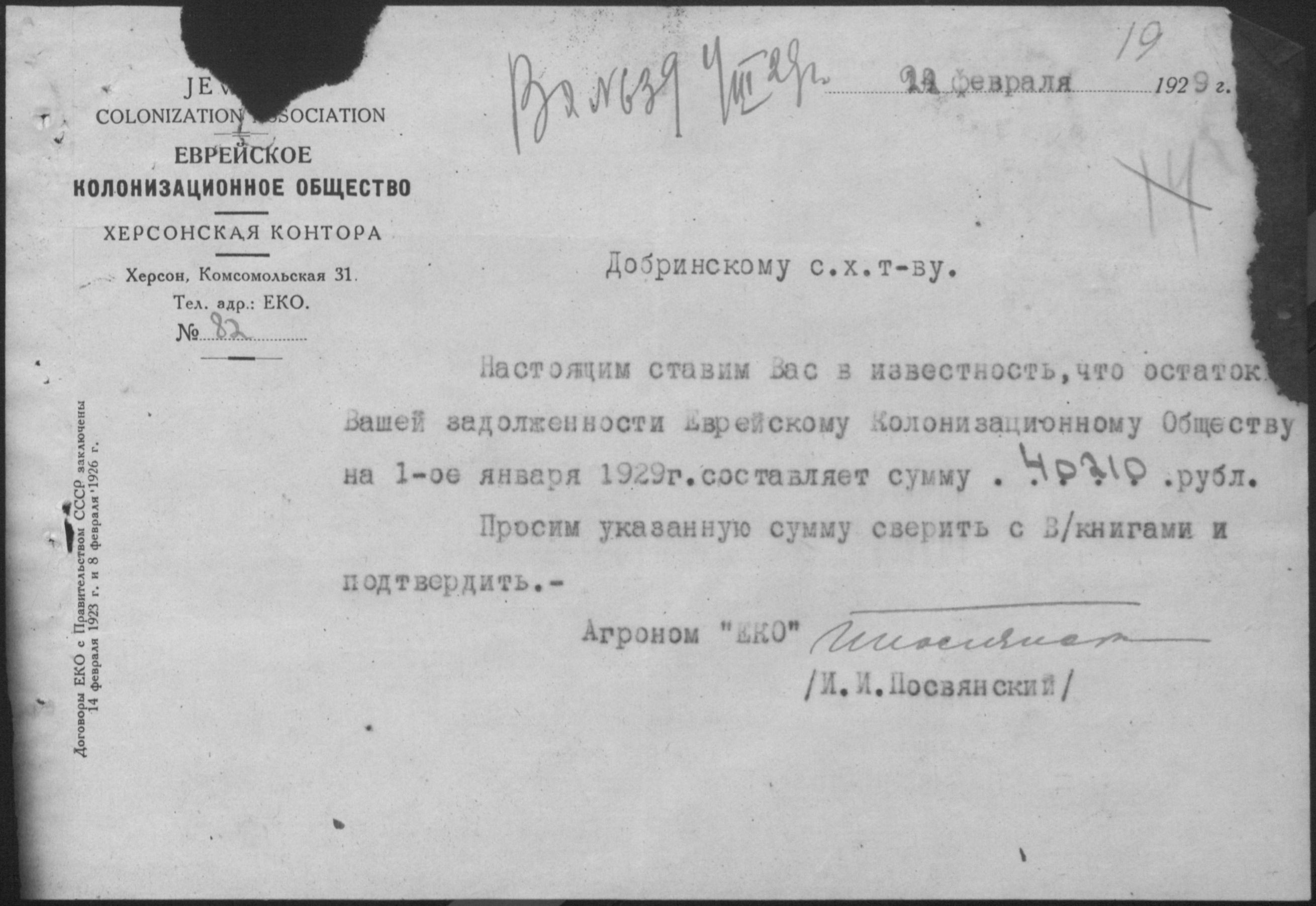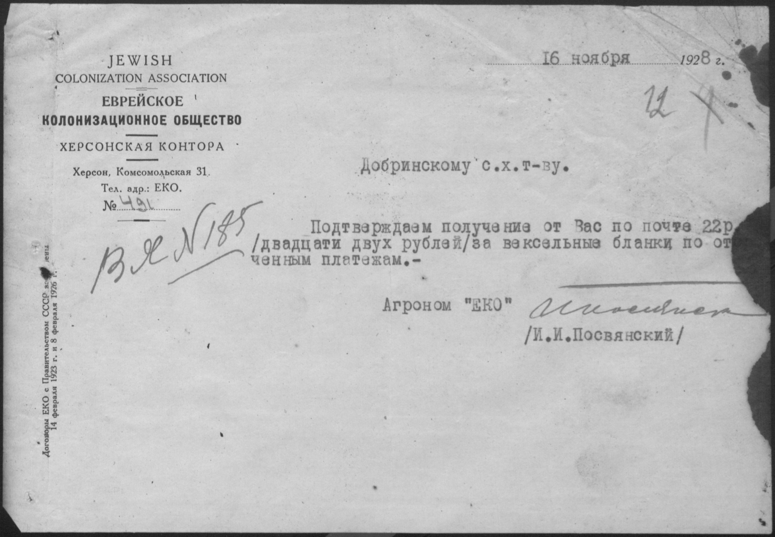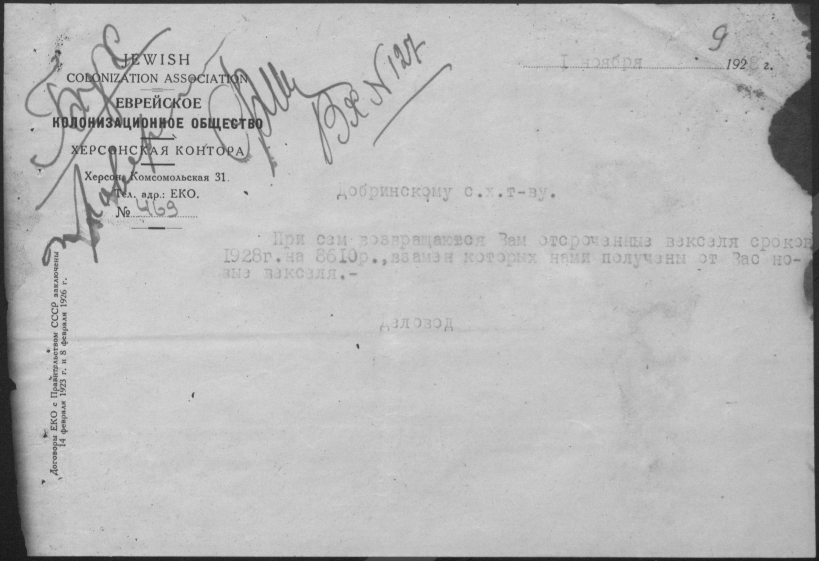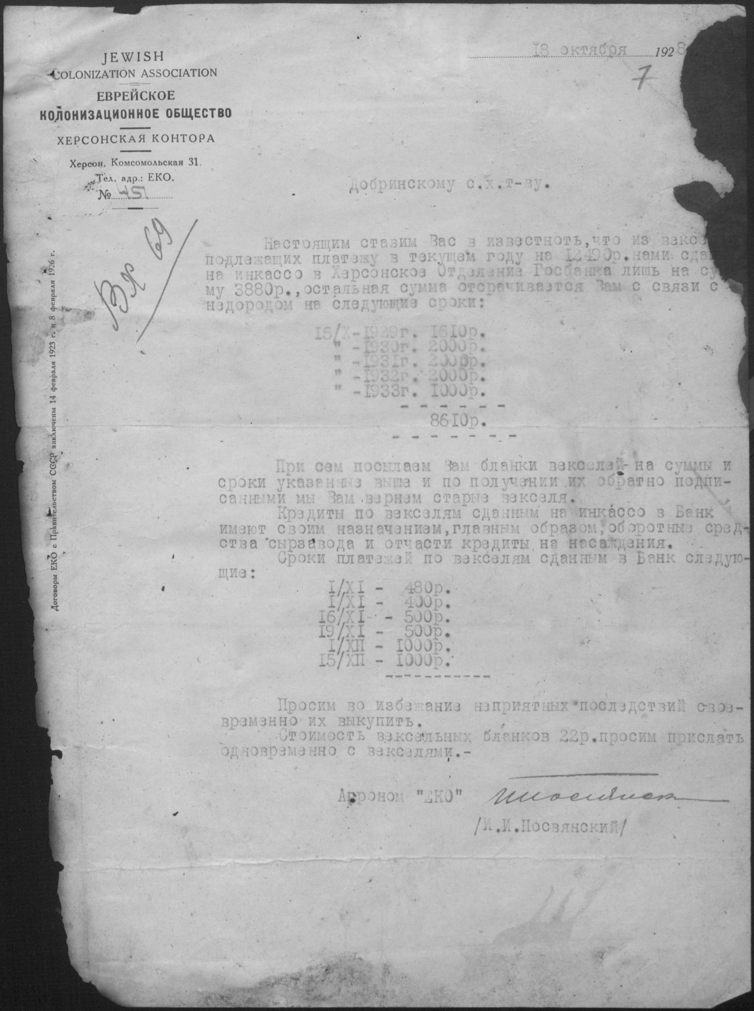 • • • • Справа № 11 “Листування з Херсонською конторою Єврейського колонізаційного товариства про видачу позичок і погашення заборгованостей”