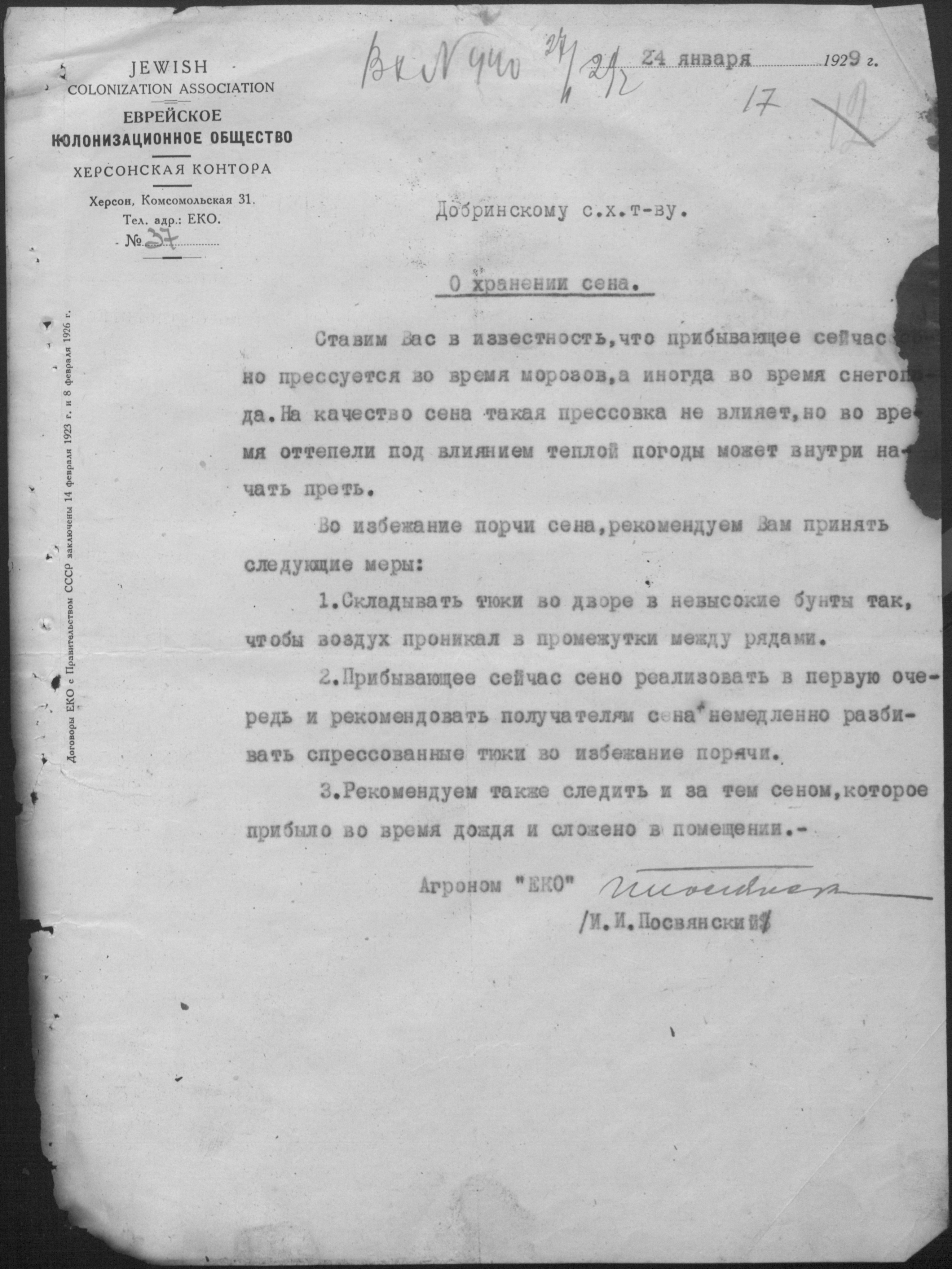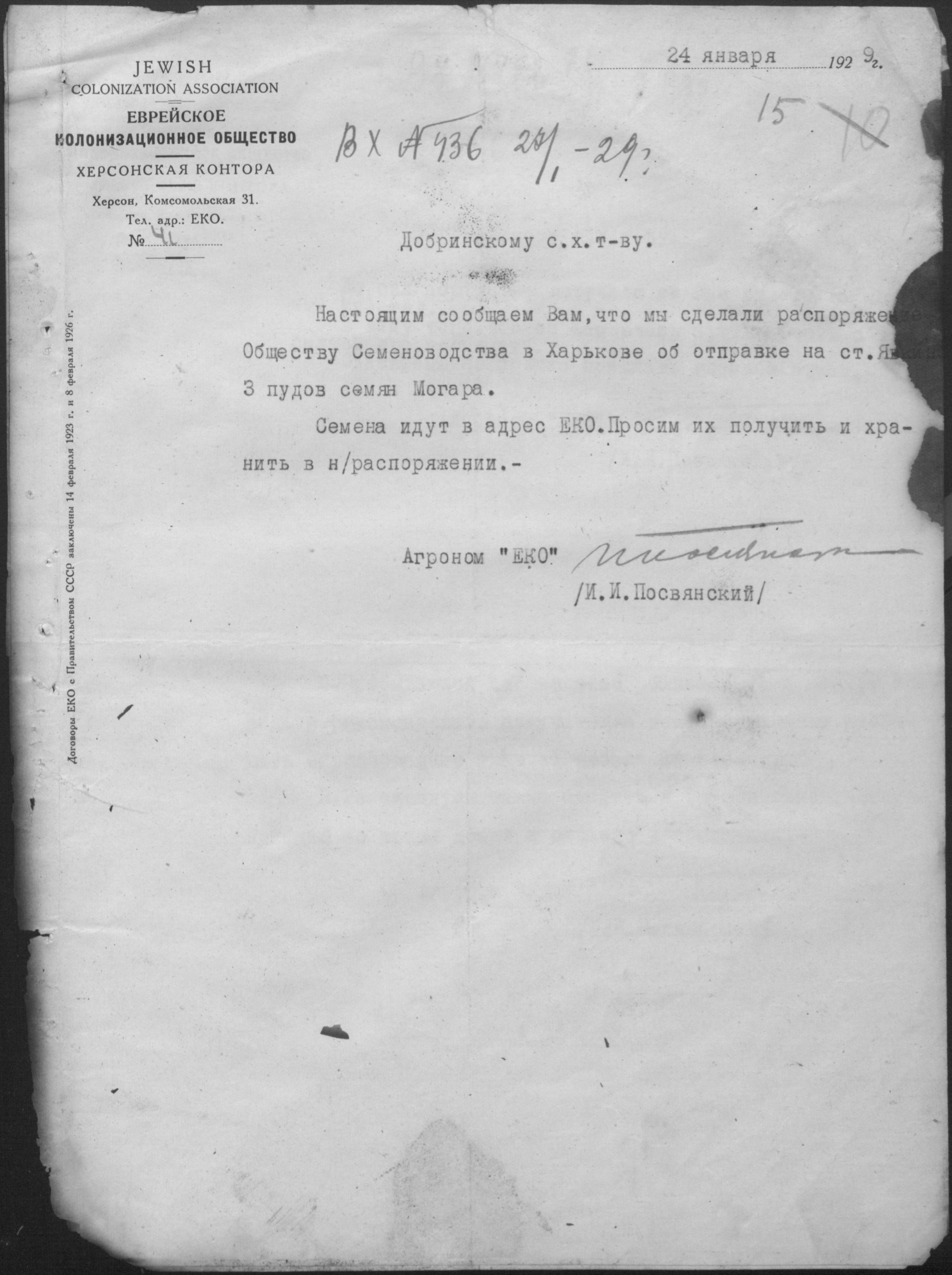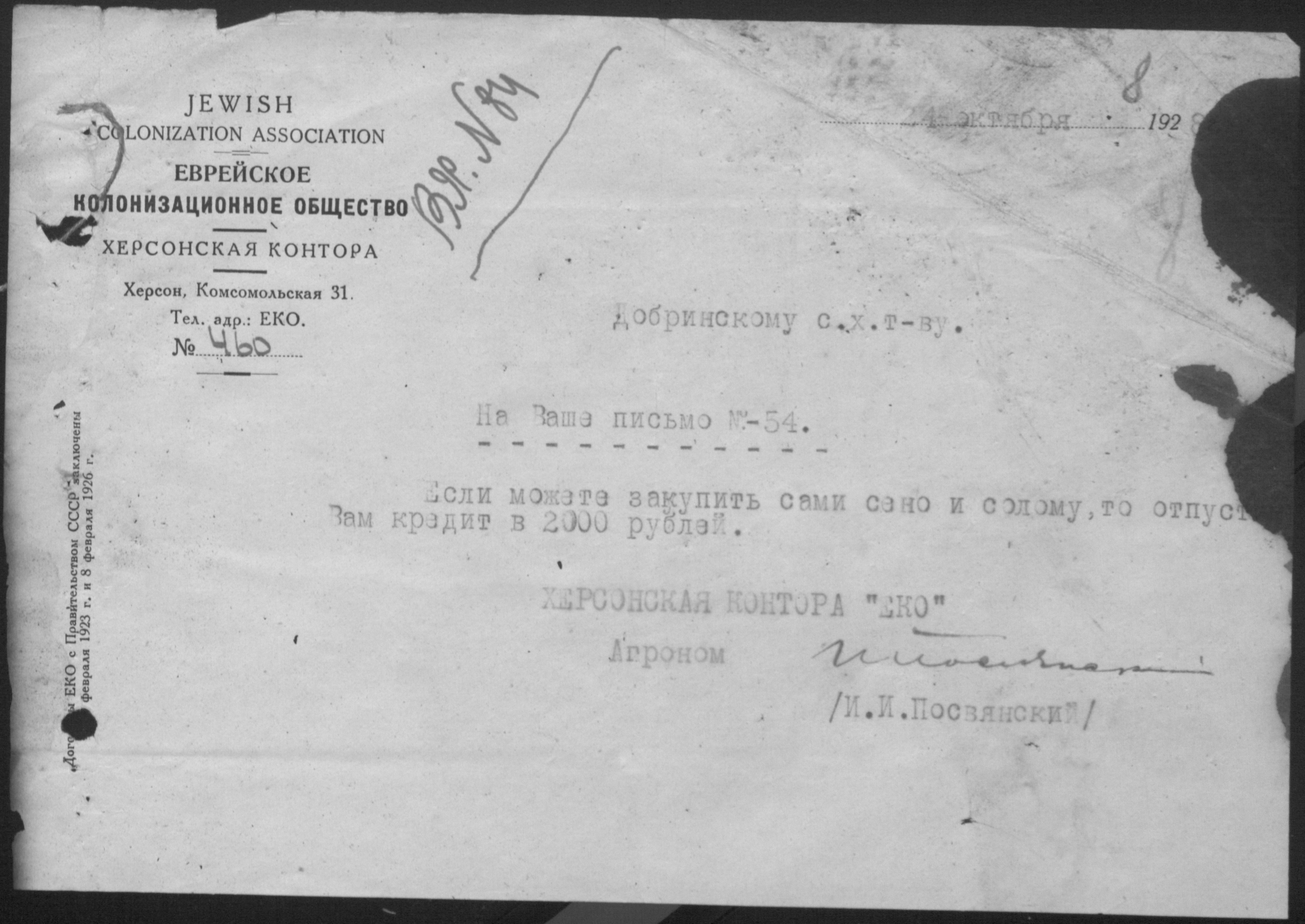 • • • • Справа № 11 “Листування з Херсонською конторою Єврейського колонізаційного товариства про видачу позичок і погашення заборгованостей”